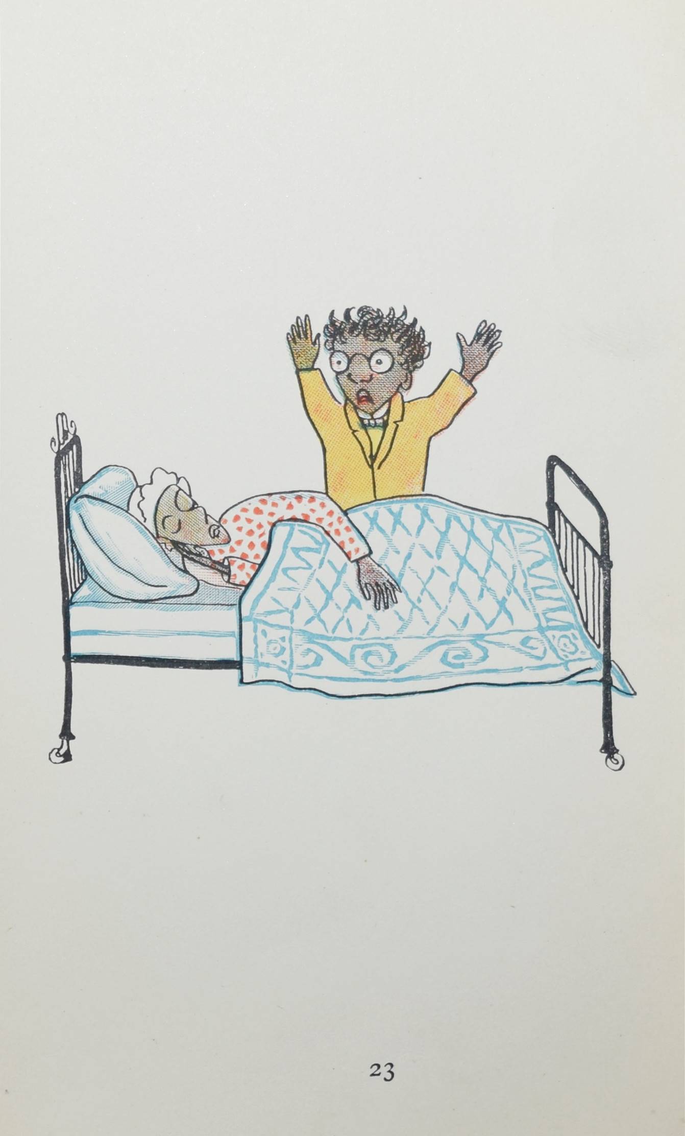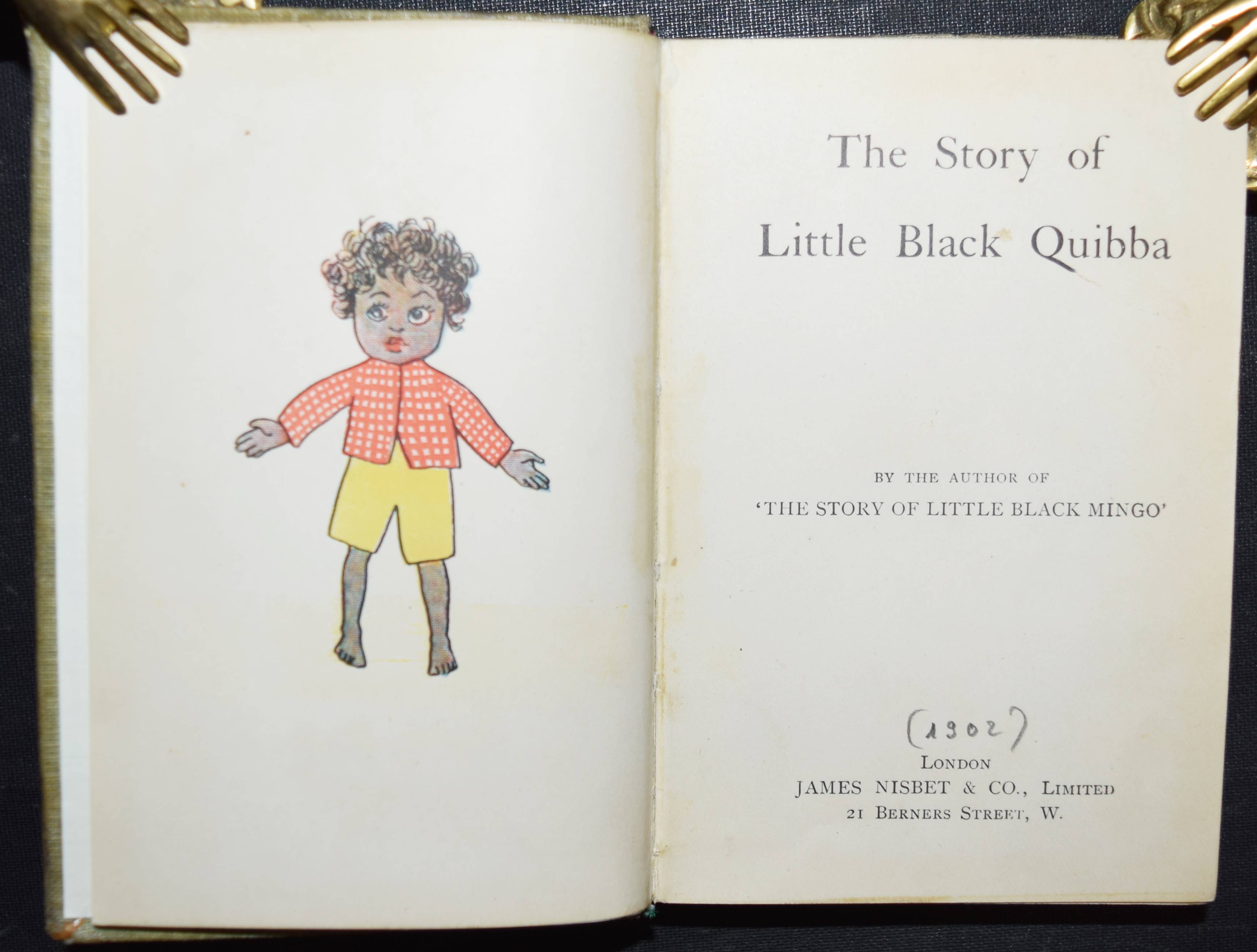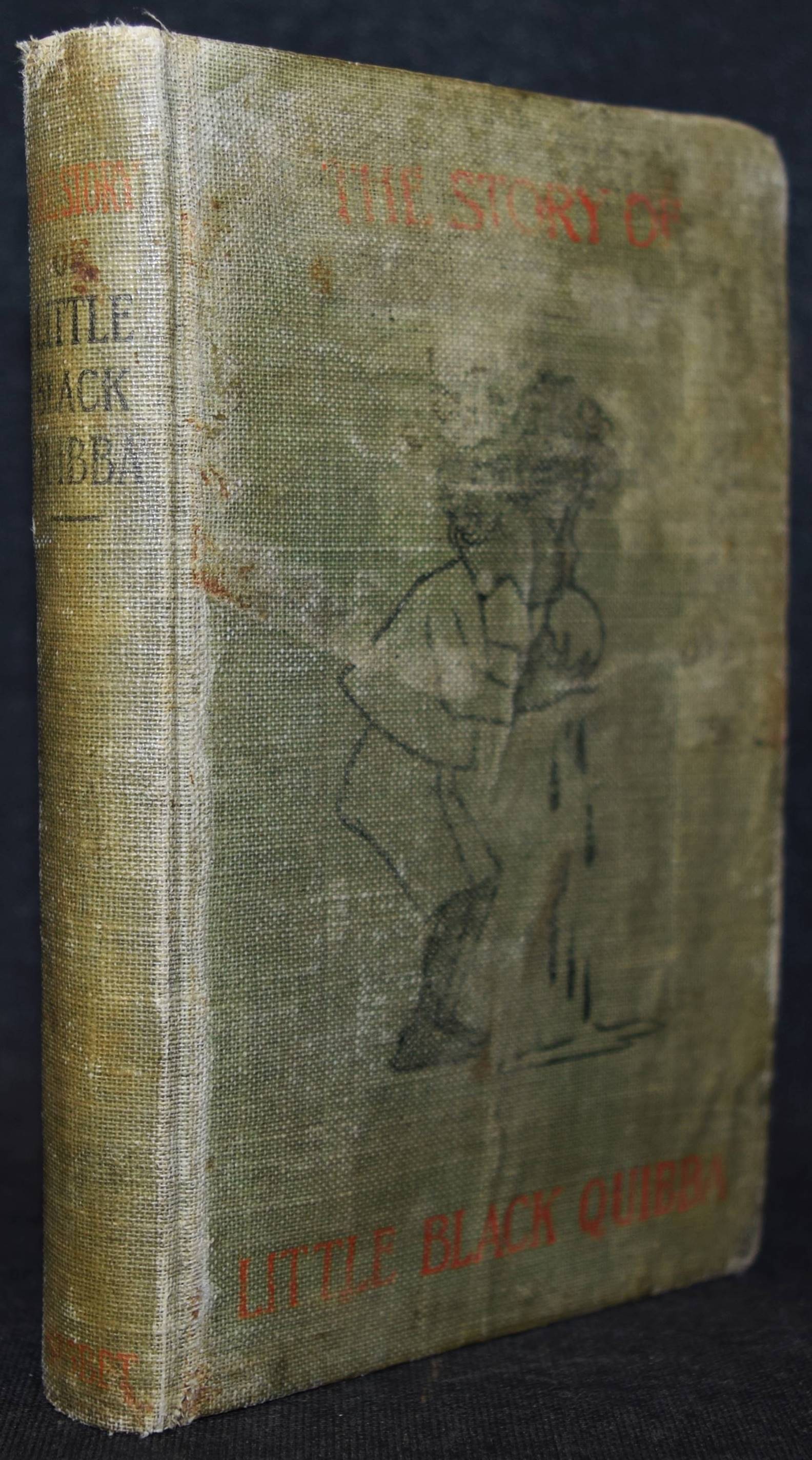 (Bannerman, Helen). The story of Little Black Quibba. By the author of ‚The story of Little Black Mingo‘. London, J. Nisbet o. J. (1902). Kl.-8°. 143 S. mit ganzs. farb. Illustrationen. Illustr. OLn. Osbourne S. 324. Vgl. Bilderwelt 2273. – Erste Ausgabe. – Dritter Band der „Little Black…“-Reihe, die mit dem Band „The story of Little Black Sambo“ 1899 begonnen hat. – Dabei handelt es sich um „die erste erfundene Geschichte, die in England einen klassischen Rang als Bilderbuch behaupten konnte, da hier Wort und Bild harmonisch zusammenklingen“ (B. Alderson in Bilderwelt). – Einband stärker berieben, sonst gutes Exemplar aus der Sammlung Martin Kaiser, Basel.