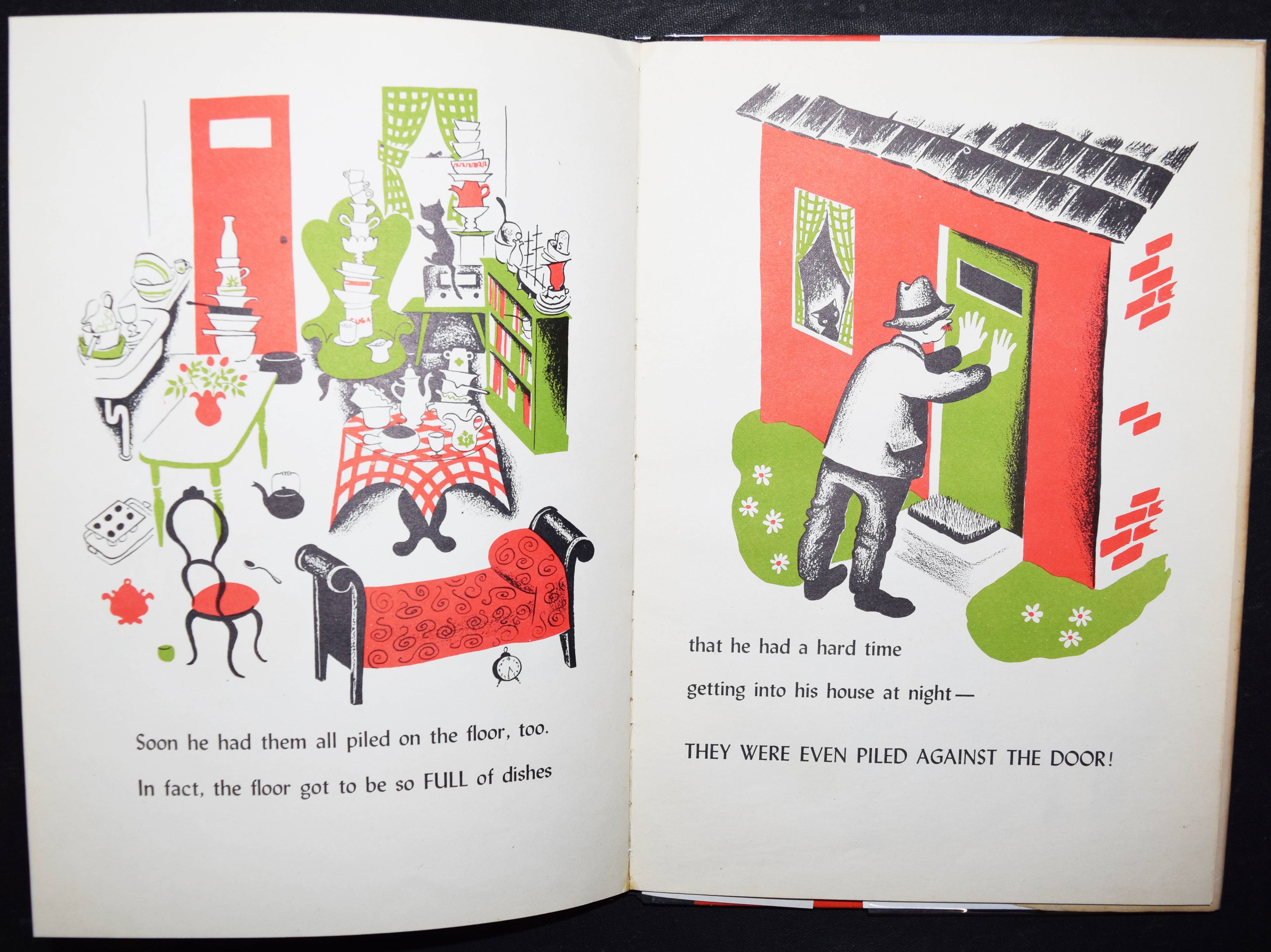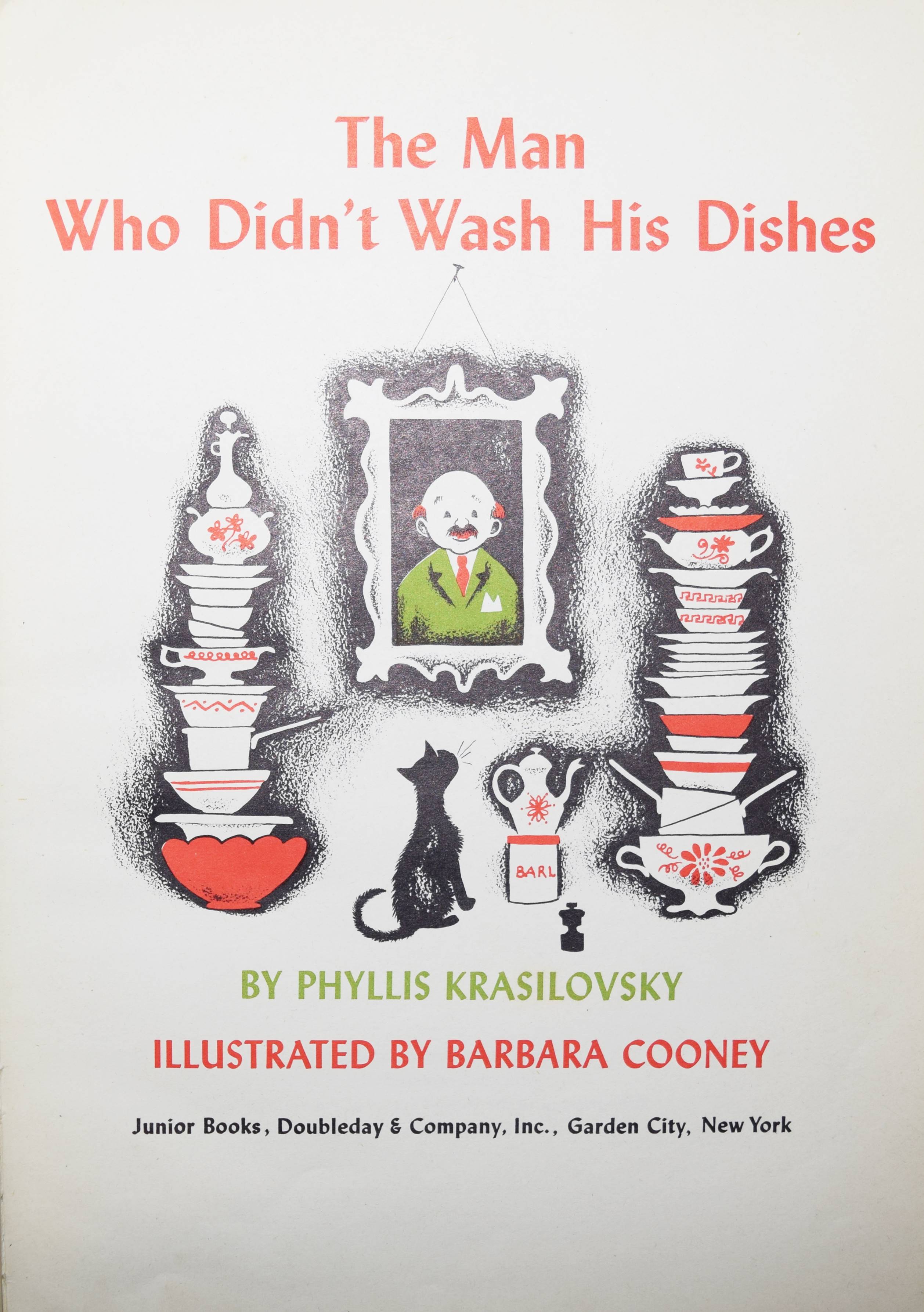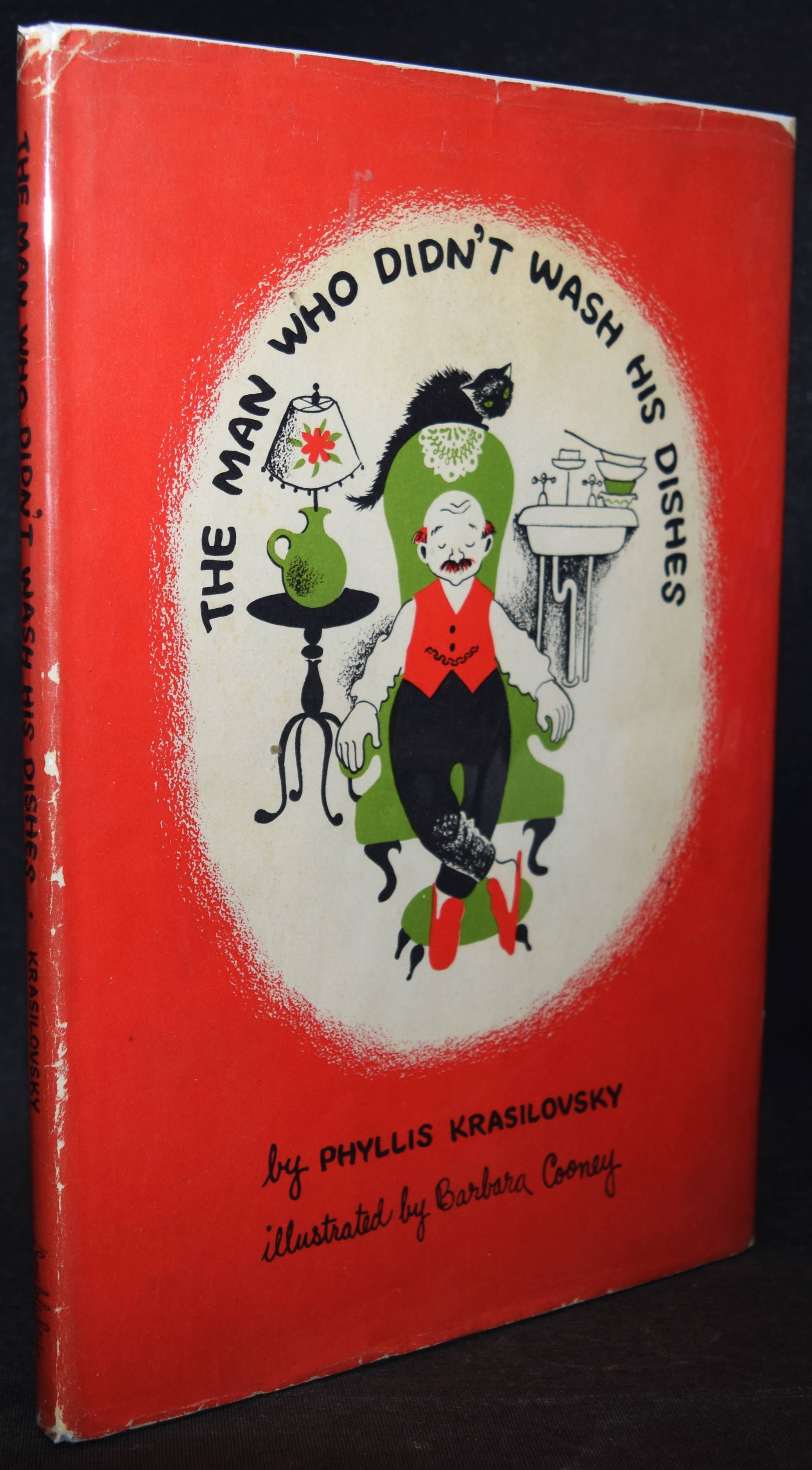 Krasilovsky, Phyllis. The man who didn’t wash his dishes. Illustrated by Barbara Cooney. New York, Doubleday & Company (1950). 4°. [16] Bl. mit farbig illustr. Titel u. farb. Illustrationen. Farbig illustr. OHln. mit farbig illustr. OU. Erste Ausgabe des ersten Kinderbuchs von P. Krasilovsky. – Sehr erfolgreiches, heute noch aufgelegtes Bilderbuch. – Die amerik. Kinderbuch-Illustratorin B. Cooney hat zahlreiche Bilderbücher ausgestattet, von denen einige auch ins Deutsche übersetzt wurden (Peter und der Wolf, Märchenbücher der Gebr. Grimm u.a.). – Schutzumschlag mit geringf. Läsur am hinteren Gelenk, sehr gutes sauberes Exemplar.