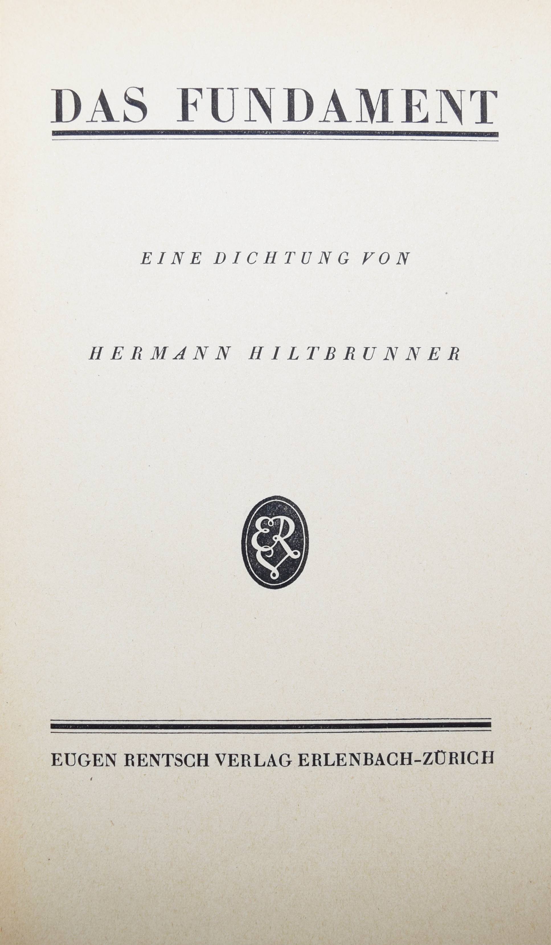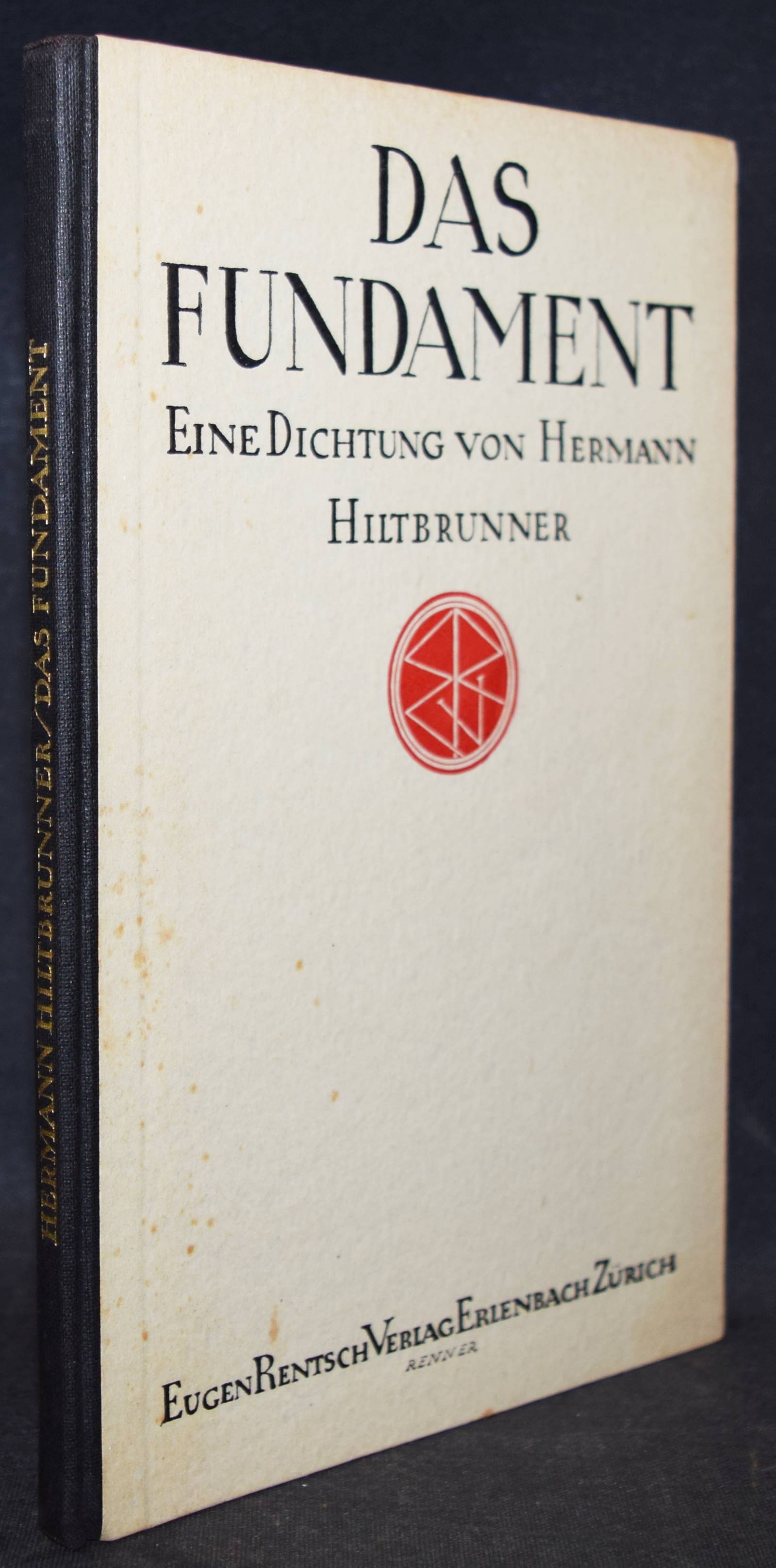 Hiltbrunner, Hermann. Das Fundament. Eine Dichtung. Erlenbach-Zürich, Rentsch 1920. 8°. 72 S. OHln. NDB IX, 163 f. W.-G.² 1. – Erste Ausgabe der ersten Veröffentlichung. – Mit eigenhändiger Widmung von H. Hiltbrunner. – „H.s Lyrik ist zur Hauptsache – innerhalb der einzelnen Sammlung und von der einen zur andern – zyklisch. Er nennt diese „Dichtungen“ Opera und gibt ihnen fortlaufende Nummern. Vom „Fundament“ (1920) bis zum „Gestirnten Himmel“ (1954) und seinem letzten Gedichtband „Schattenwürfe“ (1962) sind es über zwei Dutzend Titel“ (H. Schumacher in NDB). – Deckel leicht braunfleckig, gutes Exemplar.