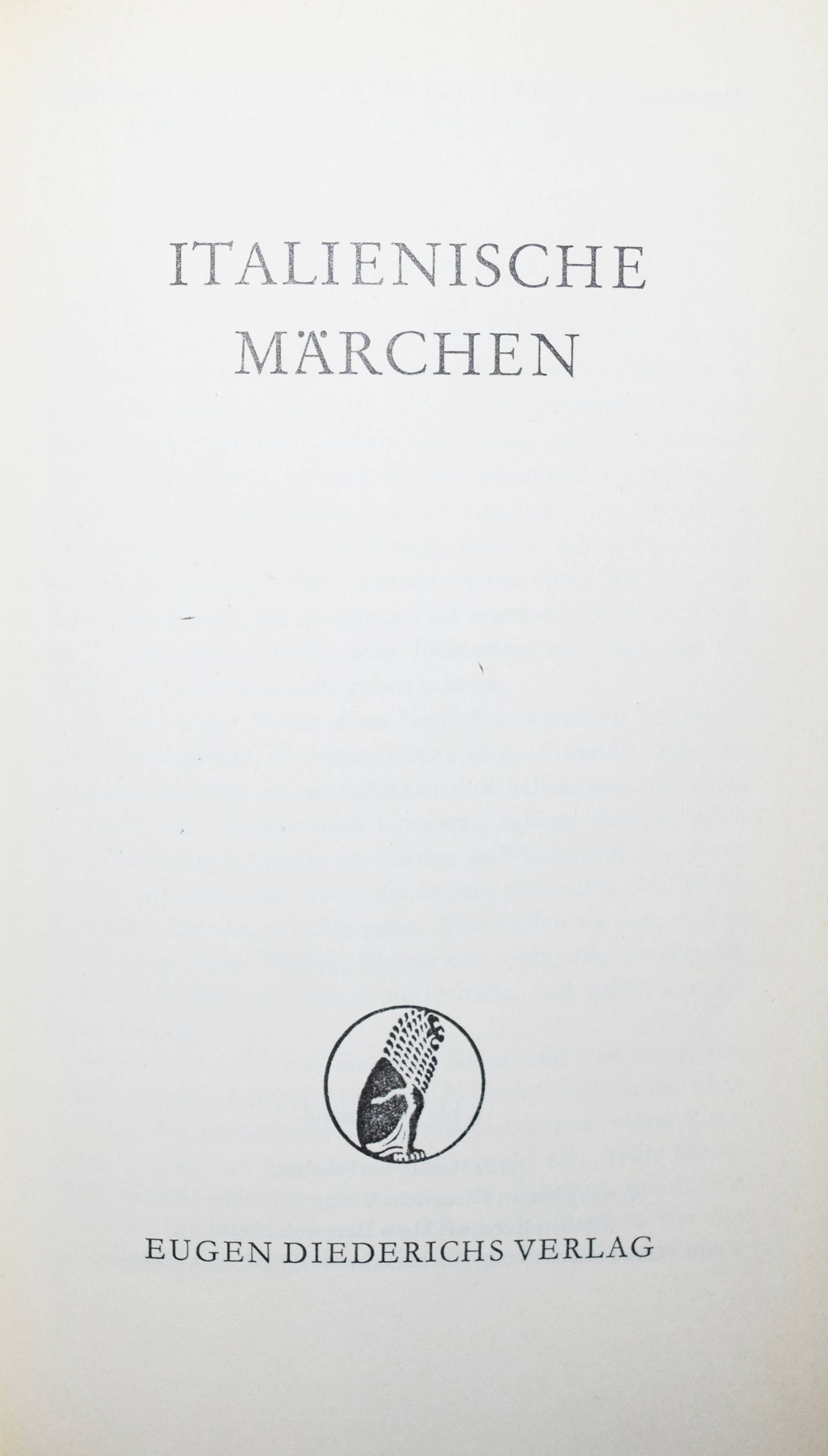 Keller, Walter u. Lisa Rüdiger (Hrsg. u. Übers.). Italienische Märchen. 4. – 10. Tsd. Düsseldorf, Diederichs 1959. 8°. 393 S. Blauer OLdr. mit goldgepr. Rückentitel u. Rückenverg., sowie Kopfgoldscchnitt. (Die Märchen der Weltliteratur). Kapital u. Kanten geringf. berieben, gutes Exemplar der schönen Ganzleder-Ausgabe.