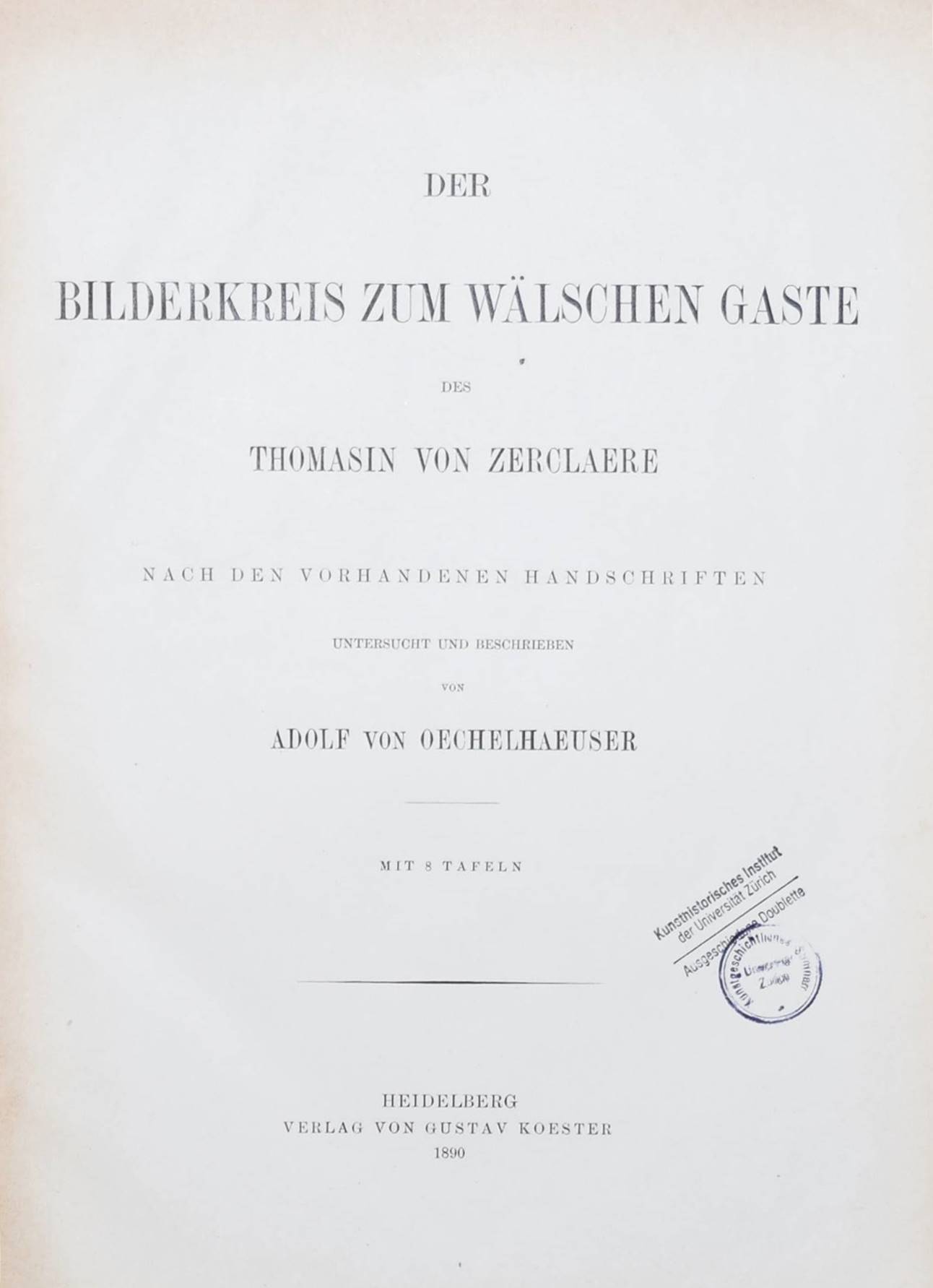 Oechelhäuser, Adolf v. Der Bilderkreis zum Wälschen Gaste des Thomasin von Zerclaere. Nach den vorhandenen Handschriften untersucht und beschrieben. Heidelberg, Koester 1890. 4°. 86 S. u. 8 Lichtdruck-Tafeln. OHln. Deckel etwas angestaubt, Innengelenke etwas angeplatzt, St.a.V.u.T., gutes Exemplar aus der Bibliothek des Schweizer Kunsthistorikers Konrad Hans Escher (1882-1944).