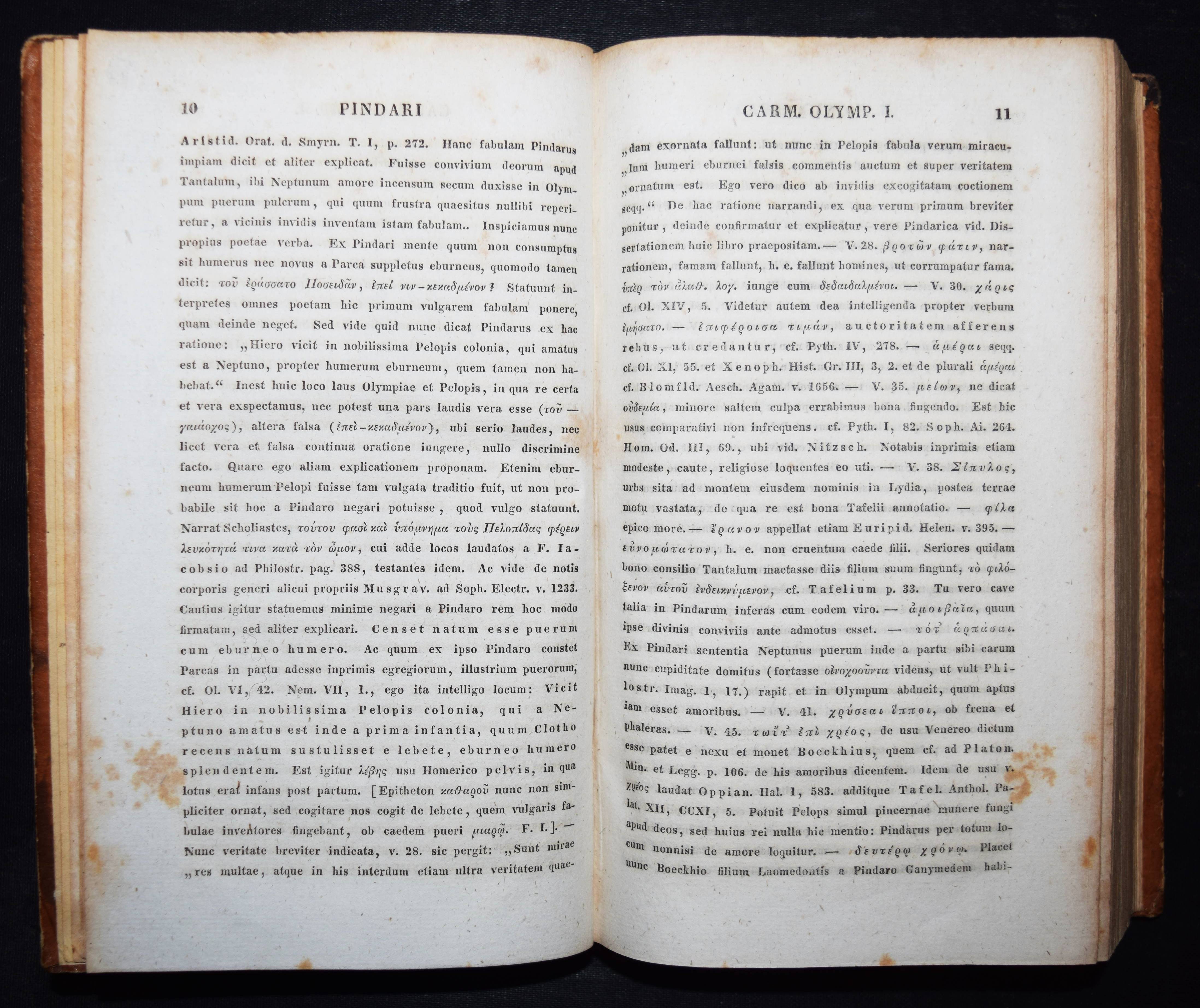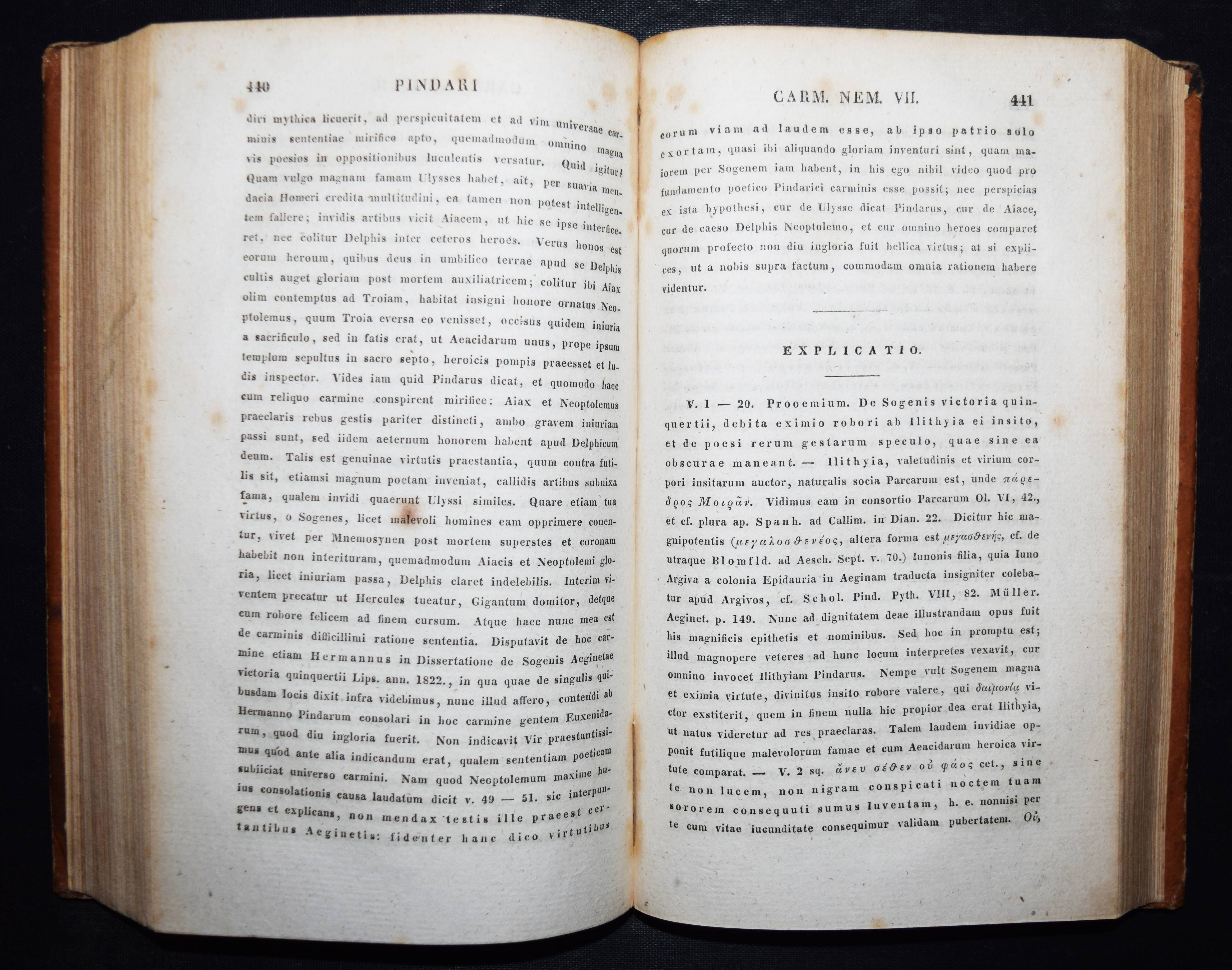 Pindarus. Pindari carmina. Quae supersunt cum deperditorum fragmentis selectis. Ex recensione Boeckhii, commentario perpetuo illustravit Ludolphus Dissenius. Sect. II, commentarius. Gotha u. Erfurt, Hennings 1830. 8°. [2] Bl., 634 S., 1 Bl. u. 2 gefalt. Kupferstich-Karten. Pbd. d. Zt. mit goldgepr. Rückenschild. (Bibliotheca graeca, A. poetarum, vol. VI). Erste Ausgabe der von dem Philologen Ludolf Georg Dissen (1784-1837) bearbeiteten Pindar-Ausgabe, die auf der lat. Übersetzung von August Boeckh (1785-1867, Leipzig 1811 ff.) basiert. – „Die Herausgabe des Pindar, Tibull, Demosthenes, sind besonders werthvoll durch das nachdrückliche consequente Hervorheben der Kunstform, d. h. der poetischen und rhetorischen Construction“ (J. Mähly in ADB V, 254 ff.). – Kanten u. Gelenke berieben, St.a.V., stellenweise stockfleckig, gutes Exemplar.