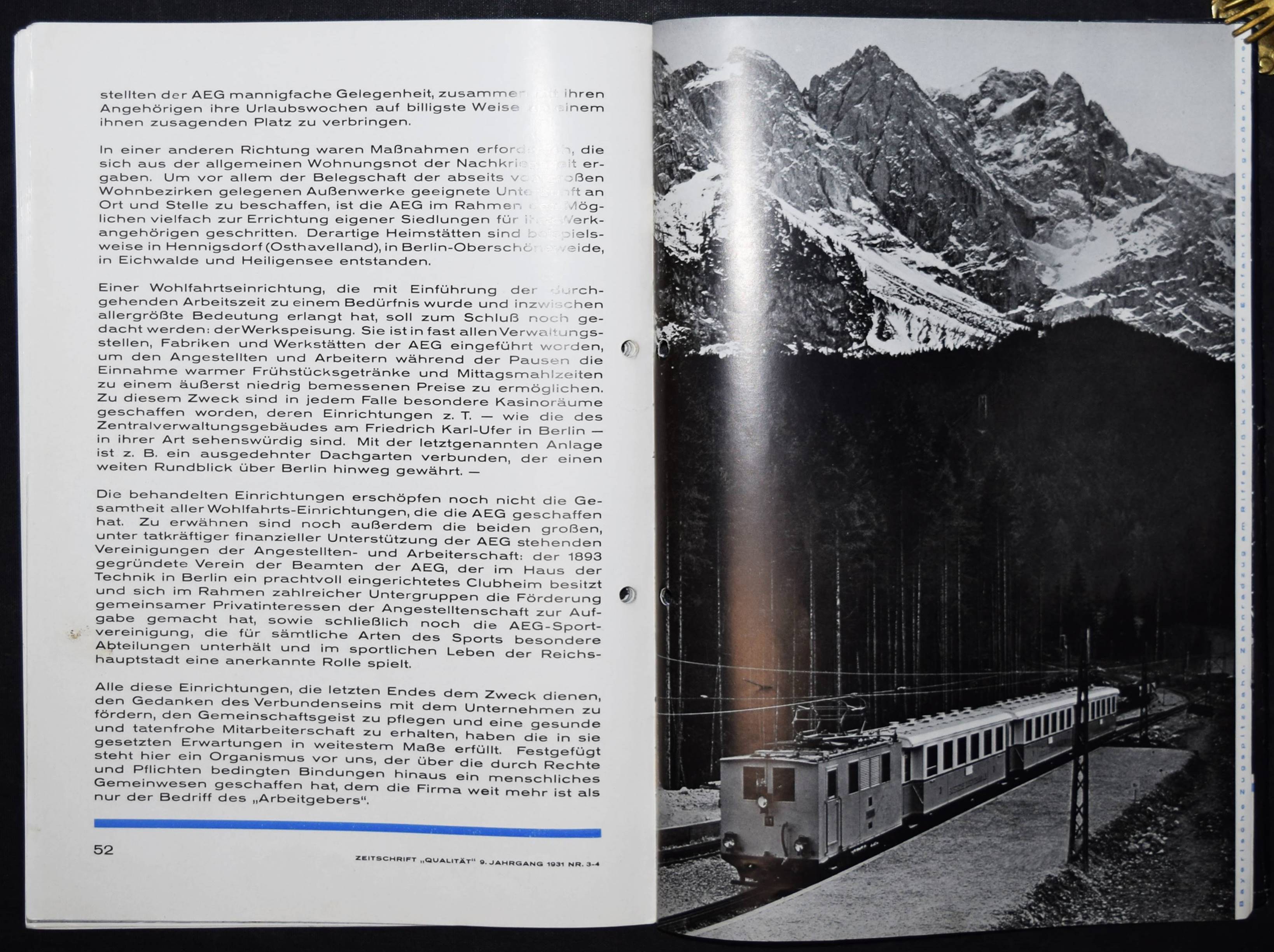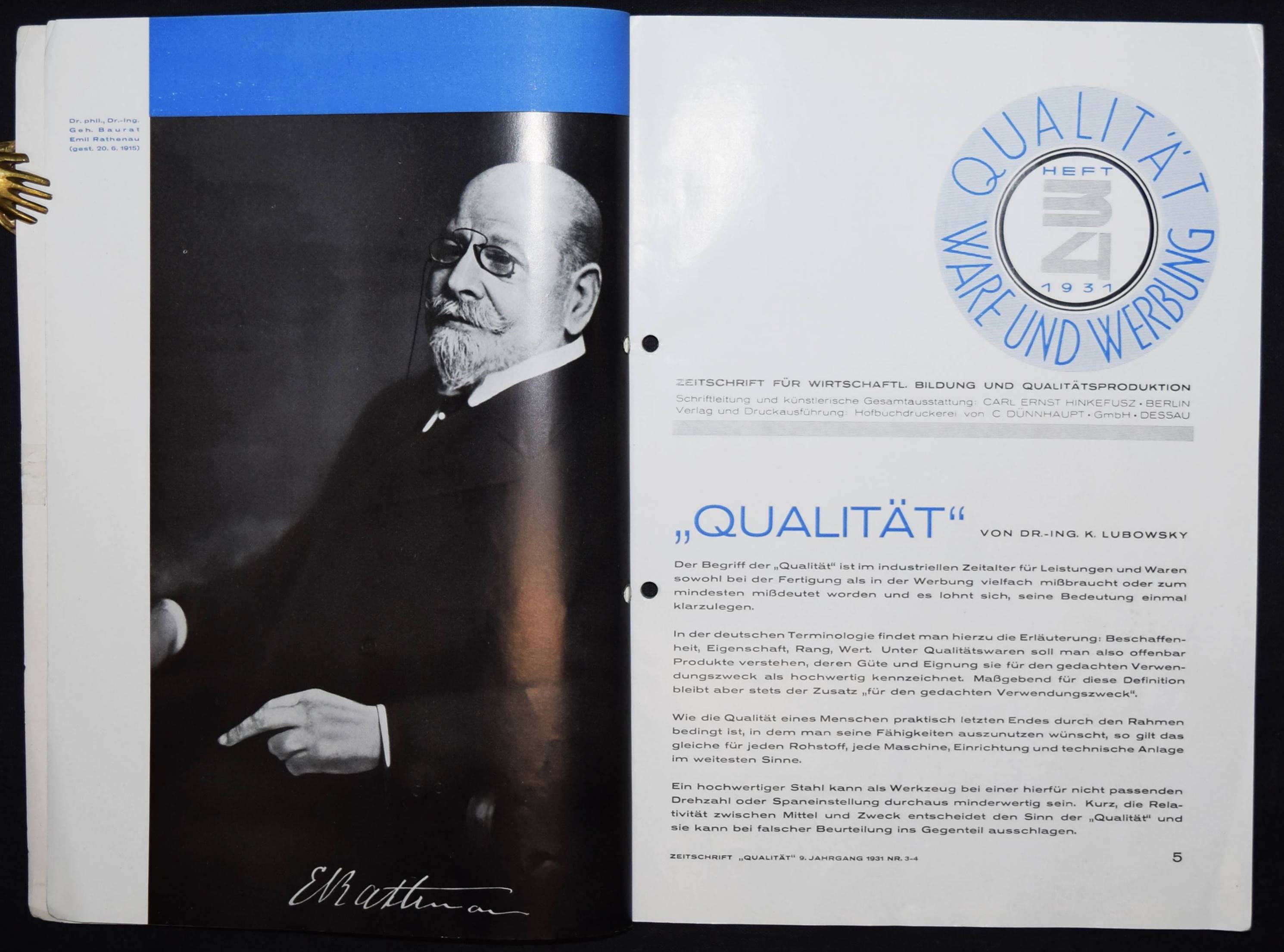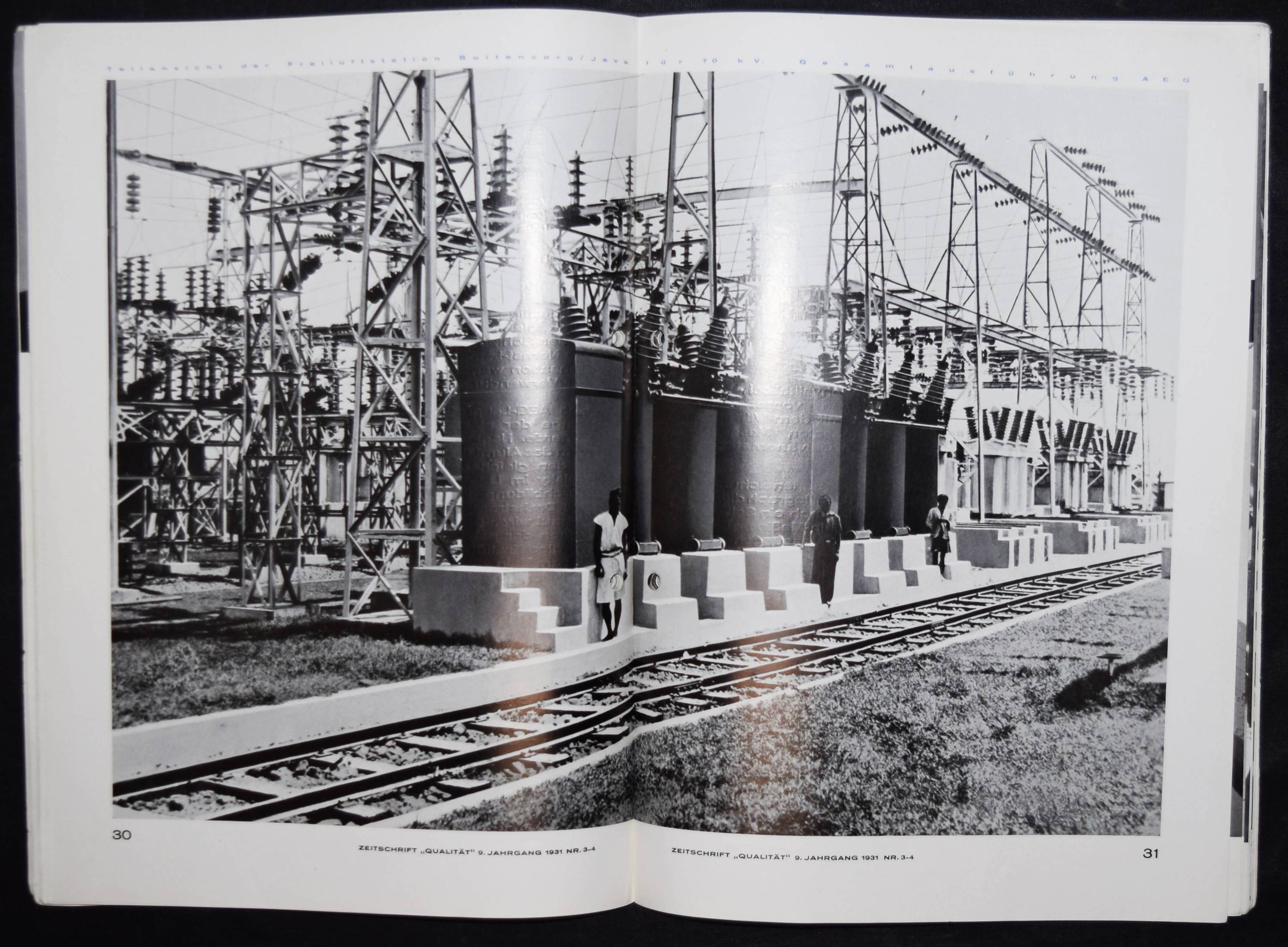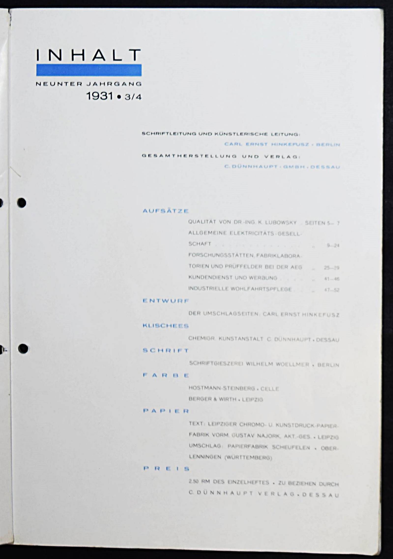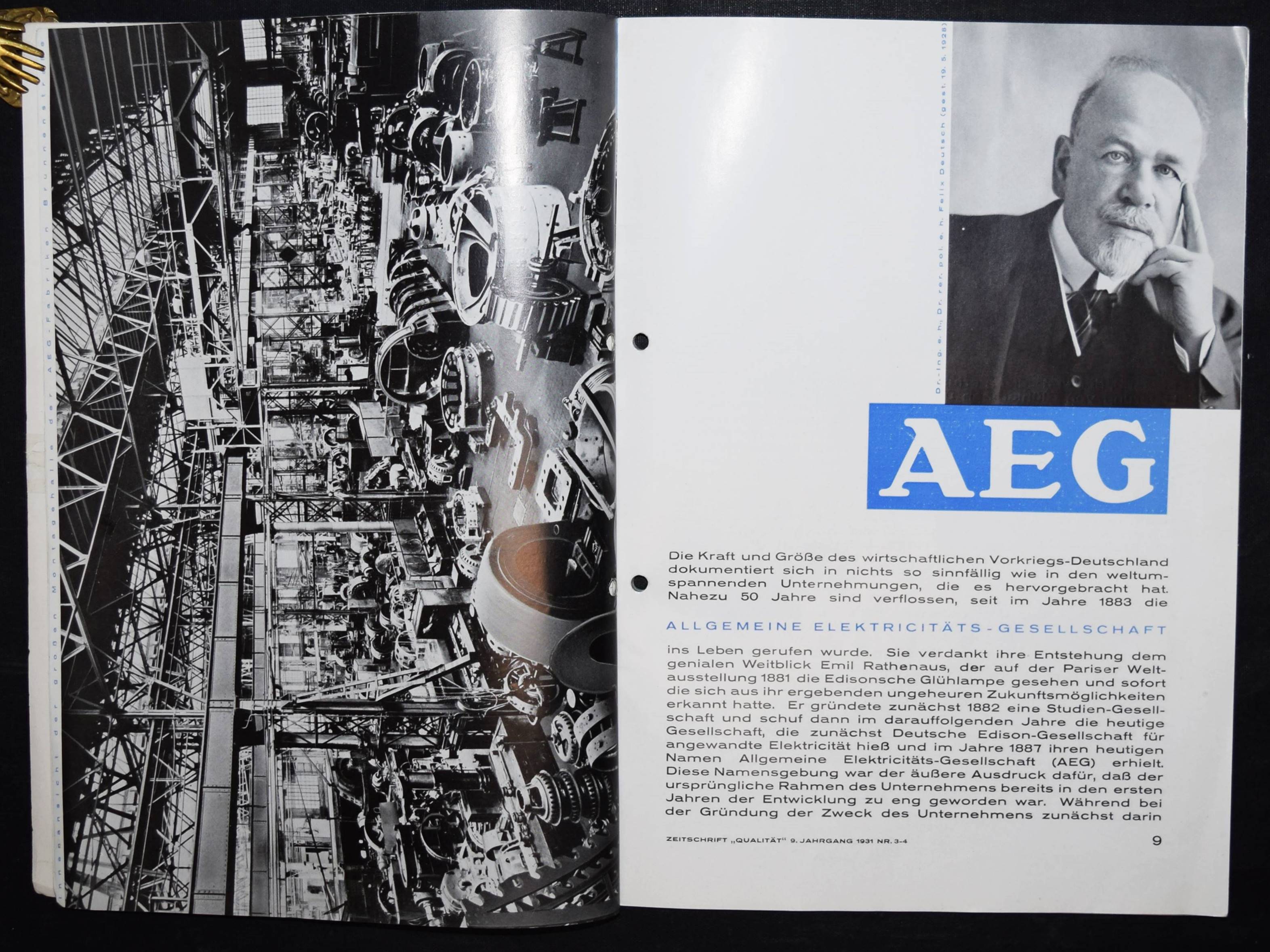 Dünnhaupt, C(arl) u. Carl Ernst Hinkefuß (Hrsg.). Qualität. Zeitschrift für Ware und Werbung. 9. Jahrgang, Nr. 3/4. (Sonderheft): AEG. Dessau, Dünnhaupt 1931. 4°. 56 S. mit zahlr. Abb. Illustr. OKart. Seltenes Heft der wichtigen, programmatischen Zeitschrift für moderne Werbung und Gebrauchsgrafik der 1920er und 1930er Jahre. Gestaltet im Stil der Neuen Sachlichkeit von dem bedeutenden Werbegraphiker C. E. Hinkefuß. – Mit einen interessanten Aufsatz „Qualität“ des AEG Mitarbeiters K. Lubowsky: „Die industrielle Werbung muß sich darauf einstellen, nachzuweisen, daß nicht Maschinen laufen, um Maschinen zu erzeugen, sondern Menschen arbeiten wollen, um Mneschen zu dienen und zu helfen. Gerade bei Werbung im technischen Außenhandel ist dieser Gesichtpunkt maßgebend. Sie ist viel mehr technische Information und Beratung als Reklame und landläufige Propaganda.“ – Die Aufnahmen zeigen Innen- und Außenansichten der Montagehalle der AEG-Fabrik in Berlin, Generatoren, ein Schiffsgetriebe, Dampfturbinen, ein AEG-Umspannwerk auf Java, Transformatoren, die Flutlicht-Beleuchtung der Stuttgarter Johanniskirche, das Großkraftwerk Klingenberg, die Bayerische Zugspitzbahn u.a. Die letzte Aufnahme zeigt die Außenfront der von P. Behrens entworfenen AEG-Kleinmotorenfabrik in der Voltastraße. Außerdem enthält das Heft Beispiele für Werbeanzeigen und Prospekte. – Typographie Schwarz und Blau sowie Umschlaggestaltung von C. E. Hinkefuß (1881-1970), der seit 1905 als Redakteur und Grafiker bei den Berliner Elektrizitätswerken arbeitete. Nach seinem Umzug nach Dessau 1907 leitete er die Werbeabteilung der Junkers-Werke und nach seiner Rückkehr nach Berlin die Druckerei Kuno Bergmann. Seit 1910 arbeitete er als selbständiger Werbe-Fachmann in Berlin und war seit 1919 Mitglied im Deutschen Werkbund. Ein Jahr später gab er die Zeitschrift „Qualität“ heraus, die bis 1933 erschien. Das Blatt orientierte sich ab 1925 verstärkt an den ästhetischen Kriterien des Bauhaus. Ab 1930 stand jeweils eine einzelne Firma im Mittelpunkt eines Heftes. – „Mit professioneller Gestaltung, moderner Typografie und anspruchsvoller Fotografie gelangen Hinkefuß so vorbildliche Beispiele für ‚rationelle Reklame‘.“ (R. Jaeger, Moderne Werbegrafik S. 159). – Rücken etwas berieben, gelocht, sonst sehr gut erhalten.