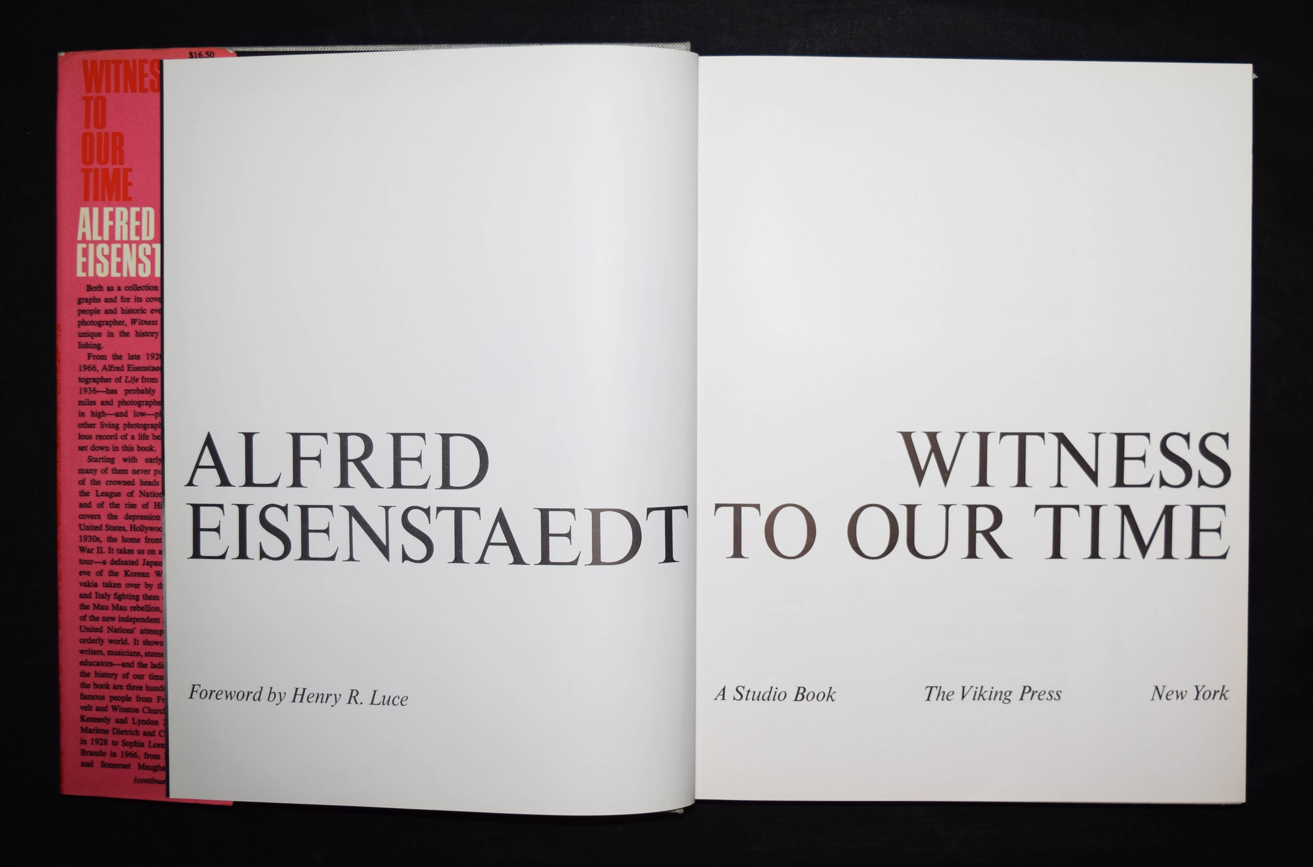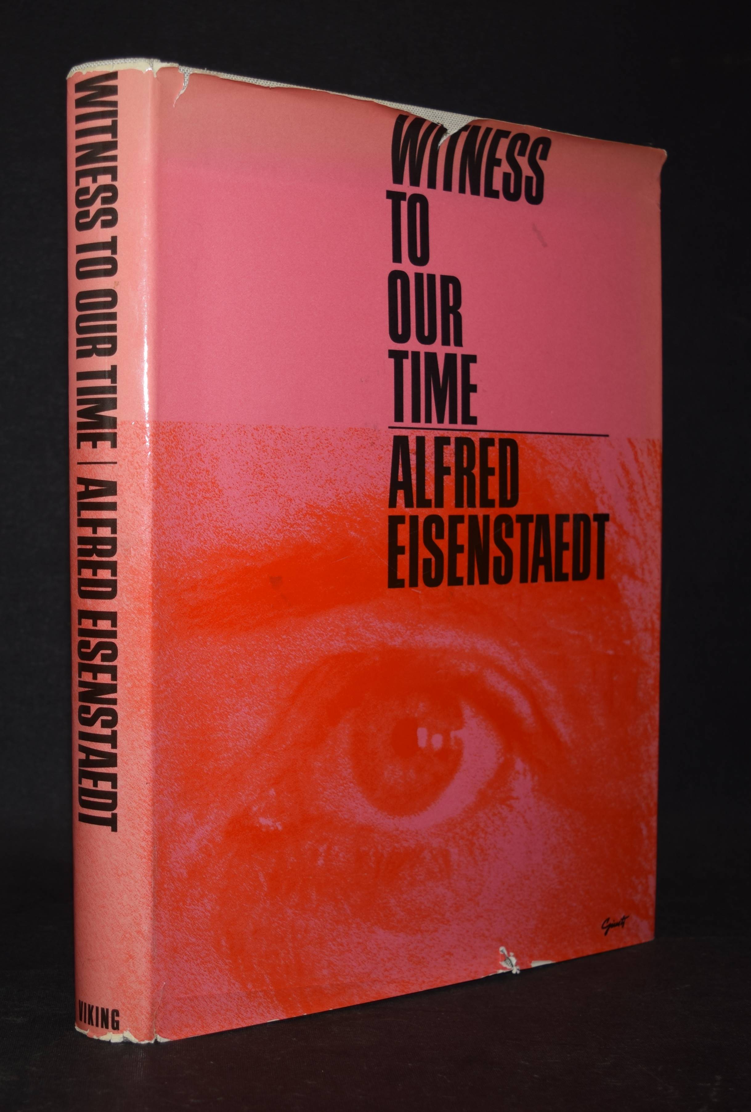 Eisenstaedt, Alfred. Witness to our time. Foreword by Henry R(obinson) Luce. New York, The Viking Press o. J. (1966). 4°. 343 S. mit zahlr. teils farb. Abb. OLn. mit farbig illustr. OU. (Jacket design by George Giusti). (A Studio book). Kloetzle S. 127 f. – Erste Ausgabe der ersten Werkschau des berühmten amerk. Fotografen, der als einer der einflussreichsten Fotoreporter des 20. Jahrhunderts gilt. – „Als er 1935 in die USA emigrierte, gehörte er zu den ersten vier fest angestellten Fotografen für die gerade im Aufbau begriffene und ein Jahr später etablierte Zeitschrift „Life“. Für sie fotografierte er in den Folgejahren fast einhundert Titel und mehr als 2000 Reportagen. Die Großen der Welt aus Politik, Wirtschaft und Kultur zu porträtieren, lag ihm am besten. Dabei ließ er sich ganz auf deren Eigenheiten ein. So entstand in mehr als 50 Berufsjahren ein ‚Who is Who‘ ganz besonderer Art: eine Weltgeschichte in Porträts“ (E. Kaufhold in Koetzle). – Schutzumschlag mit kl. Randläsuren, gutes Exemplar.