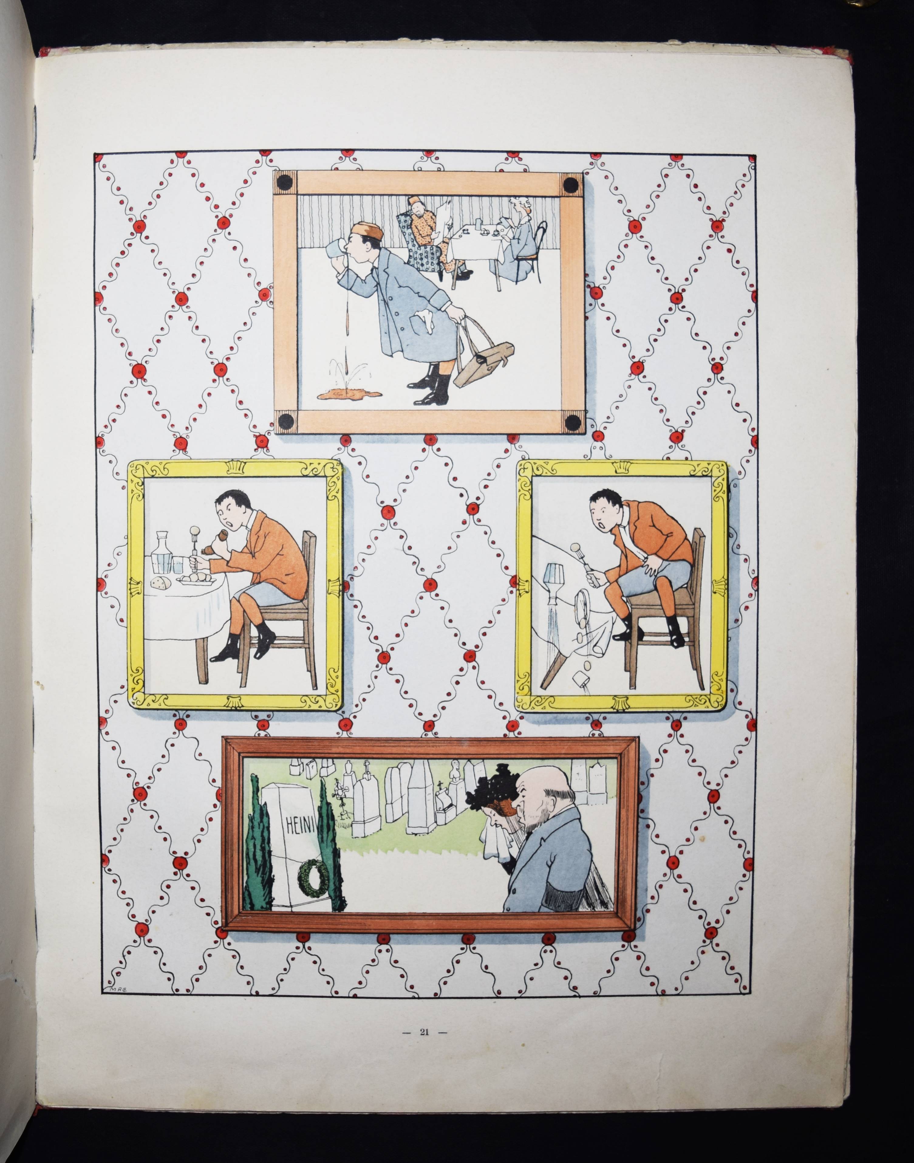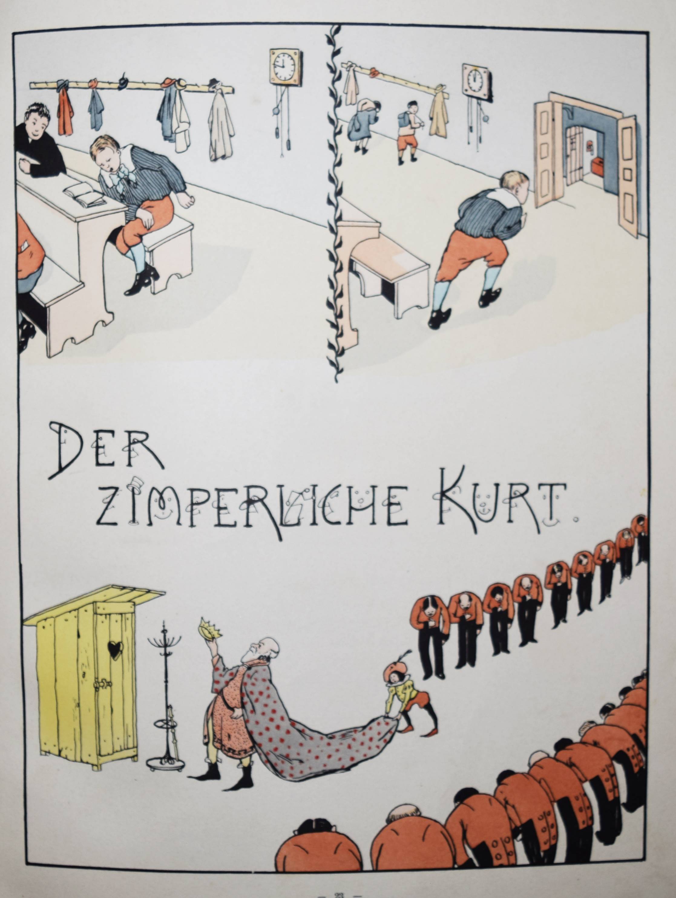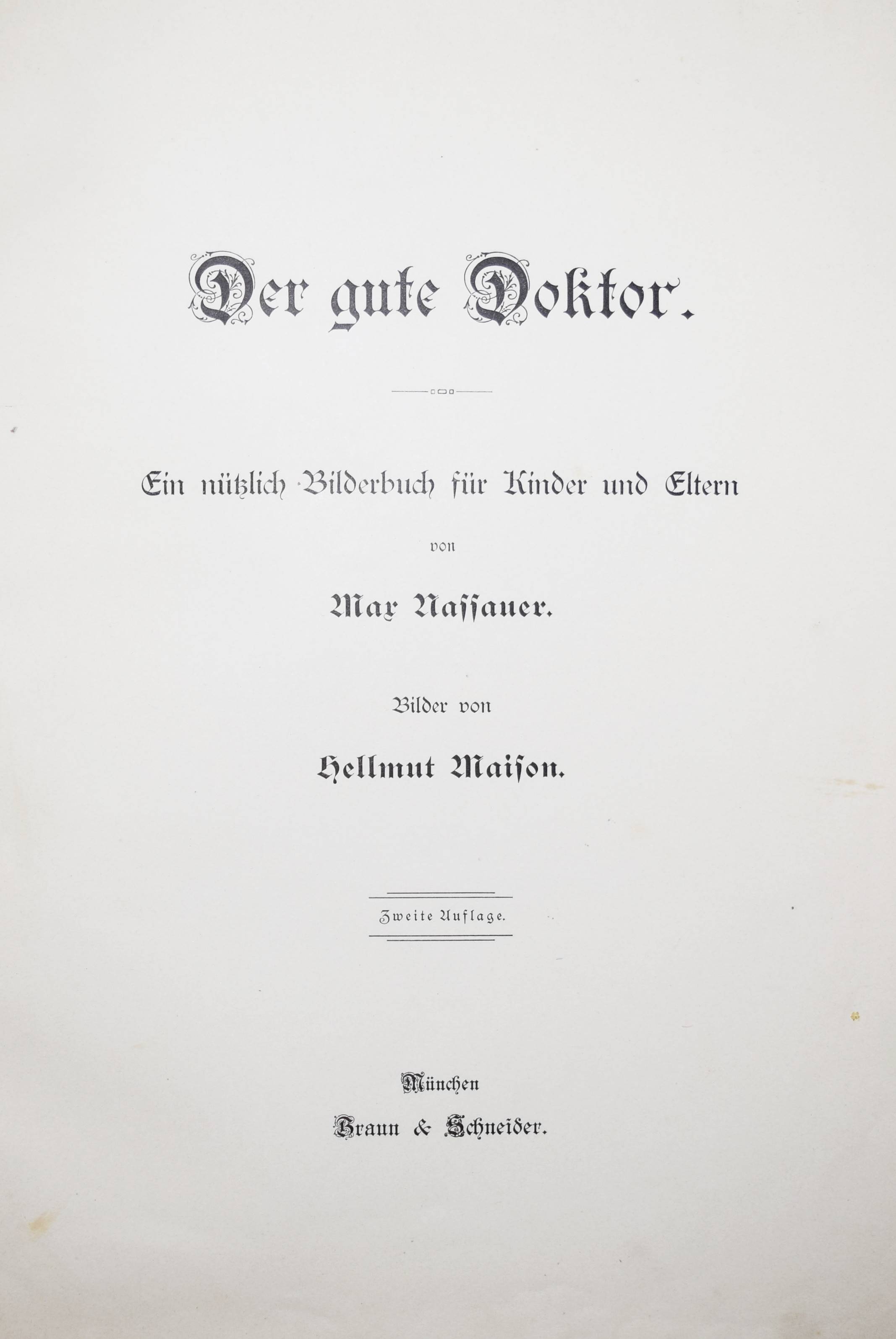 Struwwelpeteriade – Nassauer, Max. Der gute Doktor. Ein nützliches Bilderbuch für Kinder und Eltern. 2. Aufl. München, Braun & Schneider o. J. (ca. 1907). Folio 31 S. mit 14 ganzs. handkol. Illustrationen von H(ellmut) Maison. OHLn. mit farb. Deckelbild. Bilderwelt 478. Kayser 34, 280. 150 Jahre Struwwelpeter S. 80. Klotz 4963/1. Pressler 207 (6. Aufl., mit Abb. 141). Ries 702, 1. Rühle 376. Baumgartner 2, I/114. Stuck-Villa II, 254. (Alle EA von 1905). – „Die medizinische Struwwelpeteriade des Münchner, im Dritten Reich nach England emigrierten Zeichners Maison, der sonst nicht weiter als Illustrator hervorgetreten ist, spielt in eher ironischer Weise mit Jugendstilelementen. In den Bildern zu „Hans, der die Tiere neckte“ zitiert Maison eine Jugendstileinrichtung, deren Details in den Kunstzeitschriften der Zeit nachweisbar sind“ (H. Ries). „Der Verfasser, der selbst Arzt war, schildert die schlimmen Folgen, die aus Unvernunft und Ungehorsam für die Gesundheit entstehen können, wie beispielsweise in der Geschichte von „Anna, die sich die Zähne nicht putzte“ (Pressler S. 115). Vgl. auch A. H. Murken in „Kind, Krankheit und Krankenhaus im Kinder- und Jugendbuch seit 1800“ 2.Aufl. Herzogenrath 1983 (ausführl.). – Einband etwas fleckig u. berieben, Innengelenke angeplatzt, eine Tafel unten mit unauffällig restaurierten Abriß, untere Blattränder leicht fingerfl., noch gutes Exemplar.