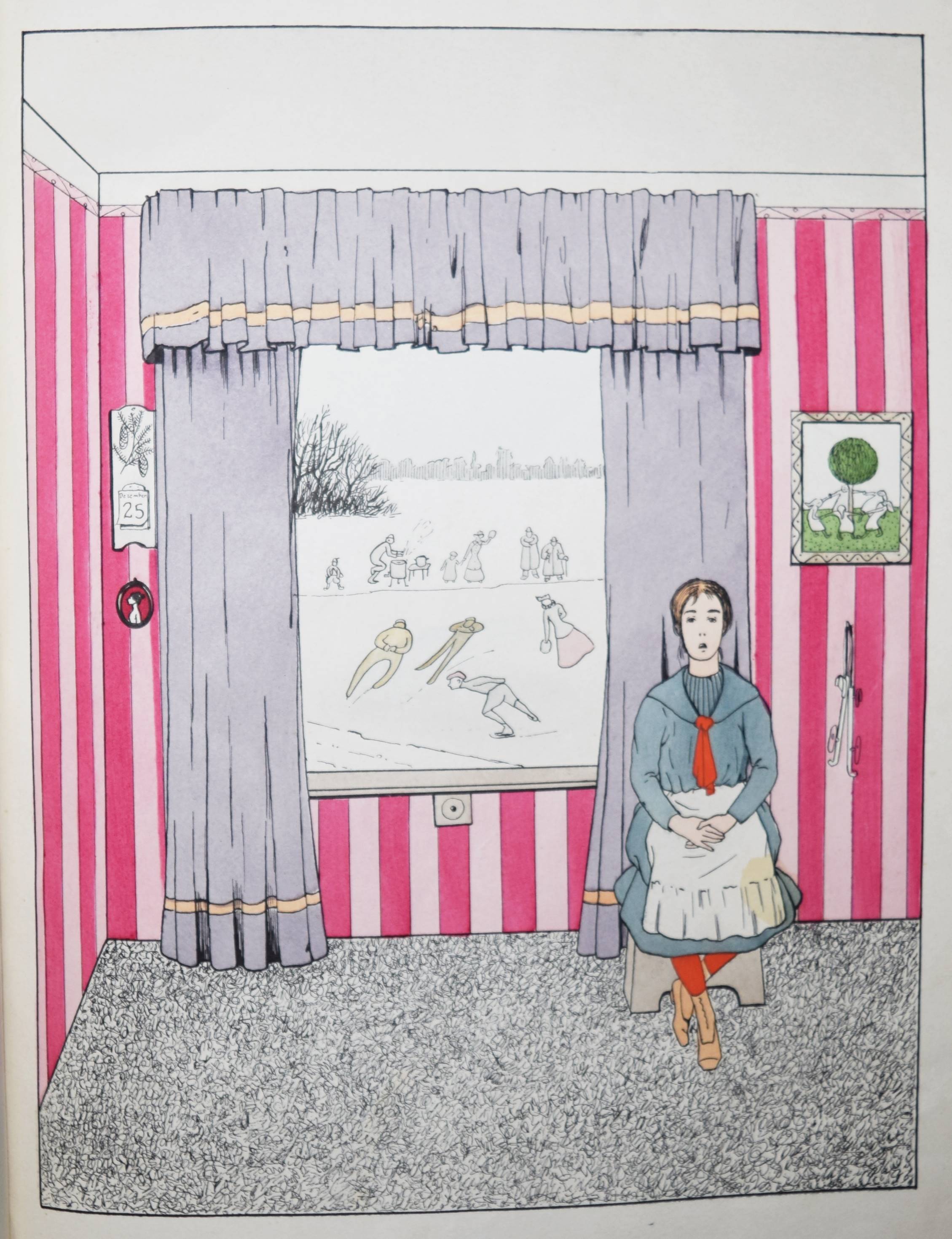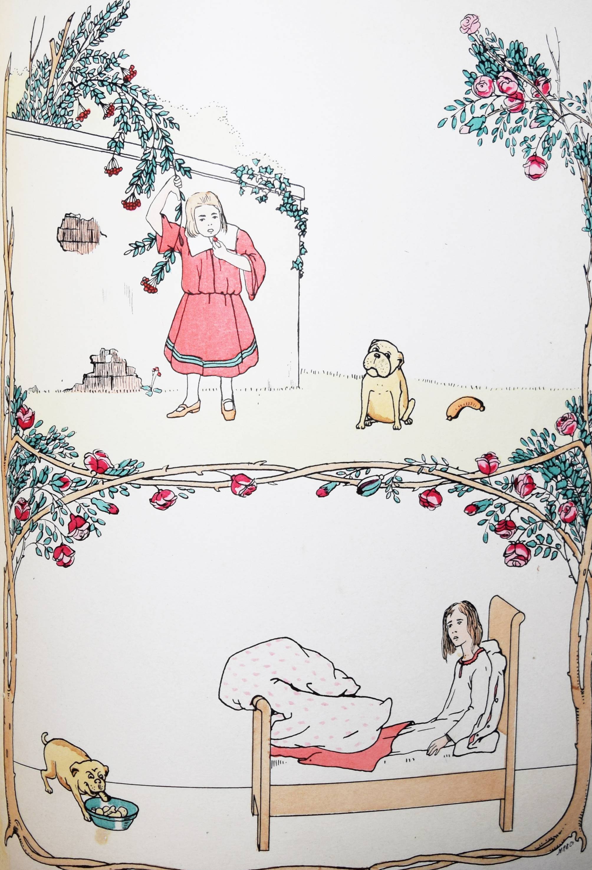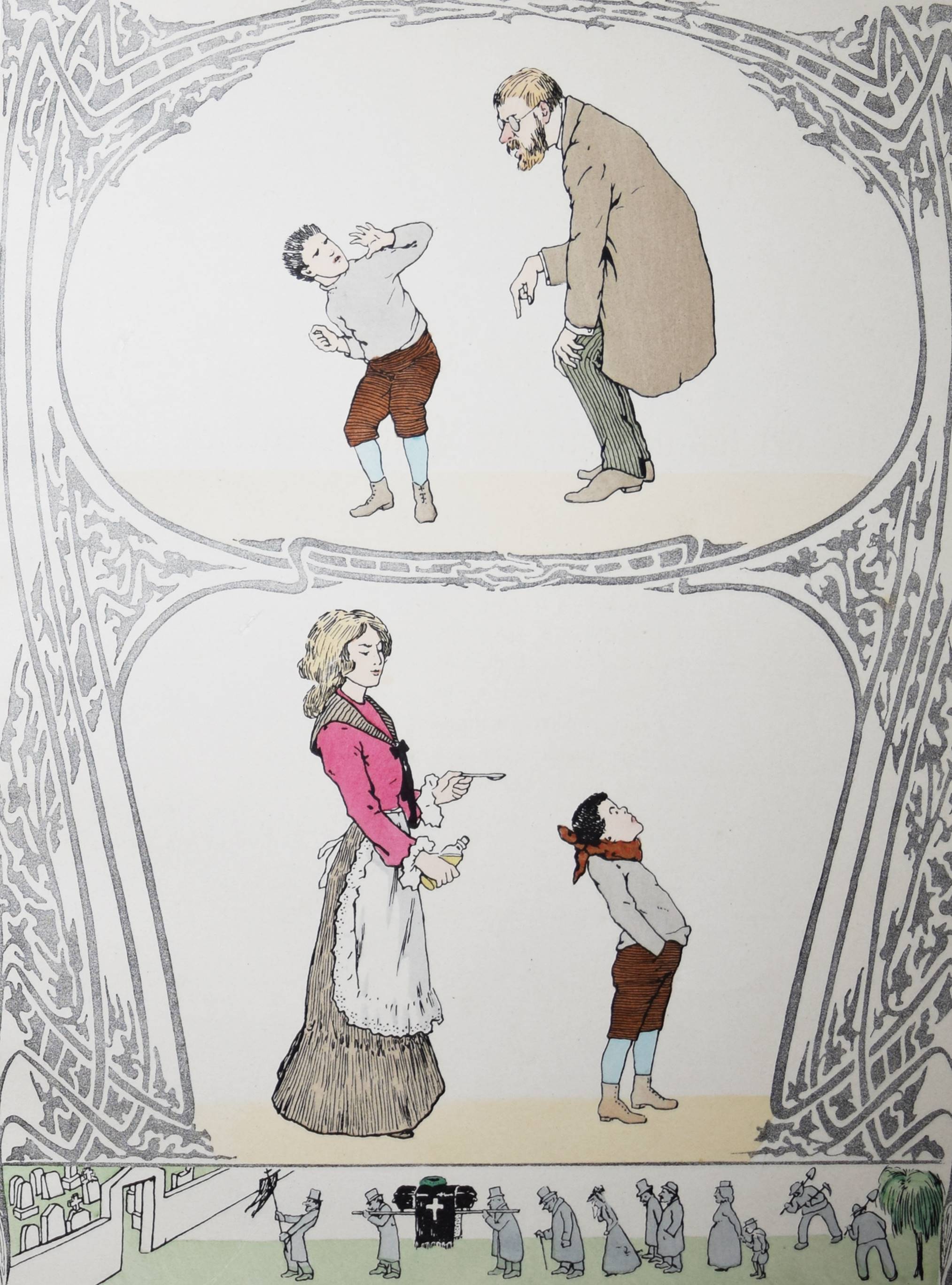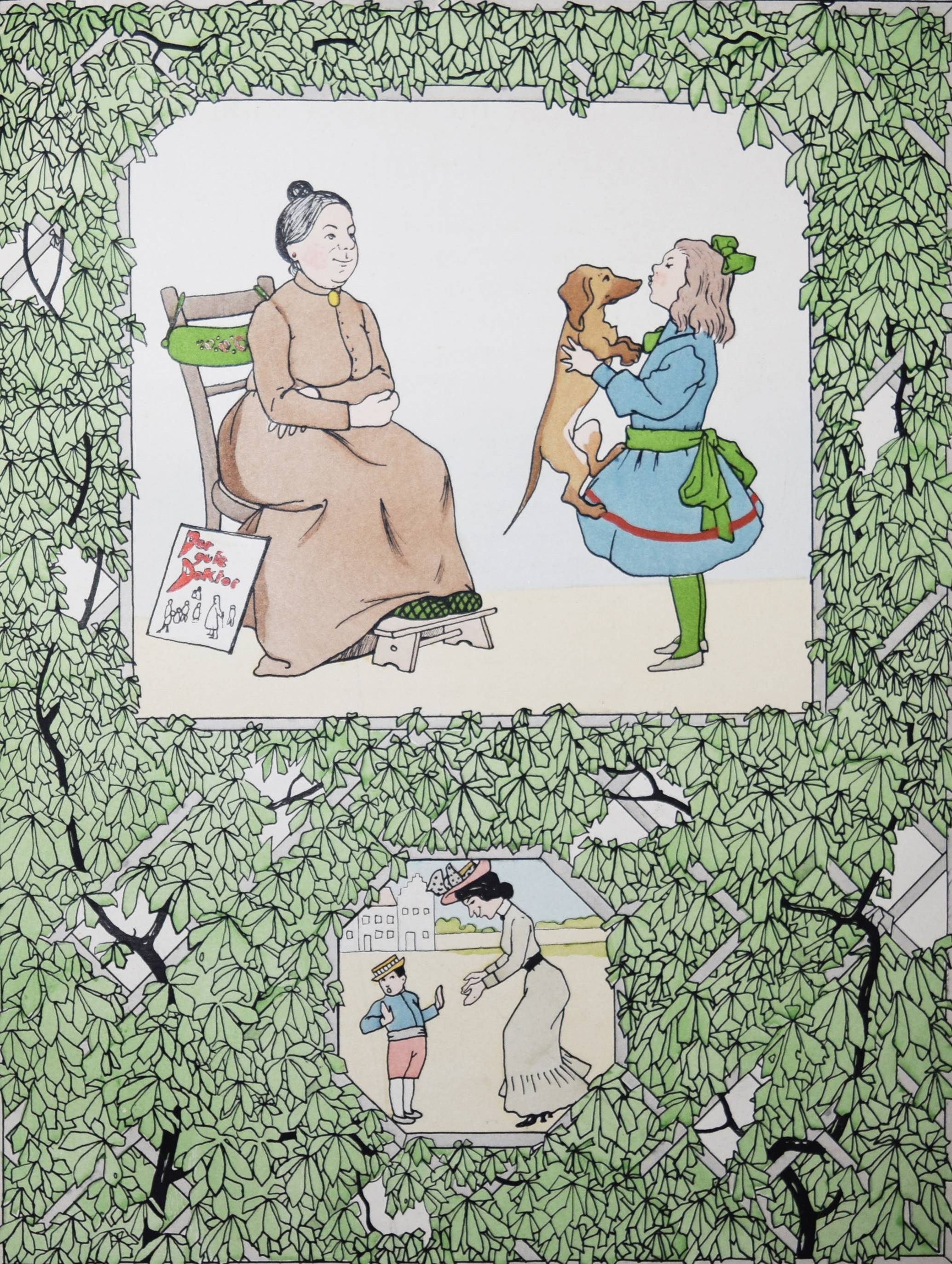 Struwwelpeteriade – Nassauer, Max. Der gute Doktor. Ein nützliches Bilderbuch für Kinder und Eltern. 2. Aufl. München, Braun & Schneider o. J. (ca. 1907). Folio 31 S. mit 14 ganzs. handkol. Illustrationen von H(ellmut) Maison. OHLn. mit farb. Deckelbild. Bilderwelt 478. Kayser 34, 280. 150 Jahre Struwwelpeter S. 80. Klotz 4963/1. Pressler 207 (6. Aufl., mit Abb. 141). Ries 702, 1. Rühle 376. Baumgartner 2, I/114. Stuck-Villa II, 254. (Alle EA von 1905). – „Die medizinische Struwwelpeteriade des Münchner, im Dritten Reich nach England emigrierten Zeichners Maison, der sonst nicht weiter als Illustrator hervorgetreten ist, spielt in eher ironischer Weise mit Jugendstilelementen. In den Bildern zu „Hans, der die Tiere neckte“ zitiert Maison eine Jugendstileinrichtung, deren Details in den Kunstzeitschriften der Zeit nachweisbar sind“ (H. Ries). „Der Verfasser, der selbst Arzt war, schildert die schlimmen Folgen, die aus Unvernunft und Ungehorsam für die Gesundheit entstehen können, wie beispielsweise in der Geschichte von „Anna, die sich die Zähne nicht putzte“ (Pressler S. 115). Vgl. auch A. H. Murken in „Kind, Krankheit und Krankenhaus im Kinder- und Jugendbuch seit 1800“ 2.Aufl. Herzogenrath 1983 (ausführl.). – Einband etwas fleckig u. berieben, Innengelenke angeplatzt, eine Tafel unten mit unauffällig restaurierten Abriß, untere Blattränder leicht fingerfl., noch gutes Exemplar.