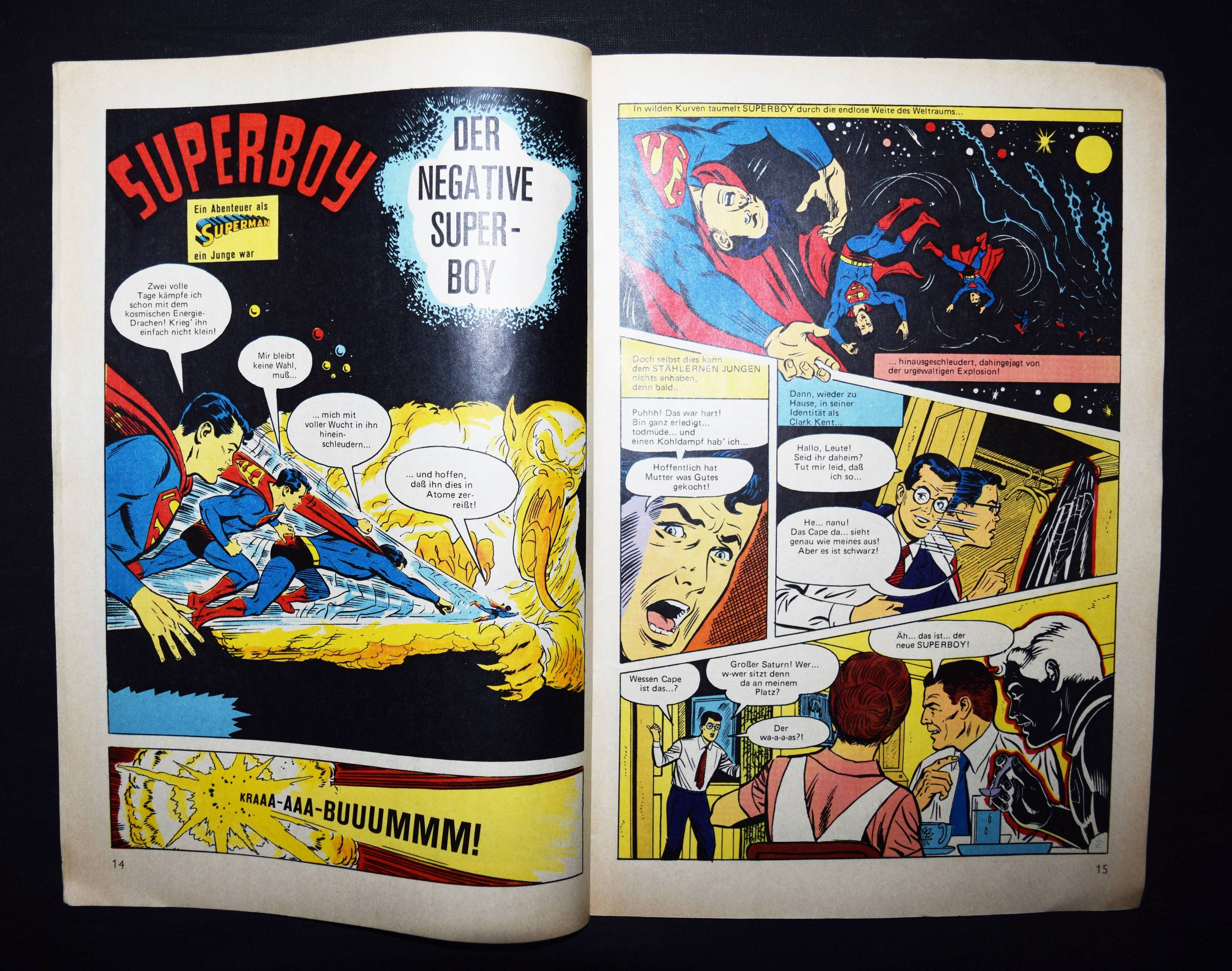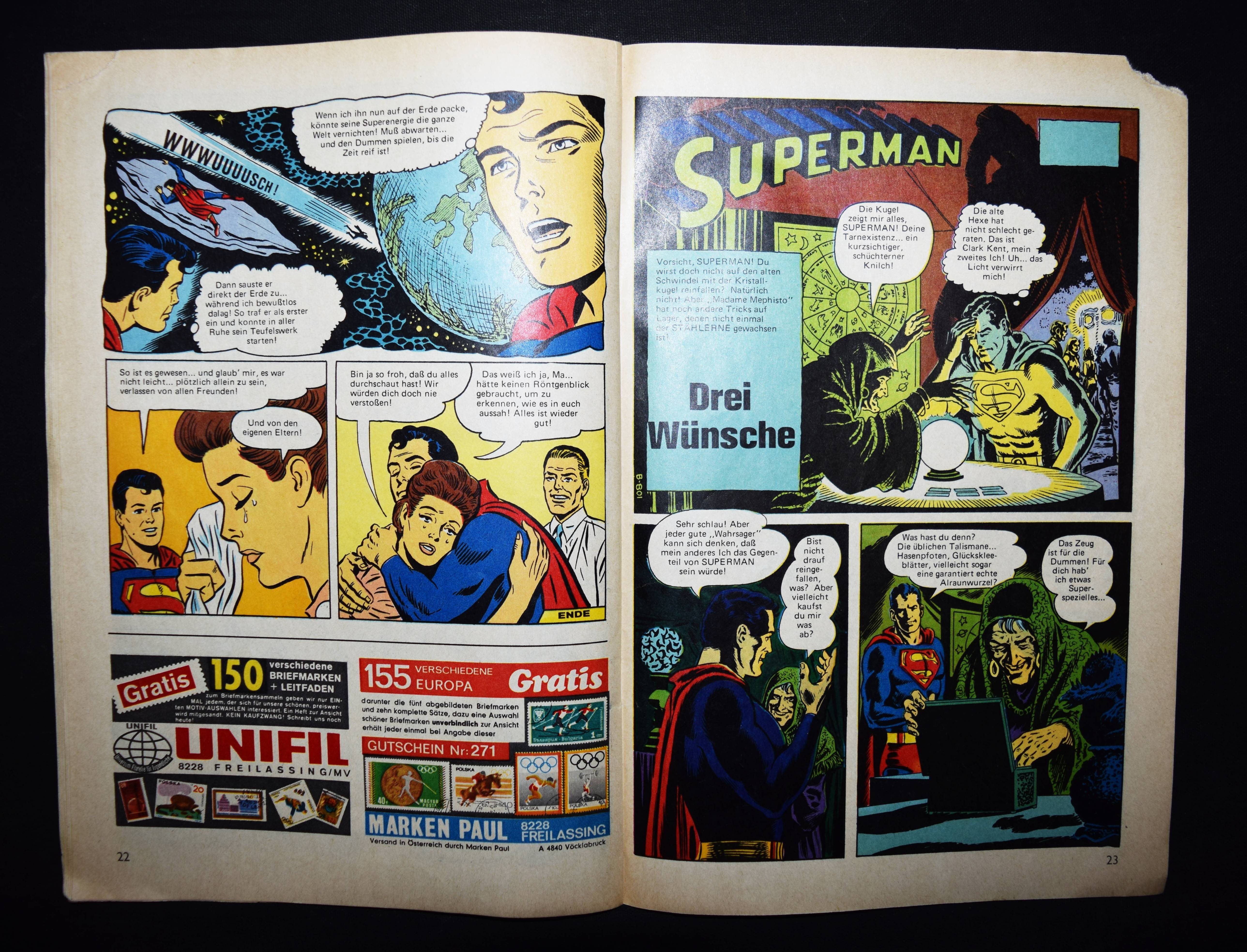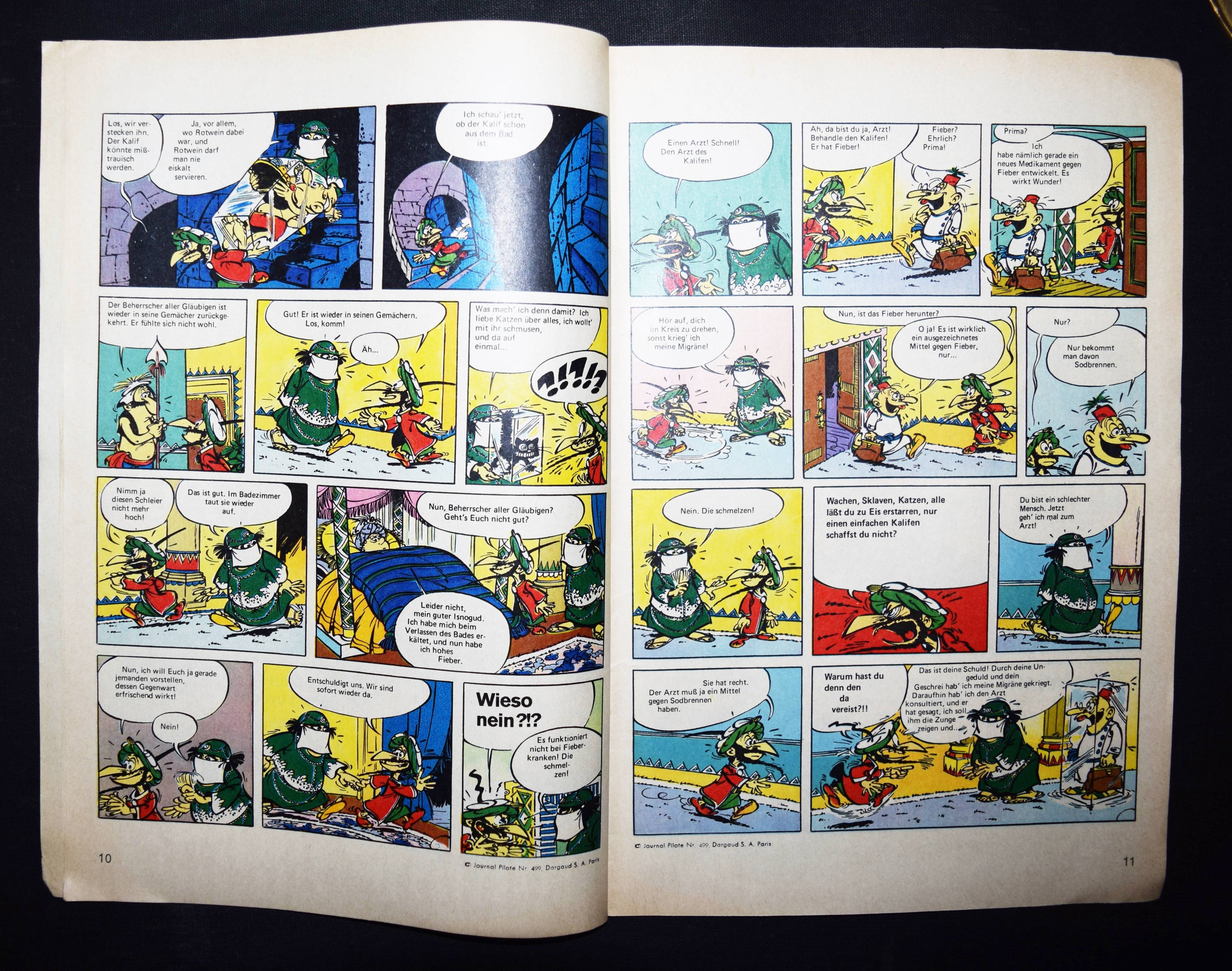 Goscinny, René. Asterix bei den Schweizern. (1. Teil von 10). Stuttgart, Ehapa-Verlag 27. März 1971. 8°. 30 S. mit farb. Illustrationen von Albert Uderzo. Farbig illustr. OBr. (MV-Comics, Nr. 7). Sehr seltene erste deutsche Ausgabe des ersten Teils des Asterix-Abenteuers. – „Astérix chez les Helvètes“ erschien zuerst in Fortsetzungen in der franz. Kinderzeitschrift Pilote (Nr. 557-578) und wurde 1970 als Album im Verlag Dargaud veröffentlicht. In der deutschen Übersetzung wurde die Geschichte vom Ehapa-Verlag 1971 im Magazin MV-Comix (Hefte 7–17) erstmals abgedruckt und 1973 als 16. Band der Asterix-Reihe herausgebracht. – Das vorliegende Heft enthält außerdem noch: Isnogud. Die Abenteuer des Kalifen Harun el Pussah. Das eiskalte Verbrechen oder für angelsächsische Leser: Ice Crime von Goscinny. Zeichnungen: Taborg. (Und): Superboy. Der negative Superboy. Ein Abenteuer als Superman ein Junge war. (Und): Superman. Drei Wünsche. Ebenfalls in erster deutscher Ausgabe. – Umschlag mit geringf. Gebrauchssp., gutes Exemplar.