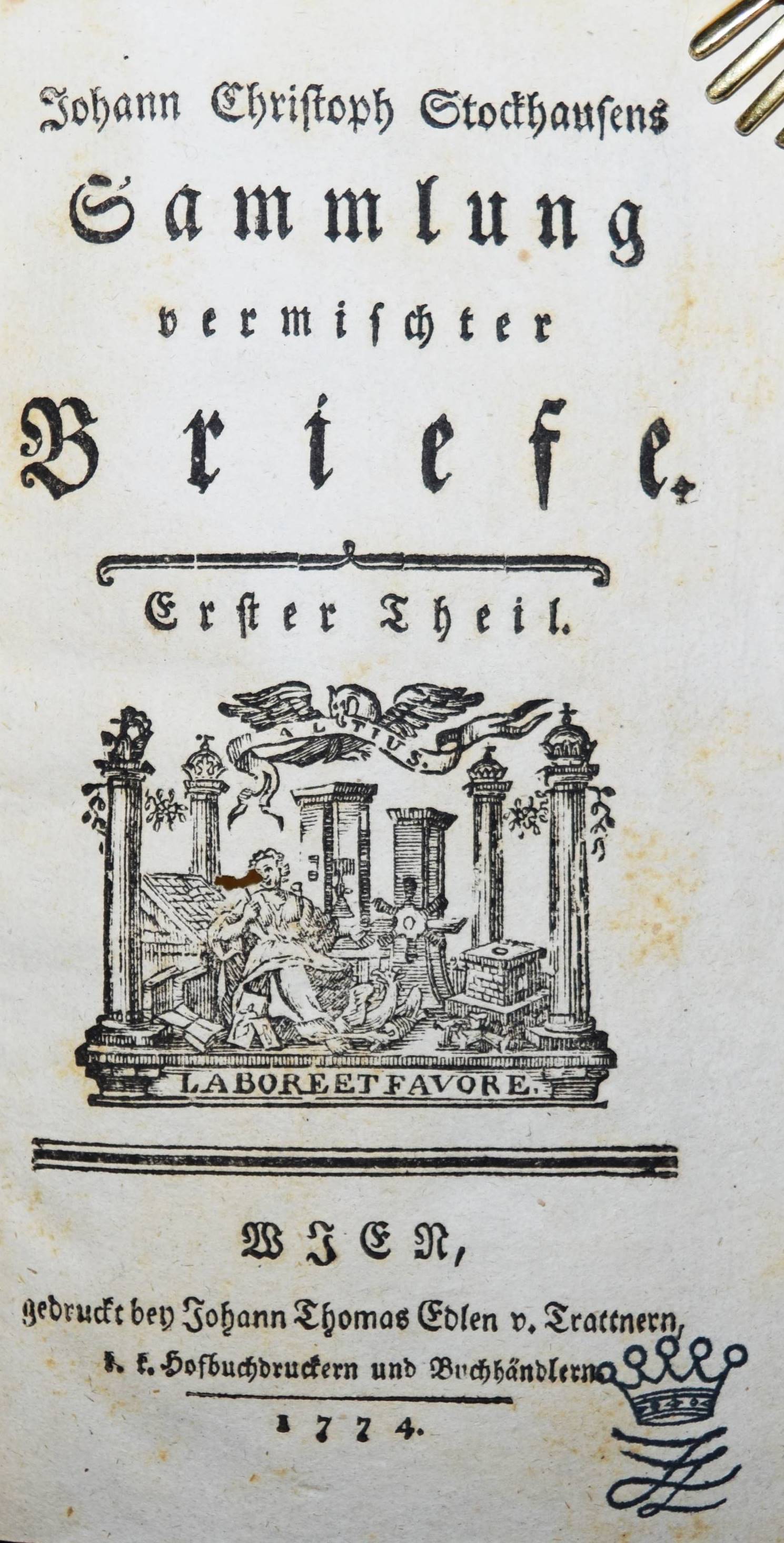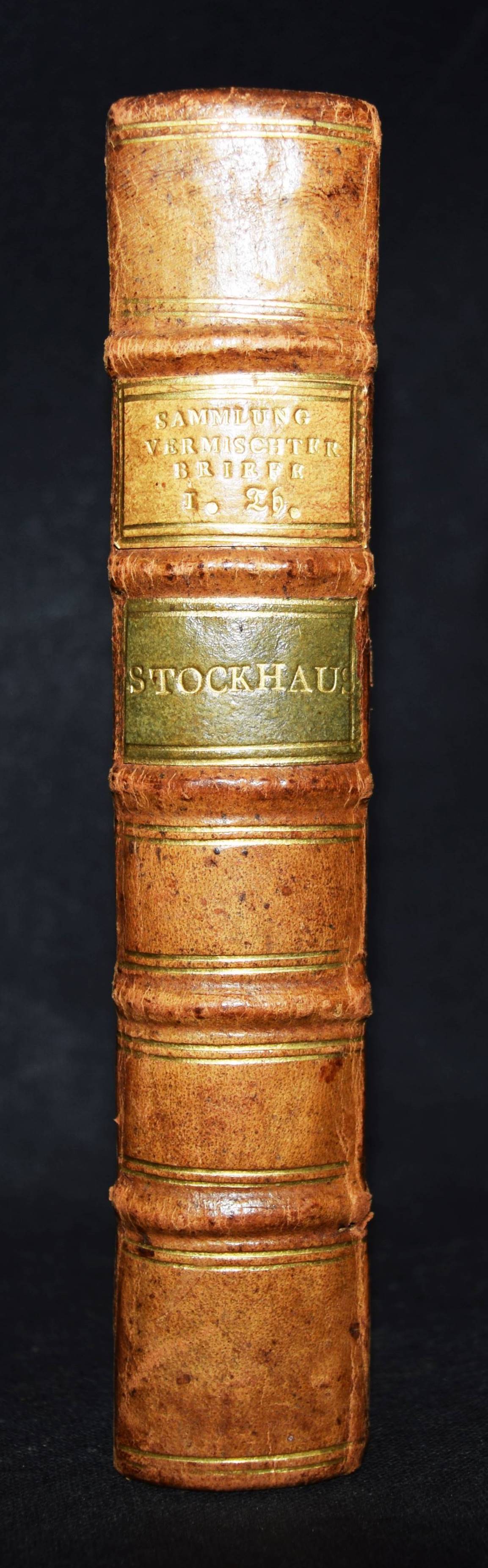Stockhausen, Johann Christoph. Sammlung vermischter Briefe. Erster Theil (von 3). Wien, Trattner 1774. 8°. 446 S., [4] Bl. mit Titelvignette in Holzschnitt. Hldr. d. Zt. mit goldgepr. Rückenschild u. Linienverg. Kosch XX, 239 f. VD18 15663213. – Erster Teil der Mustersammlung von 44 Briefen bedeutender europ. Persönlichkeiten, zur Kulturgeschichte der Zeit. – Gekrönter Monogrammstempel a. T., schönes dekorativ gebundenes Exemplar.