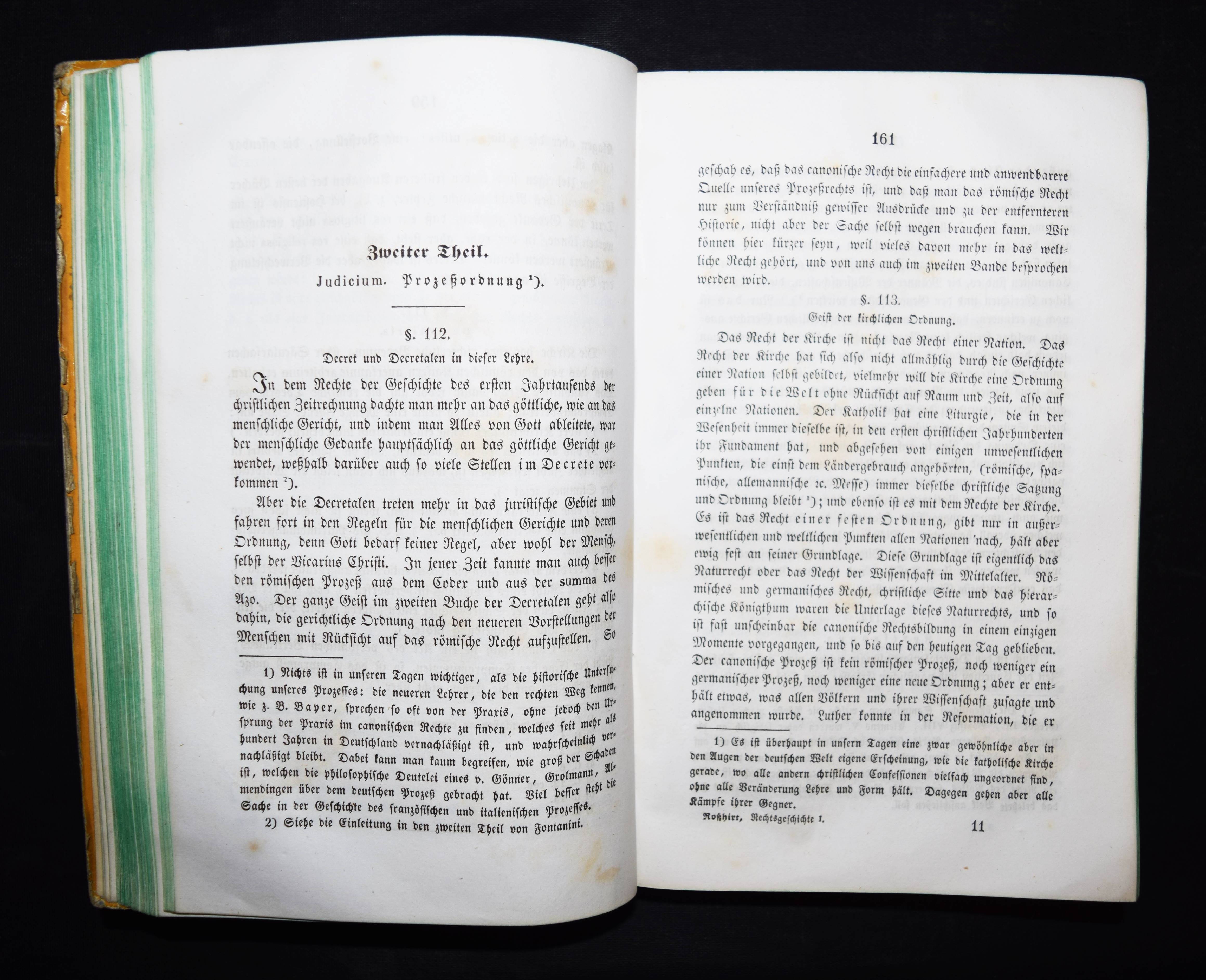 Roßhirt, C(onrad Eugen) Fr(anz). Geschichte des Rechts im Mittelalter. Erster Theil. Canonisches Recht. (Mehr nicht erschienen). Mainz, Kirchheim, Schott u. Thielmann 1846. 8°. VIII, 648 S. Pbd. d. Zt. mit goldgepr. Rückenschild u. Linienverg. ADB XXIX, 260 ff. Weech, Bad. Biogr. II, 186 f. – Erste Ausgabe, selten. – Der in Bamberg geb. Jurist K. E. F. Roßhirt (1793-1873) war seit 1818 Prof. für Recht an der Universität in Heidelberg. Er hat zahlreiche Abhandlungen zu den verschiedensten Gebieten der Rechtsgeschichte veröffentlicht. – Einband berieben u. etwas fleckig, Rücken am Fuß mit kl. Fehlstelle, nur vereinzelt etwas stockfleckig.