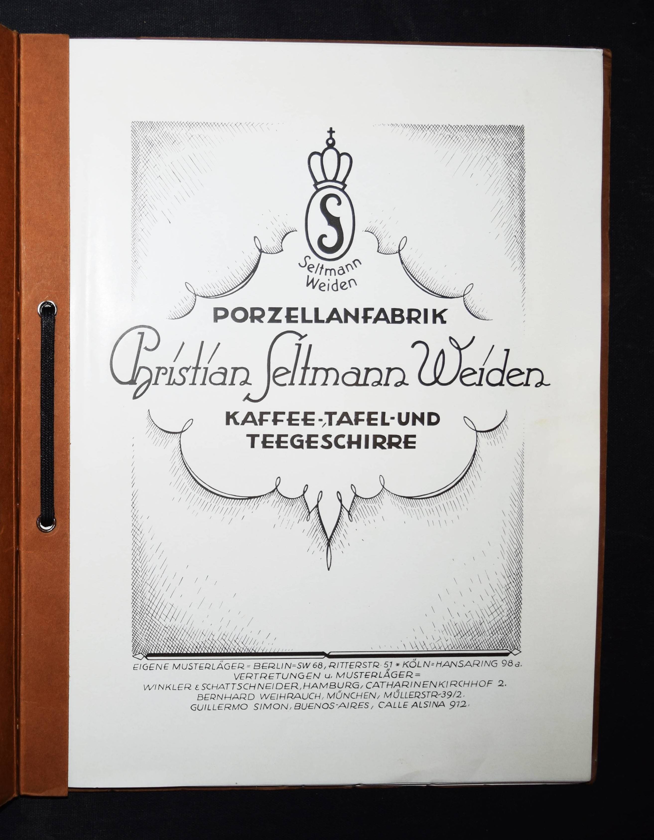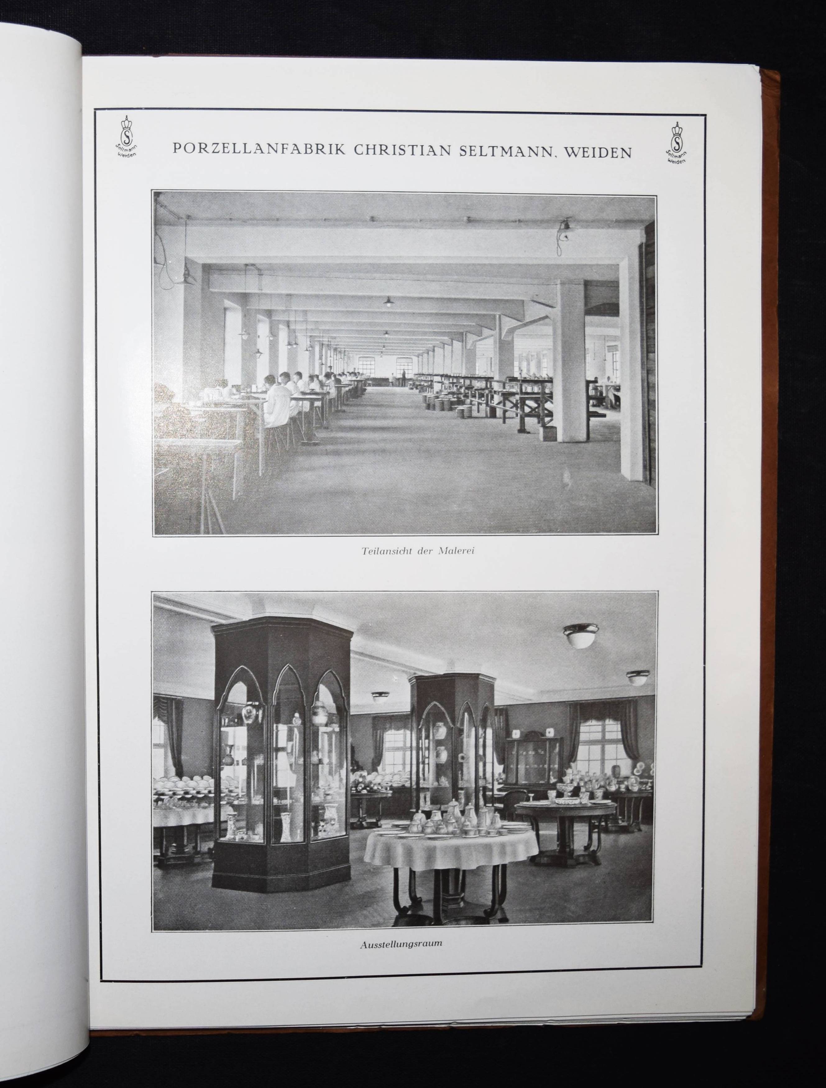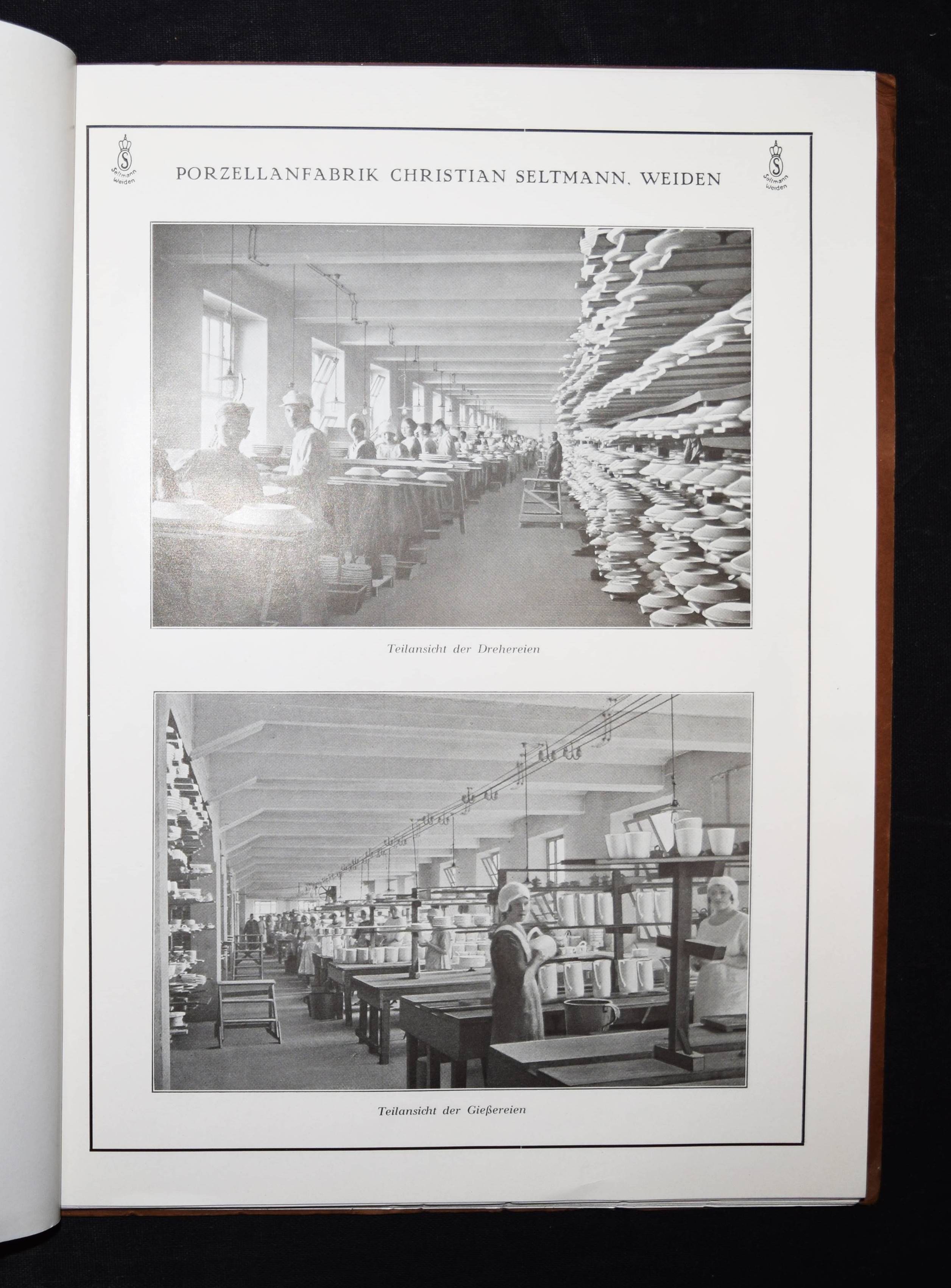 (Seltmann, Wilhelm, Hrsg.). Kaffee-, Tafel- und Teegeschirre. (Katalog der) Porzellanfabrik Christian Seltmann Weiden. Weiden, Selbstverlag o. J. (um 1925). 4°. [12] Bl., 16 S. mit zahlr. Abb. u. 14 farblithogr. Tafeln. Illustr. OKart. Schön ausgestatteter Verkaufskatalog der bekannten oberfränkischen Porzellan-Manufaktur. – „Die „Porzellanfabriken Christian Seltmann“ wurden im Jahr 1910 von Christian Wilhelm Seltmann (geb. 1870) gegründet. Er lernte zunächst den Beruf des Porzellandrehers und modellierte und bemalte in seiner Freizeit Porzellan. Die Firma Seltmann Weiden begann ihre Produktion für Gebrauchs- und Luxusporzellan zunächst mit drei Rundöfen, die 1913 um zwei vermehrt wurden“ (Wikipedia). – Sehr gutes Exemplar.