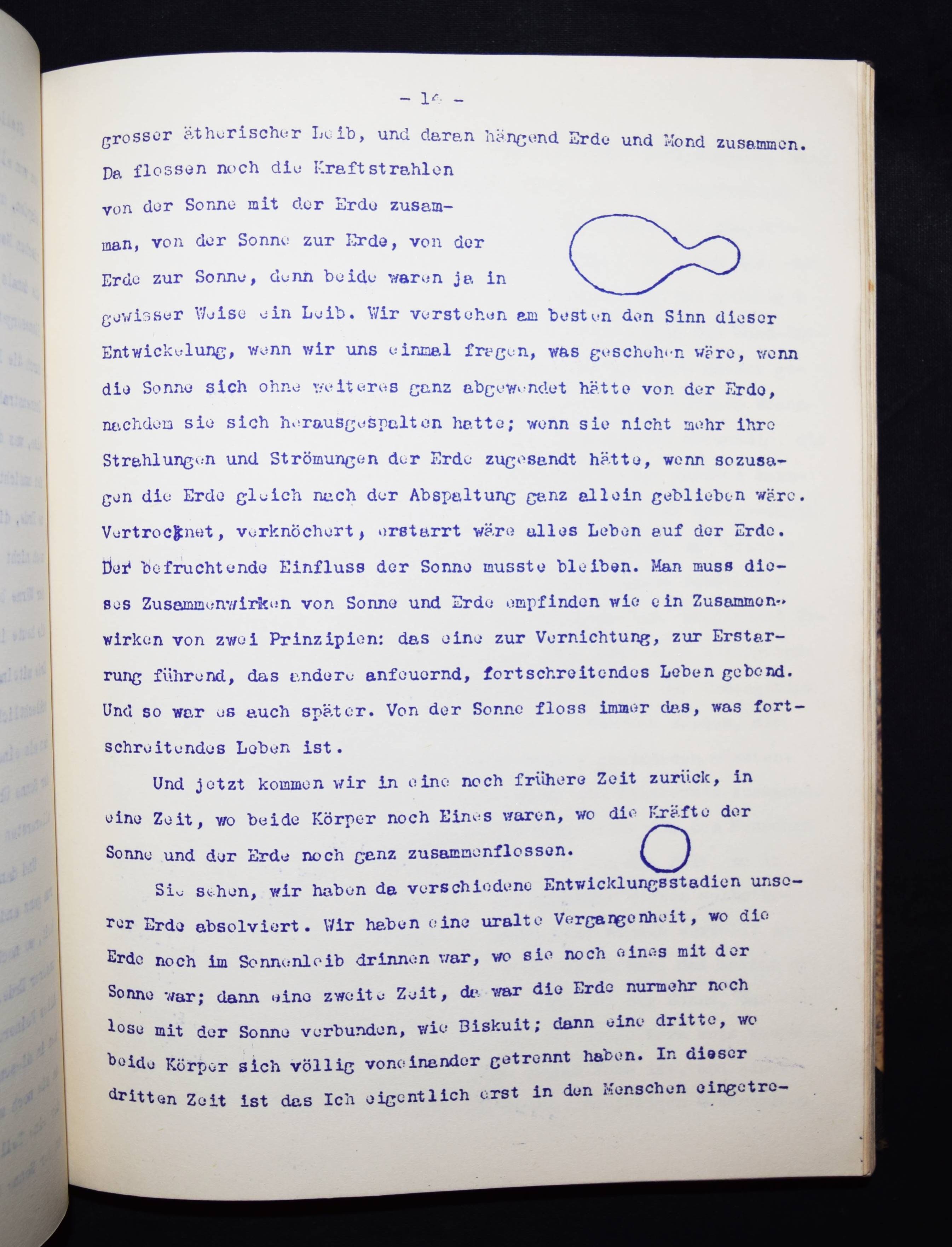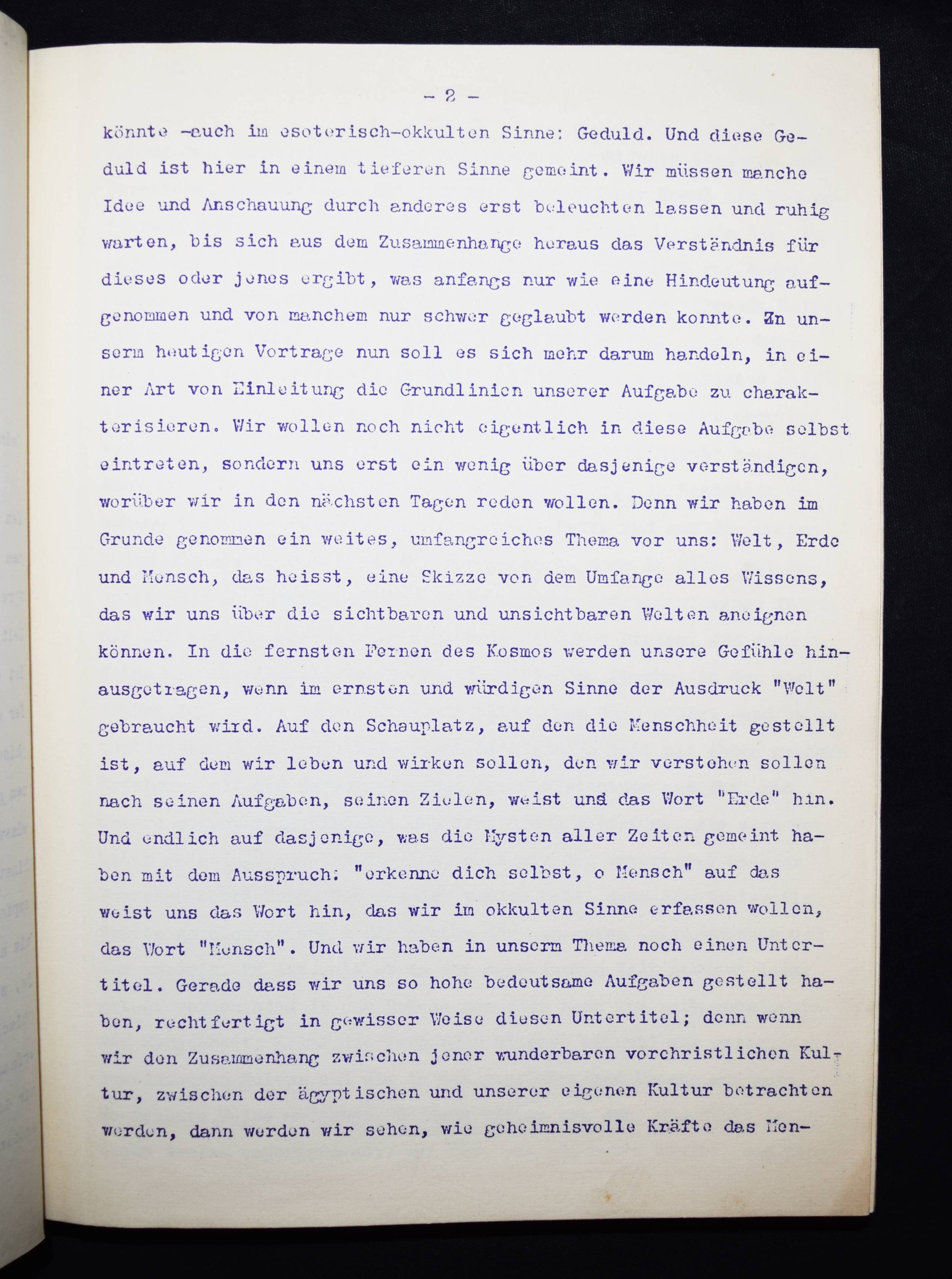 Steiner, Rudolf. Welt, Erde und Mensch, deren Wesen und Entwicklung, sowie ihre Spiegelung in dem Zusammenhang zwischen ägyptischem Mythos und gegenwärtiger Kultur. Vortragszyklus gehalten vom 4. bis 11. August 1908 in Stuttgart. (Hektographiertes Typoskript oder Maschinenmanuskript). 11 Teile in 1 Band. Berlin 1908. 8°. Getrennte Paginierung. Hln. d. Zt. mit goldgepr. Rückentitel. Erste Ausgabe, selten wie alle Vortrags-Typoskripte. – Die Sammlung mit 11 theosophischen Vorträgen, die Steiner im August 1908 in Stuttgart hielt, erschien erst 1930 in Buchform in Dornach. – R. Steiner (1861-1925) gründete 1912 den „Anthroposophischen Bund“ (seit 1913 „Anthroposophische Gesellschaft“). „Er entwickelt eine Philosophie der Freiheit, die das Individuum als „Quell aller Sittlichkeit und Mittelpunkt alles Lebens“ betrachtet. Seine Interpretation der naturwissenschaftlichen Schriften Goethes geht aus von einem Glauben an die überragende Bedeutung der Intuition für Erkenntnis und Bildung der Weltanschauung. Dieser Glaube wird für ihn das Band zur theosophischen Bewegung, über die er bald hinauswächst zur Entwicklung seiner „Anthroposophie“ einer Geheimlehre, die den Anspruch erhebt, eine Erkenntnis höherer Welten zu eröffnen, zugleich aber auch durch vertiefte Einsicht das gesellschaftliche Leben in Staat und Wirtschaft zu gestalten“ (W. Ziegenfuss). – Rücken in der unteren Hälfte stärker berieben, sonst gut erhalten.