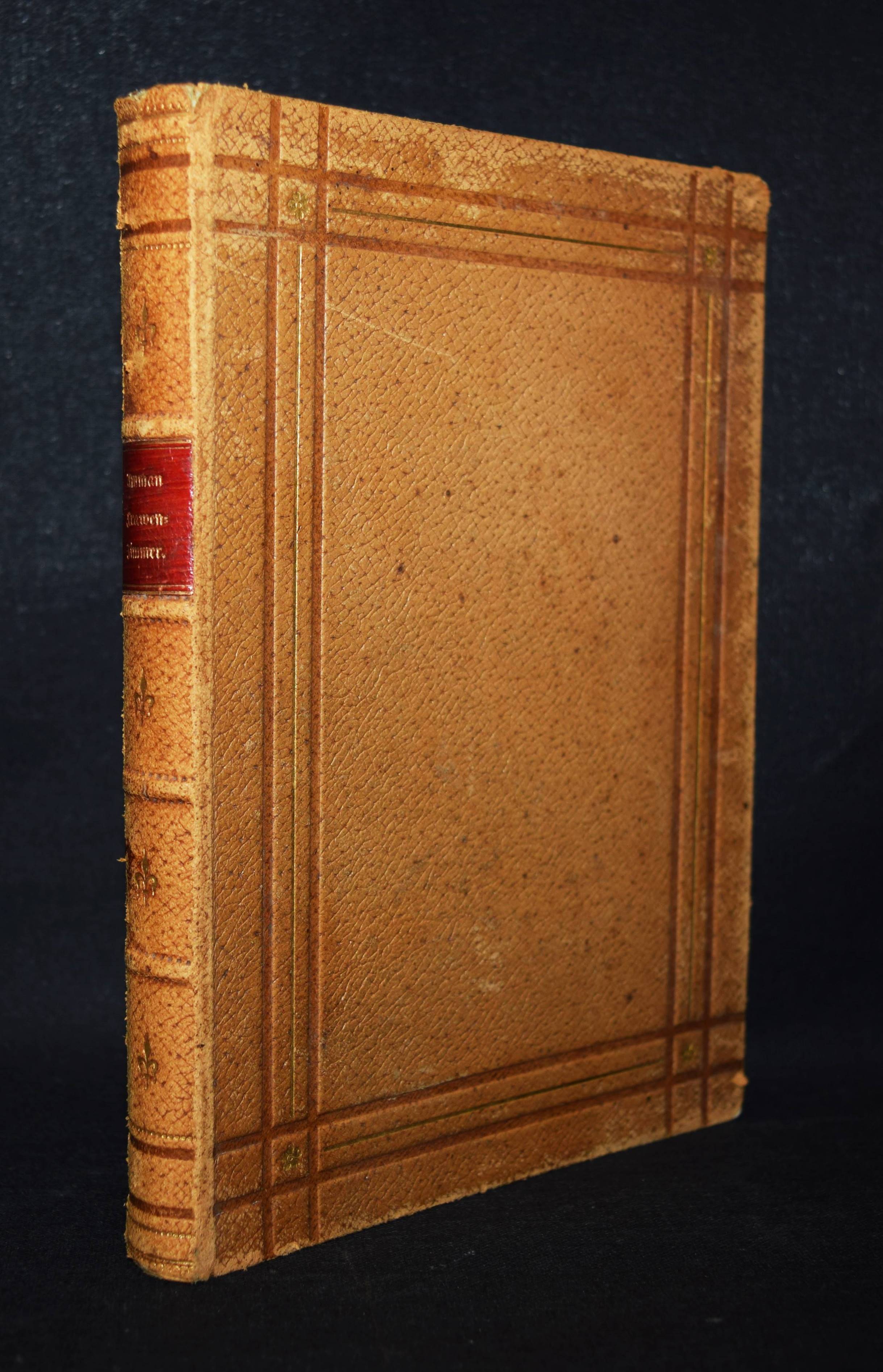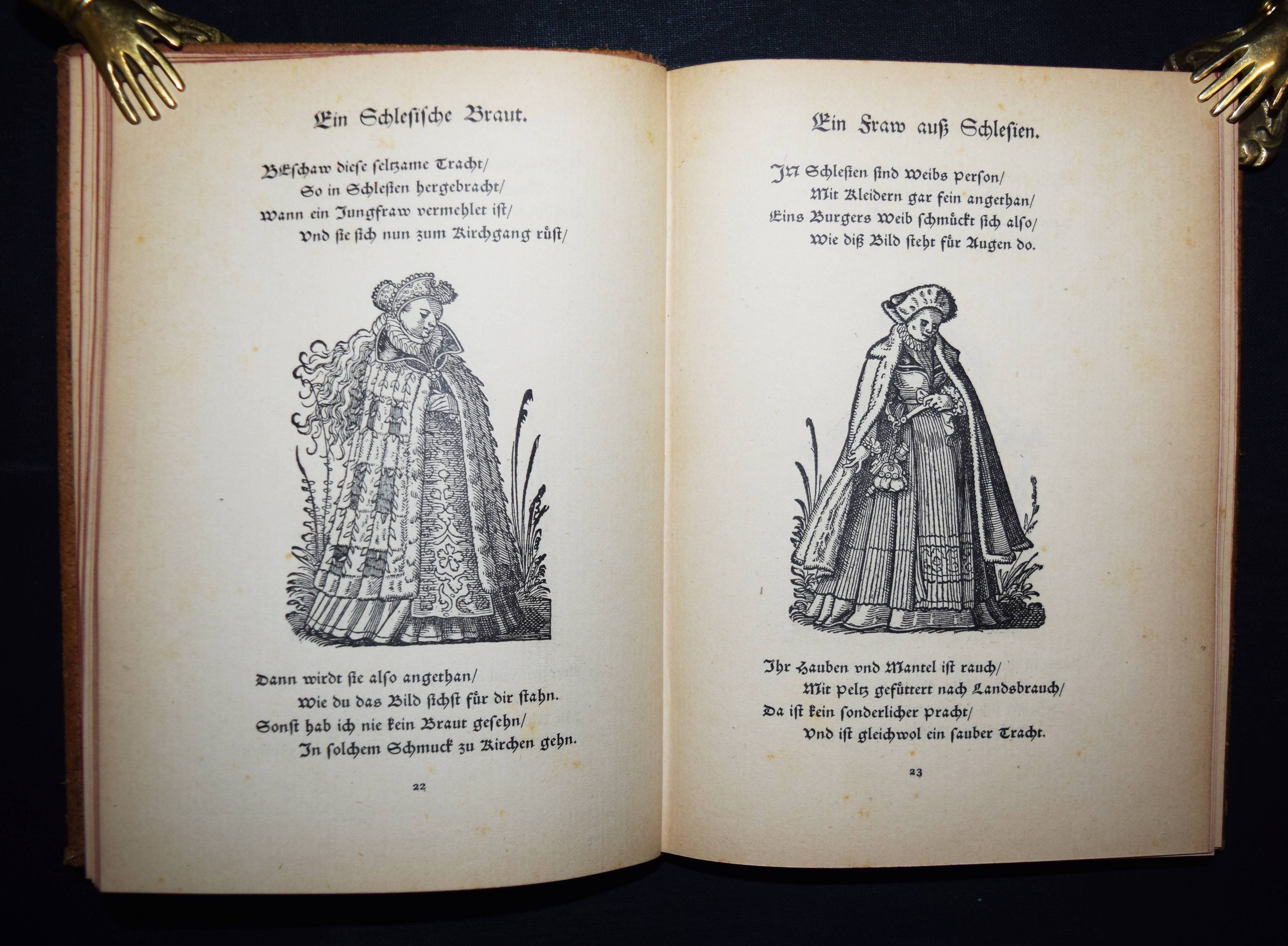 Amman, Jost. (Frauentrachtenbuch). Im Frauwenzimmer wirt vermeldt von allerley schönen Kleidungen und Trachten der Weiber / hohes und niders Stands / wie man fast an allen Orten geschmückt und gezieret ist … Durchaus mit neuwen Figuren gezieret. (Faksimile-Druck der Ausgabe bei Sigmund Feyrabend, Frankfurt am Main von 1586). (München, G. Hirth 1880). 8°. [4] Bl., 127 S. mit 122 Holzschnitten. Blindgepr. OLdr. mit goldgepr. Rückenschild, dezenter Rückenverg. u. goldgepr. Deckelfiletten. Hinteres Gelenk am Kapital geklebt, gutes Exemplar.
