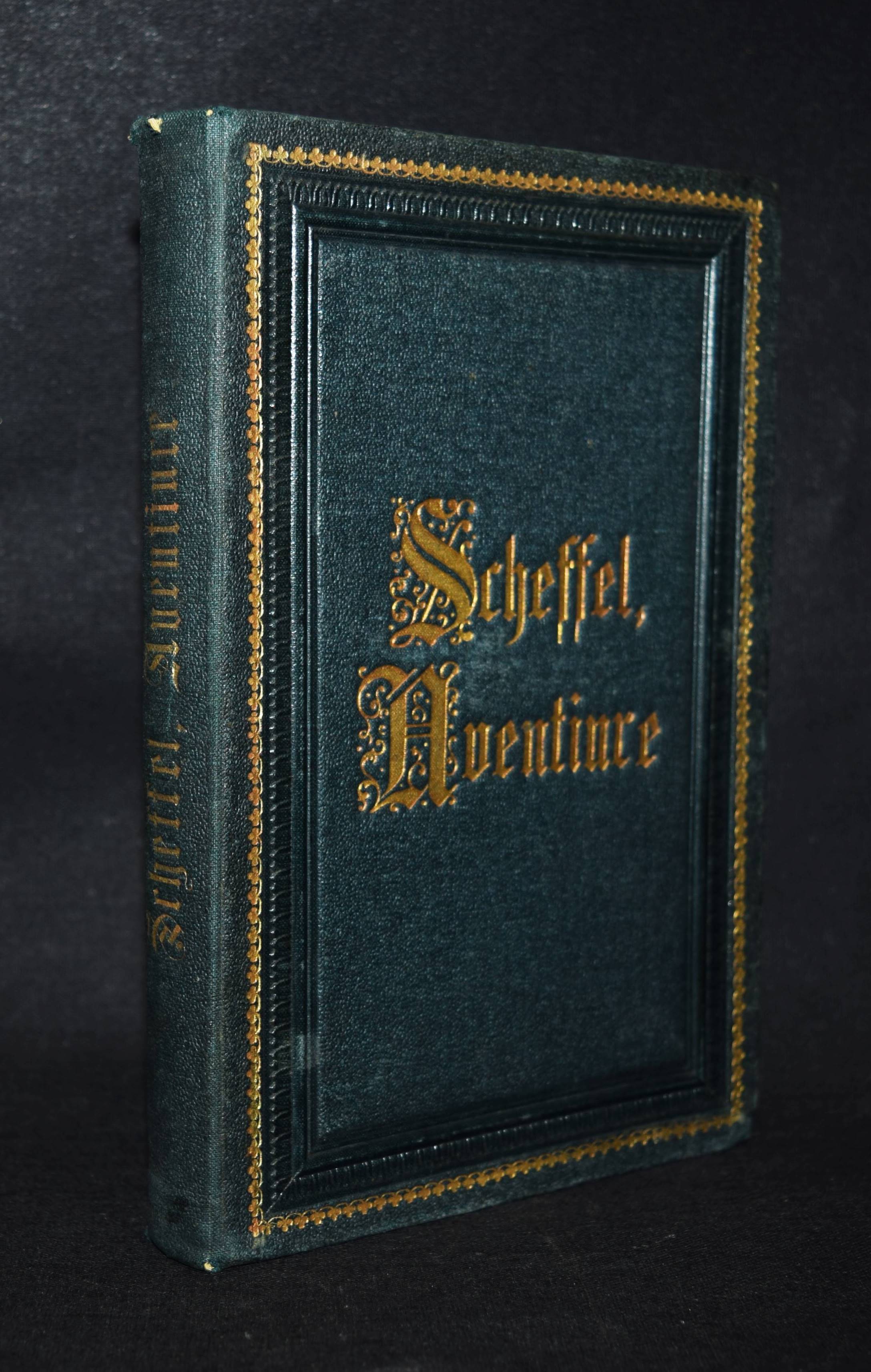Scheffel, Joseph Victor. Frau Aventiure. Lieder aus Heinrich von Ofterdingen’s Zeit. Stuttgart, Metzler 1863. 8°. XV, 248 S. mit Holzschnitt-Frontispiz. Dunkelgrüner OLn. mit goldgepr. Rücken- u. Deckeltitel, Deckelfiletten sowie Goldschnitt. Slg. Borst 2881. Brieger 2250. W.-G.² 4. – Erste Ausgabe. – Stellenweise stockfl., gutes Exemplar.