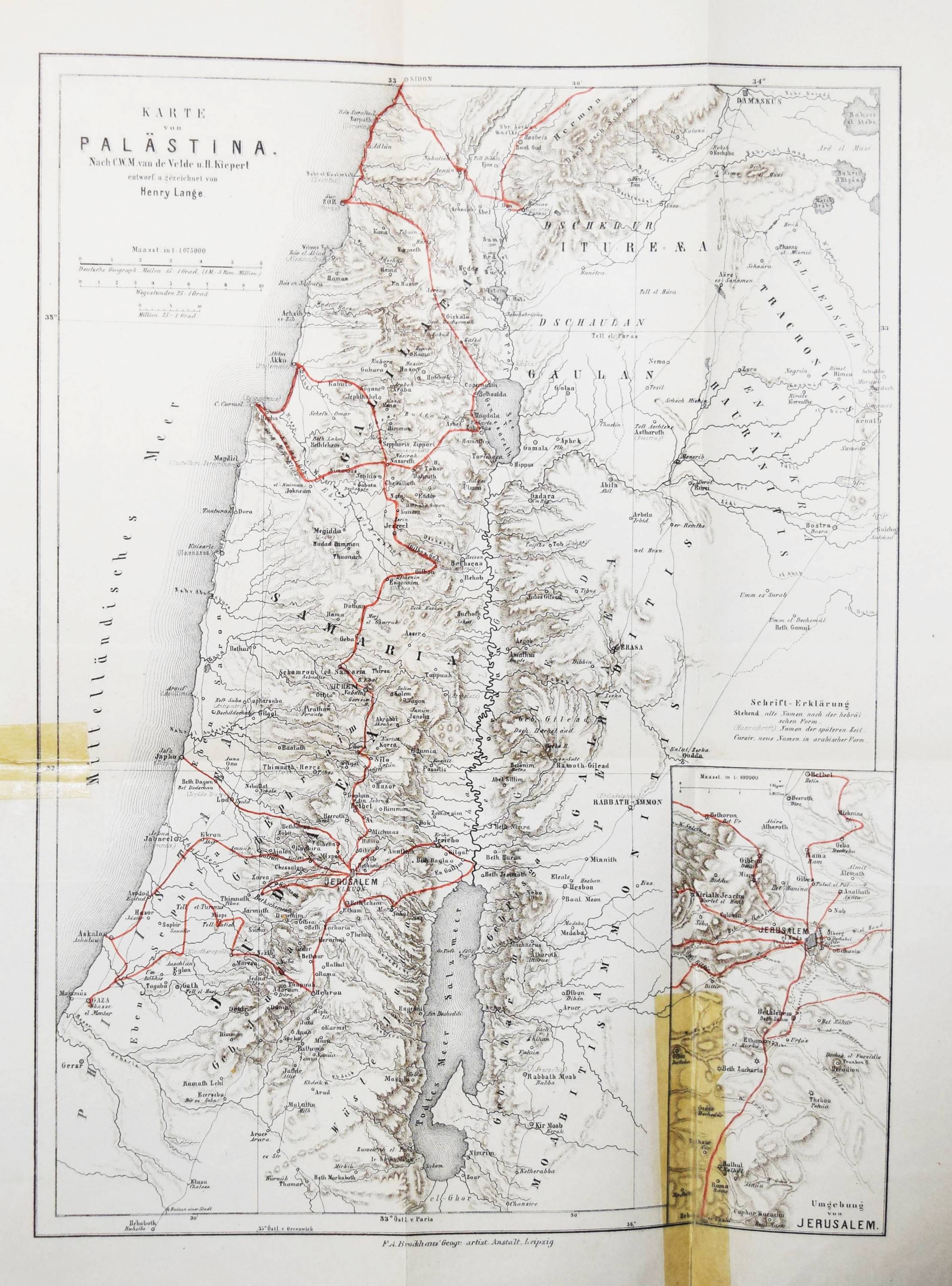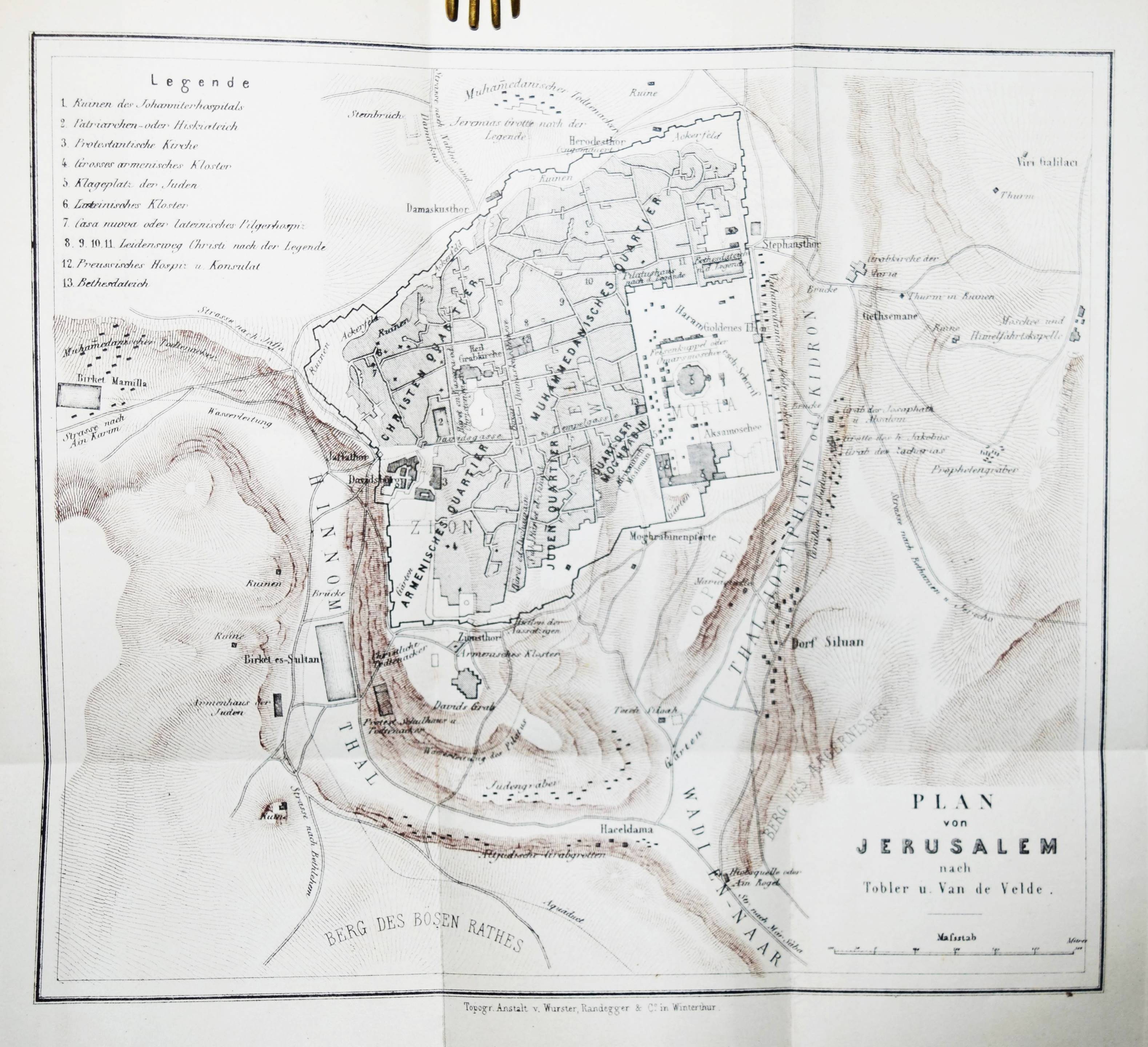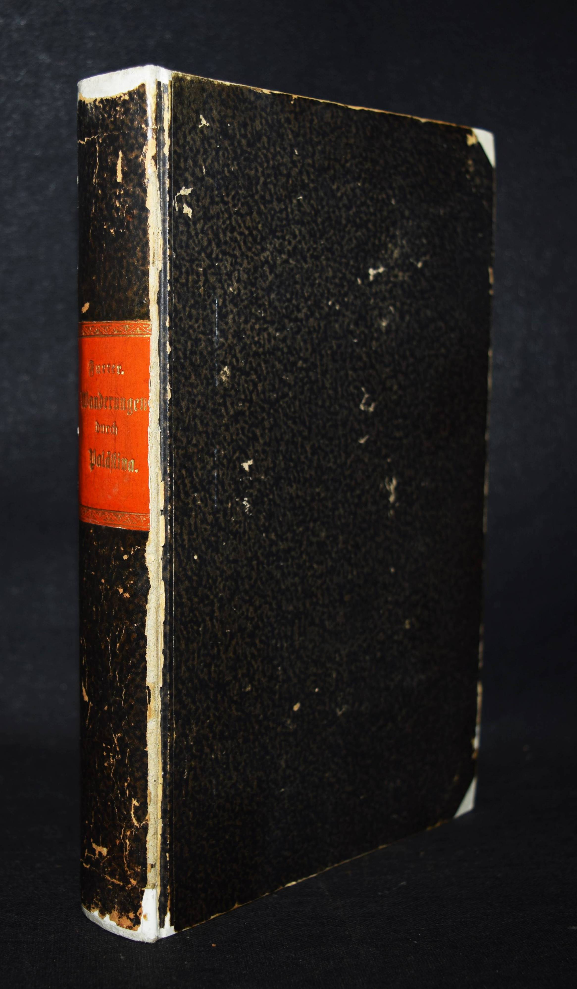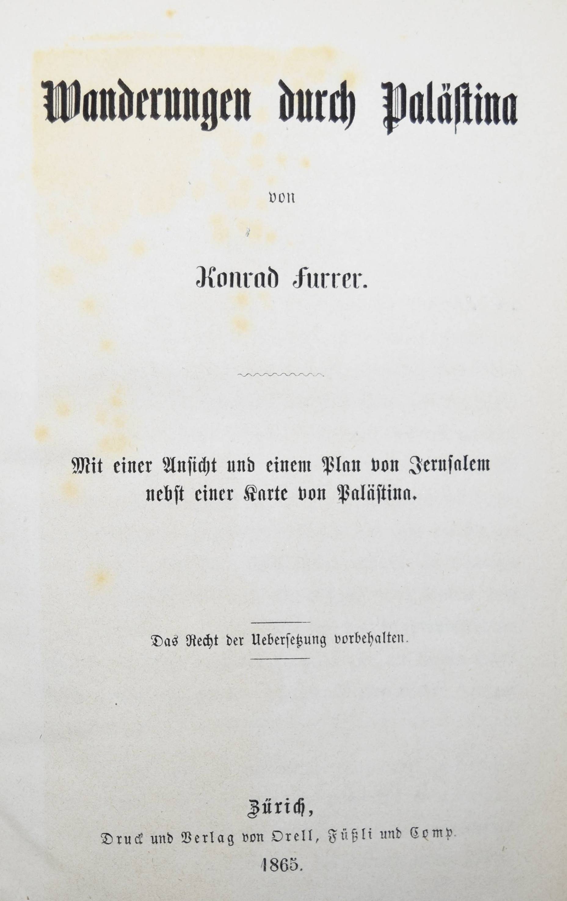 Furrer, Konrad. Wanderungen durch Palästina. Zürich, Orell Füßli 1865. 8°. XII, 414 S. mit 1 Stahlstich-Ansicht u. 1 farblithogr. gefalt. Plan von Jerusalem sowie 1 farblithogr. gefalt. Karte. Pbd. d. Zt. mit goldgepr. Rückenschild. Röhricht 2778. Tobler 202 (″Manches neue, viel frisches“). – Erste Ausgabe. – K. Furrer (1838-1908), „(d)er rastlose Sohn eines Bauern, v.a. durch Predigt, Unterricht und Vortragstätigkeit bekannt geworden, theologisch unter den frommen, undoktrinären Liberalen einzuordnen, verfasste neben einigen populärwissenschaftlichen Schriften ein Buch über seine Reise ins Heilige Land, das dank der präzisen Beobachtungen noch heute als interessante und wichtige Quelle über die damaligen Zustände in Palästina gelten kann (H.-P. Mathys in HLS). – Einband etwas berieben, gutes sauberes Exemplar.