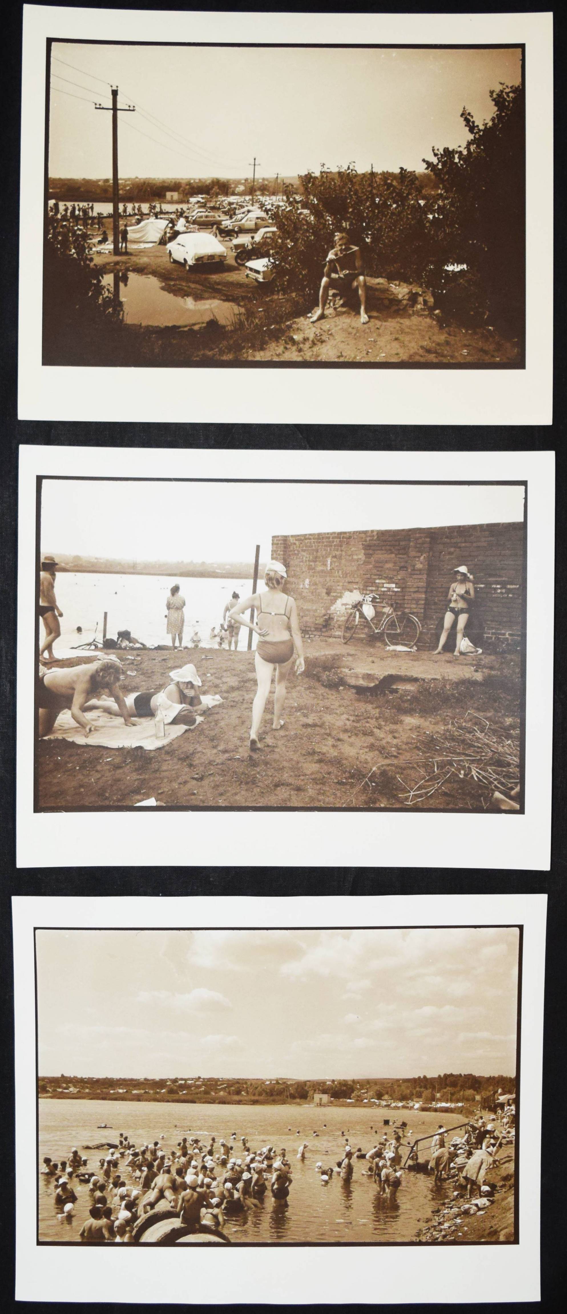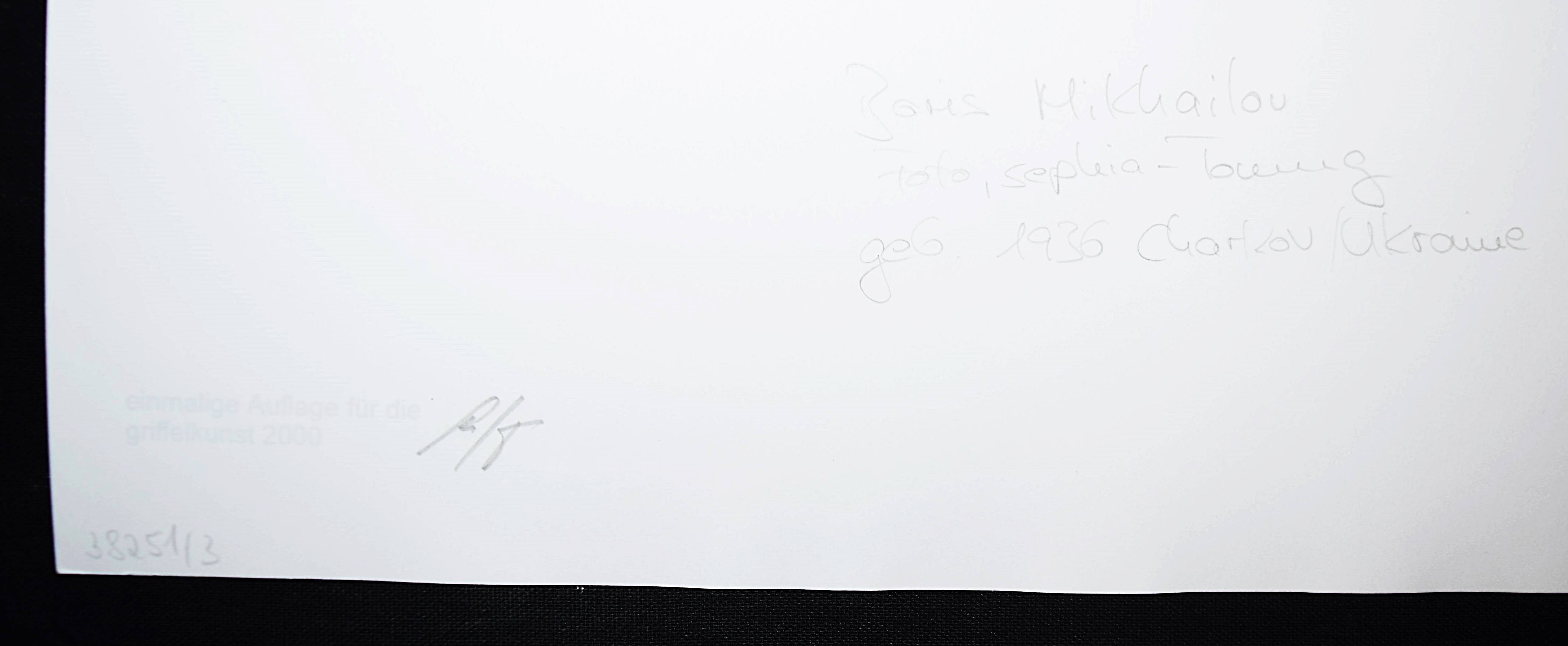 Mikhailov (auch Mihailov), Boris Andreievitch (geb. 1938). 3 Orig.-Photographien aus der Serie „Salt Lake“. Hamburg, Edition Griffelkunst (300 B3, B5 und B6) 2000. Blattgr.: 23,8 x 30,4 cm. Bildgr.: 28 x 19 cm. Alle drei Aufnahmen in Sepia-Tönung. – „Boris Mikhailov ist heute fraglos der bedeutendste Fotograf mit ‚sowjetischem Hintergrund‘. In den vergangenen Jahren haben seine Ausstellungen und Bücher immense internationale Aufmerksamkeit auf sich gezogen. Am derzeitigen Punkt seines über dreißigjährigen Schaffens entwickelt Boris Mikhailov weiterhin sein großes Thema – die Schilderung des Untergangs der sowjetischen Utopie. Biris Mikhailovs Standpunkt ist kritisch; seine Arbeit zeigt eine konsequent humanistische Herangehensweise mit starken gefühlsbetonten Elementen und einem in Ost wie West als eindringlich und bewegend empfundenen Sinn für Humor. Trotz der Arbeit unter extrem schwierigen Bedingungen ist es ihm immer gelungen, äußerst einnehmende und Aufsehen erregende fotografische Kunst zu schaffen“ (G. Knape in Koetzle S. 300). – Verso monogrammiert, gestempelt und datiert 2000.