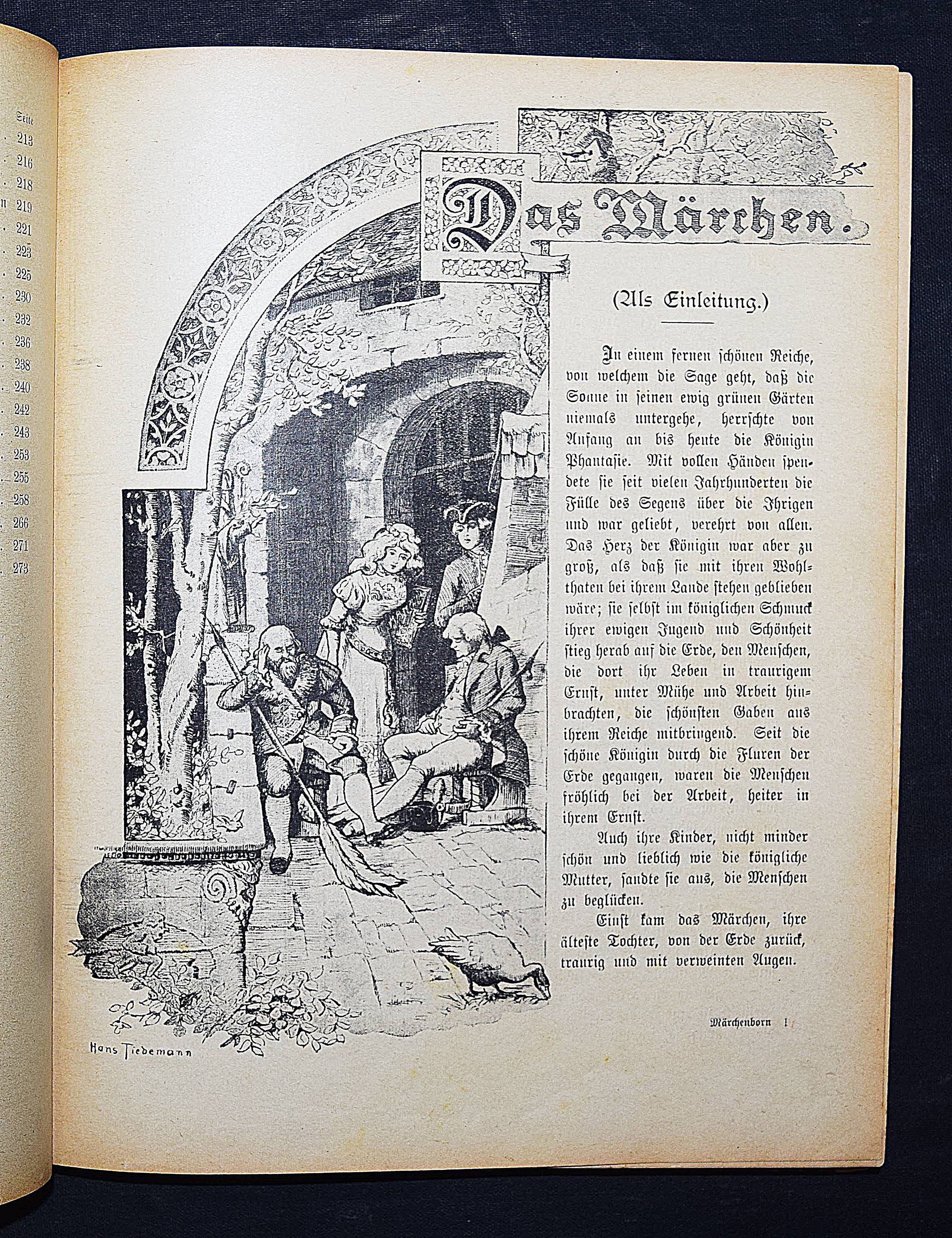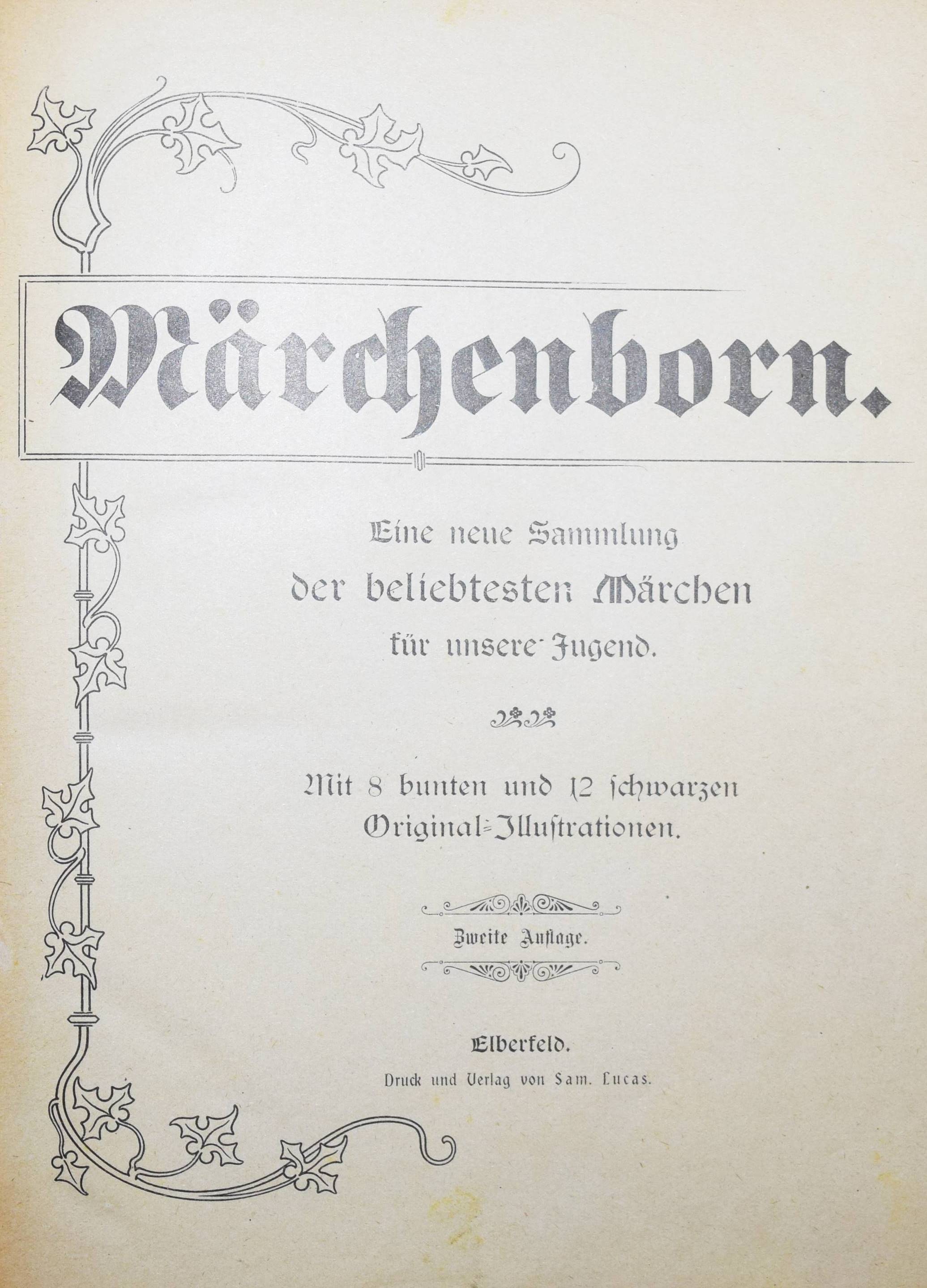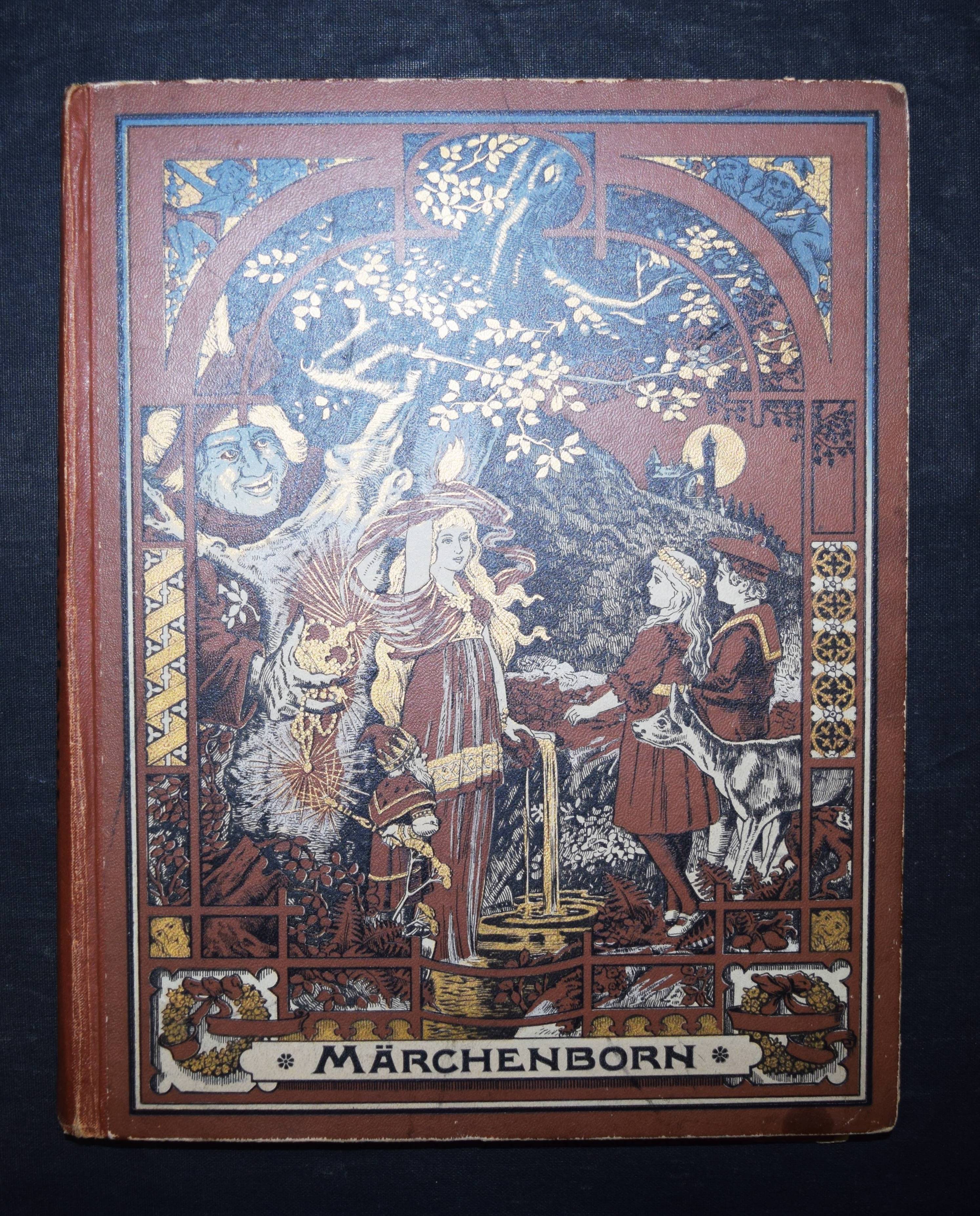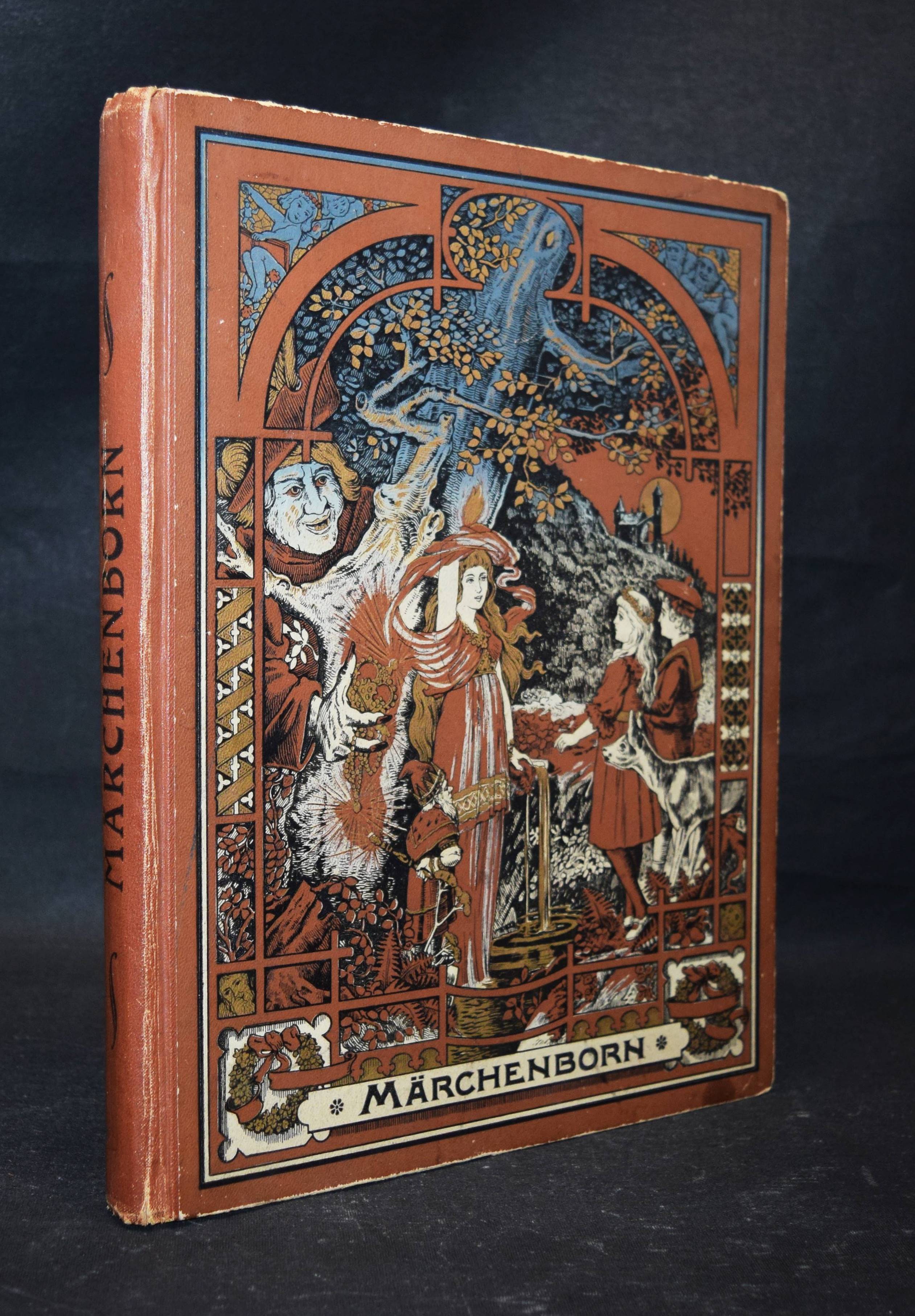 Märchenborn. Eine neue Sammlung der beliebtesten Märchen unserer Jugend. 2. Aufl. Elberfeld, Lucas o. J. (ca. 1905). 4°. 275 S. mit 8 chromolithogr. Tafeln u. 12 Illustrationen im Text von Hans Tiedemann. Farbig illustr. OHln. Klotz 9000/1202 (nur 1. Aufl. von 1901). Nicht bei Ries 928. – Umfangreiche Sammlung mit 100 Märchen und zeittypischen Illustrationen. – Papierbedingt etwas gebräunt, gutes Exemplar.