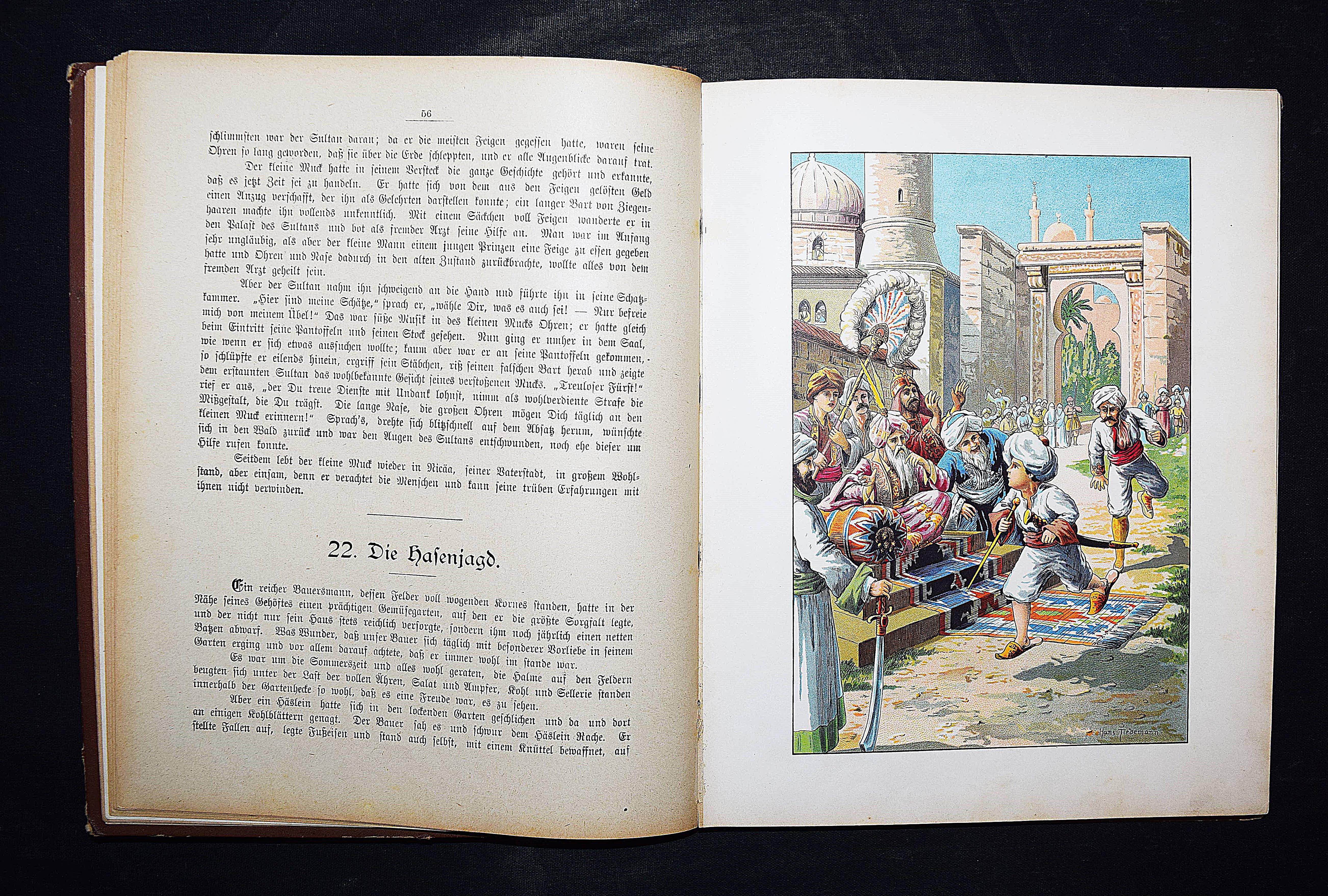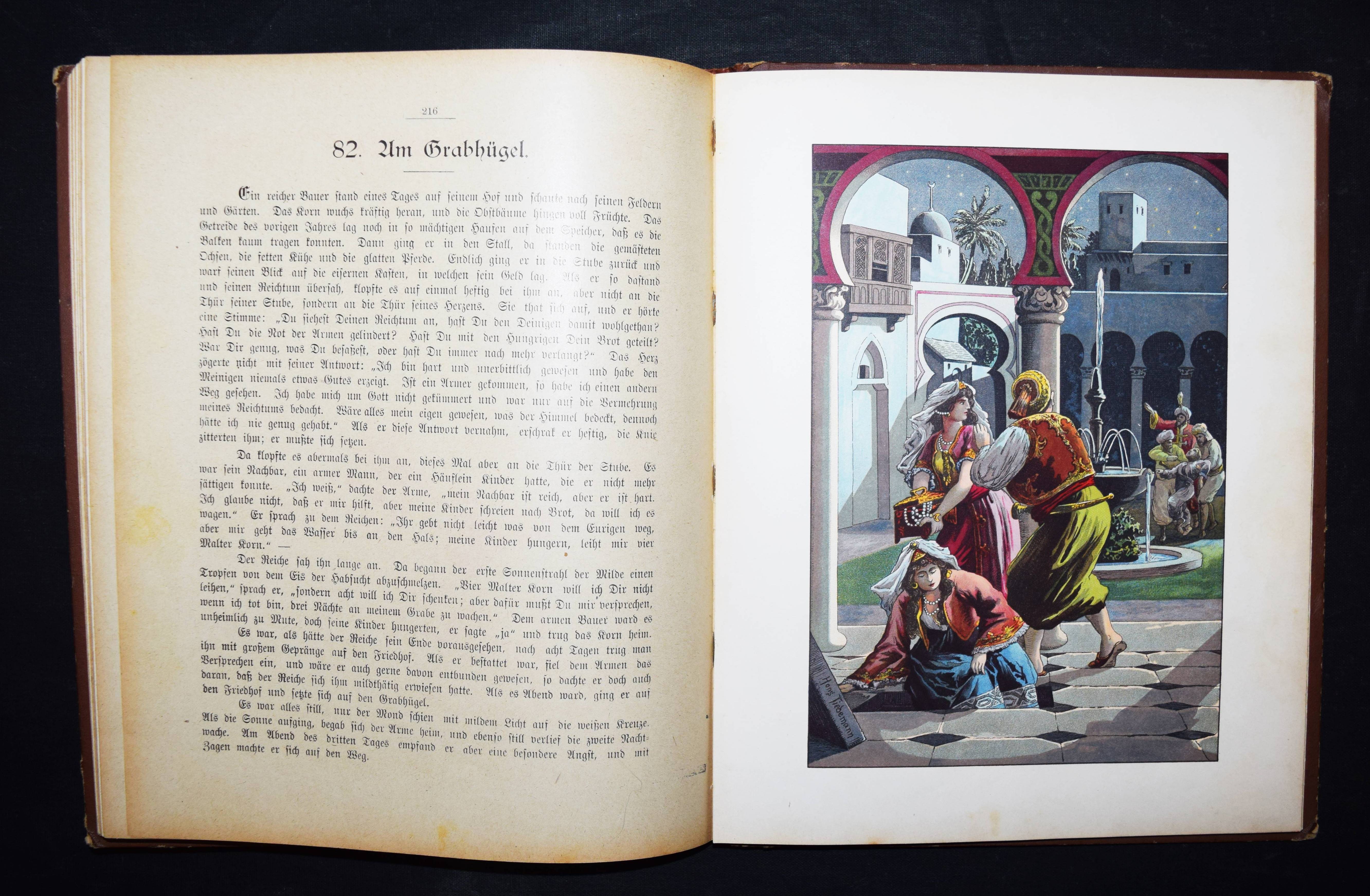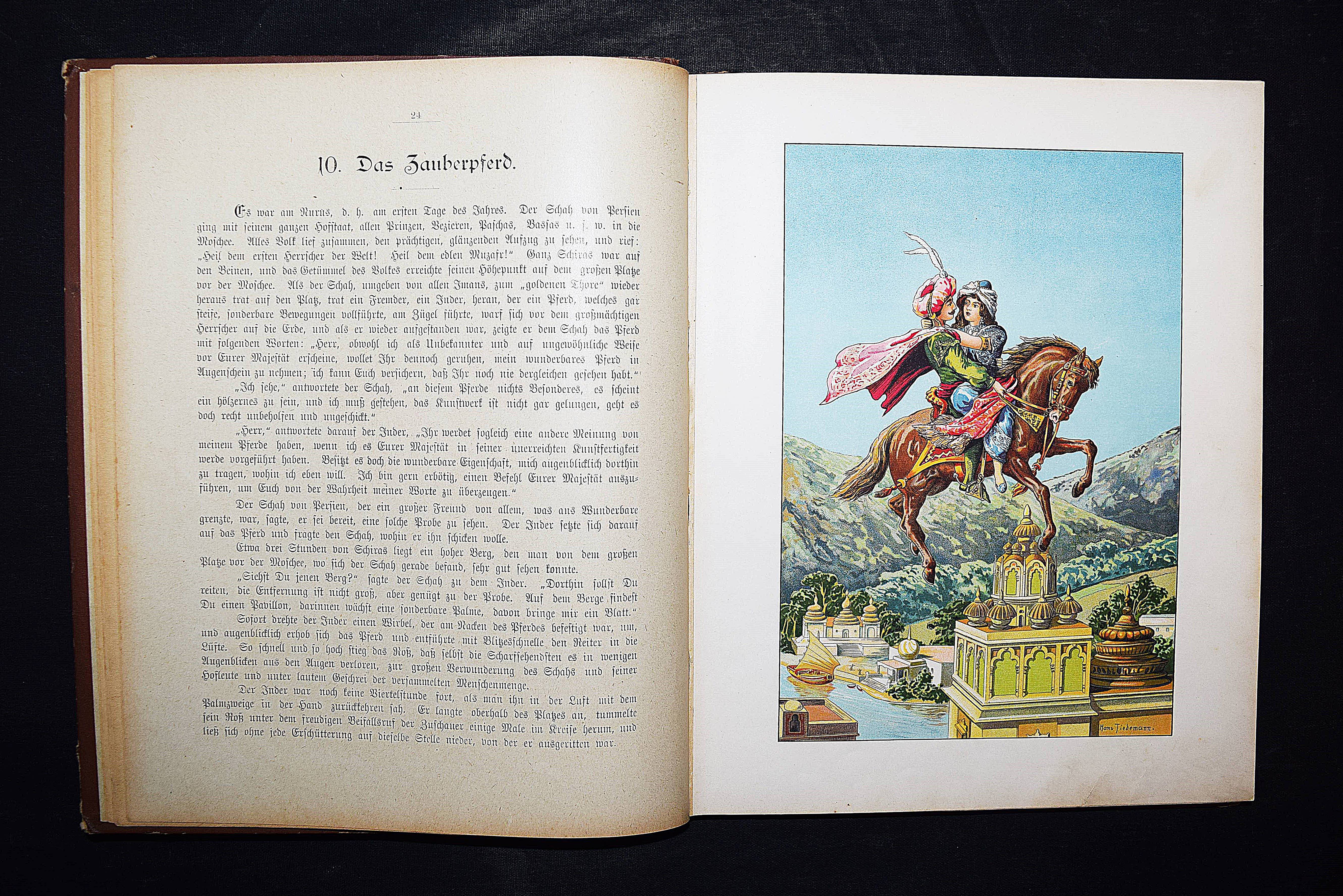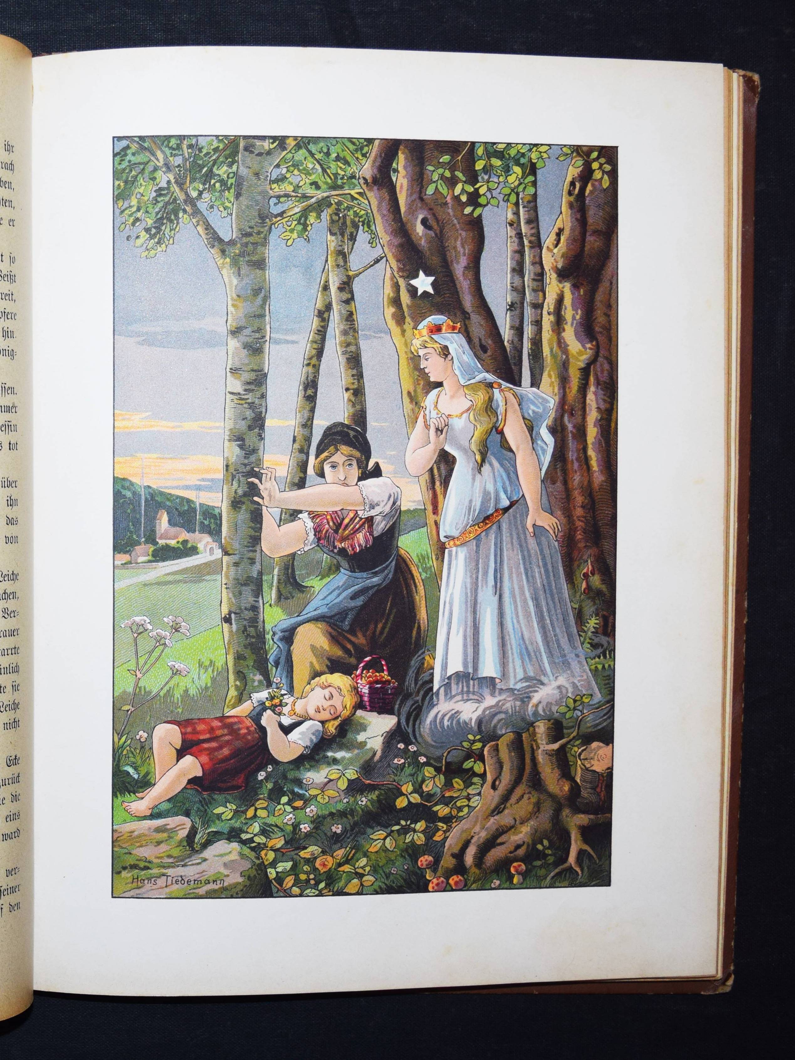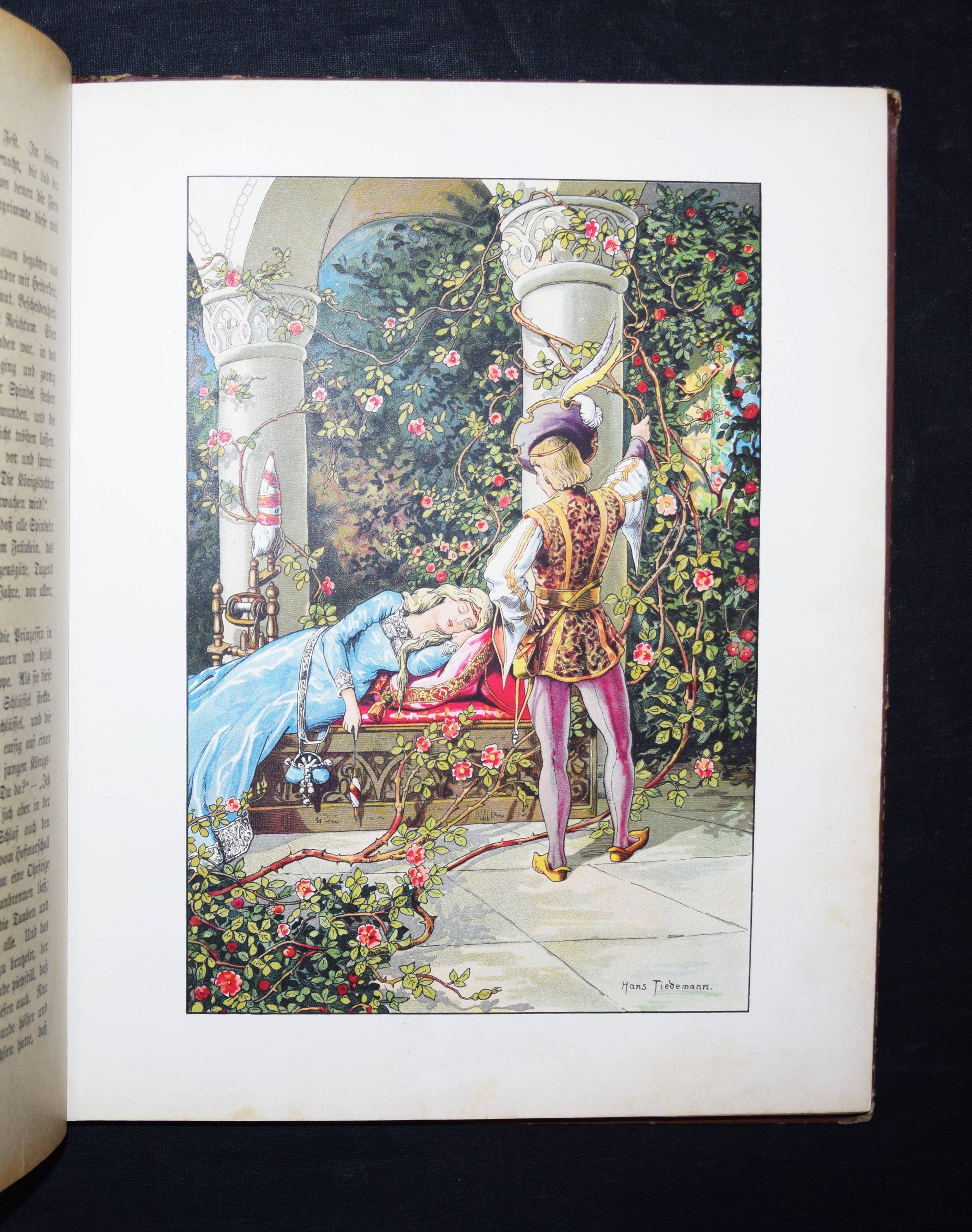 Märchenborn. Eine neue Sammlung der beliebtesten Märchen unserer Jugend. 2. Aufl. Elberfeld, Lucas o. J. (ca. 1905). 4°. 275 S. mit 8 chromolithogr. Tafeln u. 12 Illustrationen im Text von Hans Tiedemann. Farbig illustr. OHln. Klotz 9000/1202 (nur 1. Aufl. von 1901). Nicht bei Ries 928. – Umfangreiche Sammlung mit 100 Märchen und zeittypischen Illustrationen. – Papierbedingt etwas gebräunt, gutes Exemplar.