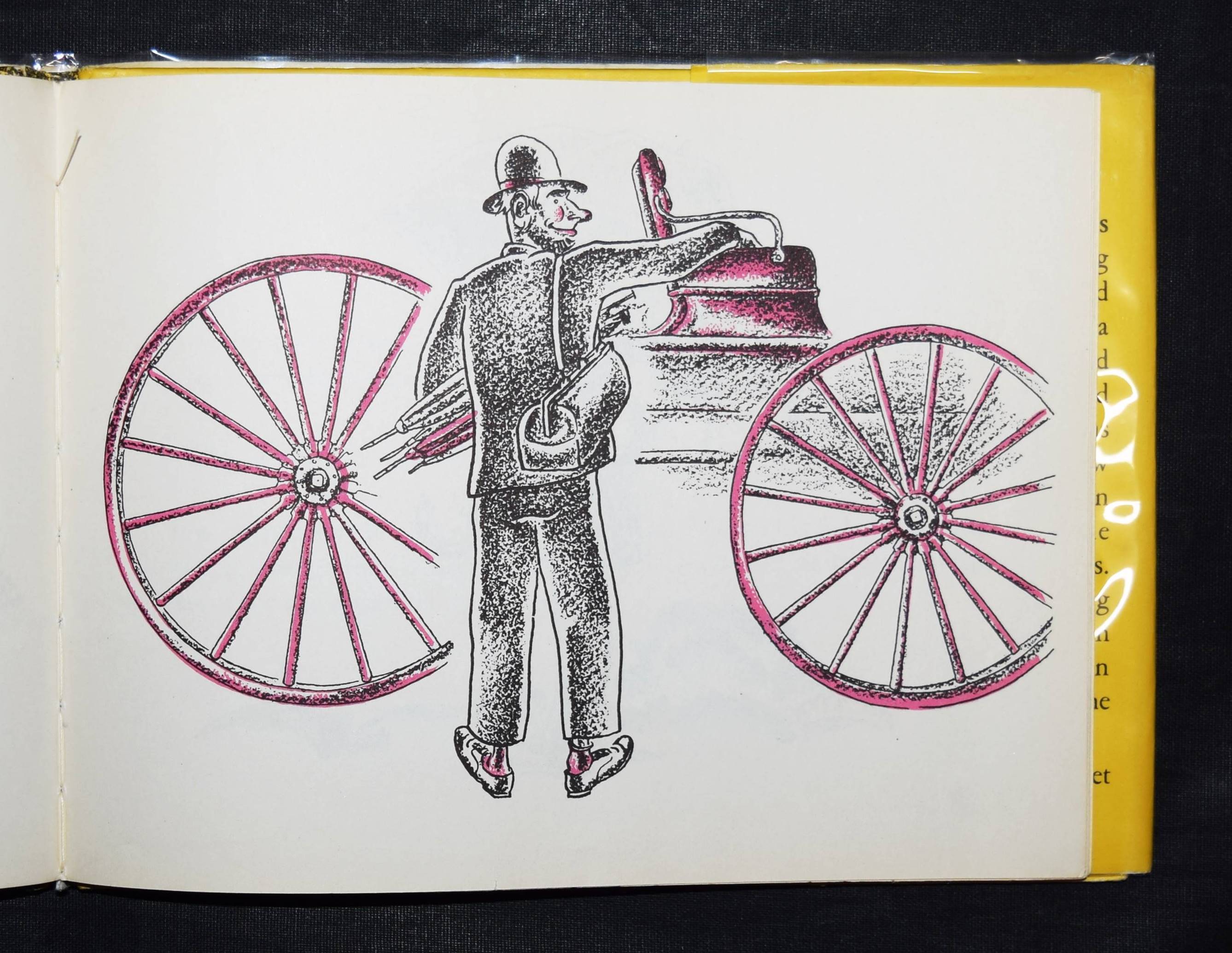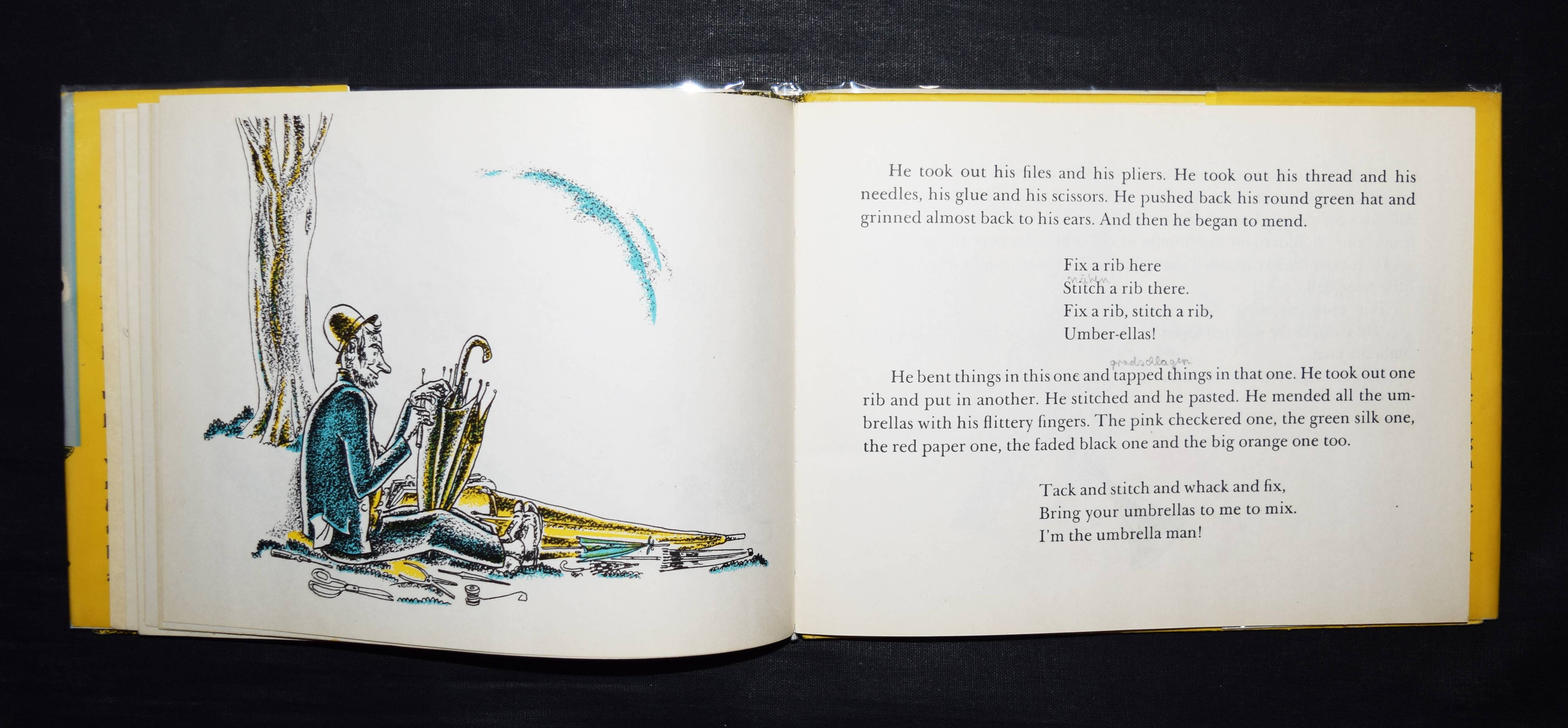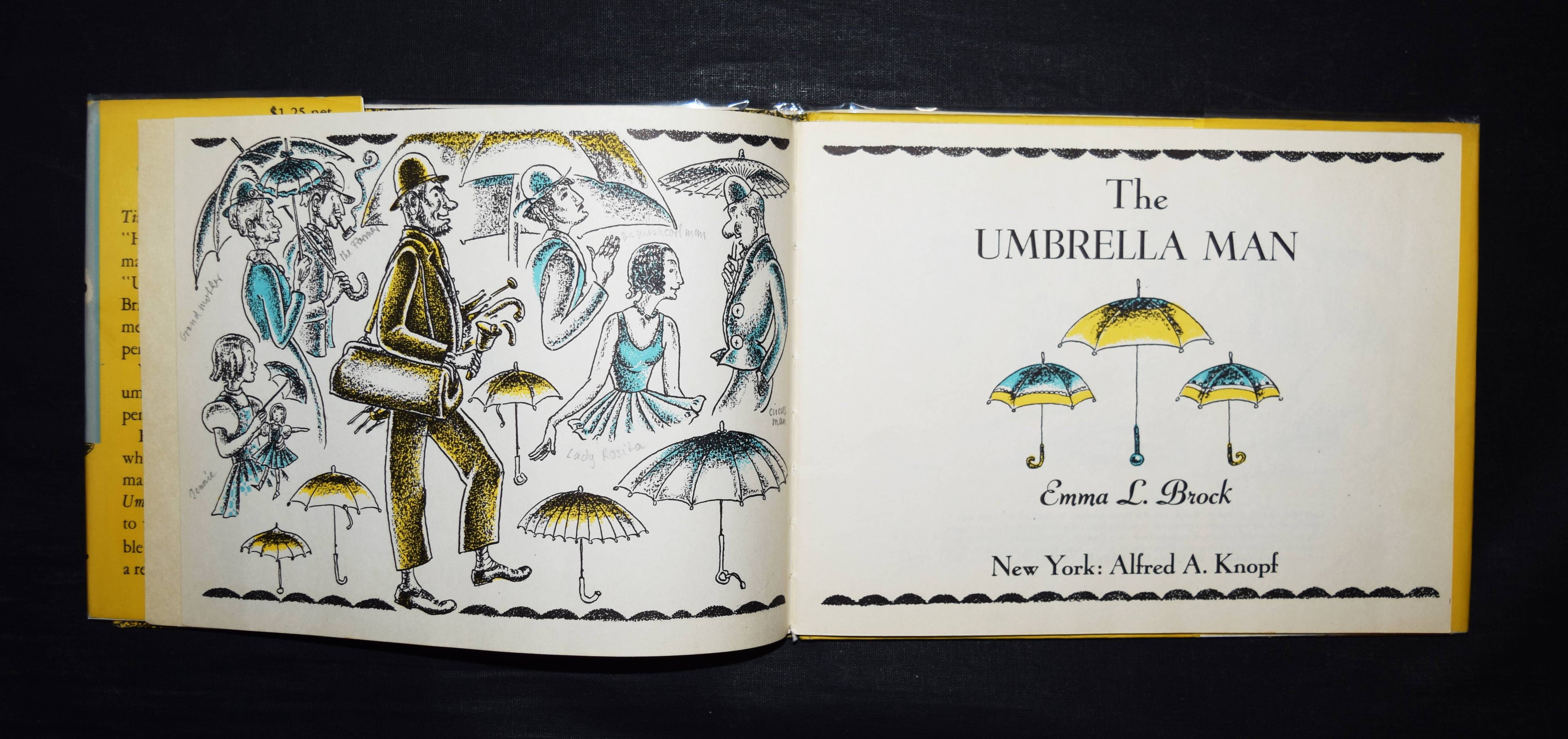 | Brock, Emma L(ilian). The umbrella man. New York, Alfred A. Knopf (1945). Quer-8°. [24] Bl. mit farb. Illustrationen. Farbig illustr. OPbd. mit farbig illustr. OU. Erste Ausgabe. – „The umbrella man mixes up the umbrellas he has to repair and returns them to the wrong owners with humorous results“ (N. E. Beust, 500 books for children, Washington 1946). – „Emma Brock is at her best when telling simple stories that make little children laugh…“ (Verlagswerbung). – E. L. Brock (1886-1974) arbeitete nach ihrem Studium an der Minneapolis School of Art zunächst als Bibliothekarin. Seit 1929 hat sie über 30 Kinderbücher veröffentlicht. – Sehr gutes Exemplar aus der Sammlung Martin Kaiser, Basel.