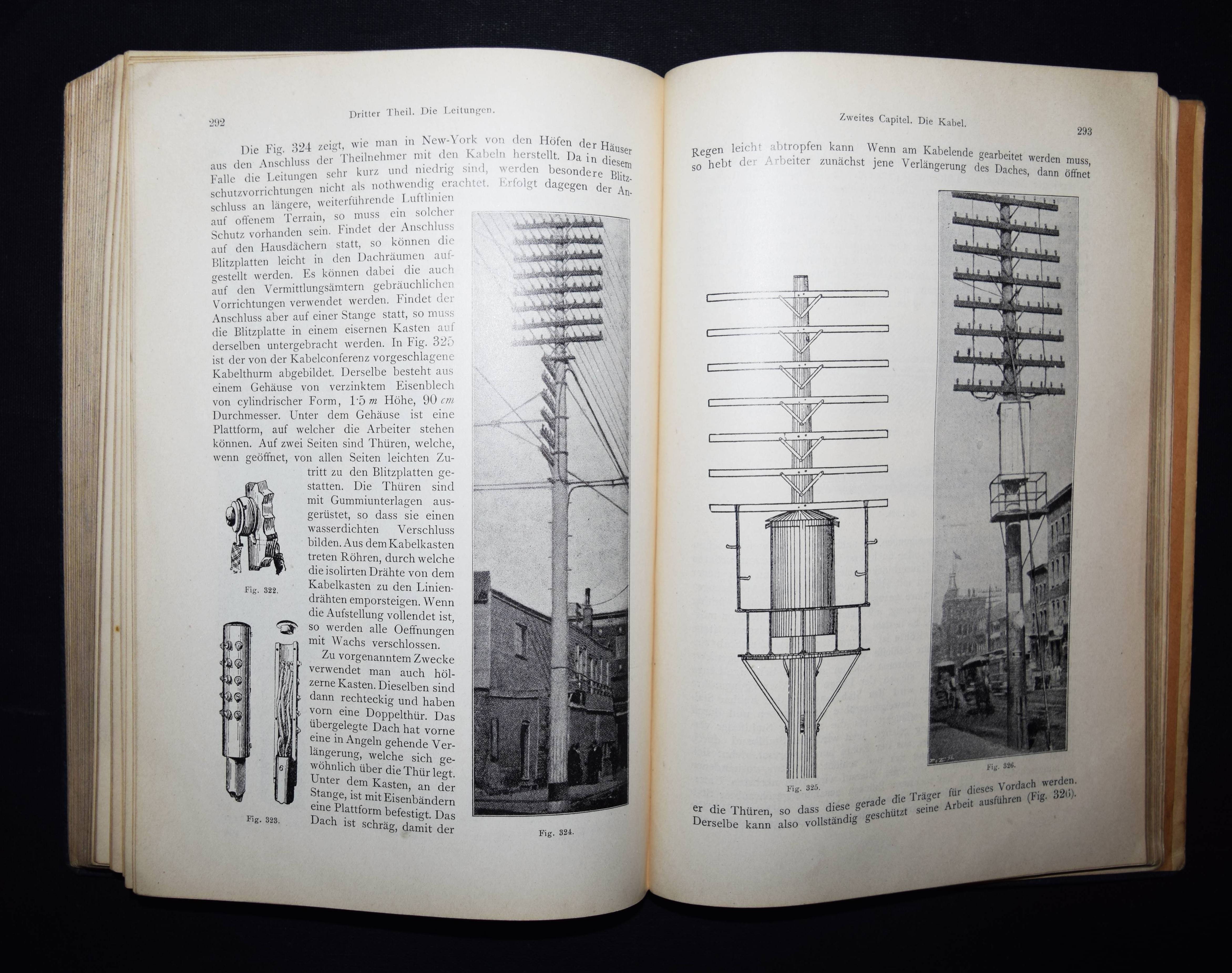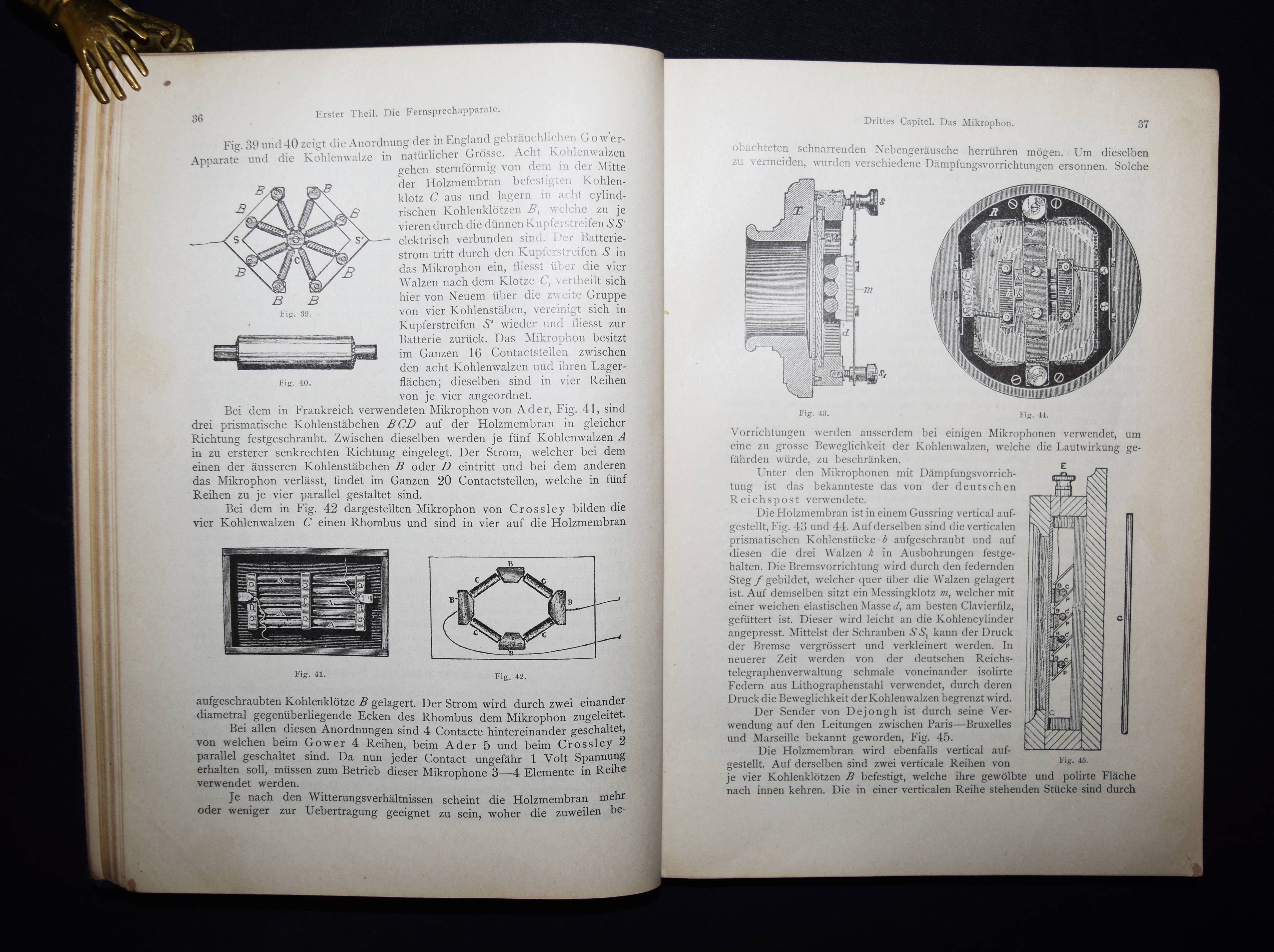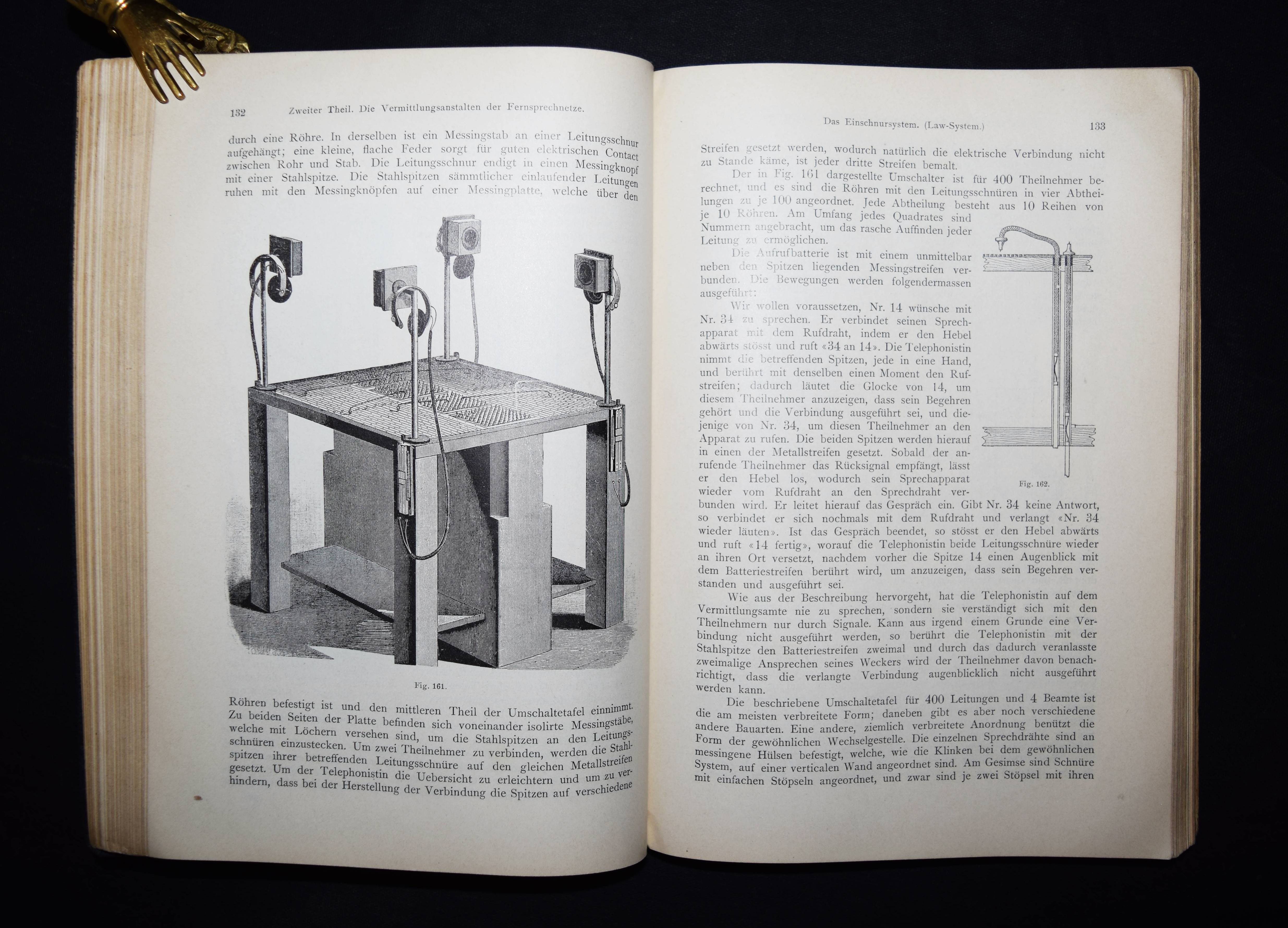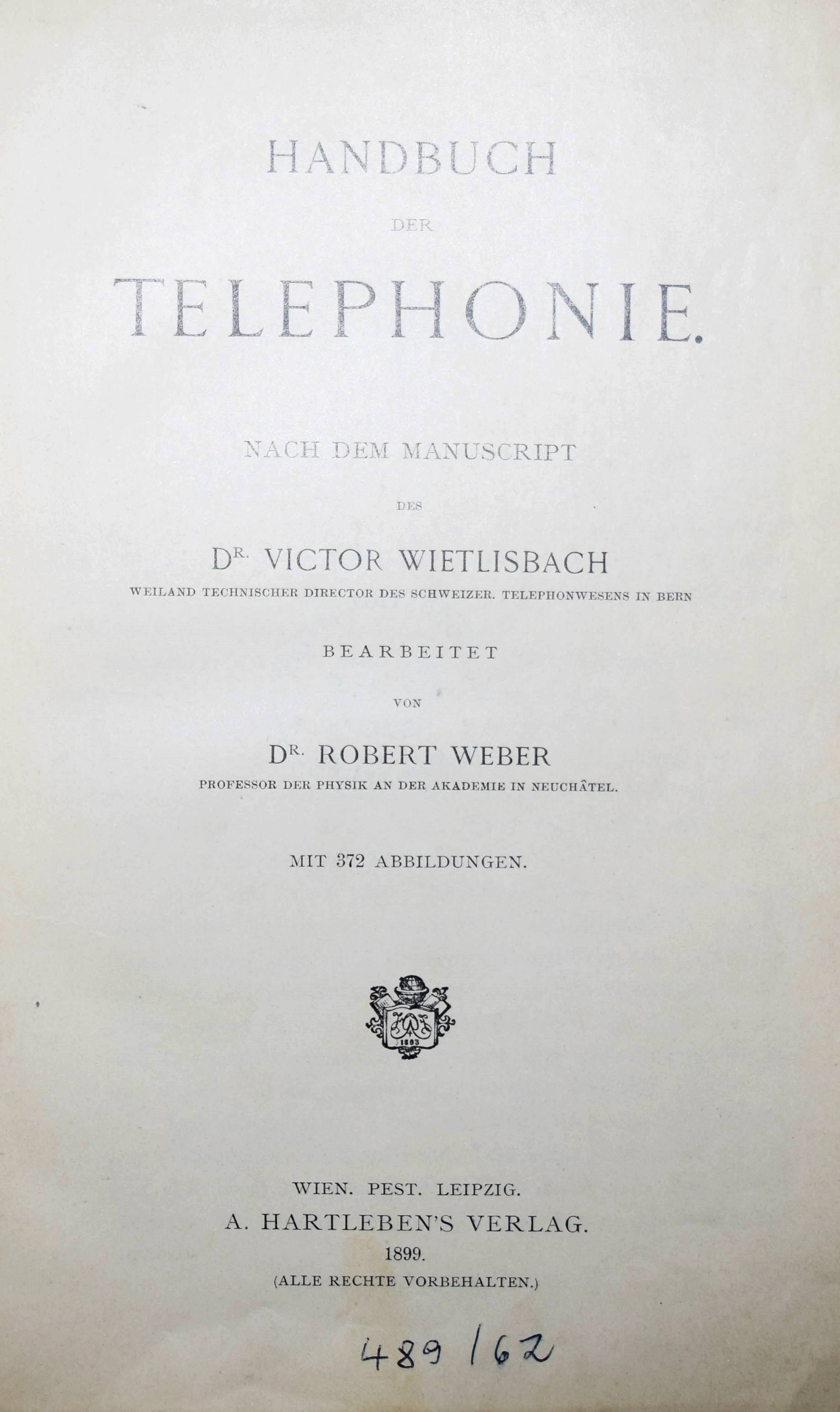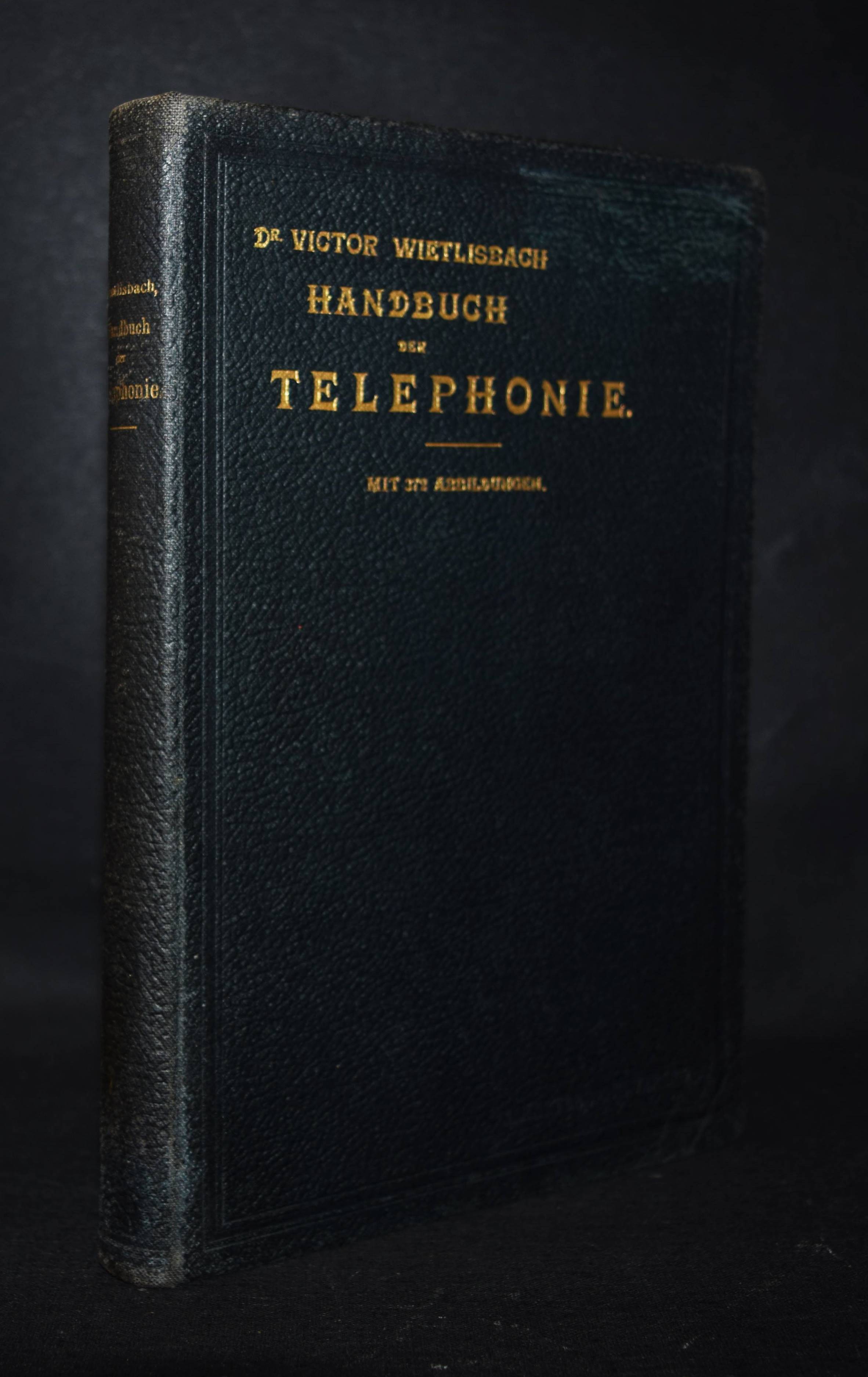 Wietlisbach, Victor. Handbuch der Telephonie. Nach dem Manuskripte des Victor Wietlisbach. Bearbeitet von Robert Weber. Wien, Pest, Leipzig, Hartleben 1899. 8°. XIV, 368 S. mit 372 Abb. im Text u. auf 1 gefalt. Tafel. OLn. mit goldgepr. Rücken- u. Deckeltitel. Erste Ausgabe. – Einband etwas berieben, St.a.V. und T. (verso), gutes Exemplar.
