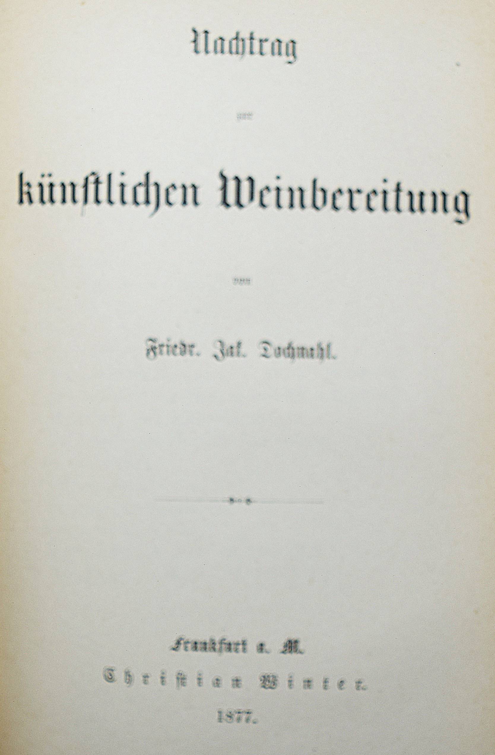 Dochnahl, Friedr(ich) Jak(ob). Die künstliche Weinbereitung und die naturgemässe Verbesserung des Obst- und Traubenweines nach den neuesten, einfachsten und zuverläßigsten Methoden. Mit Tabellen. Faßlich dargestellt für Jedermann. 3., mit einem Nachtrag vermehrte Aufl. Frankfurt a. M., Winter 1877-1878. 8°. XVI, 150 S., [3] Bl., 38 S. Hln. d. Zt. mit goldgepr. Rückentitel u. Linienverg. Schoene³ 11119. – Um den Nachtrag erweiterte Fassung des wichtigen Handbuchs. – Rücken etwas berieben und aufgehellt, gutes sauberes Exemplar.