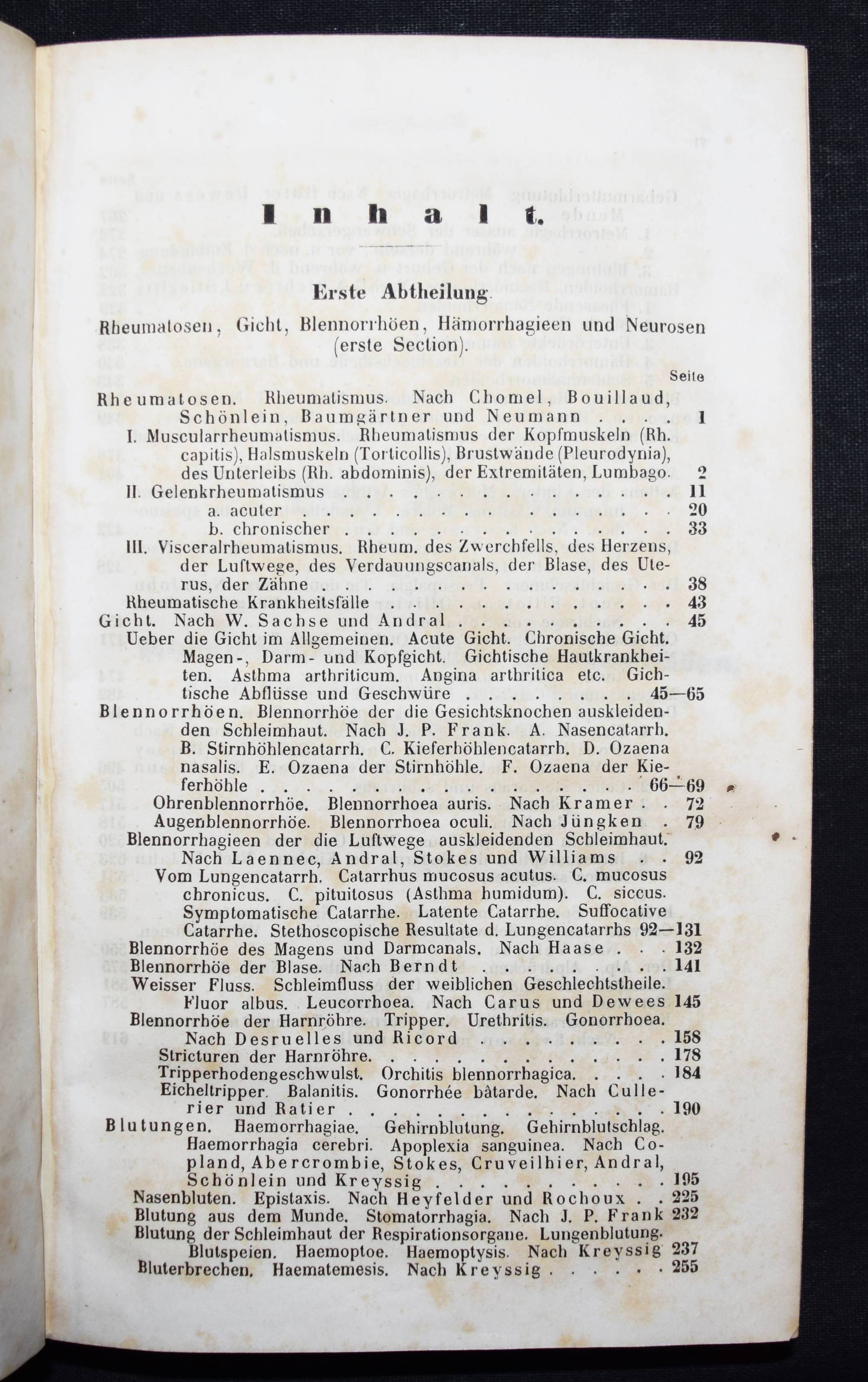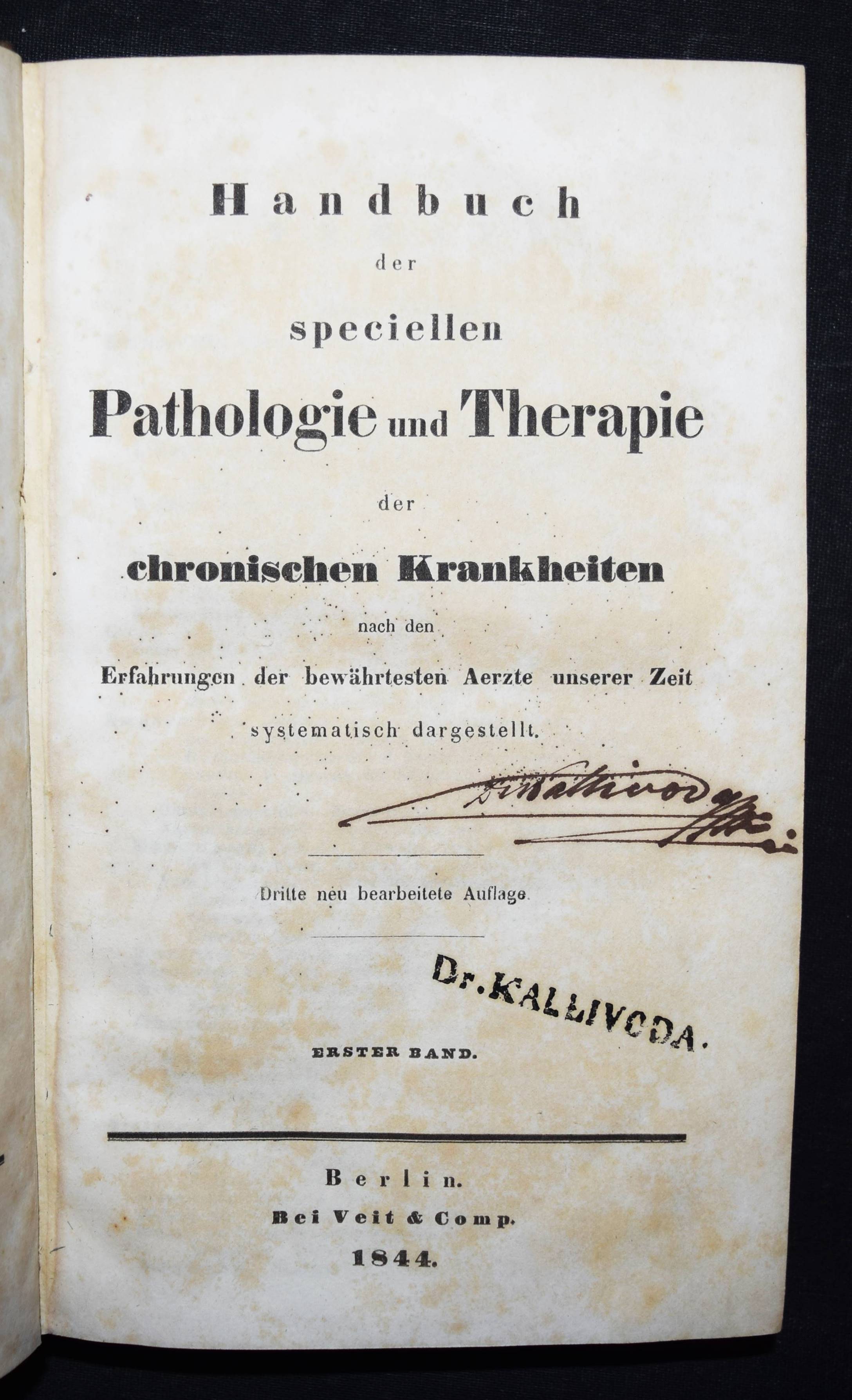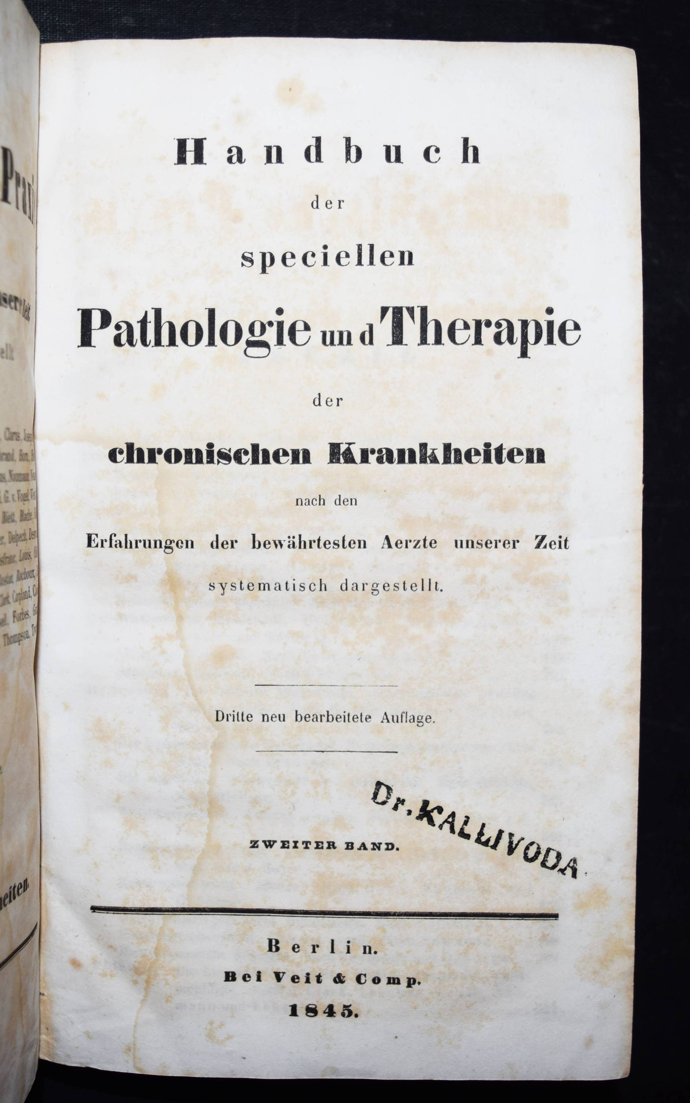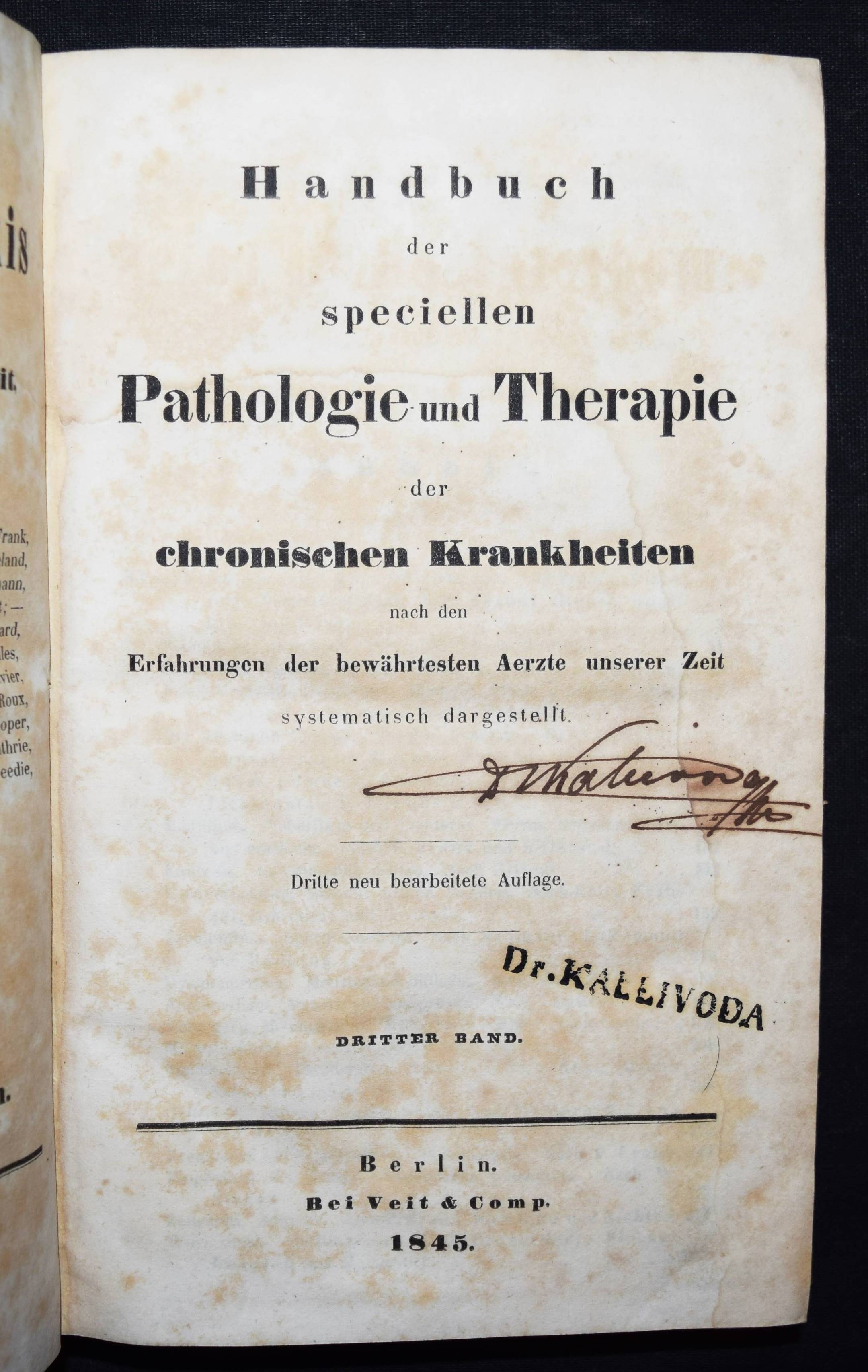 Handbuch der speciellen Pathologie und Therapie der chronischen Krankheiten nach den Erfahrungen der bewährtesten Aerzte unserer Zeit systematisch dargestellt. 3. neu bearb. Aufl. 3 Bände. Berlin, Veit & Comp. 1844-1845. 8°. VI, 617 S.; VI, 613 S.; [2] Bl., 642 S. OLn. mit goldgepr. Rückentiteln u. Romantikerverg. (Die medicinische Praxis der bewährtesten Aerzte unserer Zeit systematisch dargestellt. 3.-5. Theil. Die chronischen Krankheiten). Mit Beiträgen von Abercrombie, Bartels, Brodie, Carus, Hufeland, Lallemand, Thompson, Wallace u.v.a. – N.u.St.a.T., durchgehend braunfleckig u. gebräunt, gutes dekorativ gebundenes Exemplar.