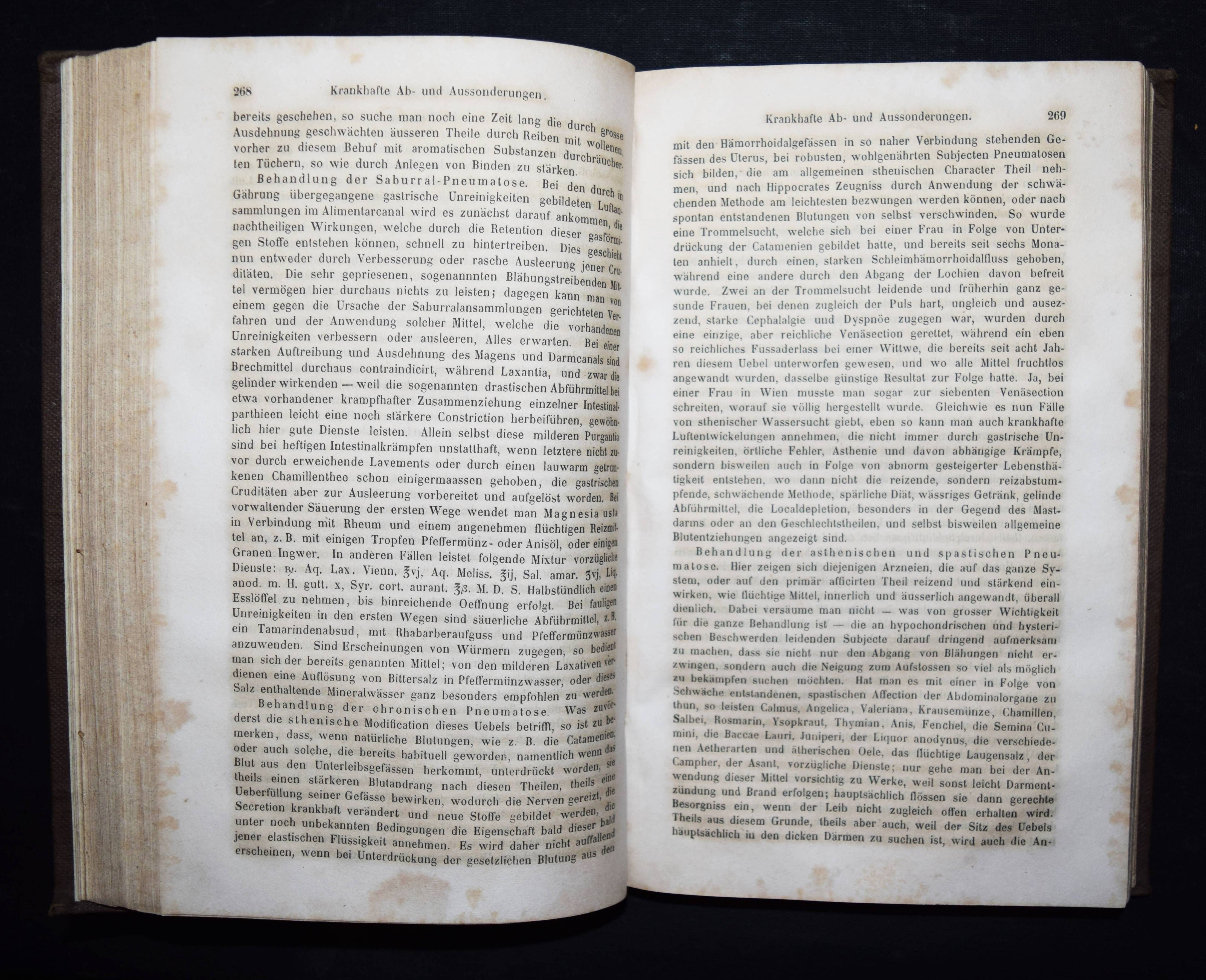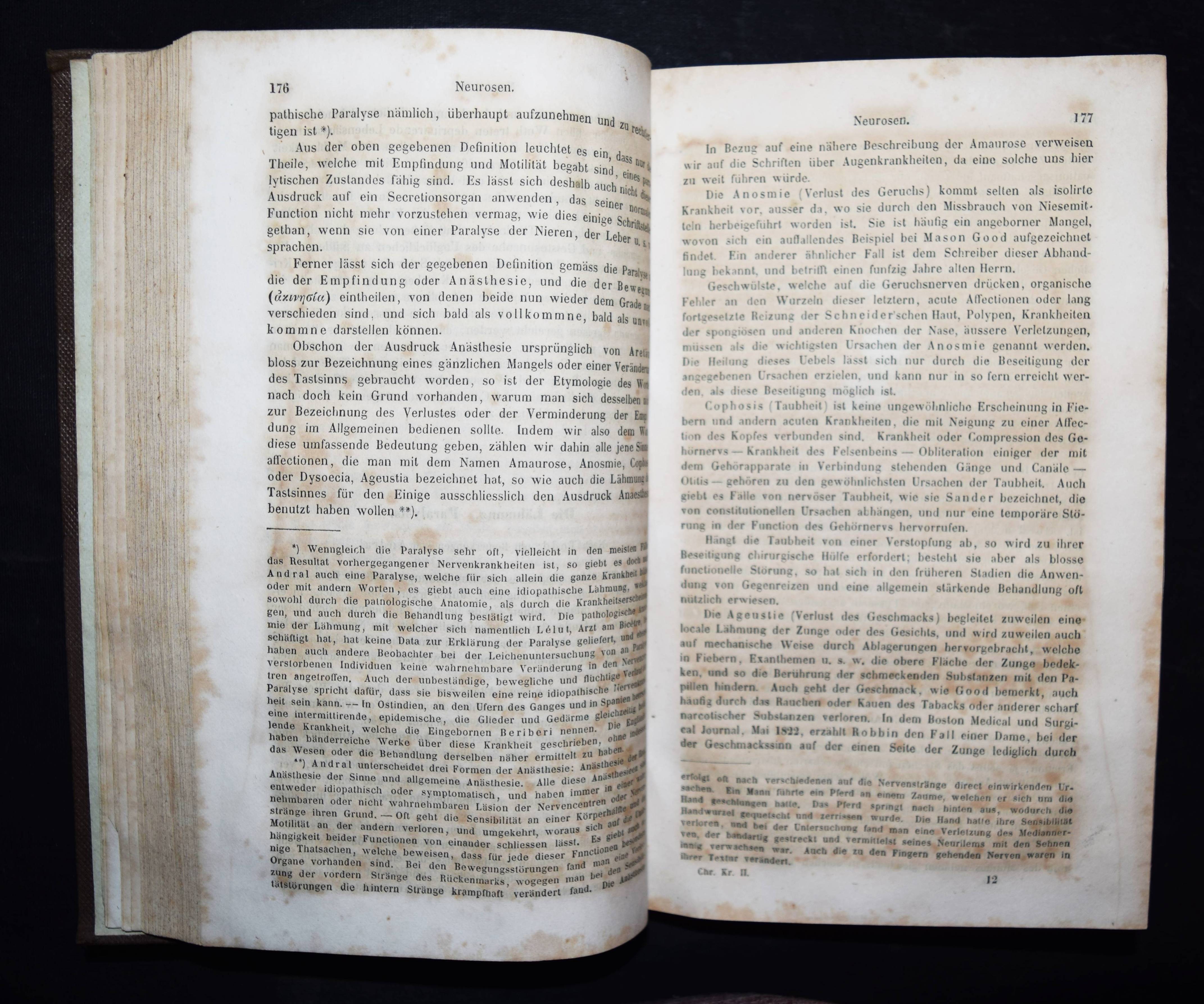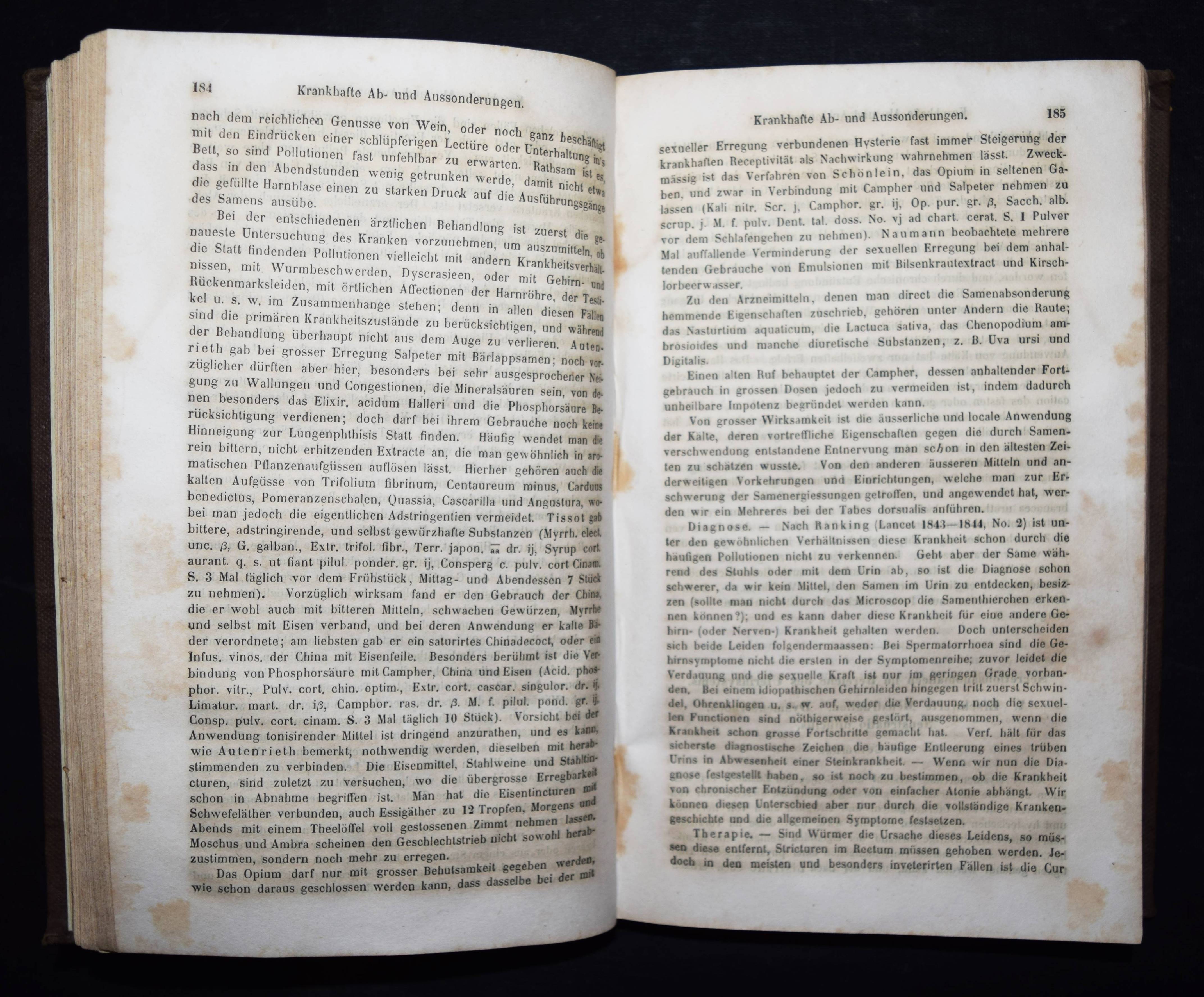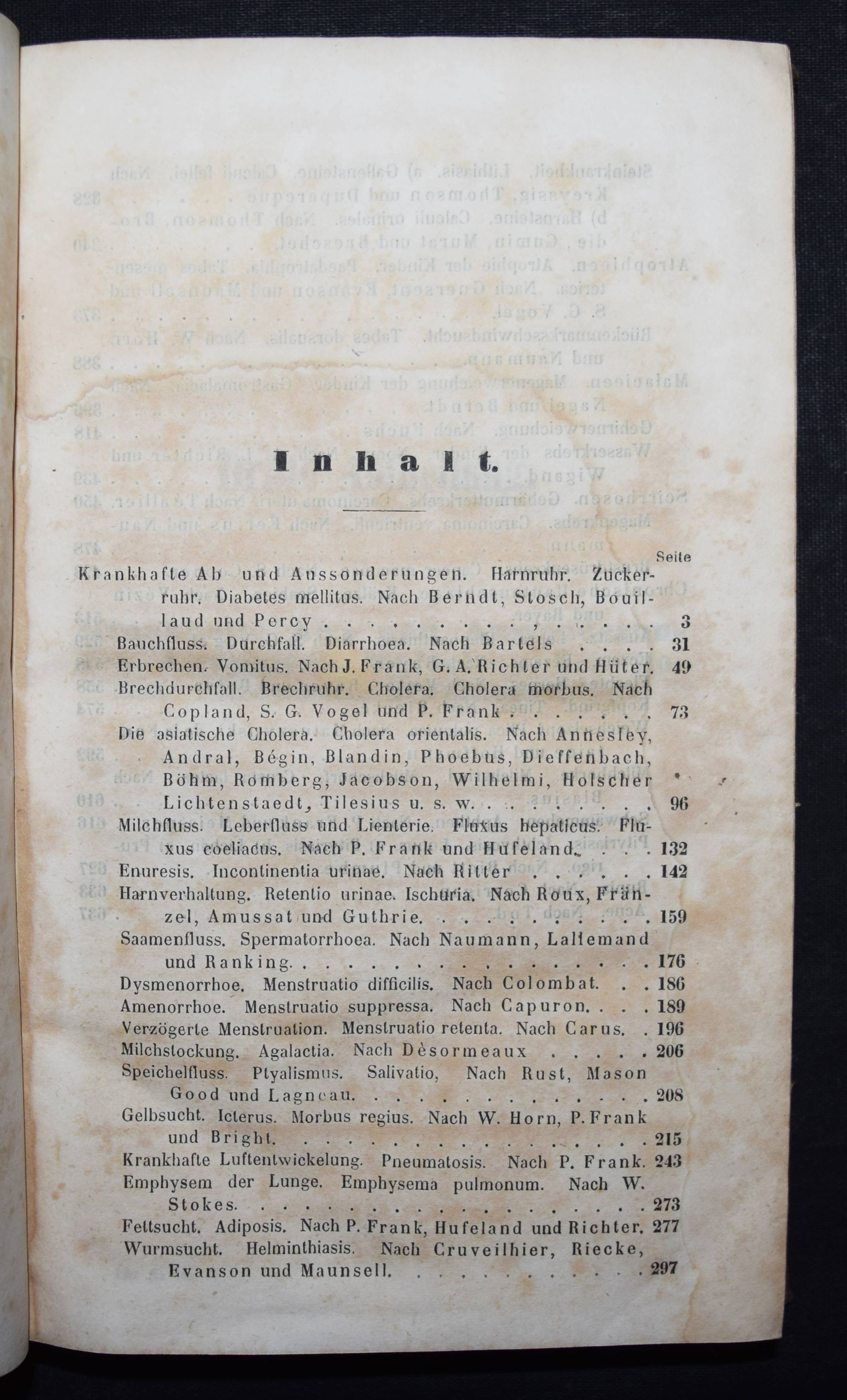 Handbuch der speciellen Pathologie und Therapie der chronischen Krankheiten nach den Erfahrungen der bewährtesten Aerzte unserer Zeit systematisch dargestellt. 3. neu bearb. Aufl. 3 Bände. Berlin, Veit & Comp. 1844-1845. 8°. VI, 617 S.; VI, 613 S.; [2] Bl., 642 S. OLn. mit goldgepr. Rückentiteln u. Romantikerverg. (Die medicinische Praxis der bewährtesten Aerzte unserer Zeit systematisch dargestellt. 3.-5. Theil. Die chronischen Krankheiten). Mit Beiträgen von Abercrombie, Bartels, Brodie, Carus, Hufeland, Lallemand, Thompson, Wallace u.v.a. – N.u.St.a.T., durchgehend braunfleckig u. gebräunt, gutes dekorativ gebundenes Exemplar.