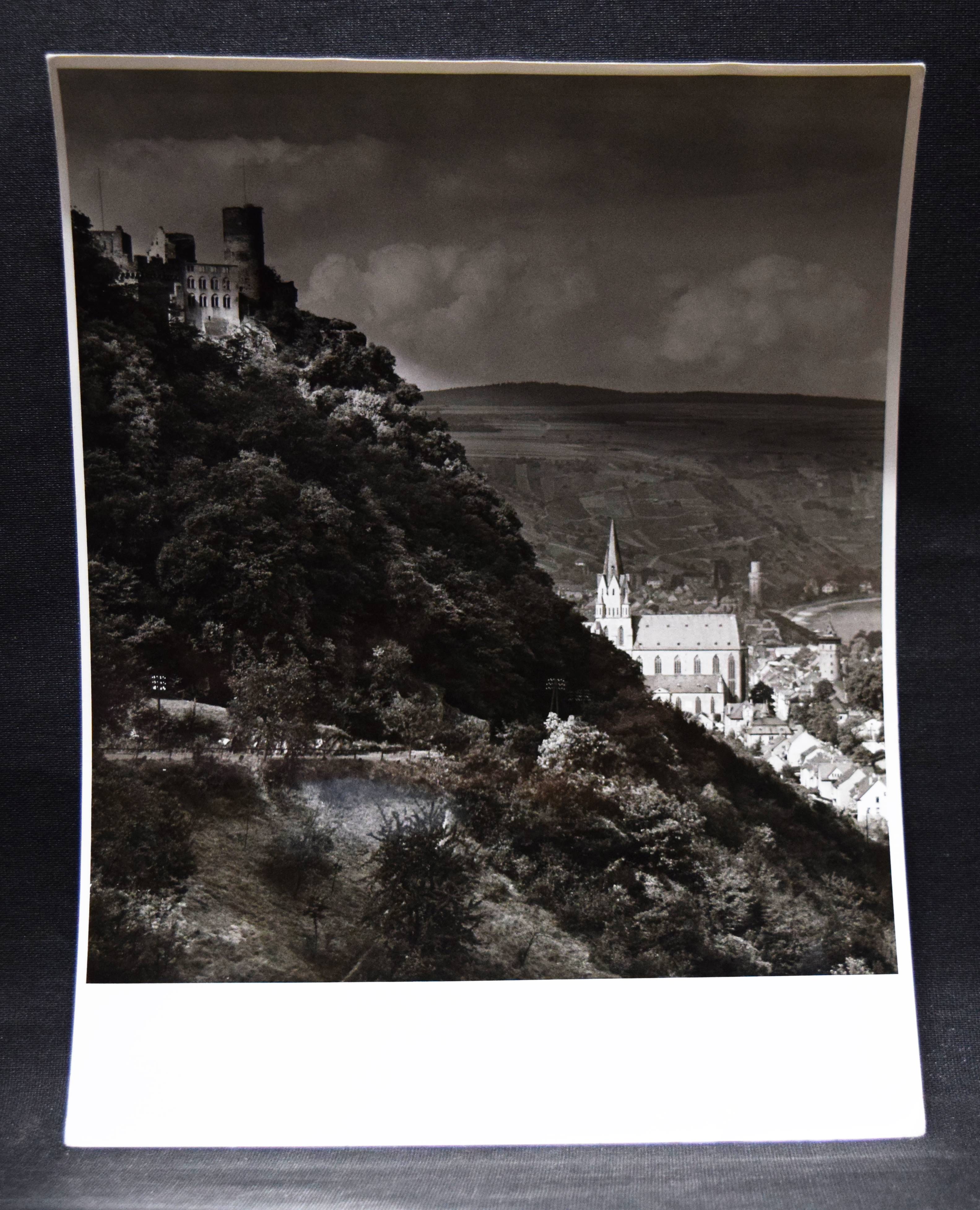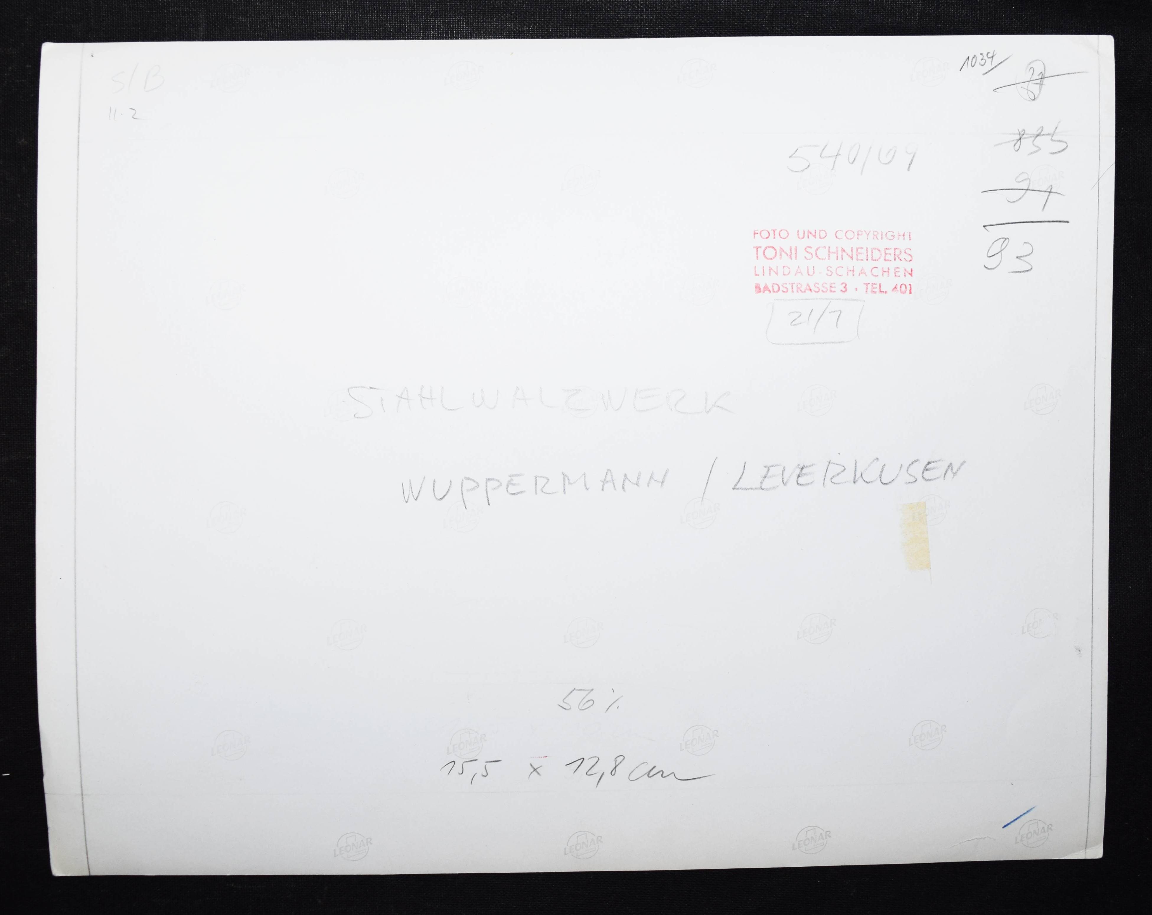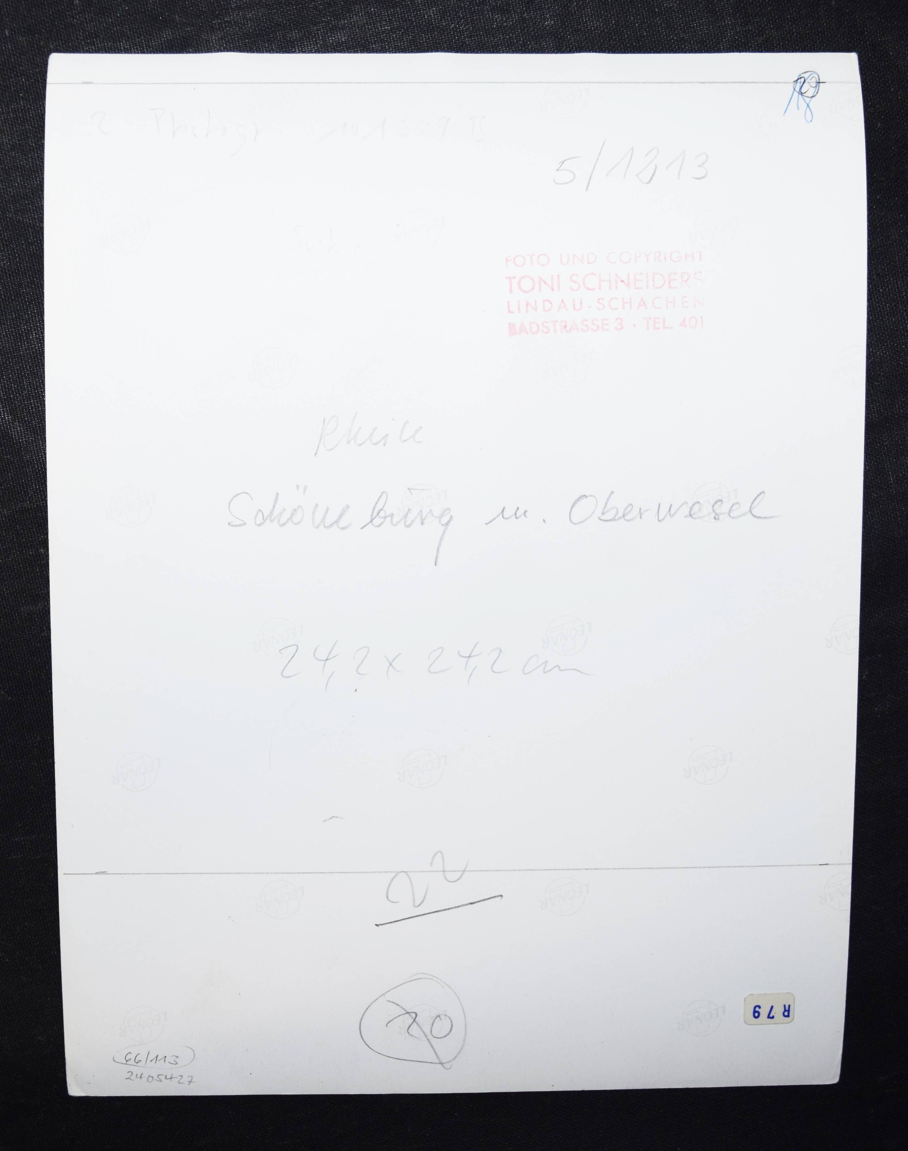 Schneiders, Toni (1920-2006). 2 Orig.-Photographien (Silbergelatineabzüge auf Leonar). Werkstatt-Szene im Stahlwalzwerk Wuppermann, Leverkusen u. Schönburg und Oberwesel am Rhein. Lindau 1960er Jahre. 23,5 x 30 u. 20 x 17,5 cm. T. Schneiders war Gründungsmitglied der Gruppe „fotoform“. – „Toni Schneiders ist ein Romantiker, dessen Einfühlungsvermögen sich auf wunderbare Weise mit einem versachlichten Blick vereint. Viele seiner besten Bilder hat Toni Schneiders nicht wirklich suchen müssen, wie er gerne betont, vielmehr sind die Bilder zu ihm gekommen und sind auf seine wache Wahrnehmung gestoßen. Aufgrund seiner handwerklichen Solidität und klassischen Bildauffassung ist ihm alles allzu Modische im Umgang mit der Fotografie fremd geblieben“ (U. Pohlmann in Koetzle). – Verso mit Adressstempel des Fotografen, handschr. betitelt und mit Vermerken zur Reproduktion, eine Ecke des Industriefotos mit kl. Knickspur.
