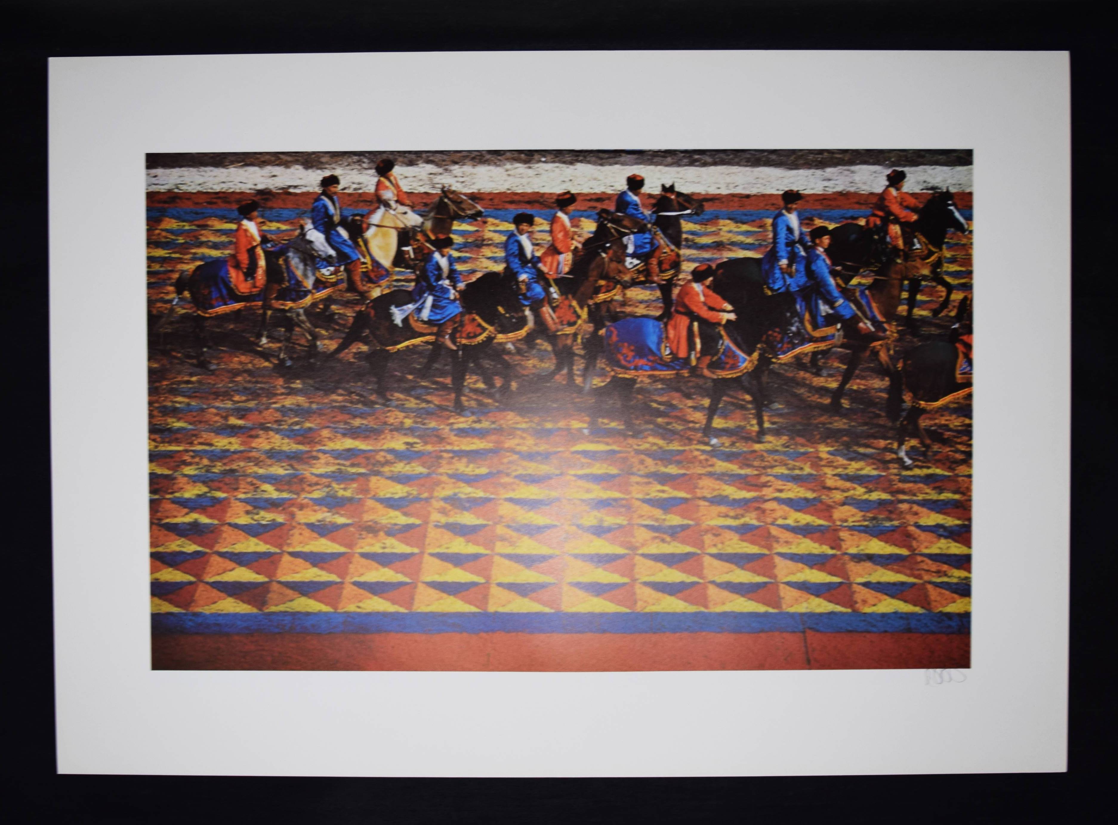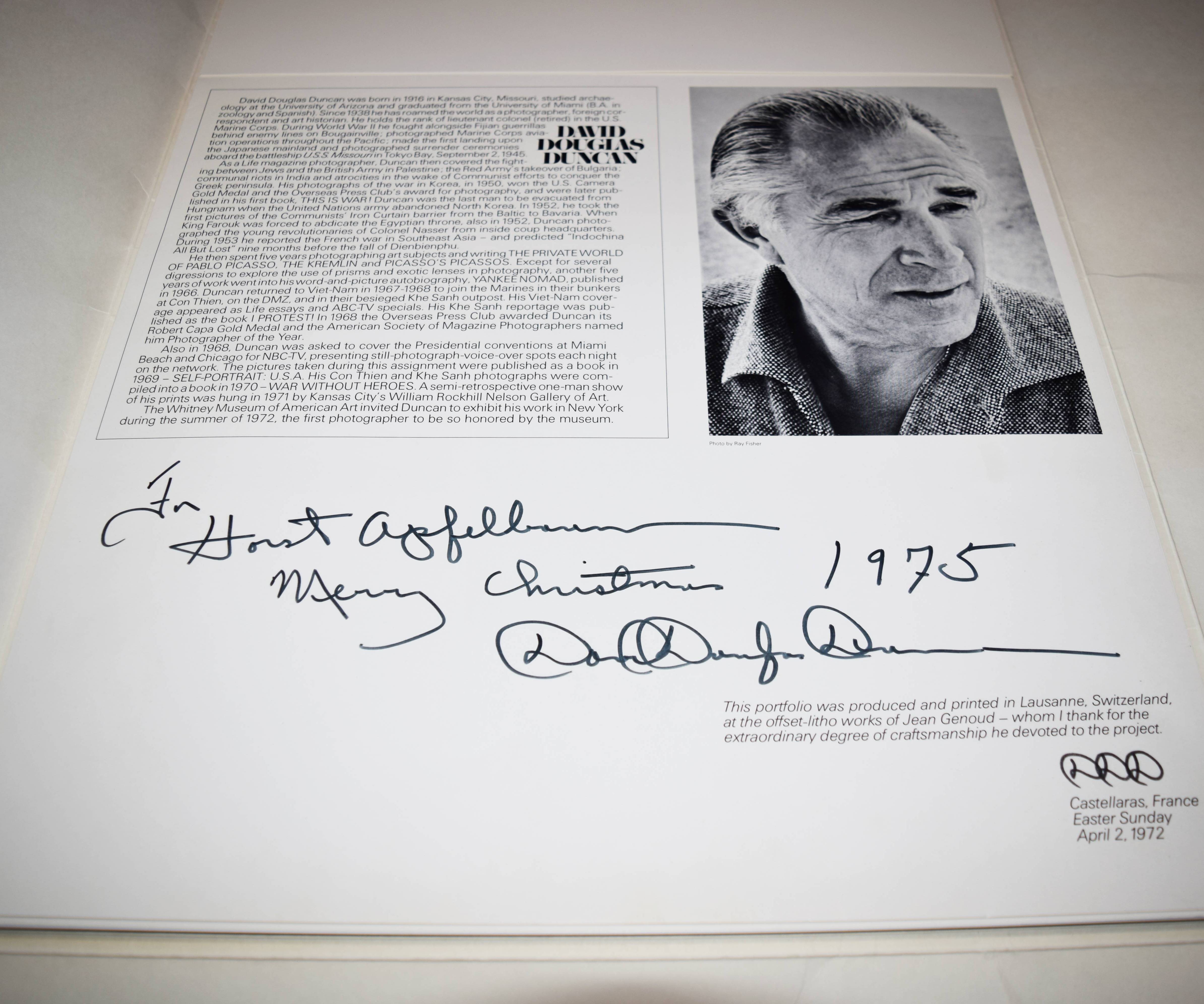Duncan, David Douglas. Portfolio. Lausanne, Jean Genoud o. J. (1972). Imperial-Folio (62 x 44 cm.). [2] Bl. u. 12 monogr. Farbtafeln. Farbig illustr. Orig.-Flügelmappe. Mit eigenhändiger Widmung von D. D. Duncan „To Horst Apfelbaum, Merry Christmas 1975, David Douglas Duncan“. – Alle Tafeln von Duncan mit Bleistift monogrammiert. – Der amerik. Fotojournalist D. D. Duncan (1916-2018) wurde international bekannt durch seine Kriegsreportagen (Korea und Vietnam) sowie seine berühmten Aufnahmen seines Freundes Pablo Picasso. – „Der aus dem Kernland Amerikas stammende David Douglas Duncan ist der fröhliche Nomade des Fotojournalismus. Seit nunmehr 30 Jahren geht er mit unnachgiebigem Wohlwollen weltweit auf Bilderjagd, über Nord- und Südamerika nach Asien und Europa und wieder zurück. […] Als krasser Individualist alter Schule ist er zugleich eine Ein-Mann-Firma; seine schönen teuren Bücher – „The Private World of Pablo Picasso“, „The Kremlin“, „Picasso’s Picassos“, „Yankee Nomad“ – produziert er selbst, von der ersten Idee bis zum fertigen Druck, und verkauft dann die Vermarktungsrechte. Ein solches unternehmerisches Einzelgängertum erfordert eiserne Entschlossenheit und die Fähigkeit, zu arbeiten wie ein Pferd, die beiden herausragendsten Eigenschaften dieses Vagabunden aus dem amerikanischen Mittleren Westen“ (R. E. Hood in Koetzle). – Flügelmappe leicht fleckig, sonst tadellos.