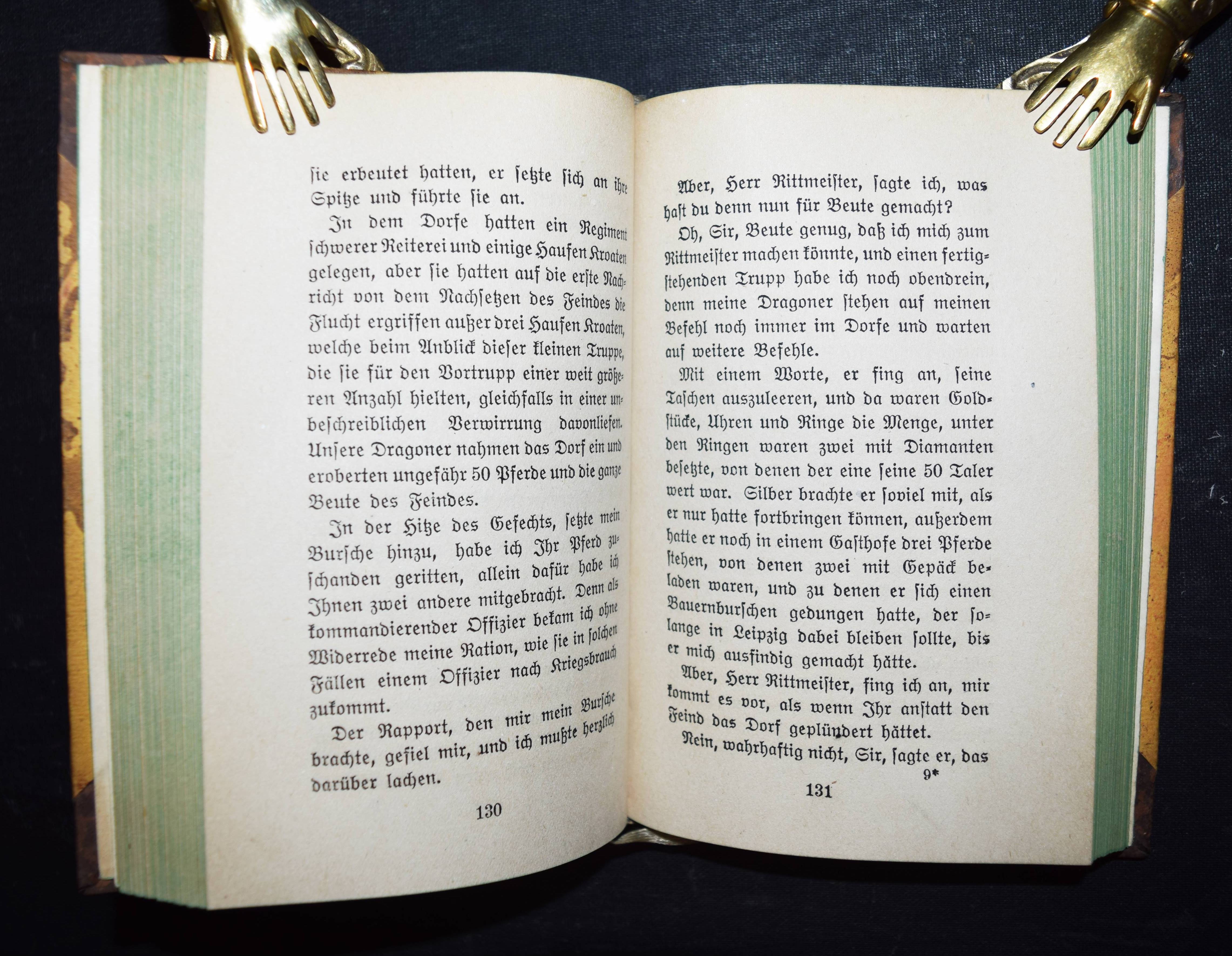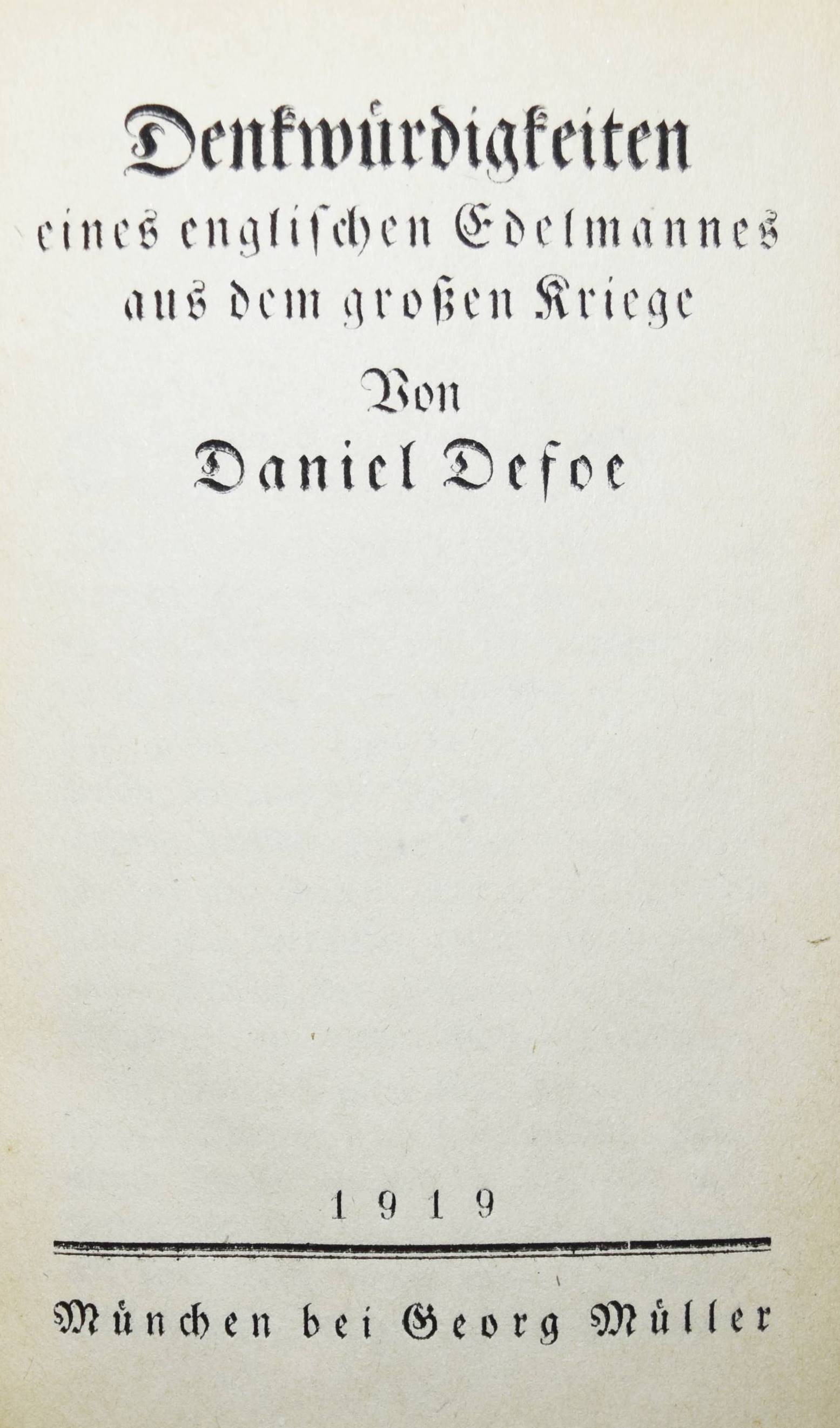 Defoe, Daniel. Denkwürdigkeiten eines englischen Edelmannes aus dem großen Kriege. 1.-3. Tsd. München, Georg Müller 1919. Kl.-8°. 275 S. OHldr. mit goldgepr. Rückensch. u. Rückenverg. (Die Romane des Daniel Defoe in deutschen Übertragungen. Hrsg. von Joseph Grabisch, Band IV). 25 Georg Müller Verlag, S. 139. – Buchausstattung von Paul Renner. – Gutes Exemplar.