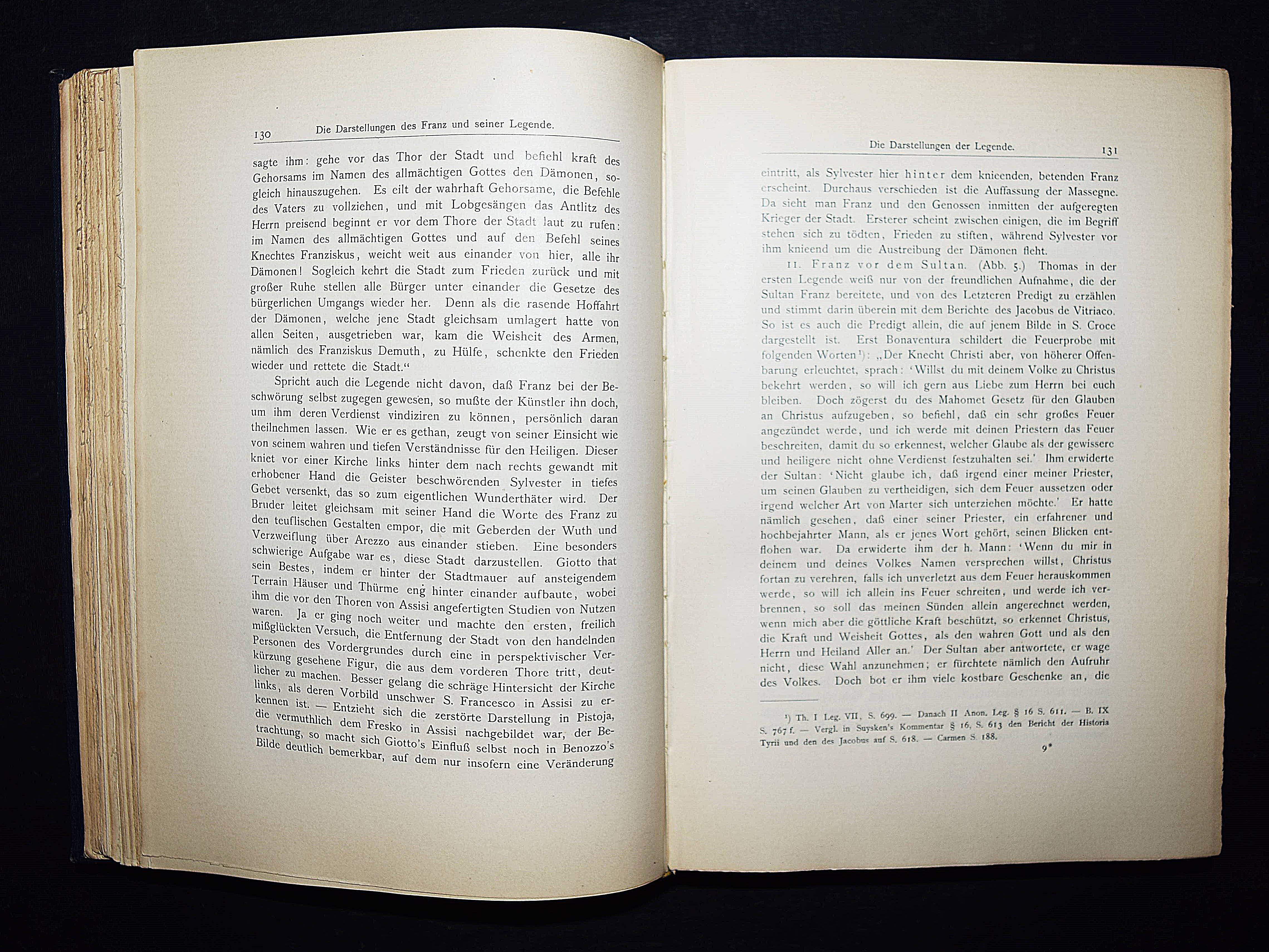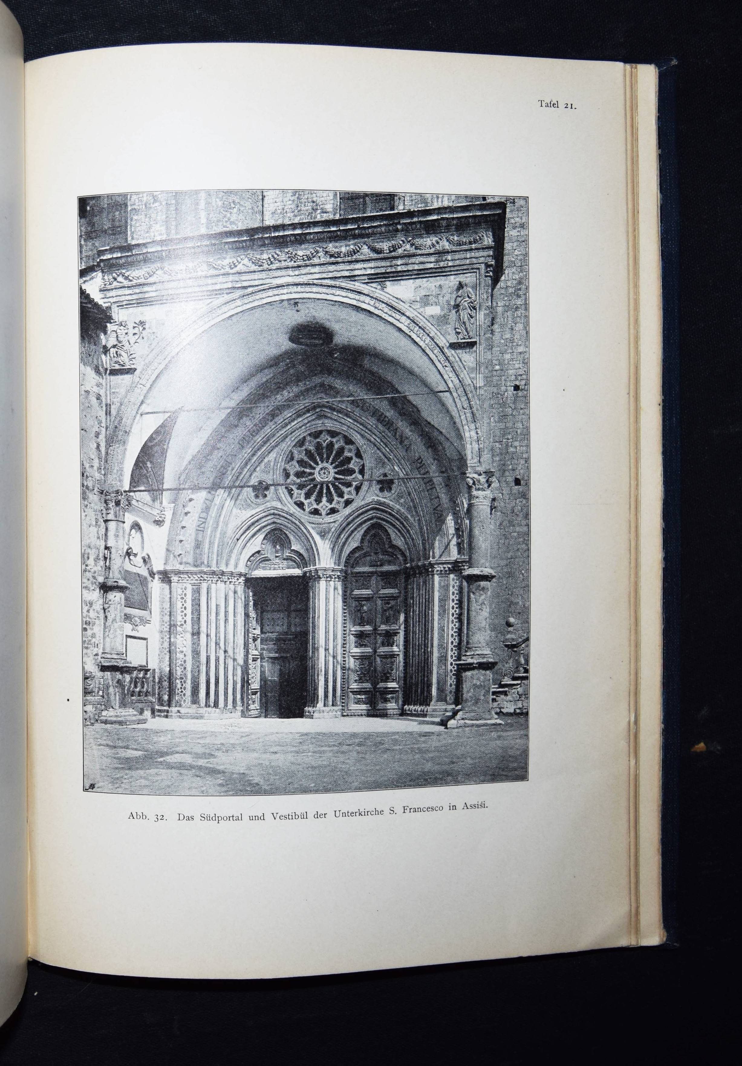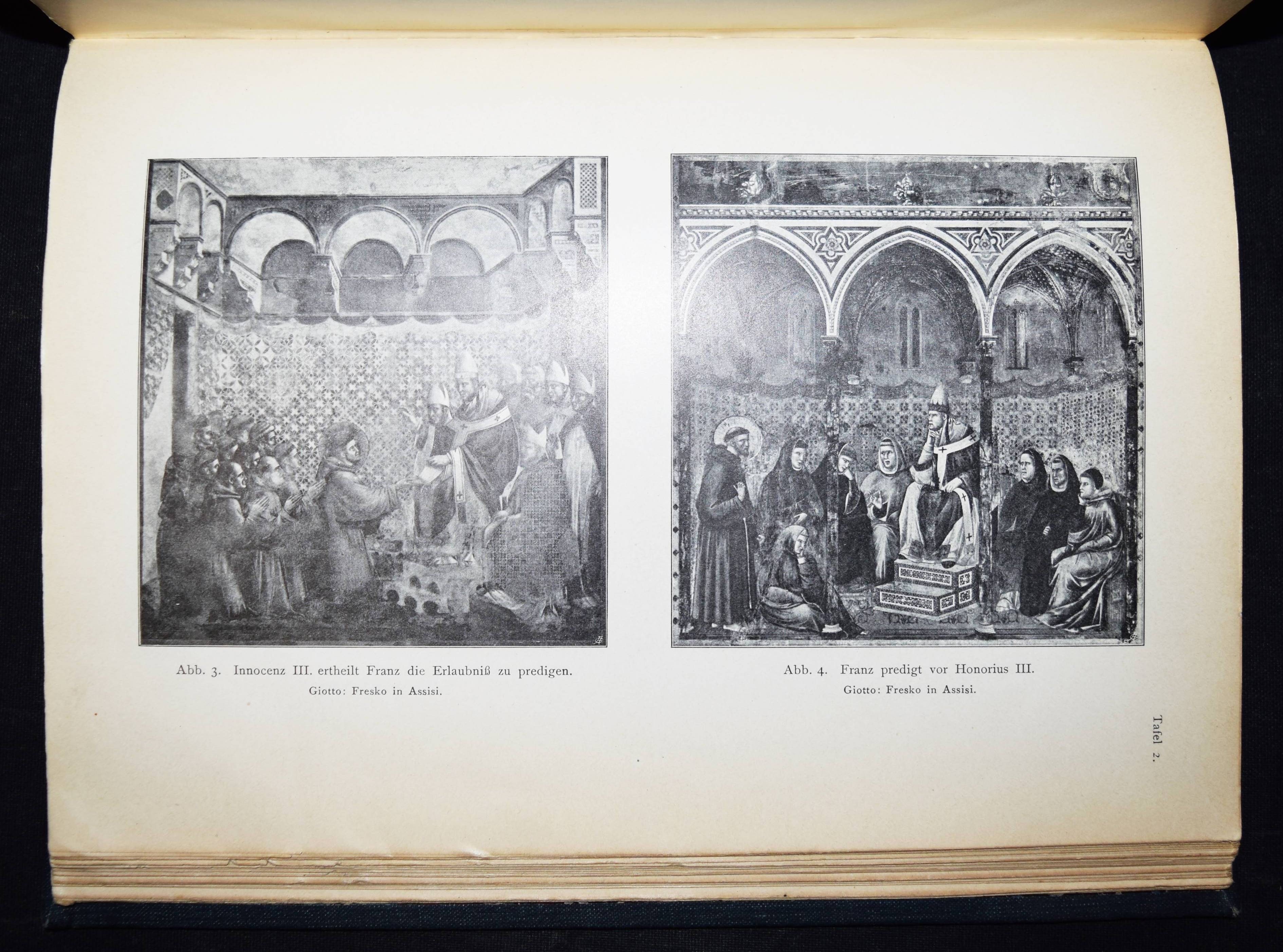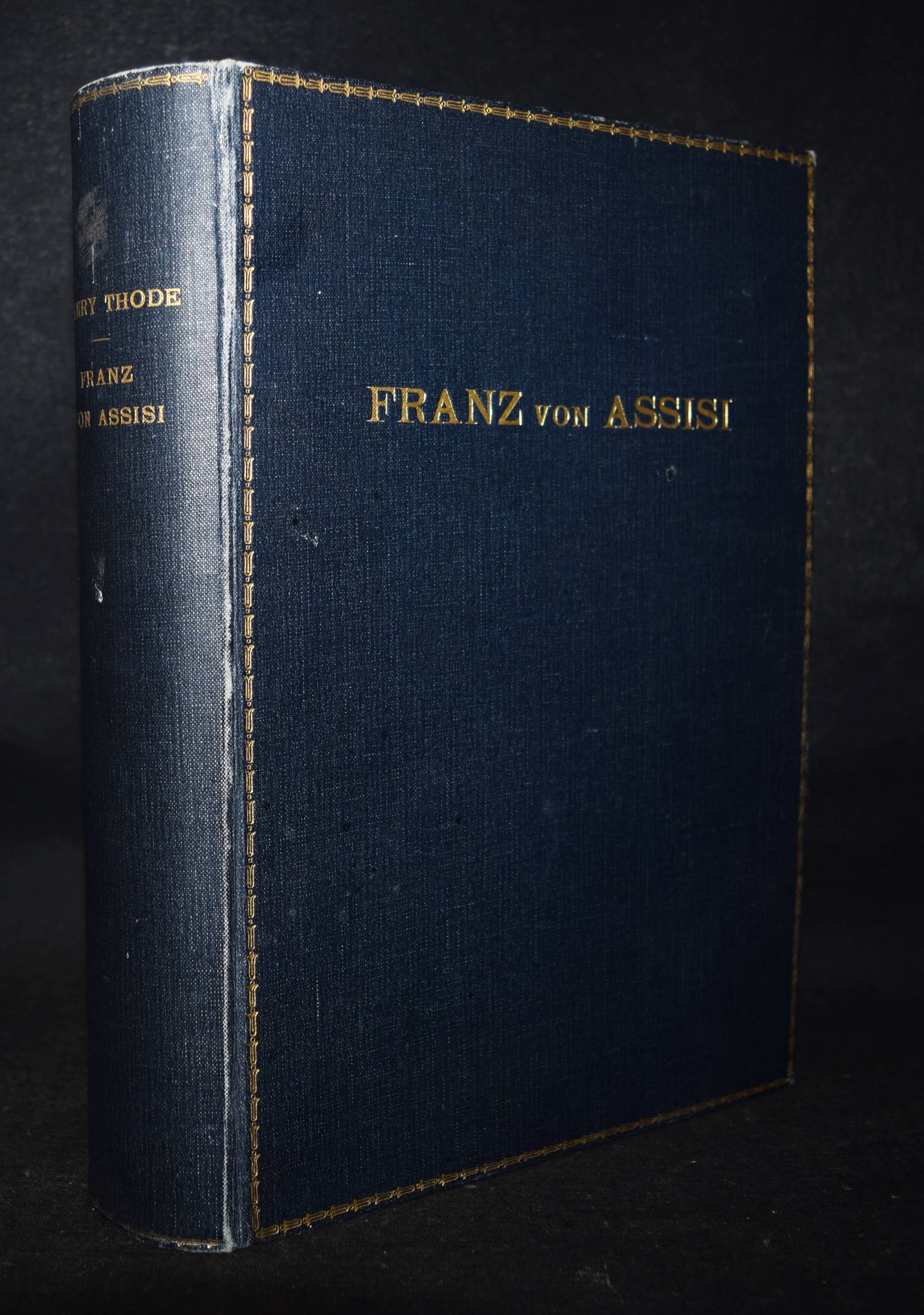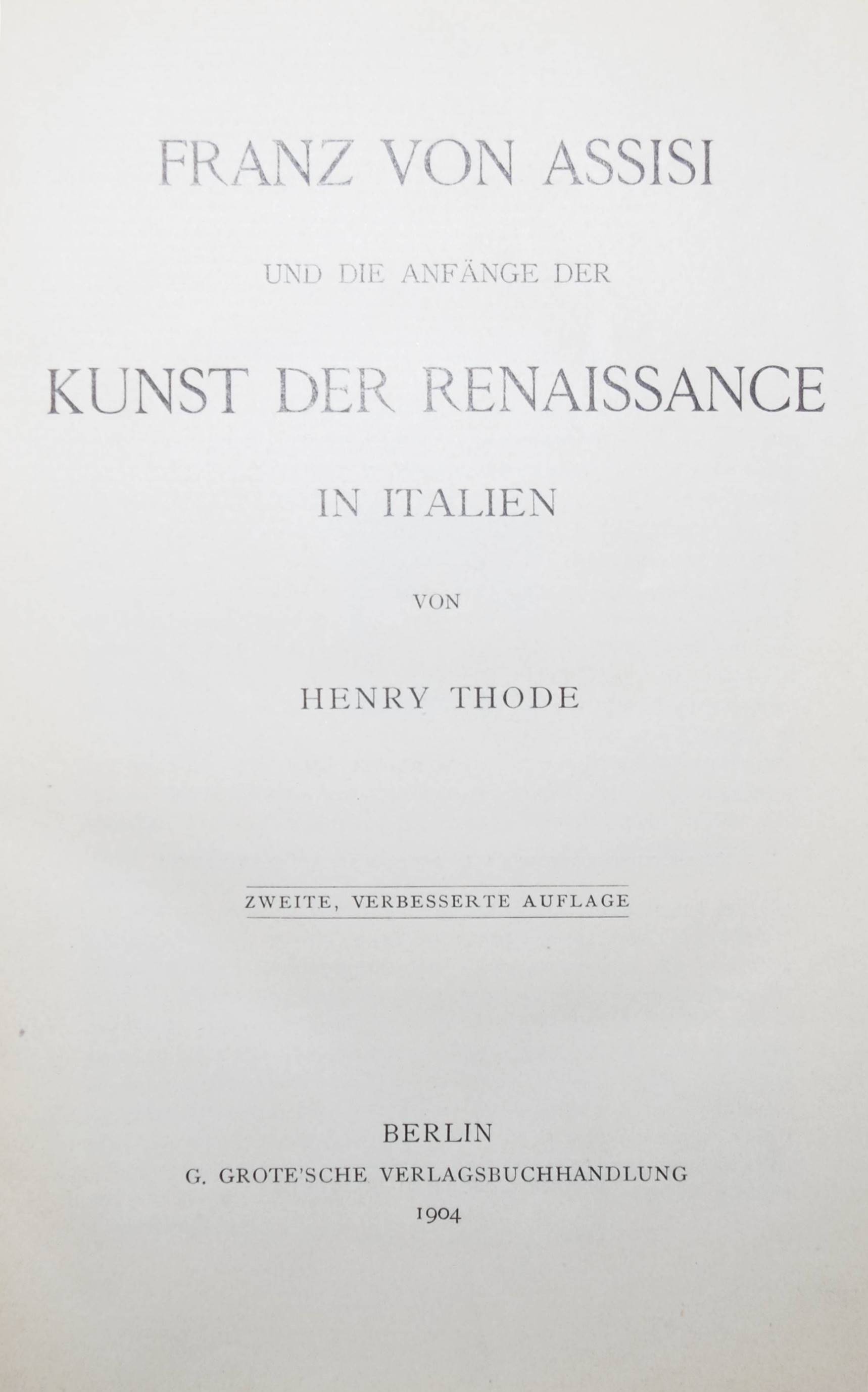 Thode, Henry (eig. Heinrich). Franz von Assisi und die Anfänge der Kunst der Renaissance in Italien. 2., verb. Aufl. Berlin, Grote 1904. Gr.-8°. XXVII, 643 S. mit 39 Tafeln. OLn. mit goldgepr. Rücken- u. Deckeltitel u. Kopfgoldschnitt. Gegenüber der ersten Ausgabe von 1885 erweitert. – Erstlingswerk des Kunsthistorikers H. Thode (1857-1920). Thode unternahm 1884 eine Studienreise nach Italien und lernte in Venedig Richard Wagner kennen. 1886 heiratete er Daniela von Bülow, die älteste Tochter von Cosima Wagner aus deren erster Ehe mit Hans von Bülow. Neben der italienischen Renaissance ist die deutsche Kunst um 1900 ein Schwerpunkt seiner Arbeit. Er förderte besonders Hans Thoma, den er 1889 als Direktor am Städelschen Kunstinstitut in Frankfurt am Main kennenlernte. 1893 bis 1911 war er Professor für Kunstgeschichte in Heidelberg. – Sehr gutes Exemplar.