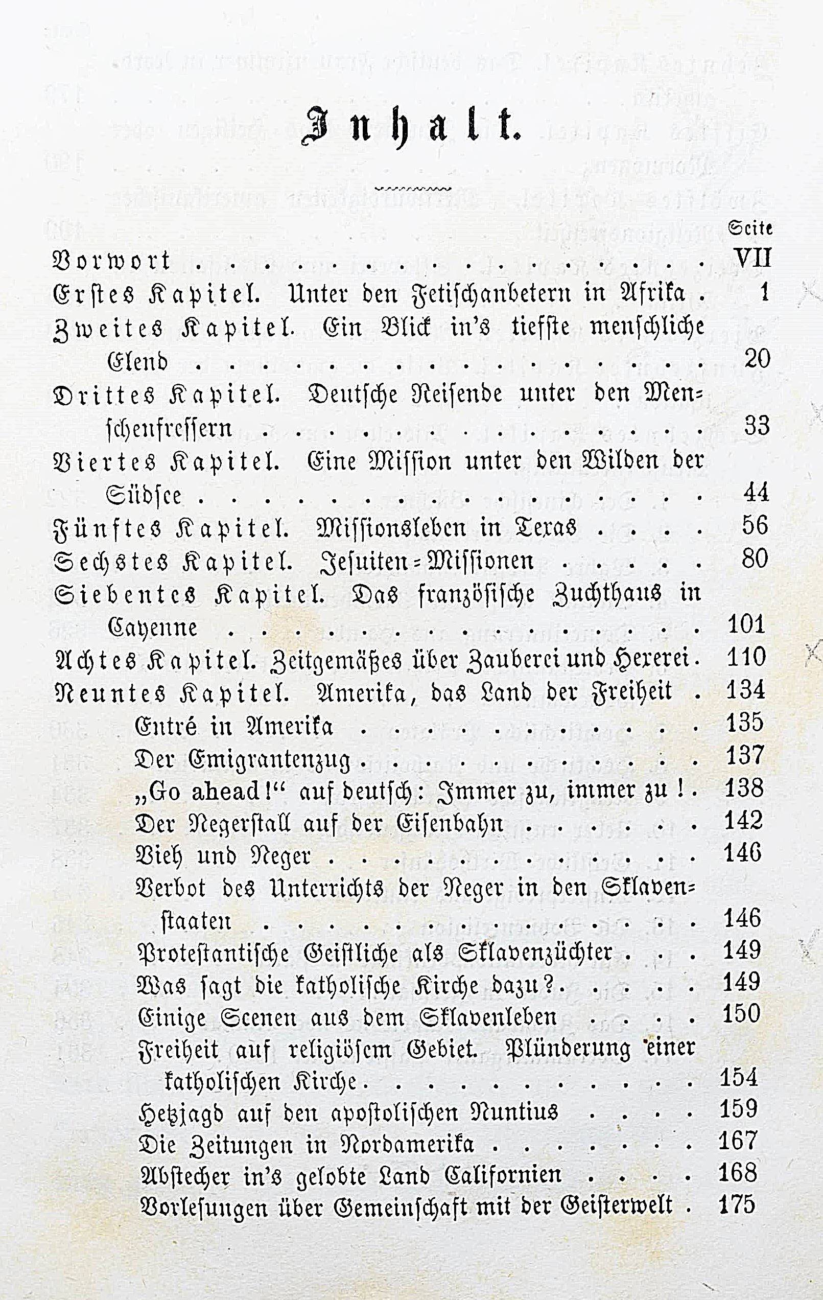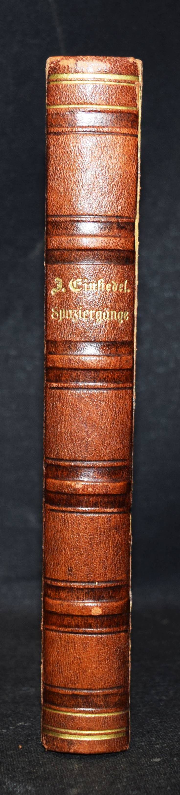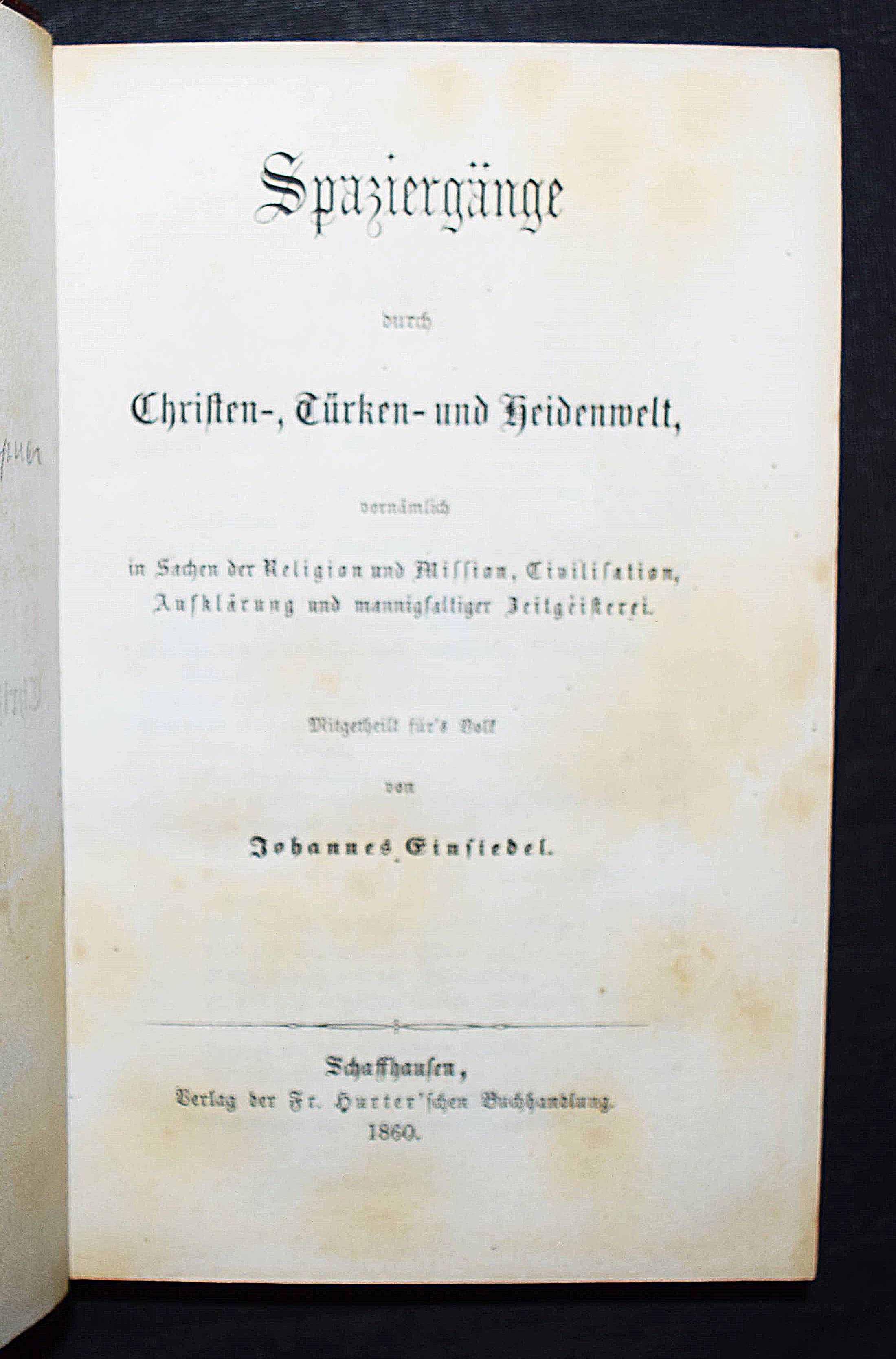 Einsiedel, Johannes (d. i. Alexander Schöppner). Spaziergänge durch Christen-, Türken und Heidenwelt, vornämlich in Sachen der Religion und Mission, Civilisation, Aufklärtung und mannigfaltiger Zeitgeisterei. Schaffhausen, Hurter 1860. 8°. XII, 364 S. Hldr. d. Zt. mit goldgepr. Rückentitel u. Linienverg. Erste Ausgabe, selten. – Mit interessanten ethnographischen Beobachtungen aus zahlreichen zeitgenöss. Reisebeschreibungen: „Unter den Fetischanbetern in Afrika“, „Deutsche Reisende unter den Menschenfressern“, „Missionsleben in Texas“, „Zeitgemäßes über Zauberei und Hexerei“, „Amerika, das Land der Freiheit“, „Verbot des Unterrichts der Neger in den Sklavenstaaten“, „Sklaverei und Civilisation in Afrika“, „Der chinesische Büchner“, „Das Zuchthaus Napoleons noch einmal“ etc. – Der Schriftsteller und Lehrer A. Schöppner (1820-1860) war seit 1848 Lehrer in Neuburg an der Donau und in München. Er war besonders durch seine Sammlung bayerischer Sagen bekannt. – Gelenke etwas spröde, stellenweise etwas stockfl., gutes dekorativ gebundenes Exemplar.