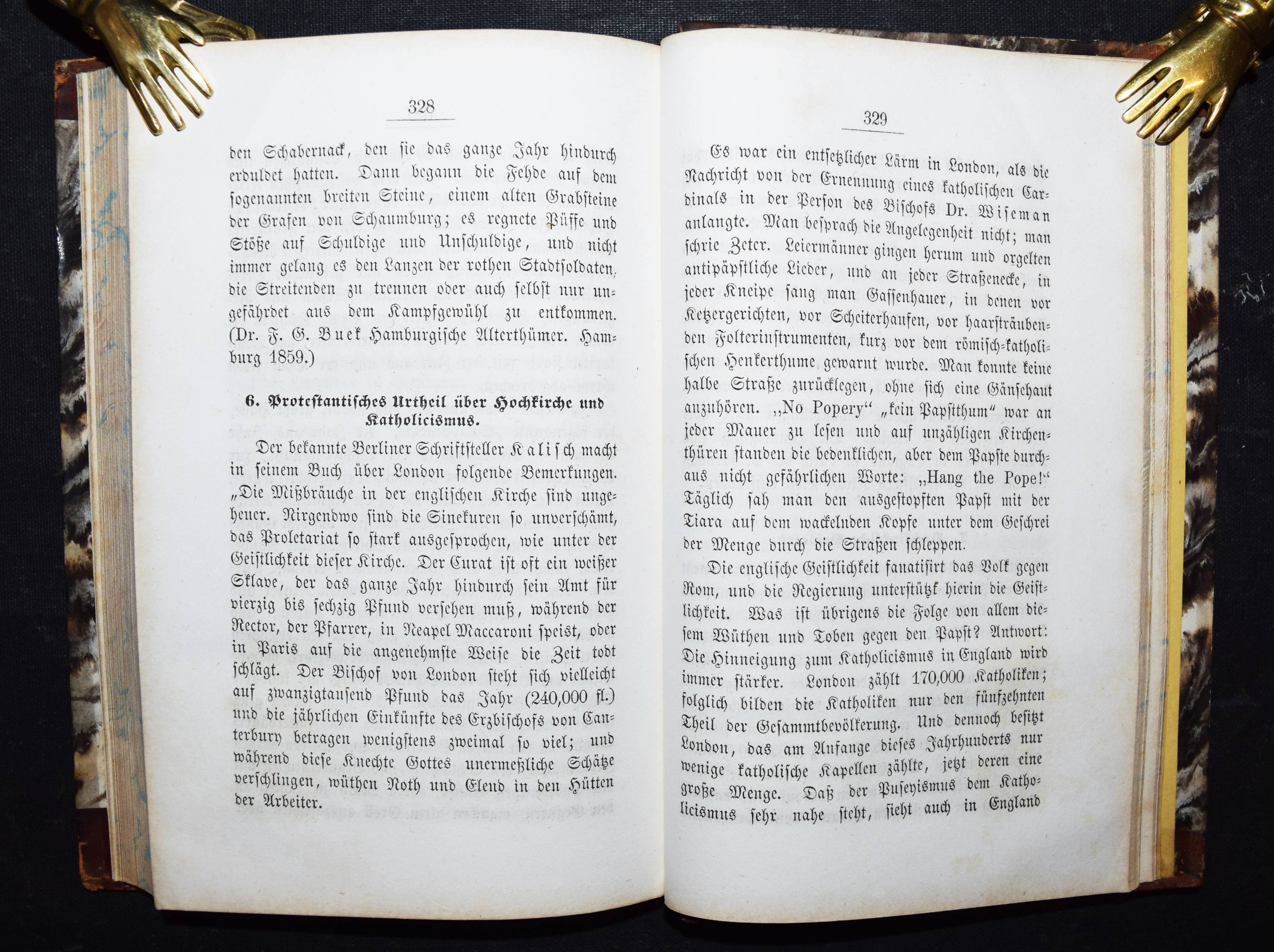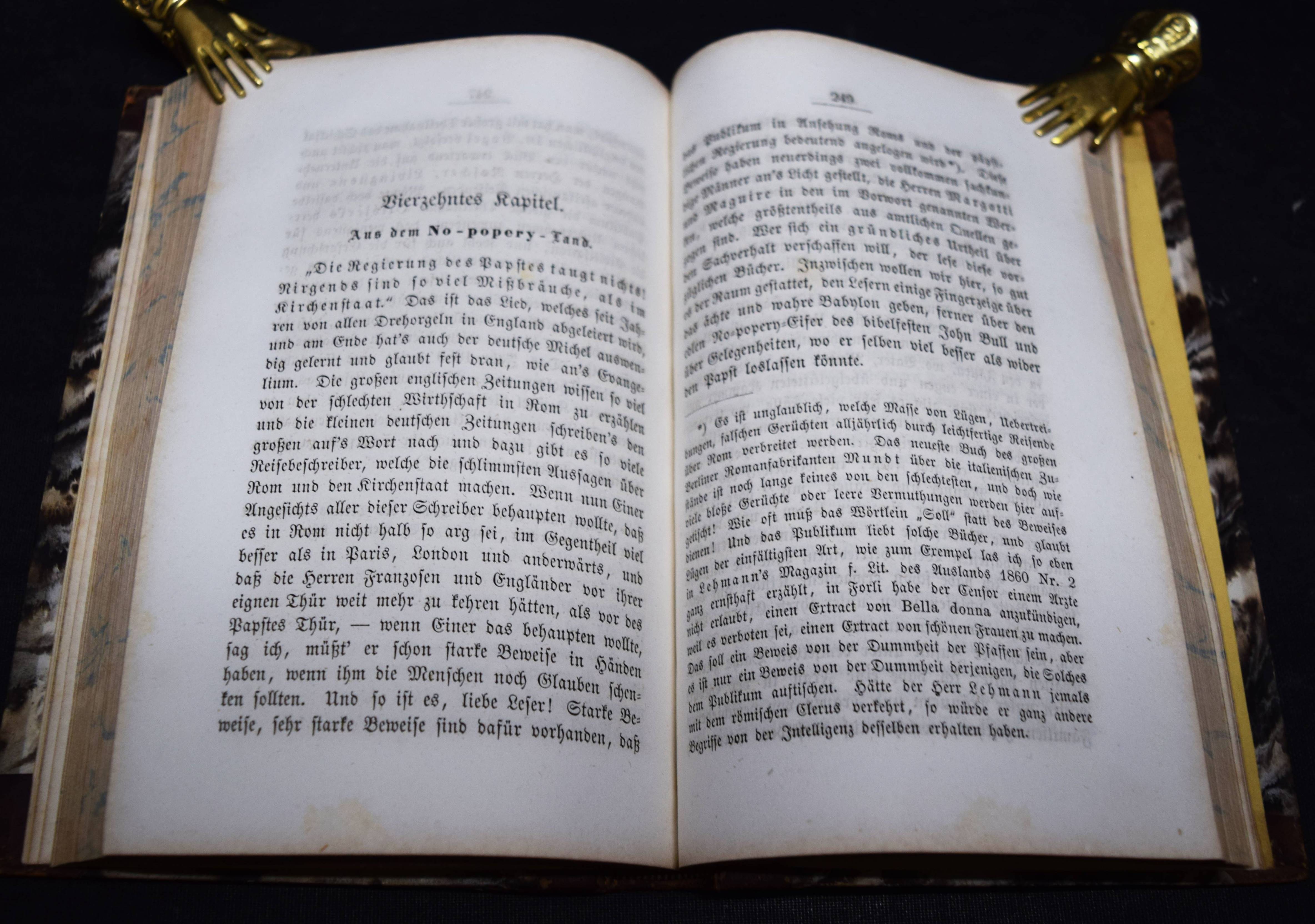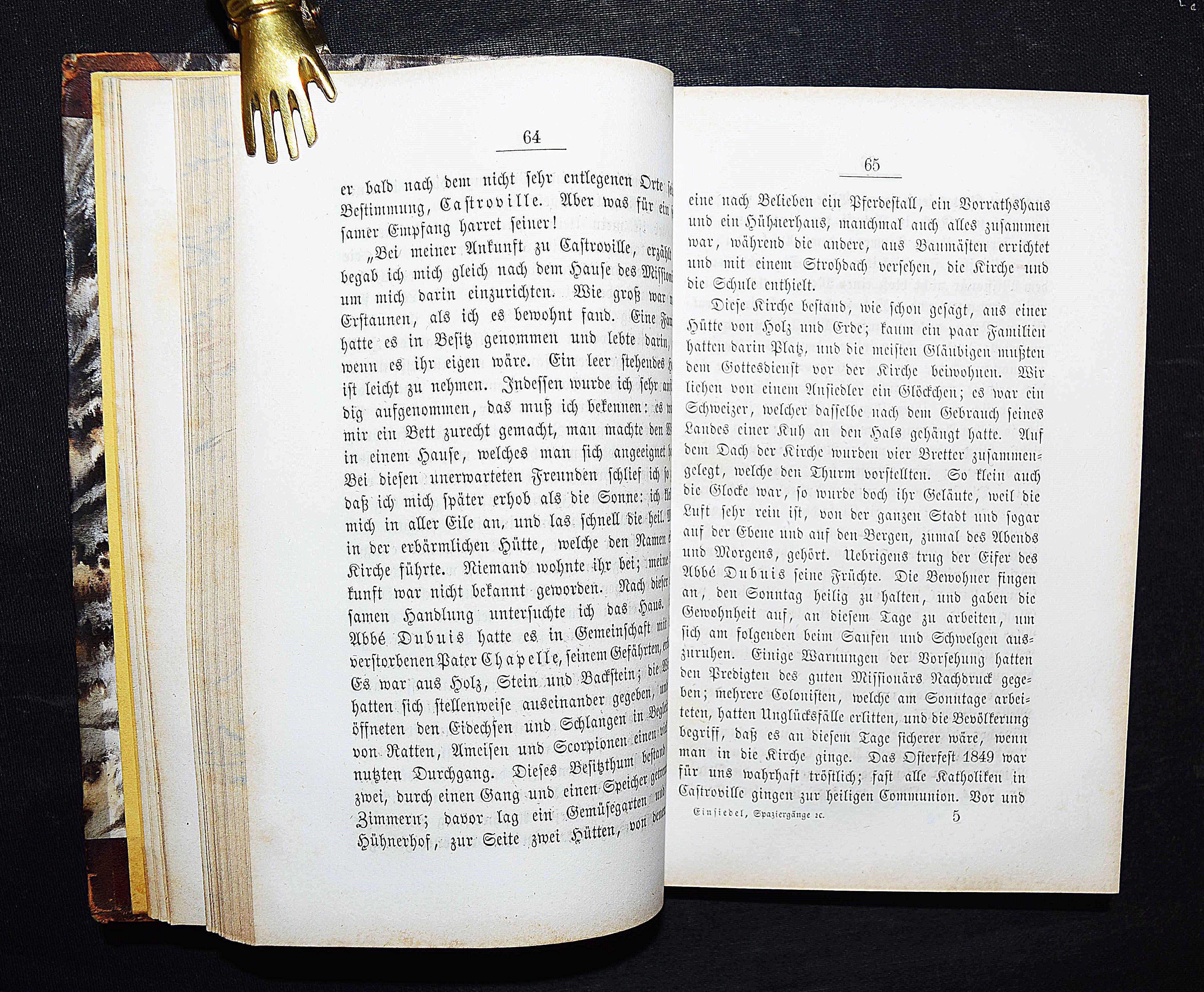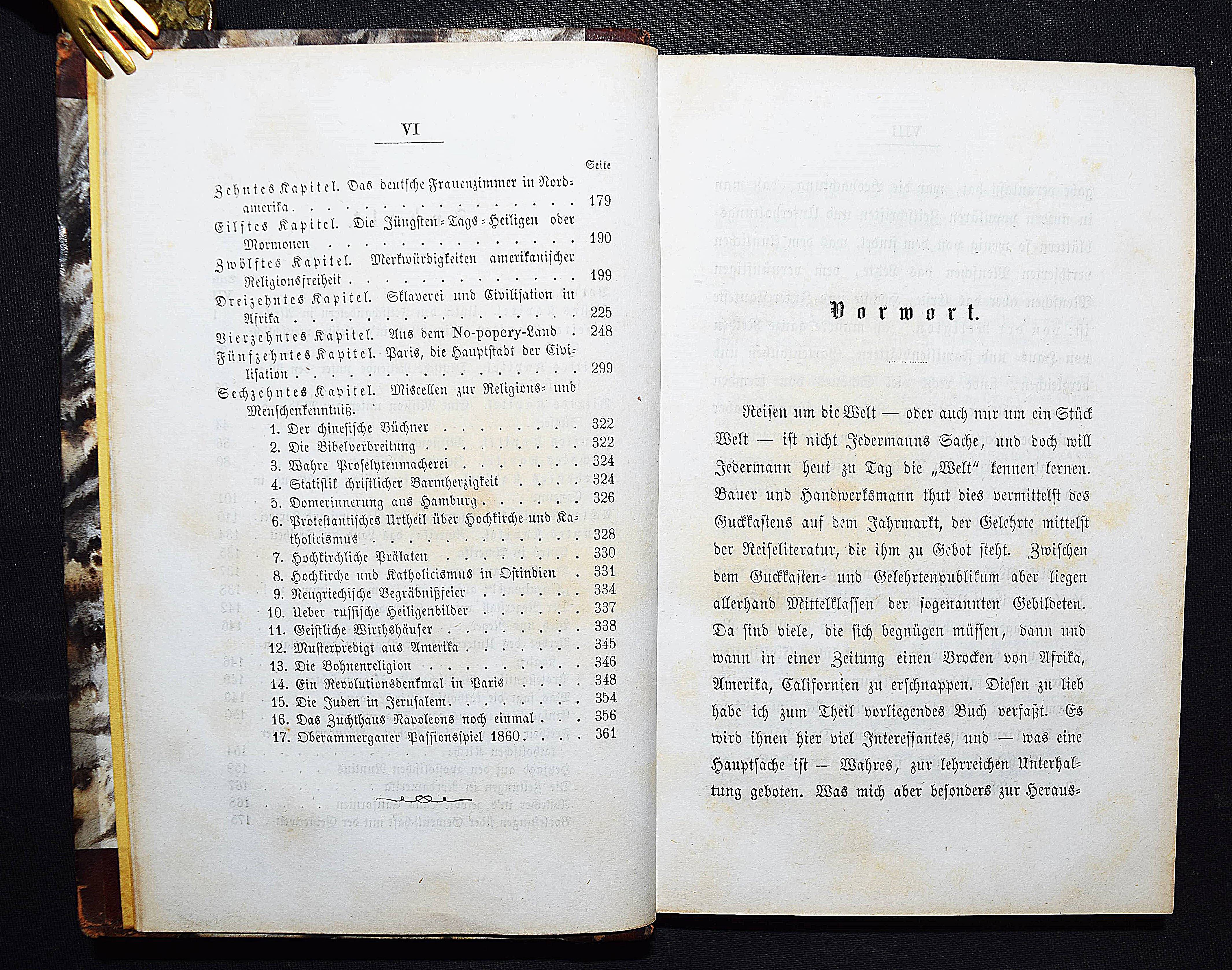 Einsiedel, Johannes (d. i. Alexander Schöppner). Spaziergänge durch Christen-, Türken und Heidenwelt, vornämlich in Sachen der Religion und Mission, Civilisation, Aufklärtung und mannigfaltiger Zeitgeisterei. Schaffhausen, Hurter 1860. 8°. XII, 364 S. Hldr. d. Zt. mit goldgepr. Rückentitel u. Linienverg. Erste Ausgabe, selten. – Mit interessanten ethnographischen Beobachtungen aus zahlreichen zeitgenöss. Reisebeschreibungen: „Unter den Fetischanbetern in Afrika“, „Deutsche Reisende unter den Menschenfressern“, „Missionsleben in Texas“, „Zeitgemäßes über Zauberei und Hexerei“, „Amerika, das Land der Freiheit“, „Verbot des Unterrichts der Neger in den Sklavenstaaten“, „Sklaverei und Civilisation in Afrika“, „Der chinesische Büchner“, „Das Zuchthaus Napoleons noch einmal“ etc. – Der Schriftsteller und Lehrer A. Schöppner (1820-1860) war seit 1848 Lehrer in Neuburg an der Donau und in München. Er war besonders durch seine Sammlung bayerischer Sagen bekannt. – Gelenke etwas spröde, stellenweise etwas stockfl., gutes dekorativ gebundenes Exemplar.