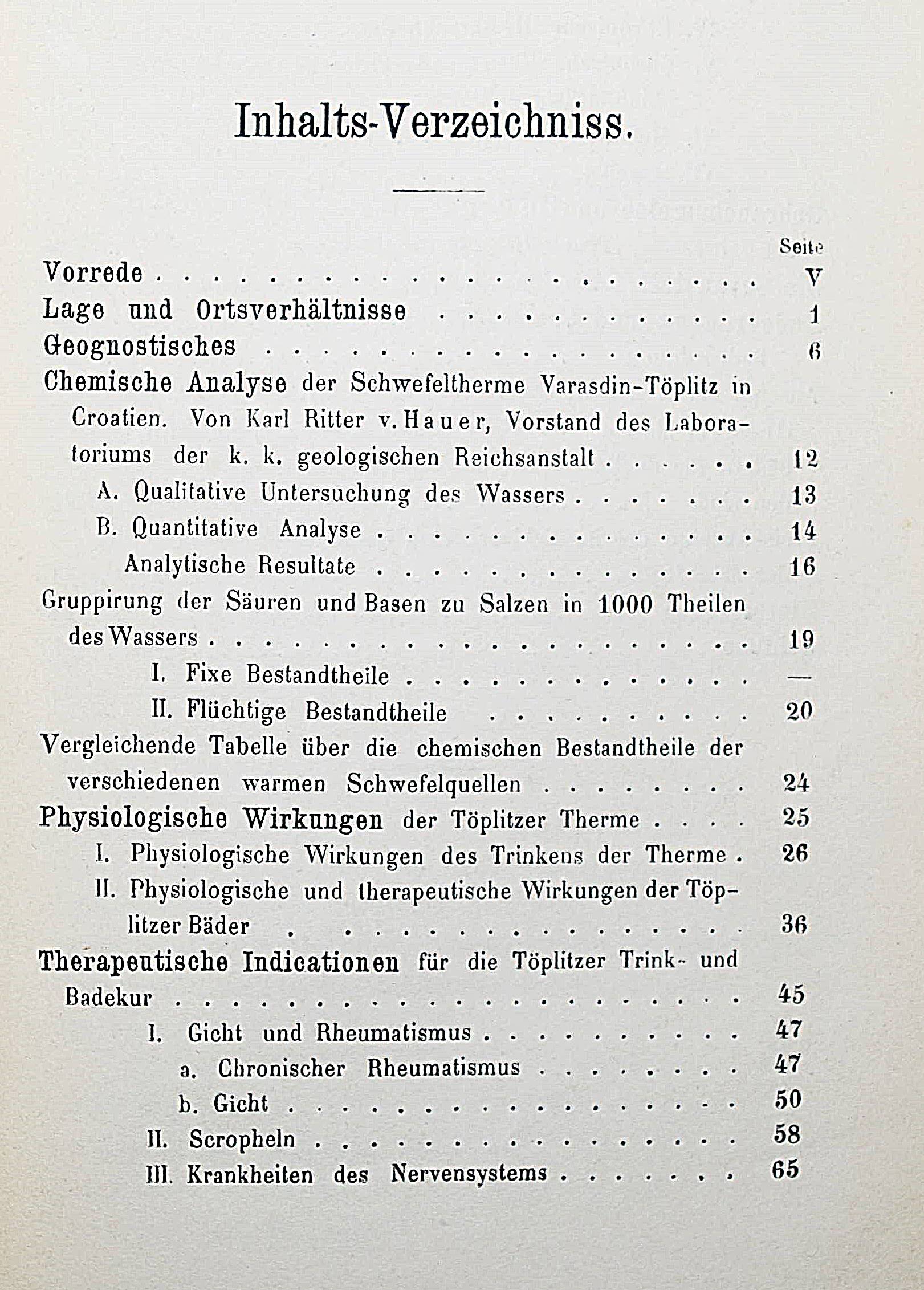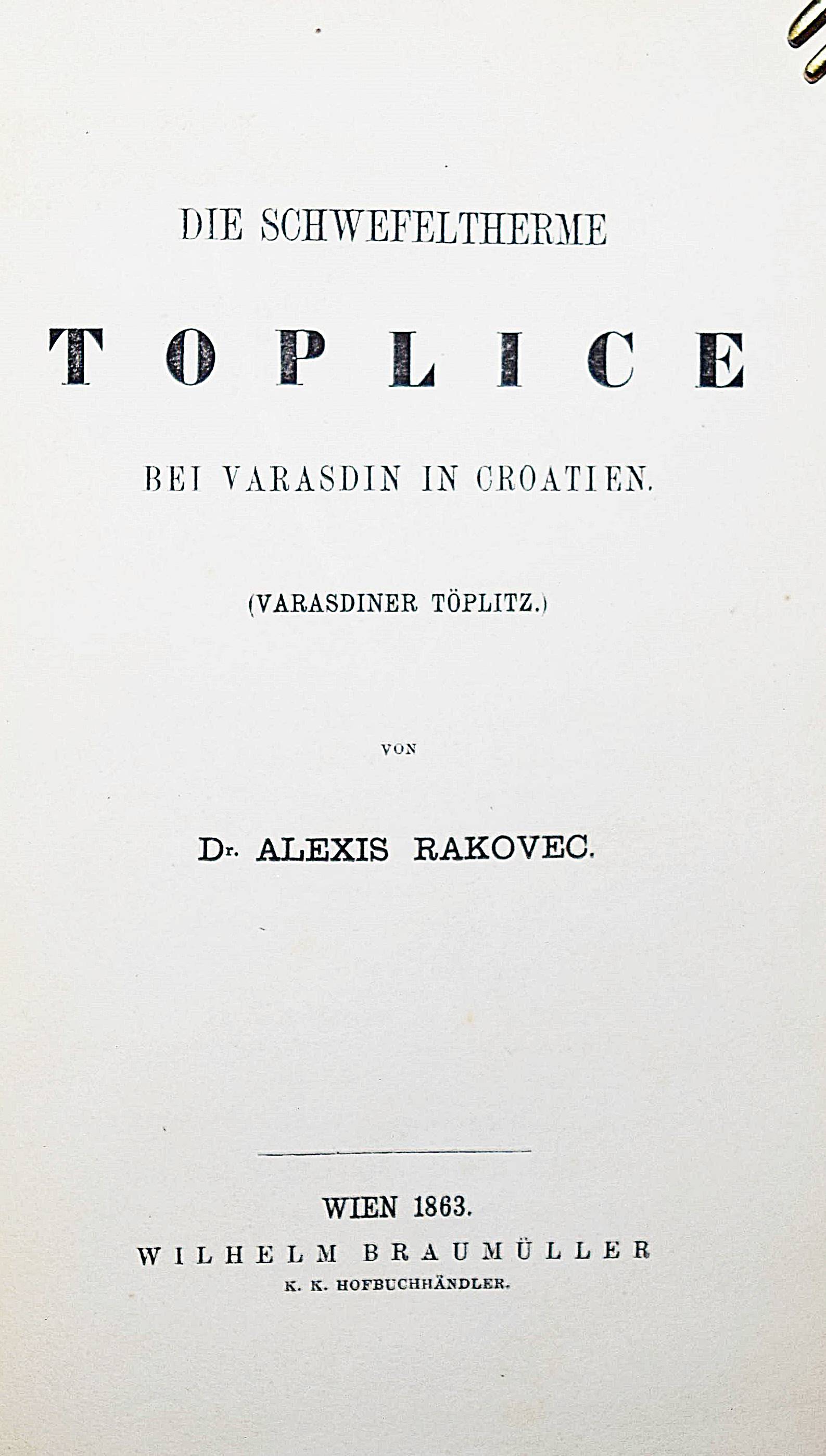 Rakovec, Alexis. Die Schwefeltherme Toplice bei Varasdin in Croatien (Varasdiner Töplitz). Wien, Wilhelm Braumüller 1863. 8°. X, 175 S. mit 1 gefalt. Tabelle. Illustr. OKart. Erste Ausgabe, selten. – Umschlag etwas angestaubt u. fleckig, Vorderdeckel oben mit Bibliothekssign., vereinzelt Bleistiftanstreichungen, gutes Exemplar.