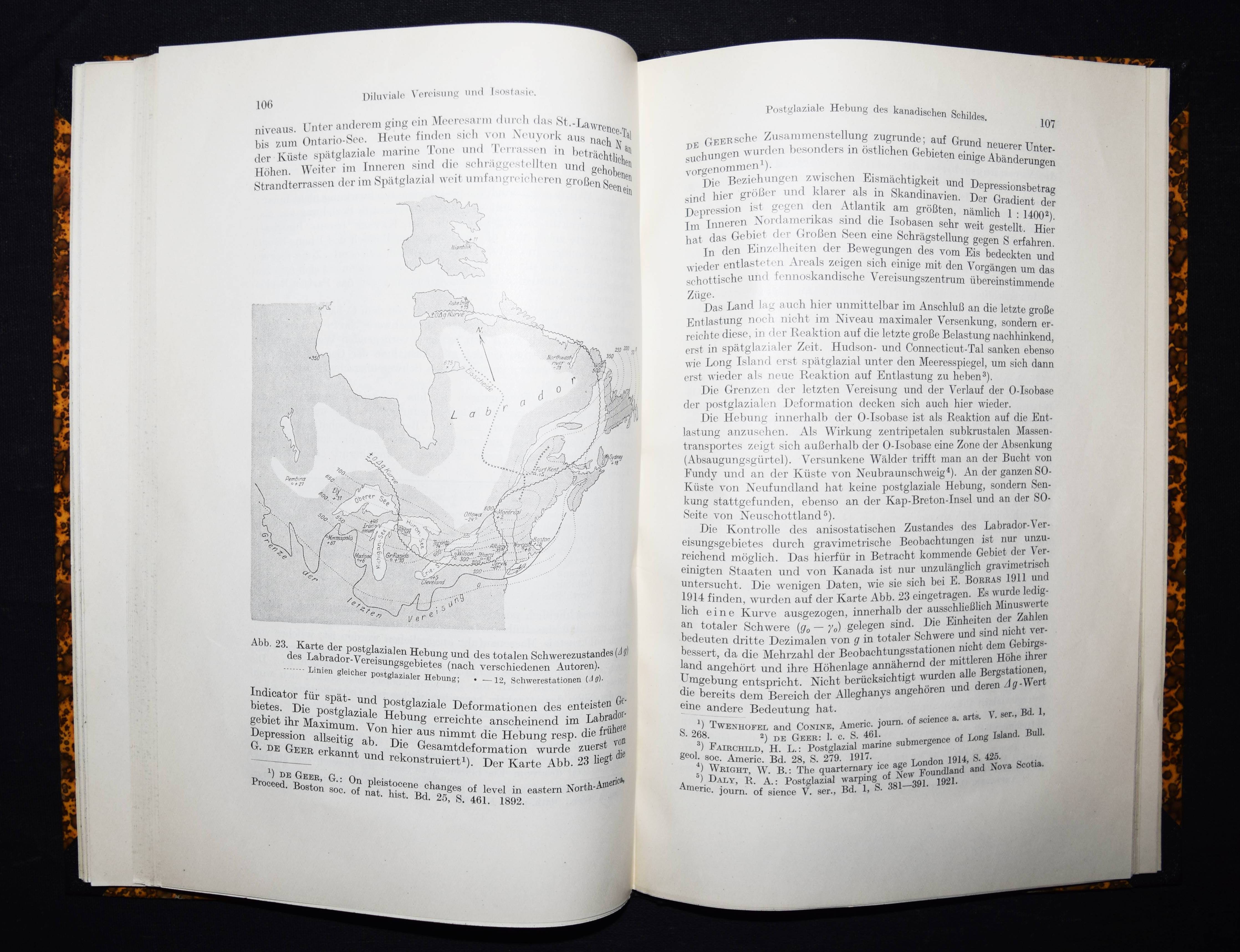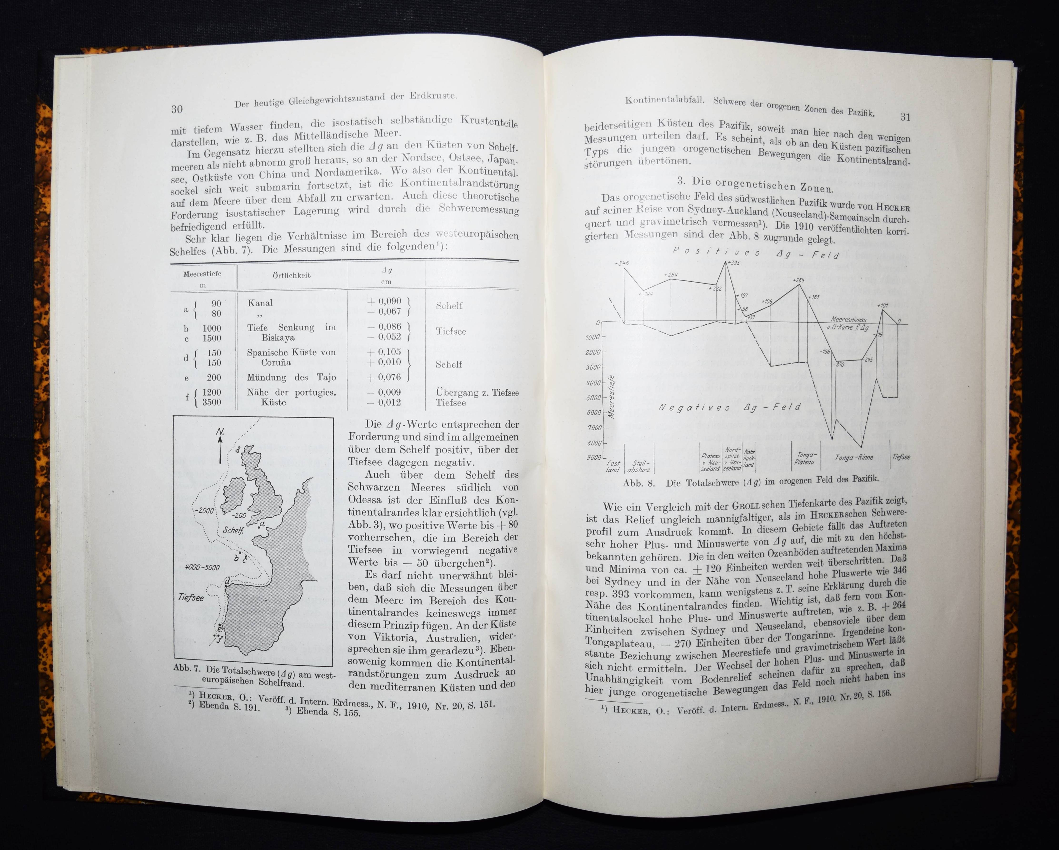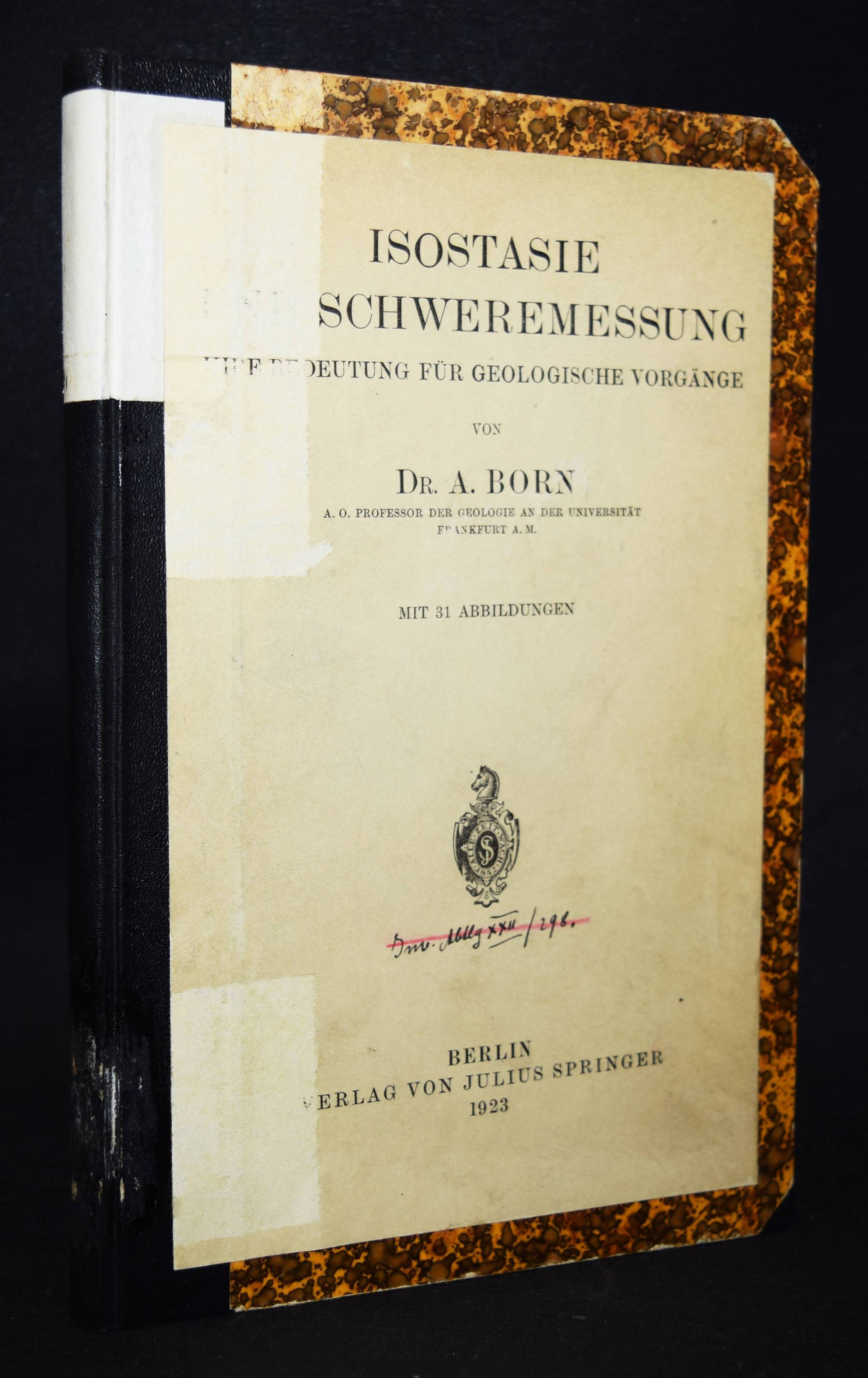 Born, A(xel). Isostasie und Schweremessung. Ihre Bedeutung für geologische Vorgänge. Berlin, Springer 1923. 8°. [2] Bl., 159 S. mit 31 Abb. Hln. d. Zt. Erste Ausgabe. – Seltene Arbeit des Geologen und Paläontologen A. Born (1887-1935). – „Seine Bedeutung liegt aber in erster Linie auf dem Gebiet modernster geologischer Forschung, die, eng verknüpft mit den Interessen der Praxis (Bergbau, Erdöl) nicht bloß mit Tiefbohrungen den bis dahin nur an vereinzelten Punkten bekannten tieferen Bau der Erdkruste erkundet. B.s geologische Auswertung der Schweremessungen führt u. a. zum Entwurf der Isanomalenkarten der Schwerestörungen Deutschlands und der Iberischen Halbinsel. Neben Kossmat ist er zum Bahnbrecher der angewandten Geophysik geworden“ (W. Quenstedt in NDB II, 466). – Rücken mit entfernten Bibliothekssign., St.a.T., sonst gutes Exemplar.