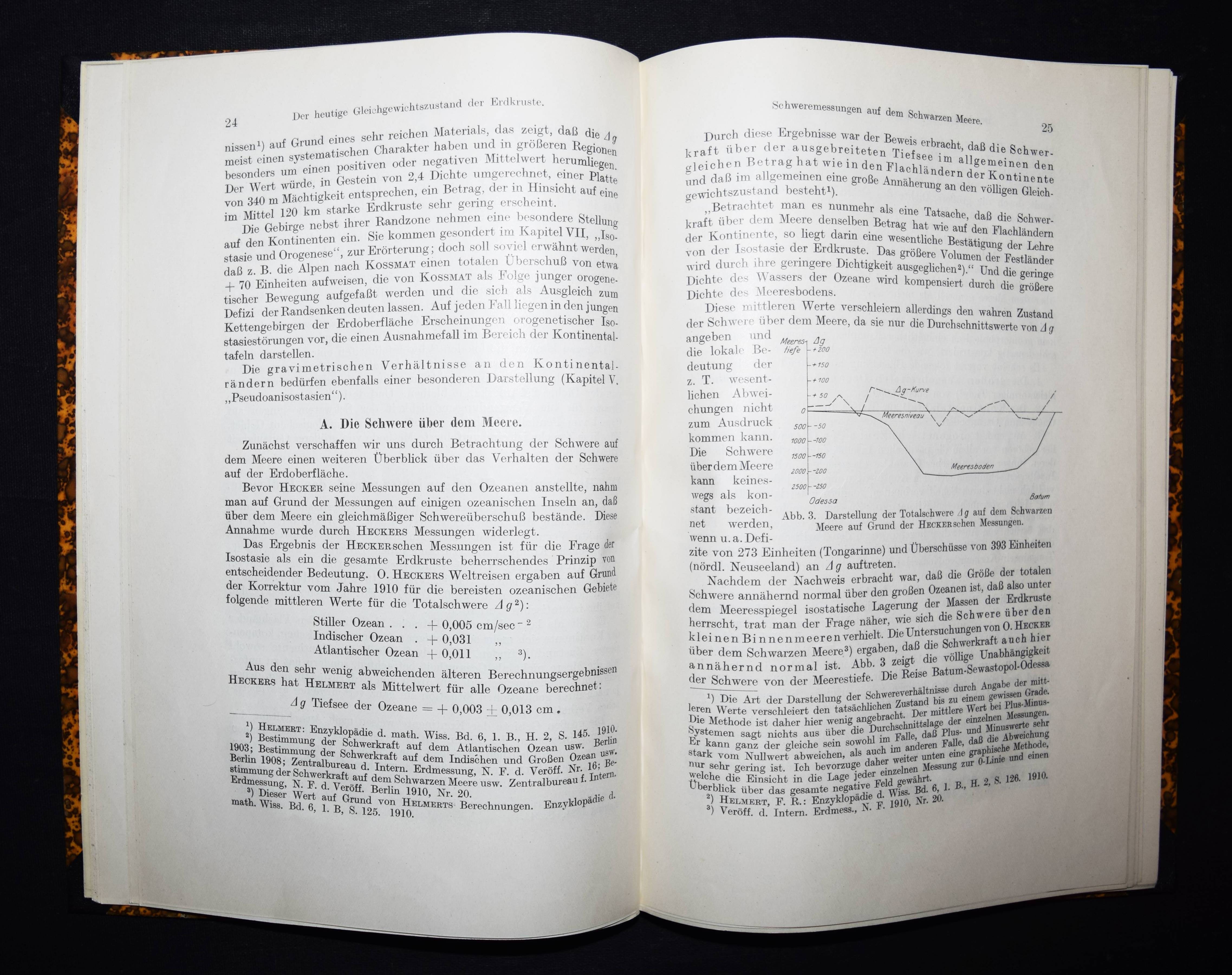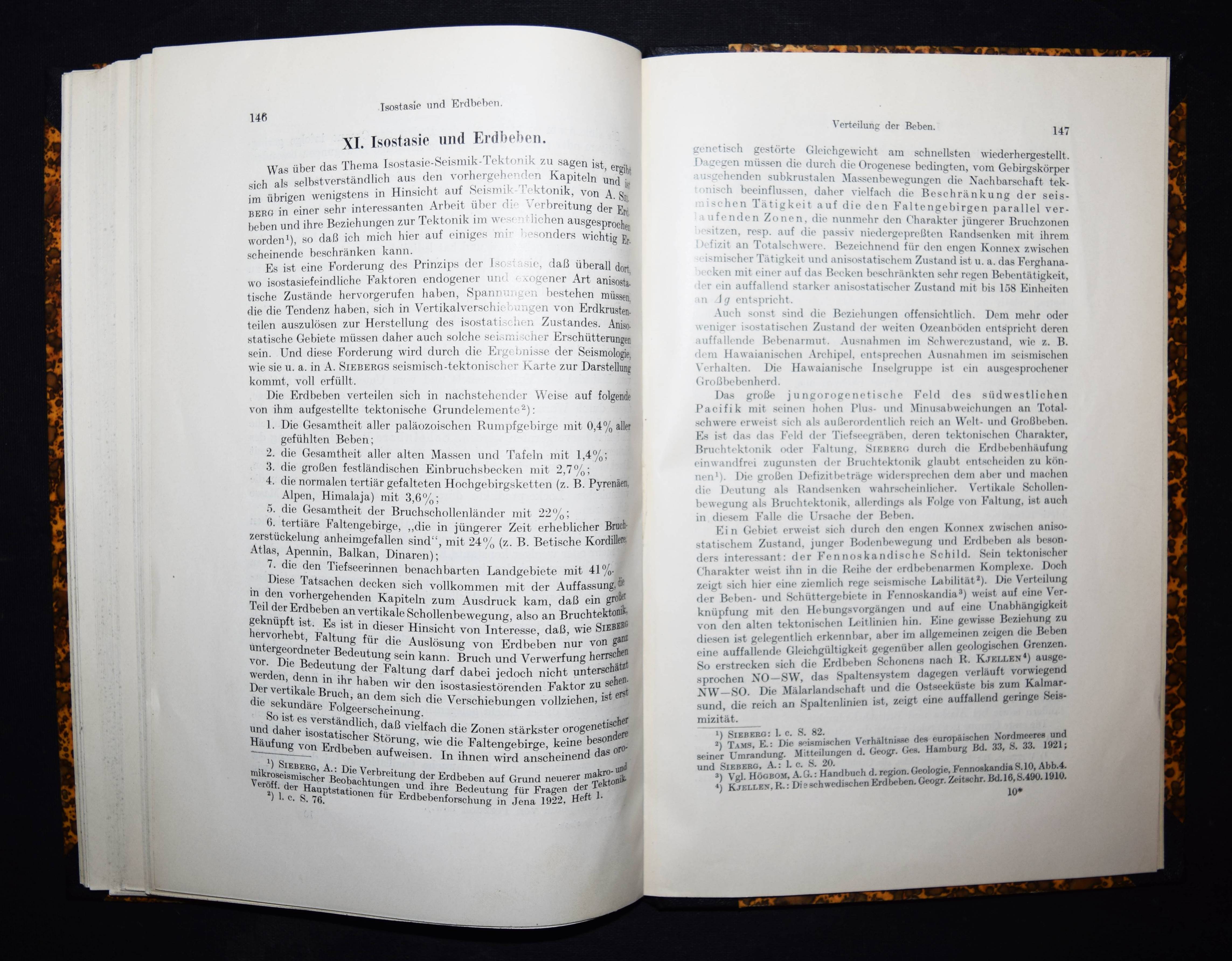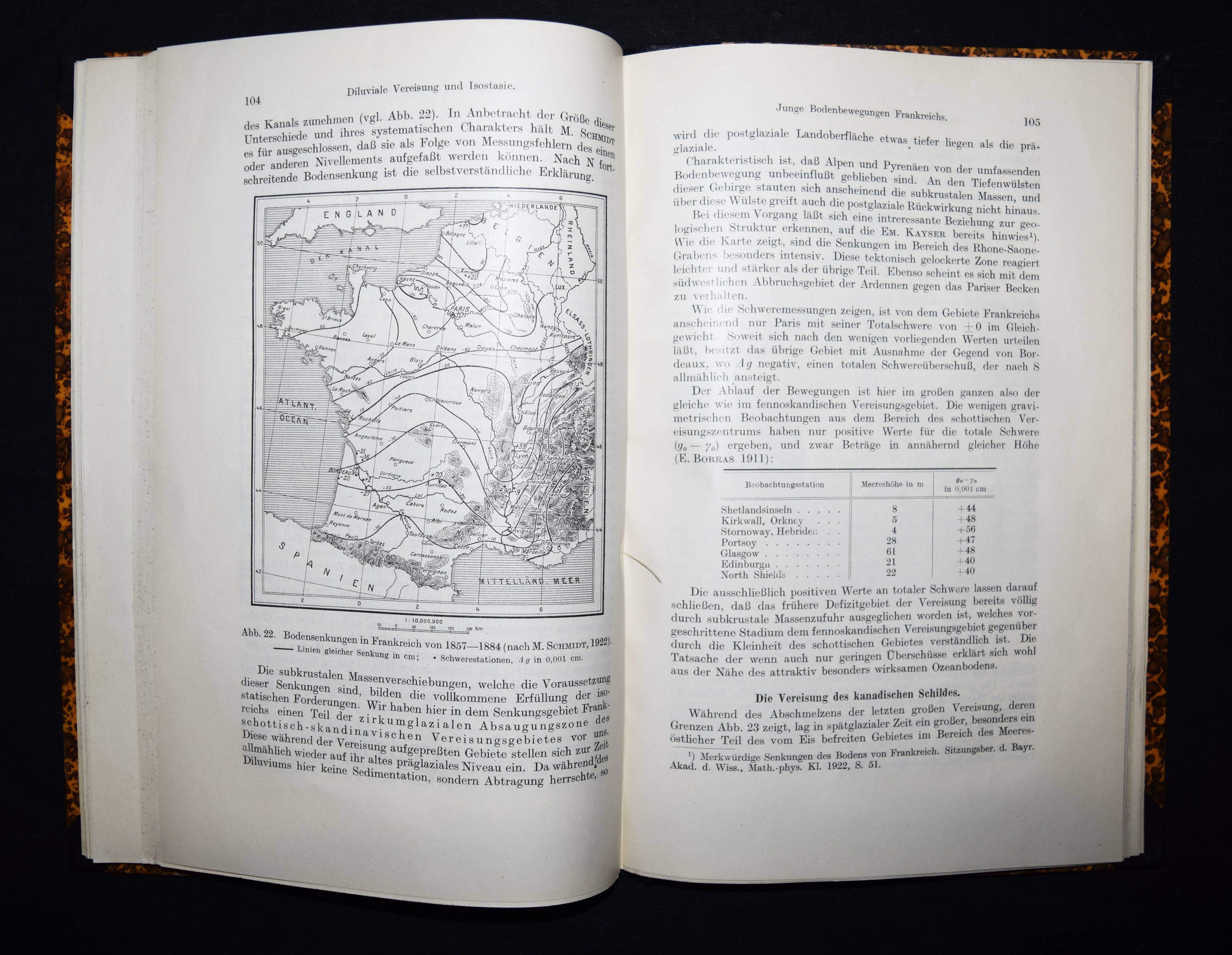 Born, A(xel). Isostasie und Schweremessung. Ihre Bedeutung für geologische Vorgänge. Berlin, Springer 1923. 8°. [2] Bl., 159 S. mit 31 Abb. Hln. d. Zt. Erste Ausgabe. – Seltene Arbeit des Geologen und Paläontologen A. Born (1887-1935). – „Seine Bedeutung liegt aber in erster Linie auf dem Gebiet modernster geologischer Forschung, die, eng verknüpft mit den Interessen der Praxis (Bergbau, Erdöl) nicht bloß mit Tiefbohrungen den bis dahin nur an vereinzelten Punkten bekannten tieferen Bau der Erdkruste erkundet. B.s geologische Auswertung der Schweremessungen führt u. a. zum Entwurf der Isanomalenkarten der Schwerestörungen Deutschlands und der Iberischen Halbinsel. Neben Kossmat ist er zum Bahnbrecher der angewandten Geophysik geworden“ (W. Quenstedt in NDB II, 466). – Rücken mit entfernten Bibliothekssign., St.a.T., sonst gutes Exemplar.