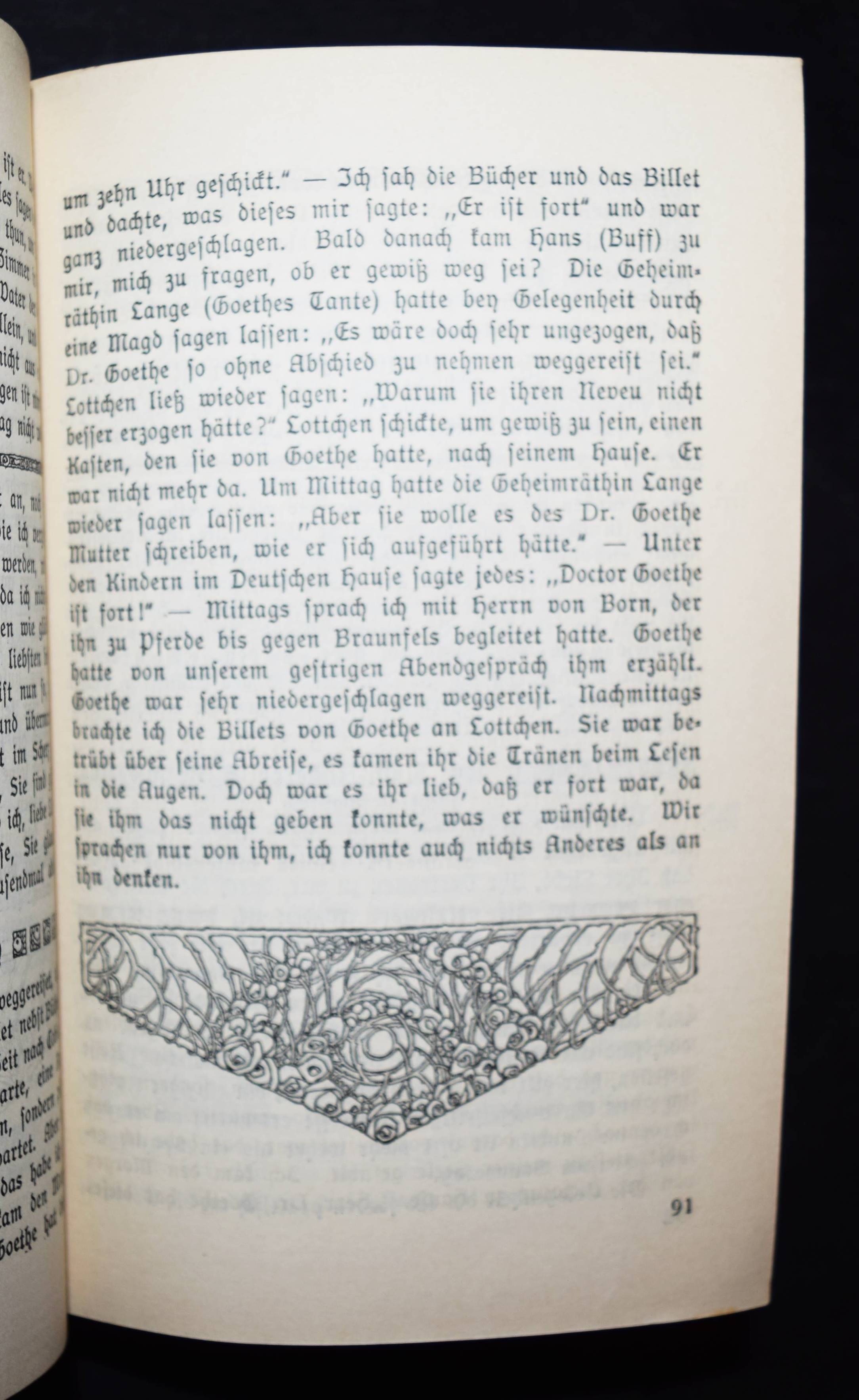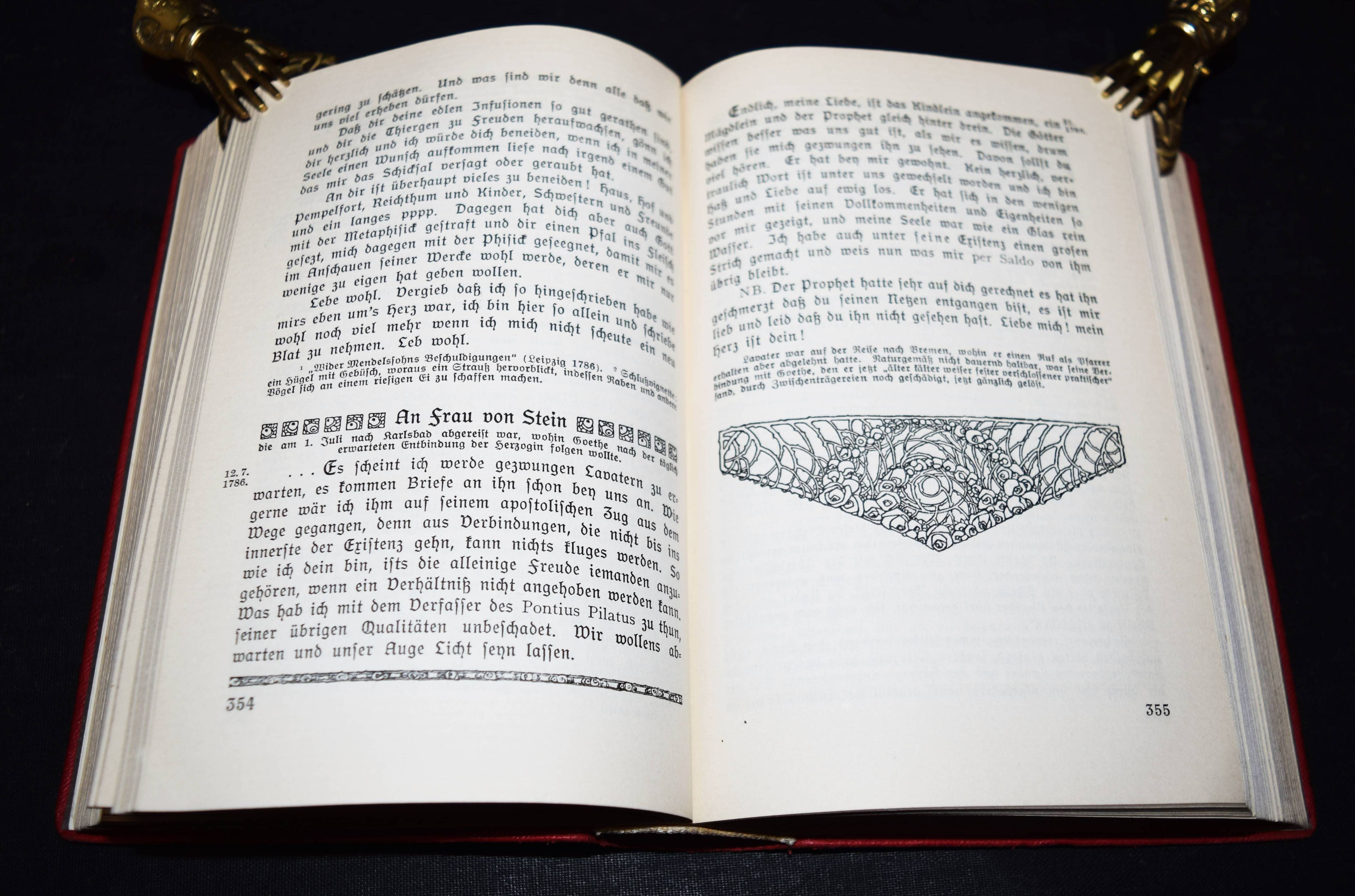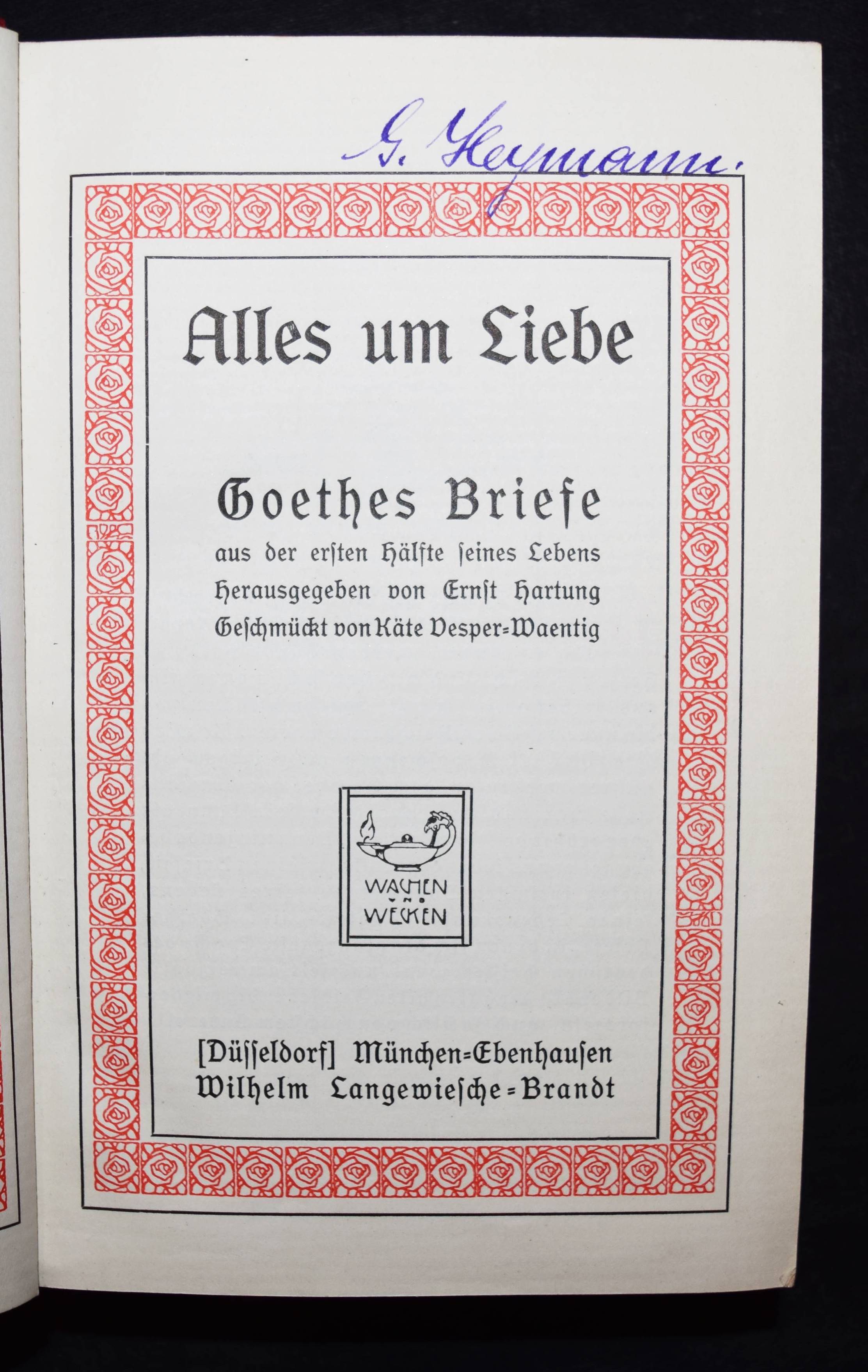 Goethe – Hartung, Ernst (Hrsg.). Goethes Leben in seinen Briefen. I. Alles um Liebe. – II. II. Vom tätigen Leben. Geschmückt von Käte Vesper-Waentig. 2 Teile in 1 Band. Düsseldorf, München-Ebenhausen, Langewiesche-Brandt (1907). 8°. 430 S.; 415, (1) S. mit Jugendstil-Buchschmuck. Weinroter OLdr. mit dekorativer Rückenverg. u. Kopfgoldschnitt. Erste Ausgabe. – N.a.V., sehr gutes Exemplar der schönen Lederausgabe.