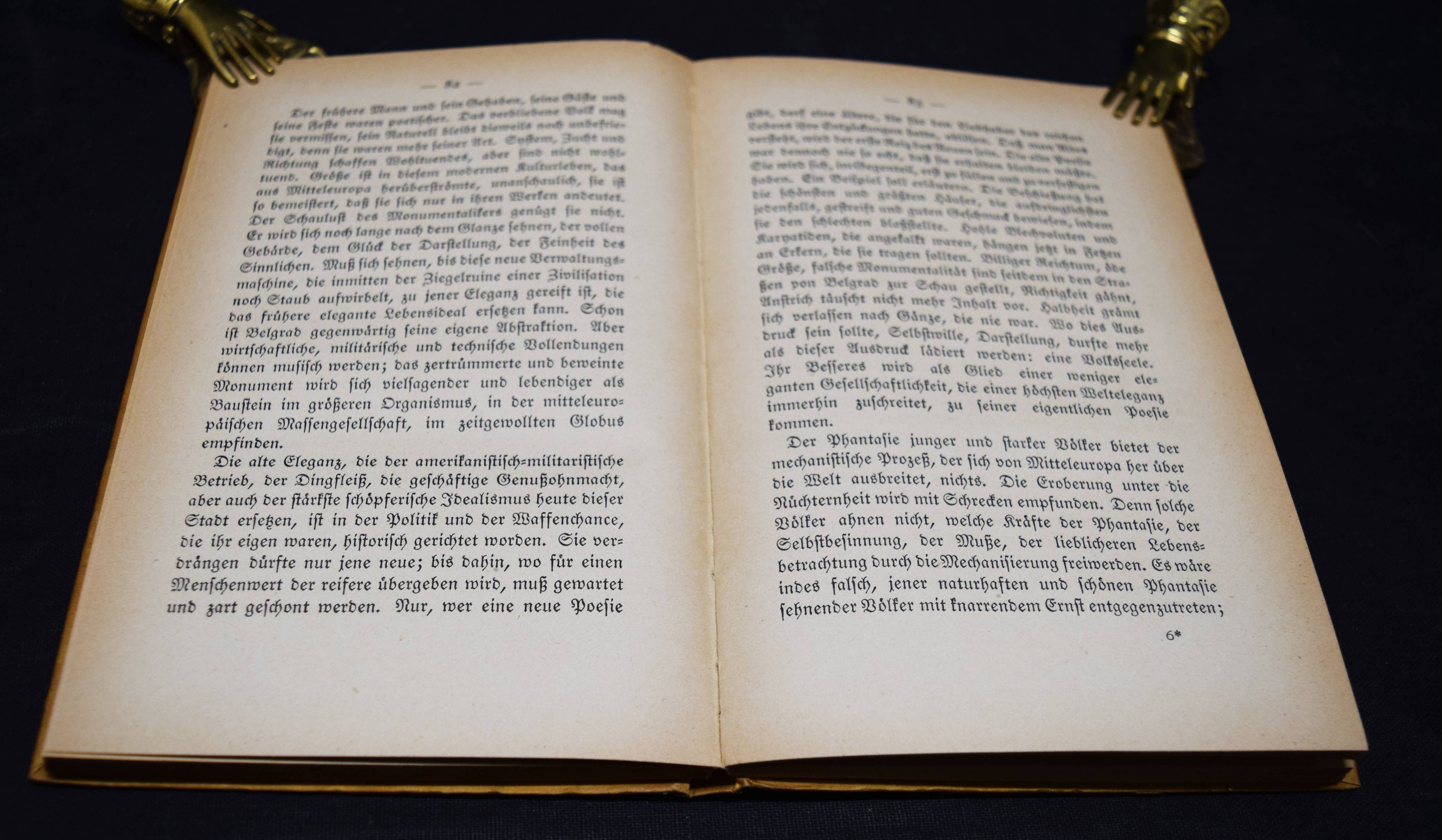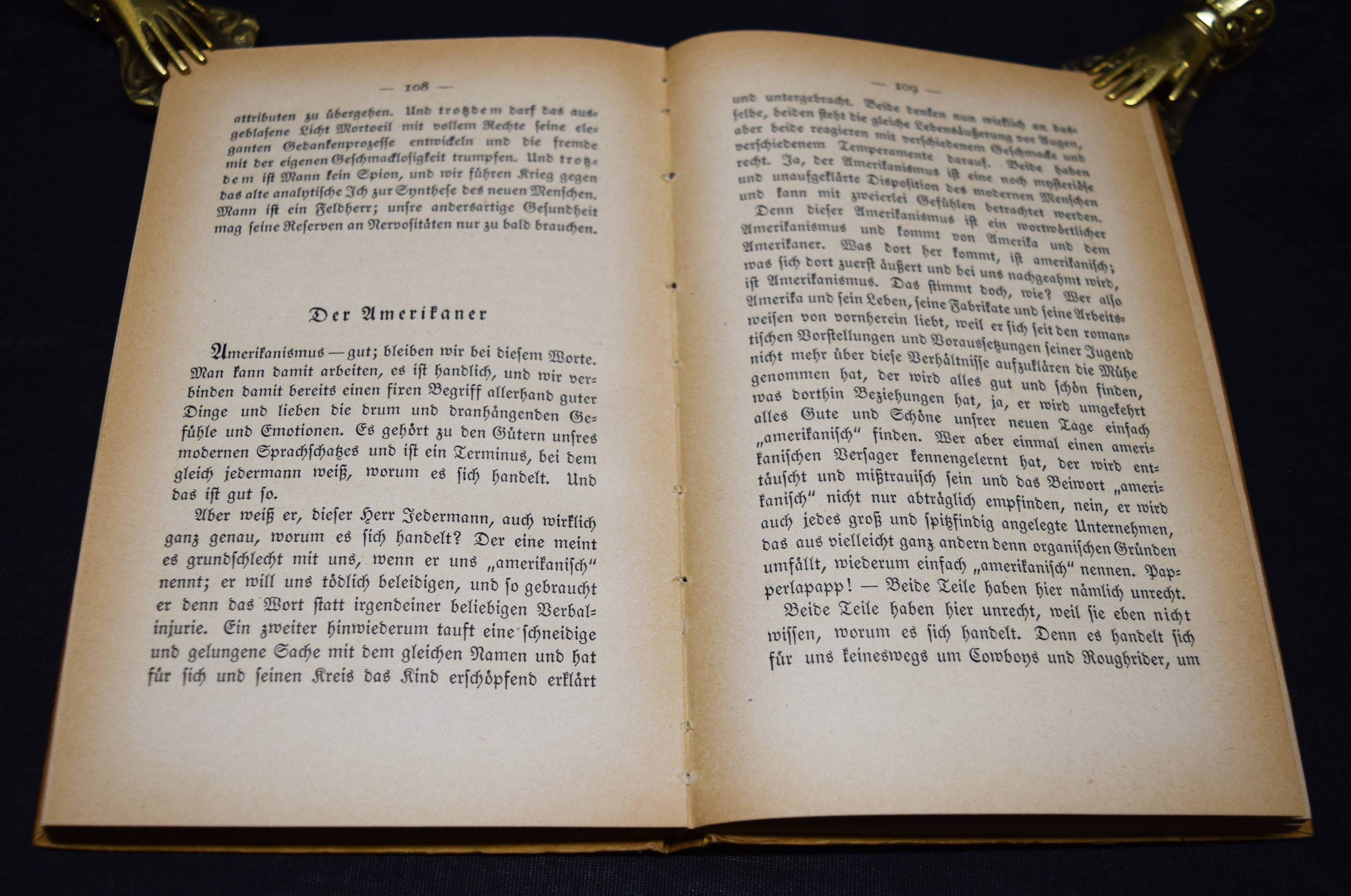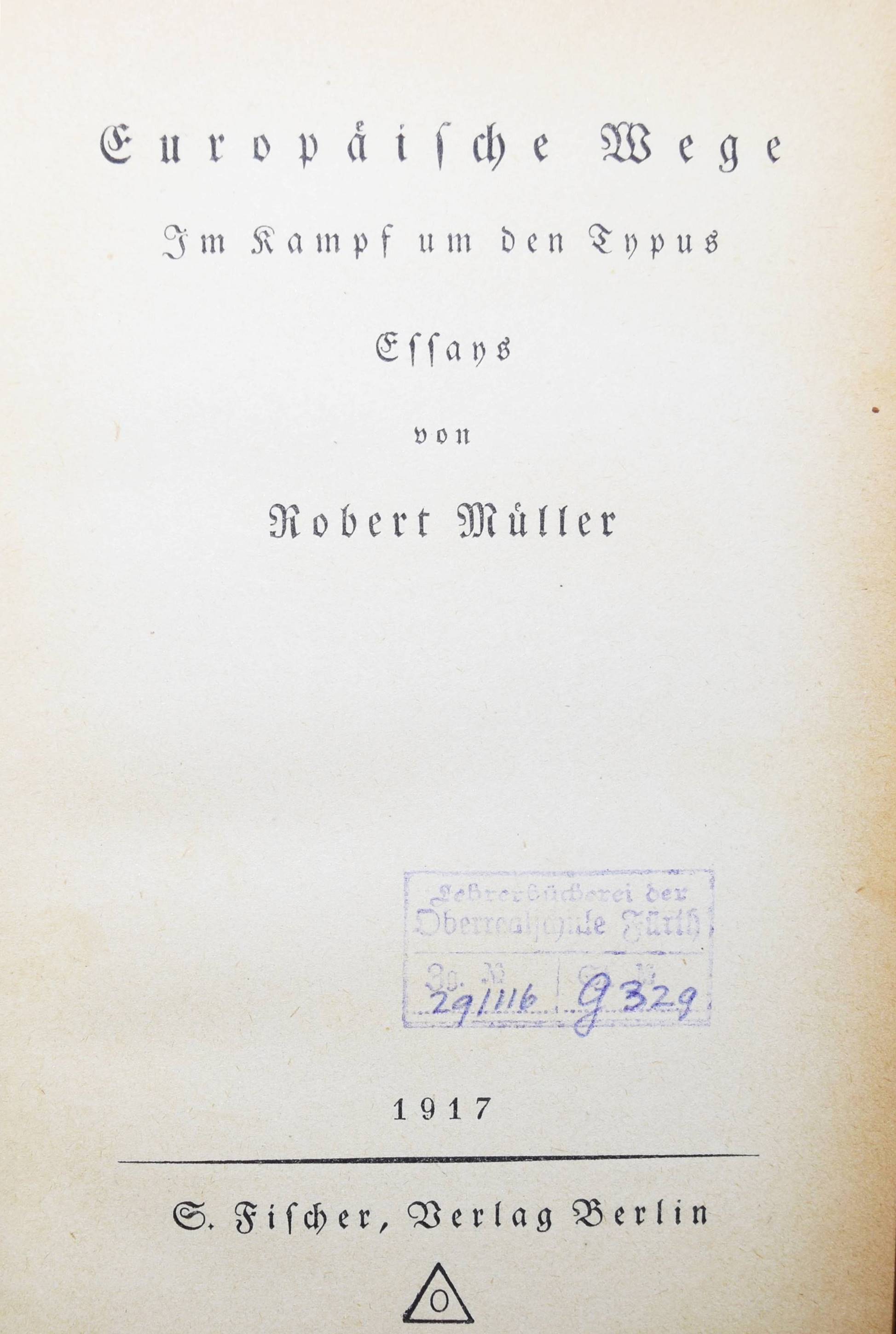 Müller, Robert. Europäische Wege. Im Kampf um den Typus. Essays. Berlin, Fischer 1917. 8°. 152 S. OPbd. (Sammlung von Schriften zur Zeitgeschichte, Band 30/31). NDB XVIII, 473 f. ÖBL VI, 426. Raabe 216, 8. – Erste Ausgabe, selten. – Kulturphilosophische Essays über Thomas und Heinrich Mann, Gerhard Hauptmann, Peter Altenberg, Serbien, Österreich und Preußen etc. – Der österreichische Schriftsteller, Journalist und Verleger R. Müller (1887-1924), polarisierender Essayist, sein Roman „Tropen. Der Mythos der Reise“ (1915) gilt als Meisterwerk des deutschen Exotismus der Jahrhundertwende. – „Der Weg vom Papier zur Tat ist im Sinne der aktivistischen Auffassung geradezu Dogma. Dieses Selbstbekenntnis zur Tat ist es auch, das Müller am 27. August 1924 in den Suizid treibt. „Der Schriftsteller Robert Müller hat vor einigen Tagen in Wien durch Selbstmord geendet“, schreibt sein Freund Robert Musil am 3. September 1924 und hat damit nur bedingt Recht. Der Schriftsteller mag in seiner Physis nicht mehr existentsein, doch sein Geist lebt weiter, bis heute. Obwohl am Ende auch Musil das untröstliche Fazit eines „doppelt versuchten Lebens“ zieht, ist Müller heute mehr denn je im Fokus einer literaturwissenschaftlichen Forschung gerückt, oder um es mit Müller selbst zu sagen: „Der Dichter ist tot – es lebe der Dichter“ … Es verwundert kaum, dass sich Müllers Thesen nach 1915 in Essays wie „Europäische Wege. Im Kampf um den Typus“ plötzlich lesen, als wären sie lediglich Gedankenexperimenten entsprungen, anstatt konkrete gesellschaftspolitische Handlungsweisen vorzugeben“ (P. D. Köstenberger, „Die Mischung als Idee“ Gesellschaftspolitische Utopien im Werk Robert Müllers). – Rücken mit leichten Knickspuren, St.a.T., papierbedingt etwas gebräunt, gutes Exemplar.