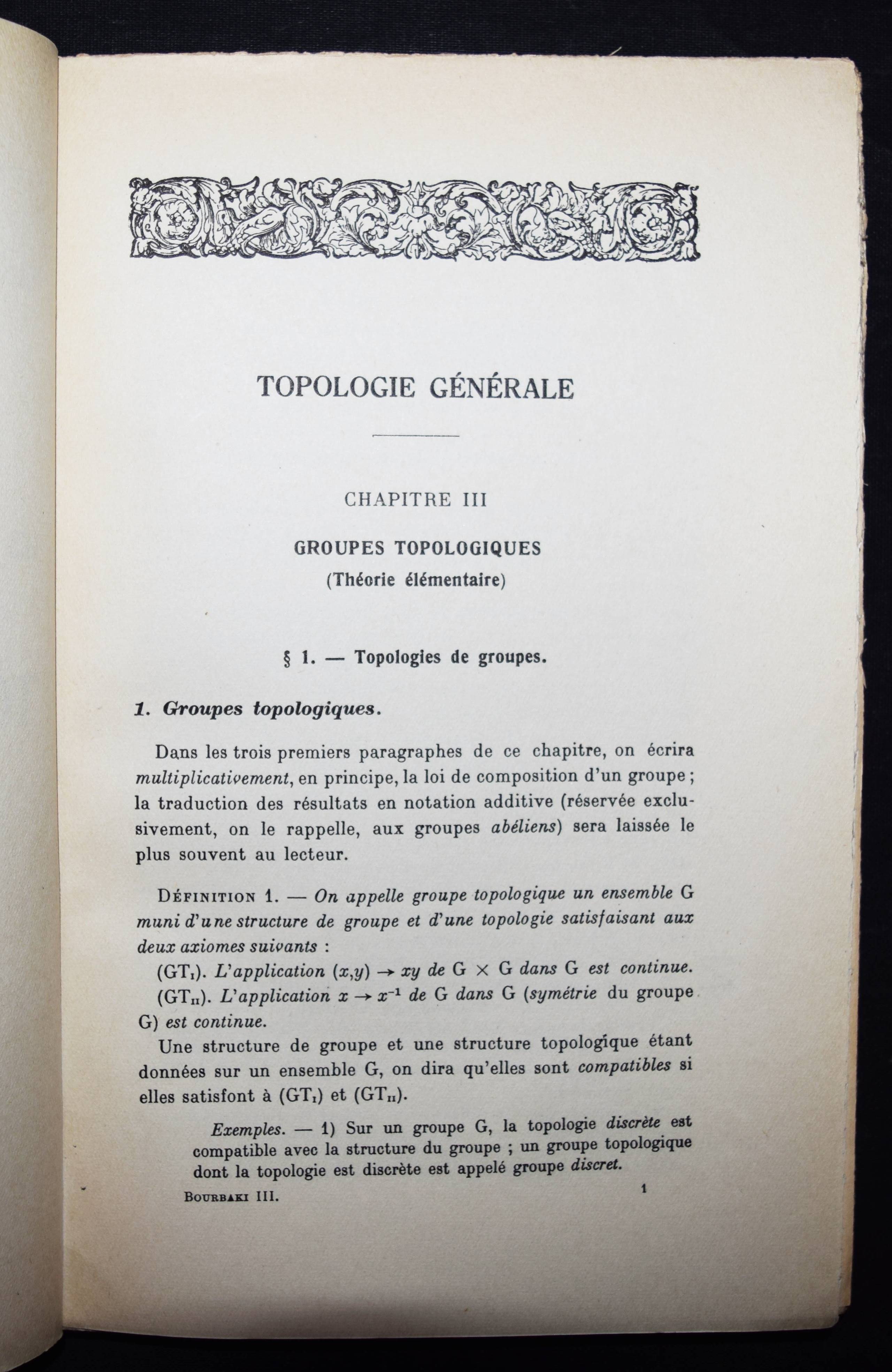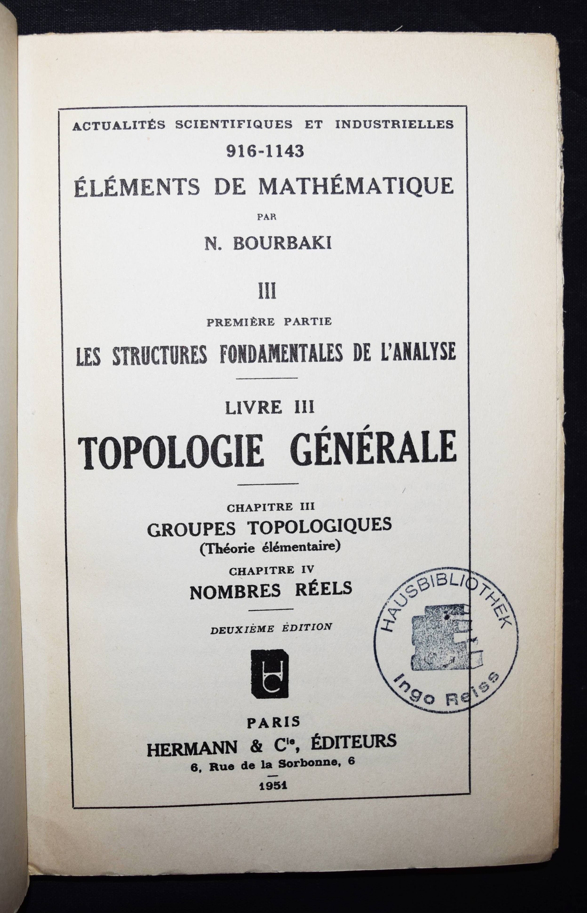 Bourbaki, N(icolas). Éléments de mathématique III. Première partie: Les structures fondamentales de l’analyse. Livre III. Groupes topologiques (théorie élémentaire). Chapitre IV nombres réels. Deuxième édition. Paris, Hermann & Cie. 1951. 8°. 158, 3 S., [3] Bl. OKart. (Actualités scientifiques et industrielles 916-1143). Gottwald, Ilgauds u. Schlote, Lexikon bedeutender Mathematiker 71 f. – N. Bourbaki „ist das Pseudonym einer in den 30er Jahren gegründeten Gruppe von überwiegend französischen Mathematikern. Zu den Gründungsmitgliedern gehörten H. Cartan, C. Chevalley, J. Dieudonné, A. Weil u.a. … Abgesehen von einigen Artikeln in den Anfangsjahren publizierte B. nur Bücher. Als „Eléments de mathematique“ erschienen seit 1939 über 40 Bücher. Ausgehend von Ideen D. Hilberts, wurden auf der Grundlage der axiomatischen Methode wichtige Teilgebiete der Mathematik behandelt… B.s Bücher haben die Entwicklung wichtiger mathematischer Gebiete wesentlich beeinflußt… Die Bücher wenden sich an den forschenden Mathematiker, nicht an den Studenten…“ (K.-H. Schlote). – Rückendeckel mit kl. Randeinriss, N.a.V., St.a.T., gutes sauberes Exemplar.