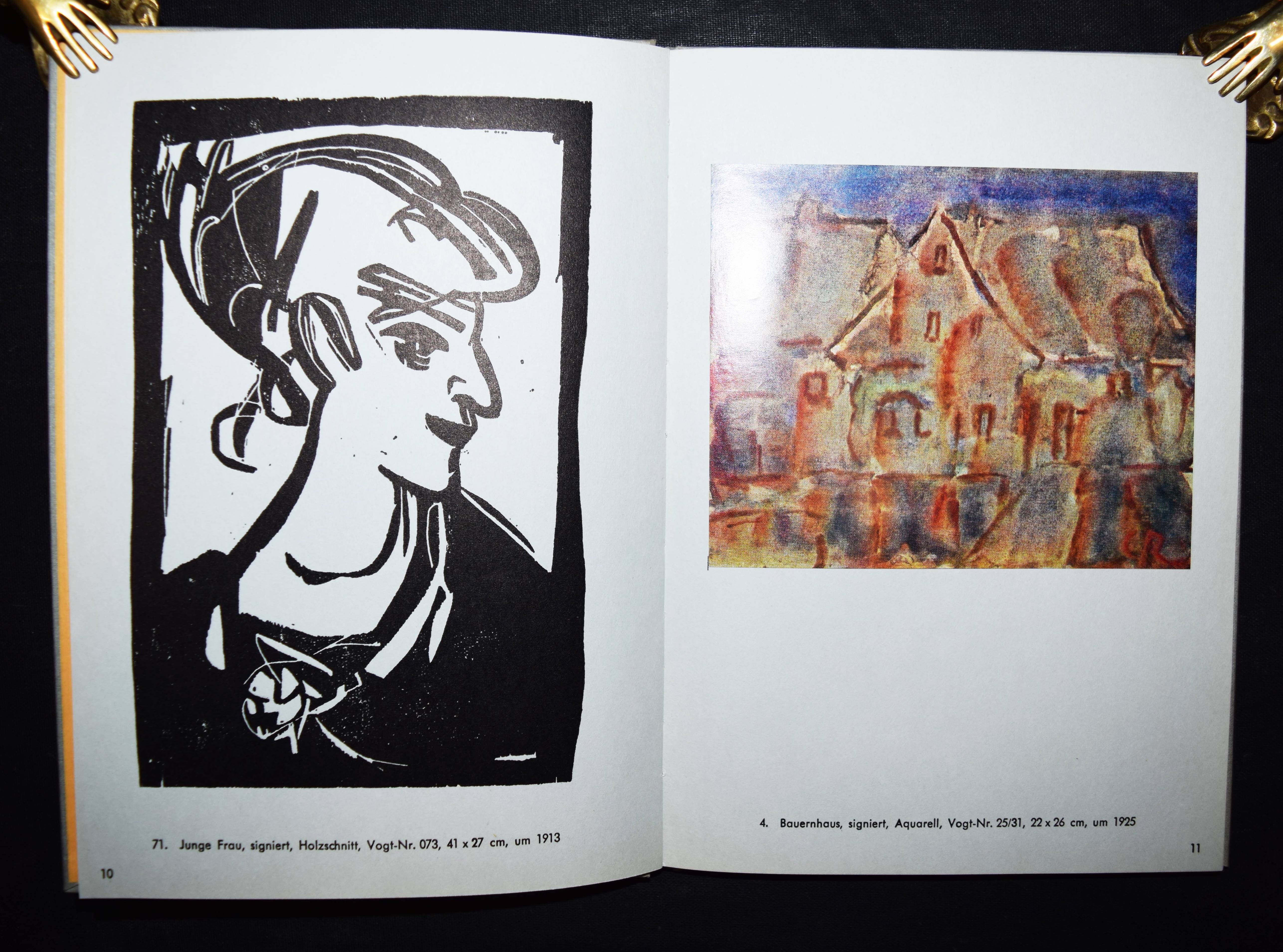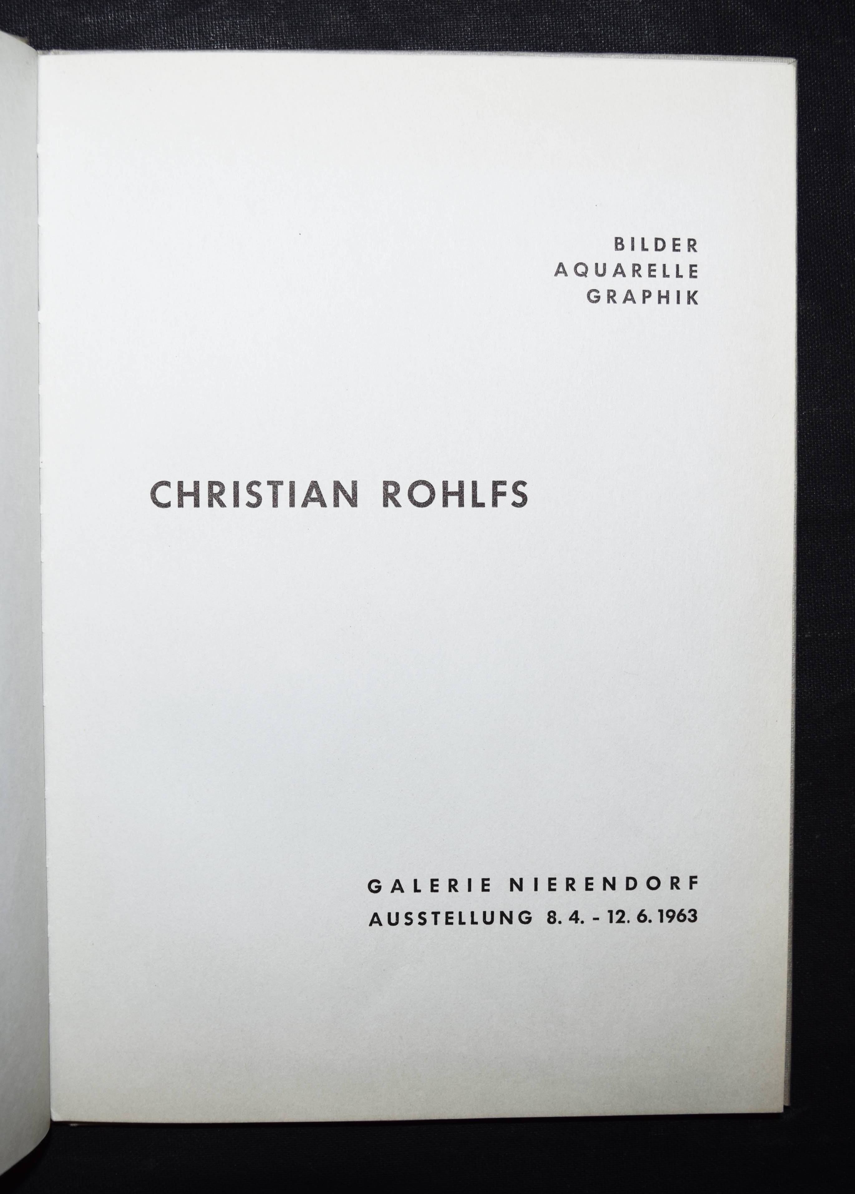 Rohlfs, Christian. Bilder, Aquarelle, Graphik. (Katalog zur) Ausstellung der Galerie Nierendorf 8. 4. – 12. 6. 1963. (Einführung von Paul Vogt und einem Text von Florian Karsch). (Berlin), Galerie Nierendorf 1963. 8°. 40 S. mit zahlr. teils farbigen und mont. Abb. sowie 1 Original-Holzschnitt. OPbd. mit montierter Deckelillustration. Vogt 87. – Eines von 1500 Exemplaren des vierten Sonderkatalogs der Galerie Nierendorf. Mit dem vom Originalholzstock gedruckten Holzschnitt „Kleines Paar“ auf Japan. – Tadellos.