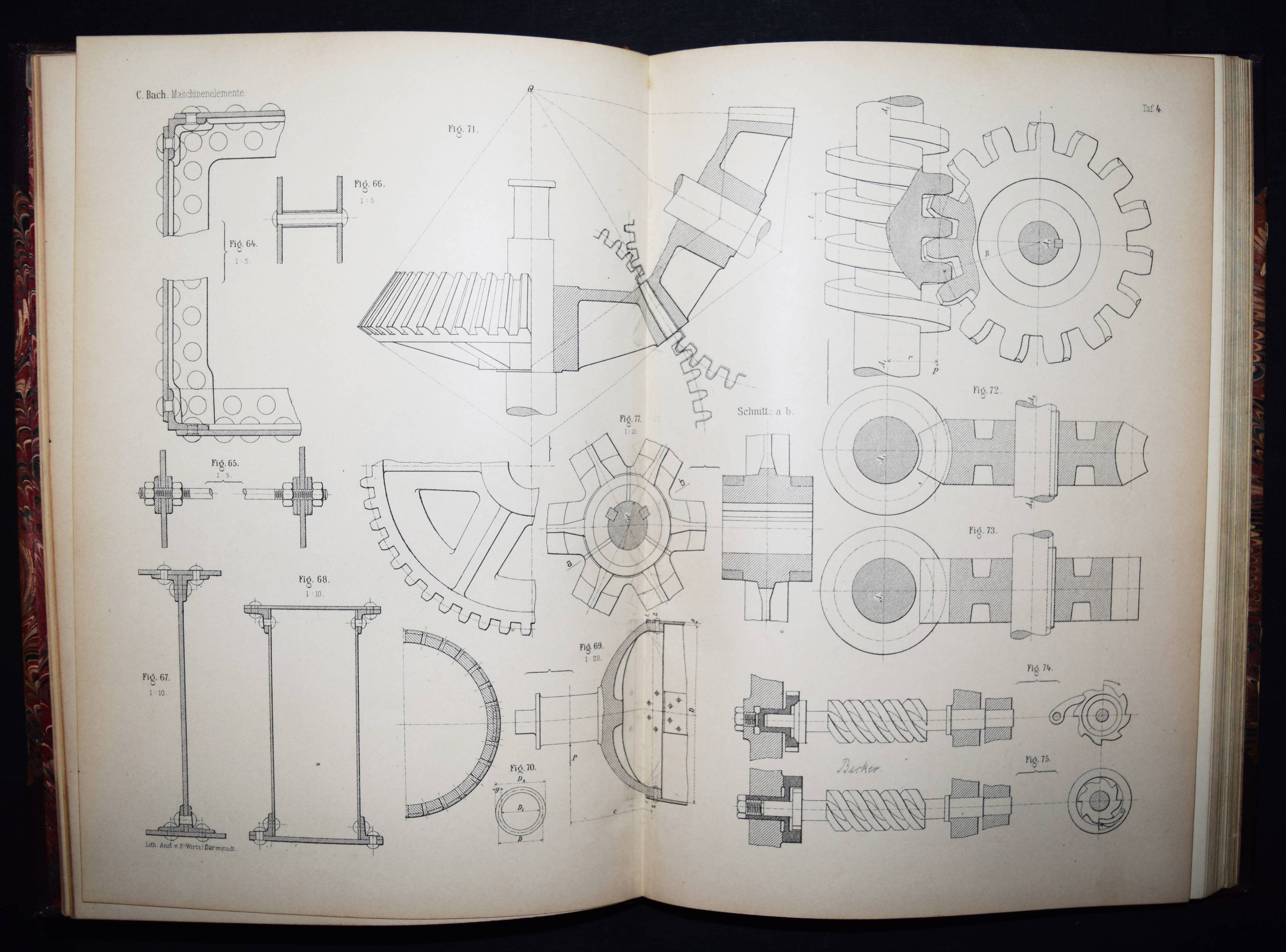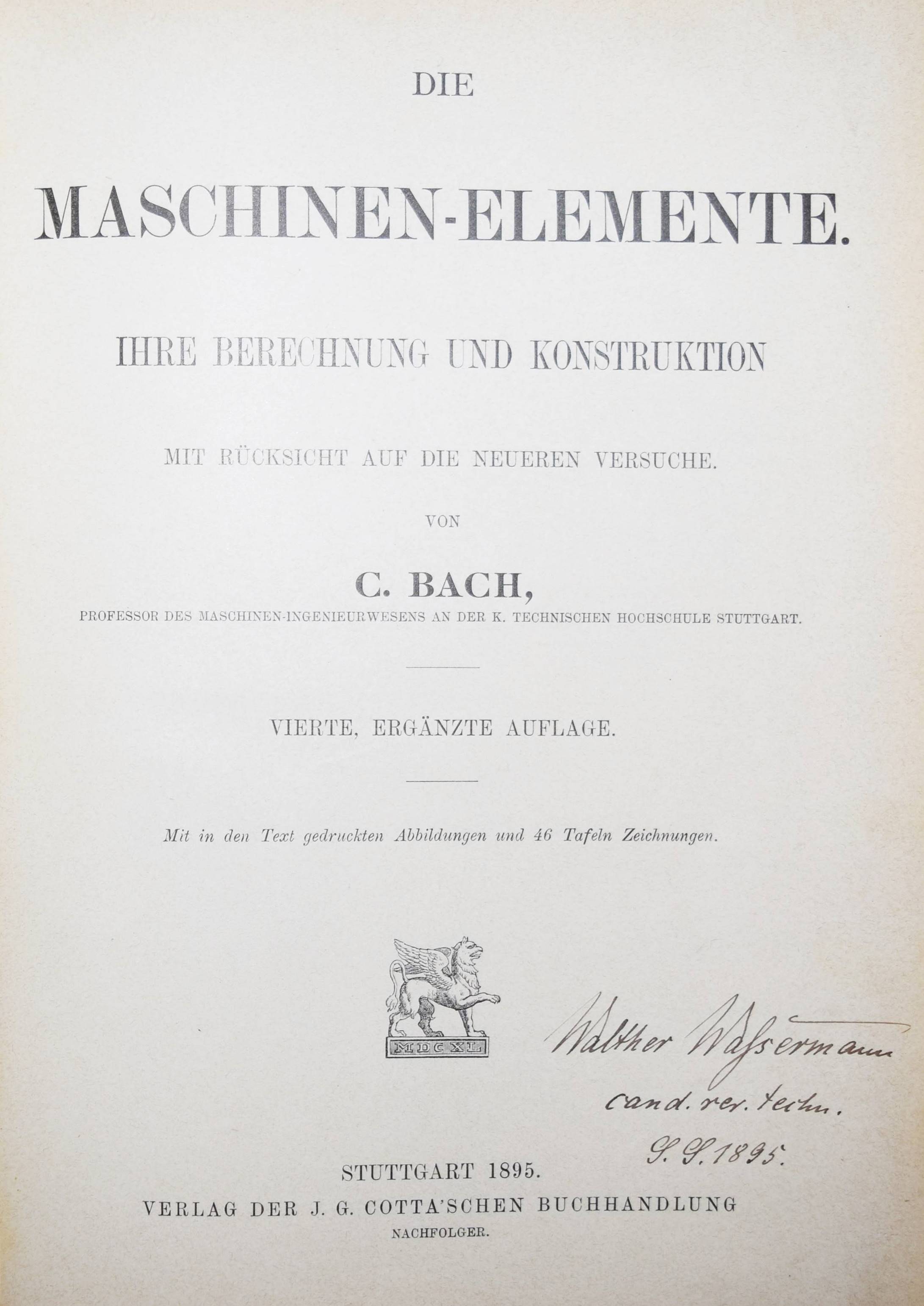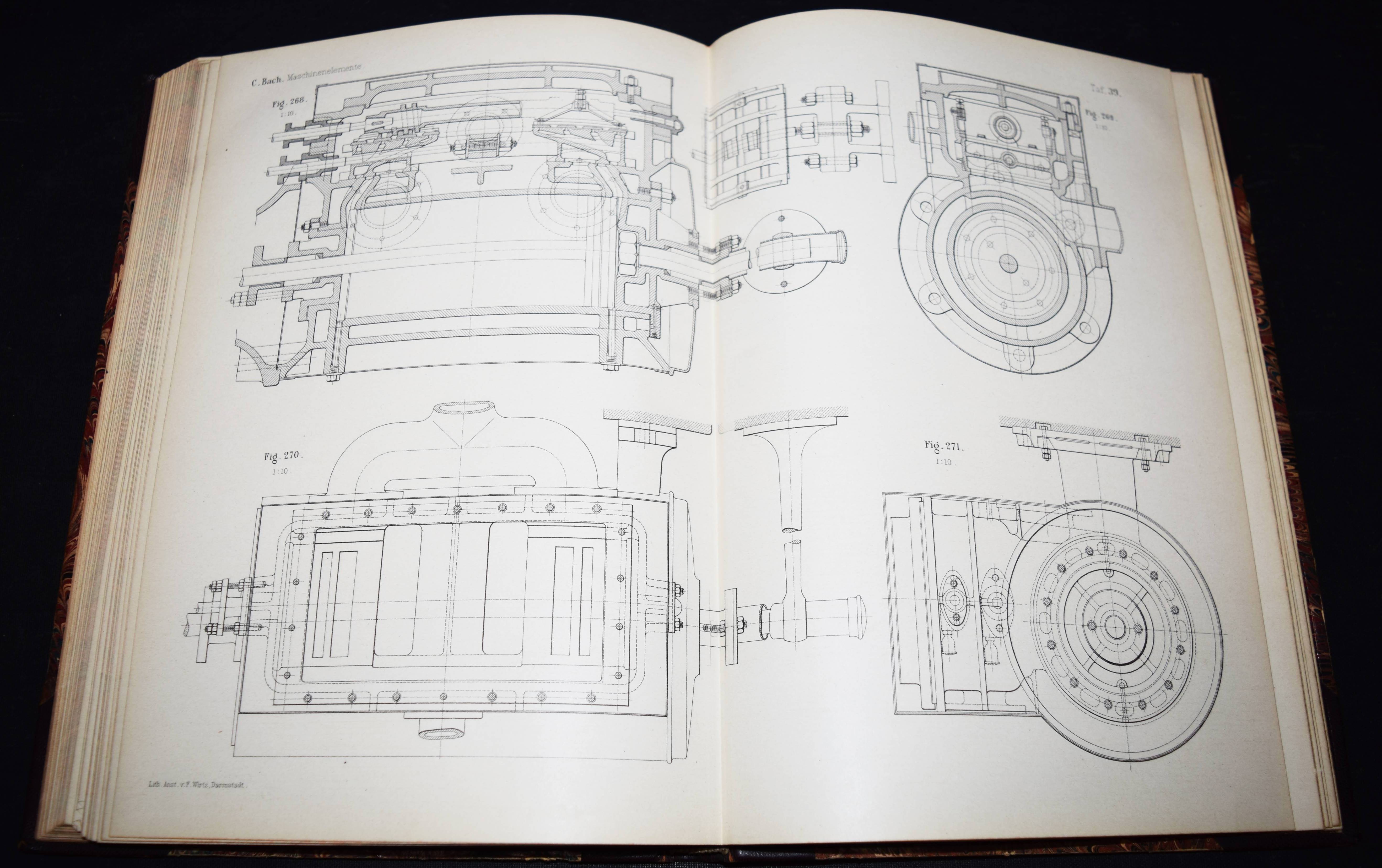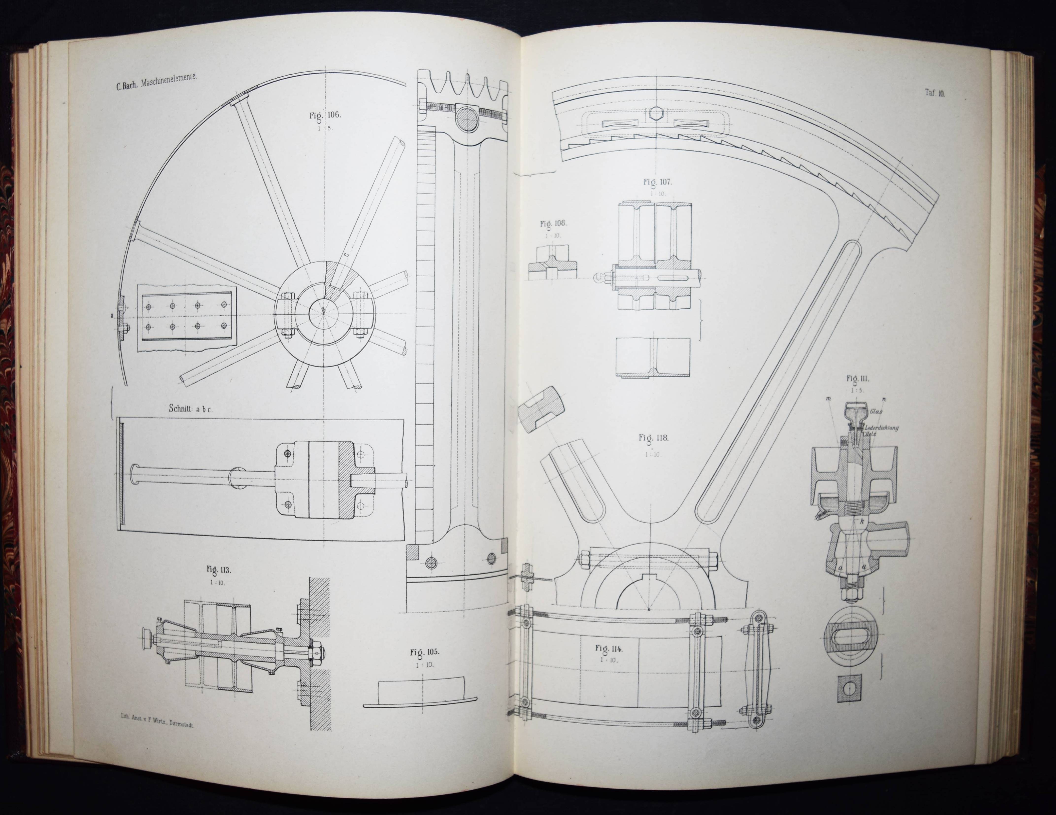 Bach, C(arl). Die Maschinen-Elemente. I. Text. – II. Tafeln. 4., ergänzte Aufl. 2 Bände. Leipzig, Cotta 1895. Gr.-8°. XVI, 629, (1) S. mit 411 Textabb. u. 23 Tabellen; Titel, 46 doppelblattgr. lithogr. Tafeln. OHldr. mit goldgepr. Rückentiteln u. Rückenverg. N. a. V., Rücken gering berieben, sonst gutes sauberes Exemplar.