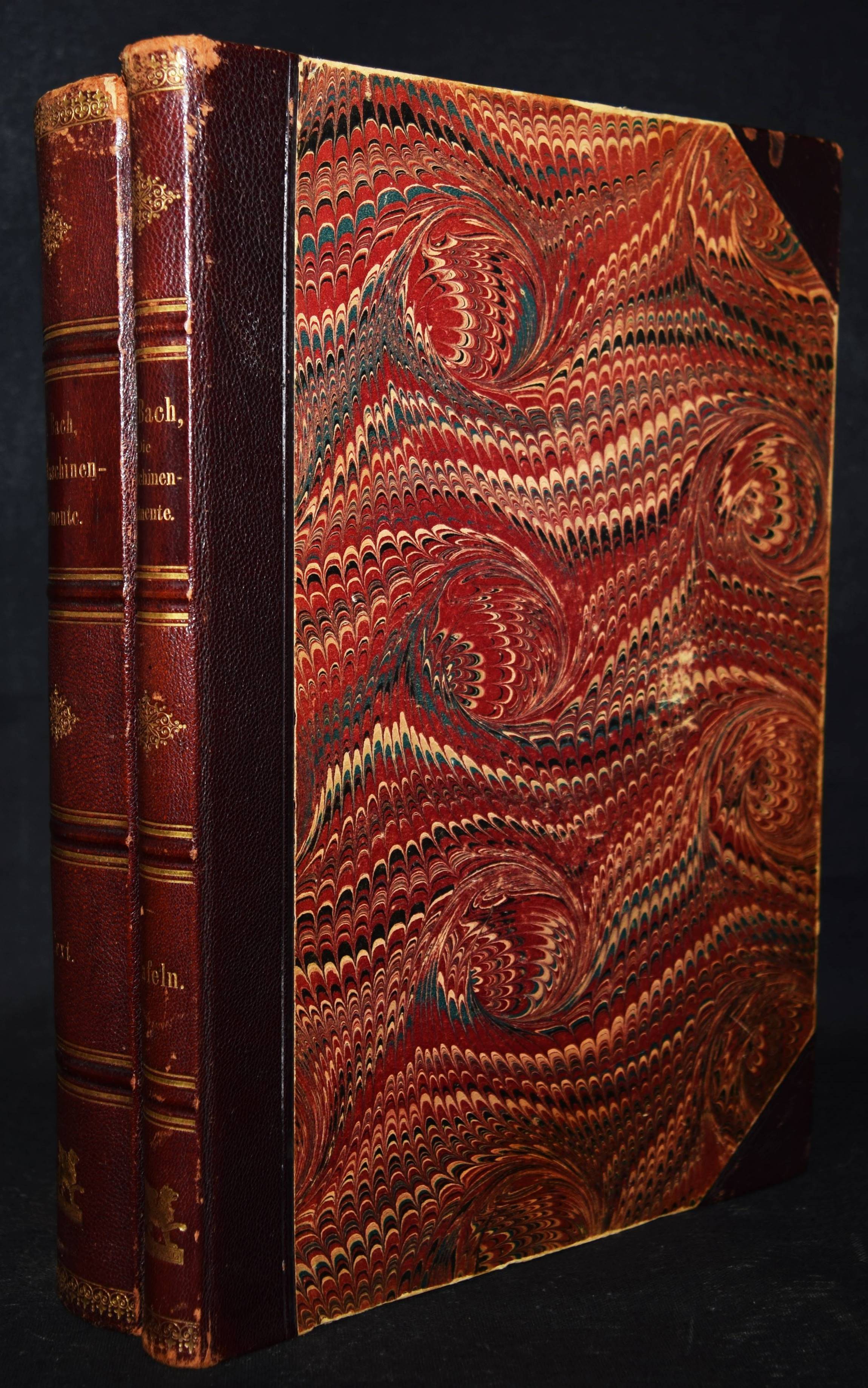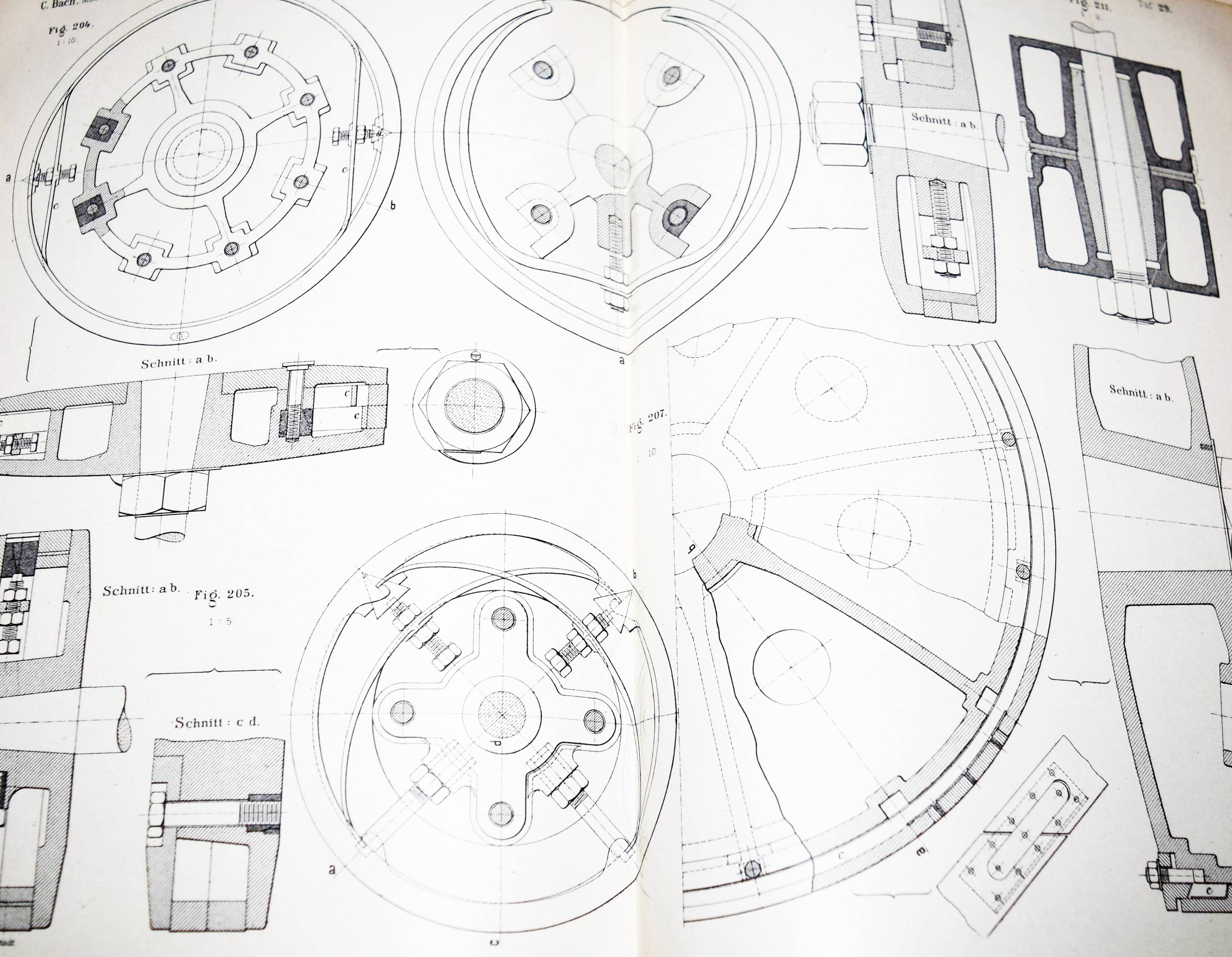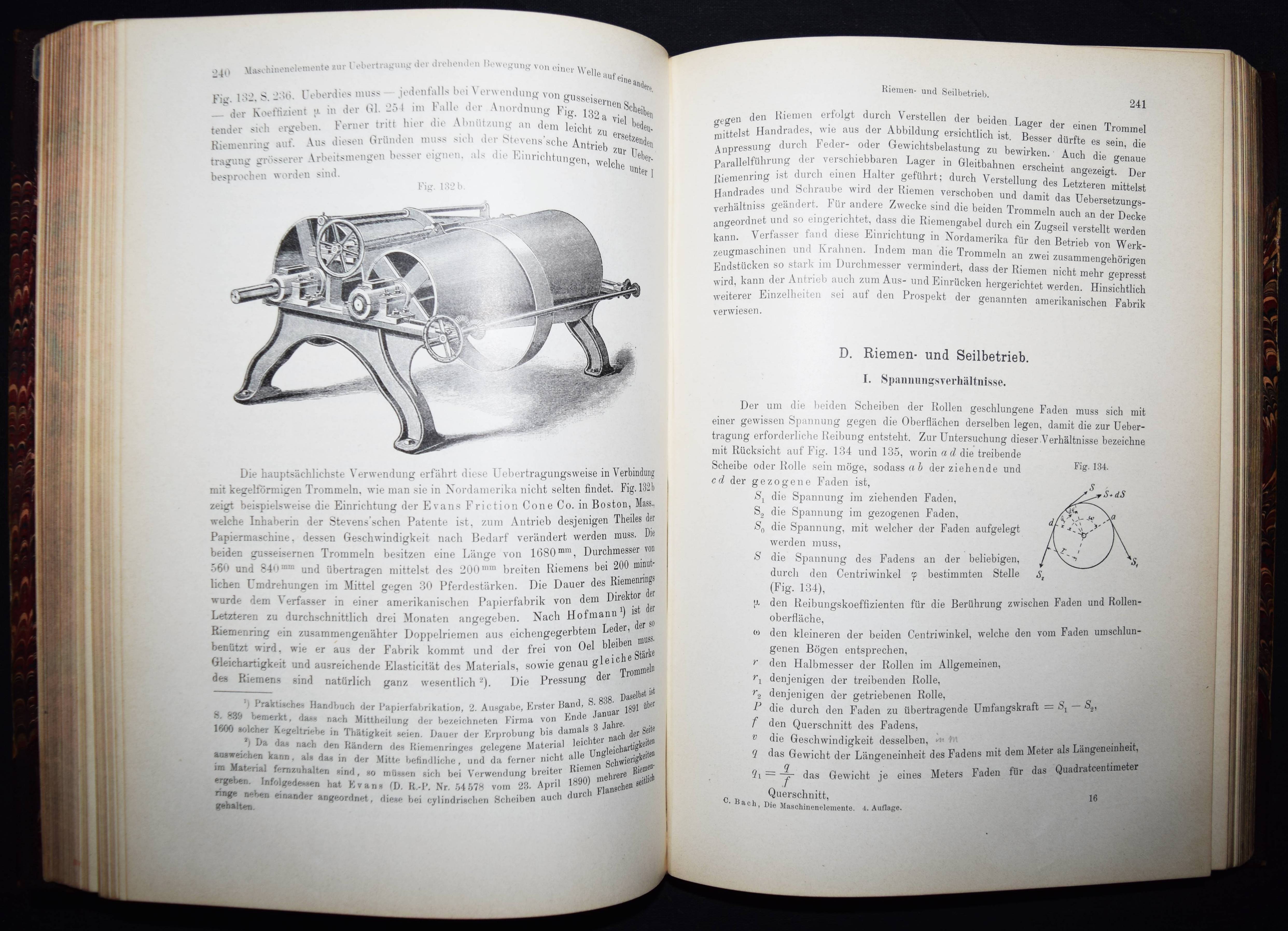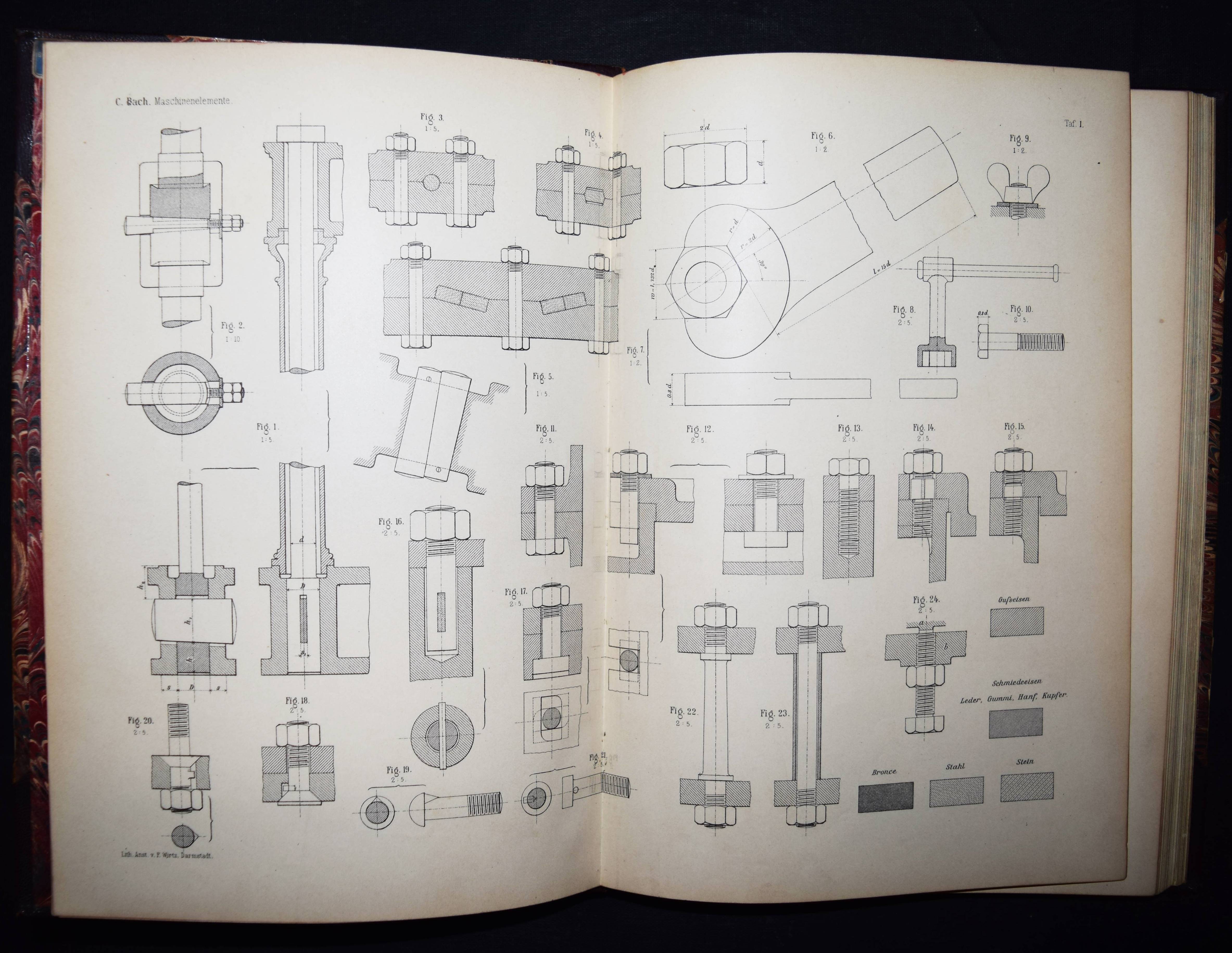 Bach, C(arl). Die Maschinen-Elemente. I. Text. – II. Tafeln. 4., ergänzte Aufl. 2 Bände. Leipzig, Cotta 1895. Gr.-8°. XVI, 629, (1) S. mit 411 Textabb. u. 23 Tabellen; Titel, 46 doppelblattgr. lithogr. Tafeln. OHldr. mit goldgepr. Rückentiteln u. Rückenverg. N. a. V., Rücken gering berieben, sonst gutes sauberes Exemplar.