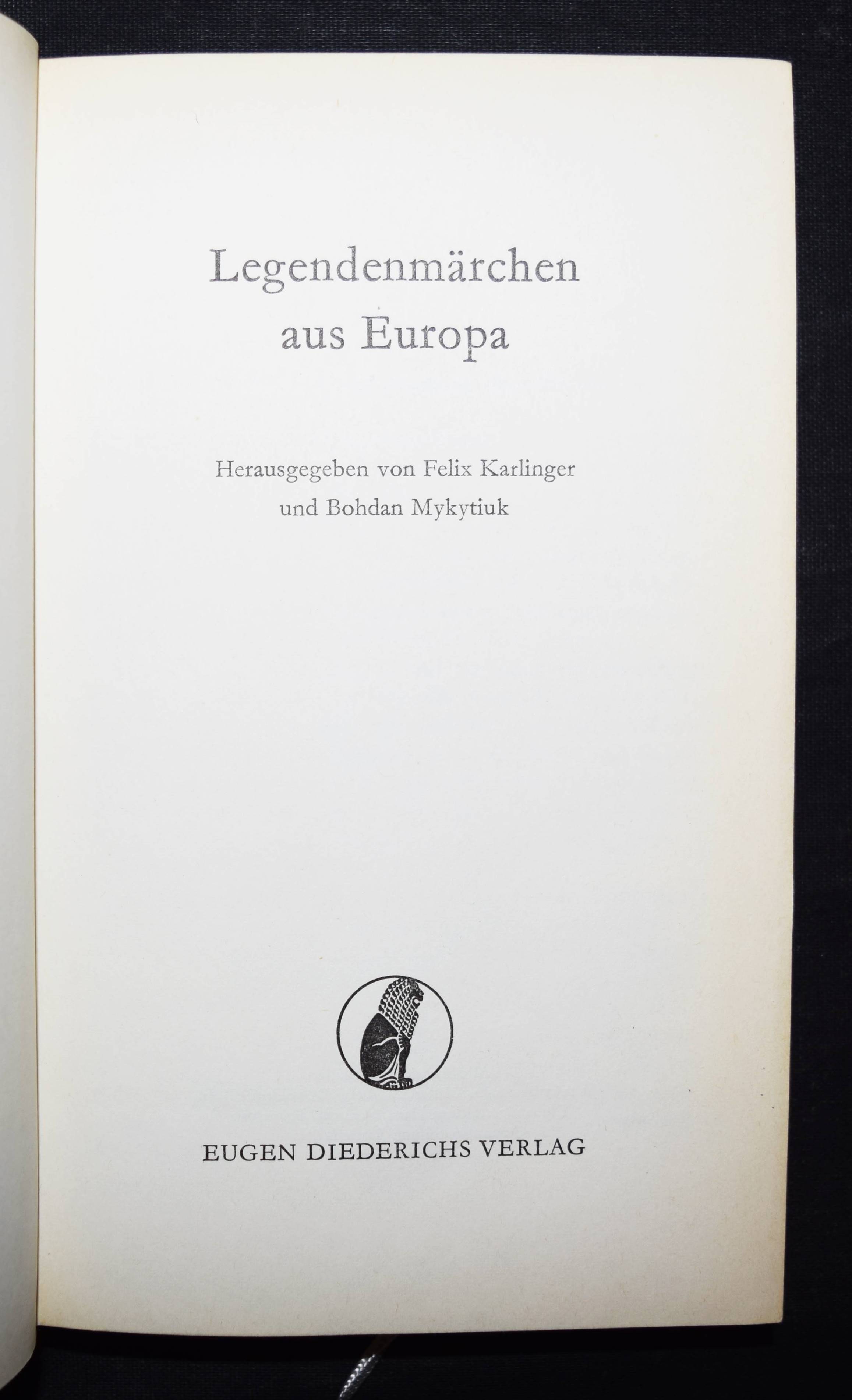 Karlinger, Felix u. Bohdan Mykytiuk (Hrsg.). Legendenmärchen aus Europa. (Düsseldorf, Köln), Diederichs 1967. 8°. 311, (1) S. Dunkelroter Orig.-Ldr. mit goldgepr. Rückentitel, Rückenverg. u. Kopfgoldschnitt. Erste Ausgabe. – Sehr gutes Exemplar der schönen Lederausgabe.