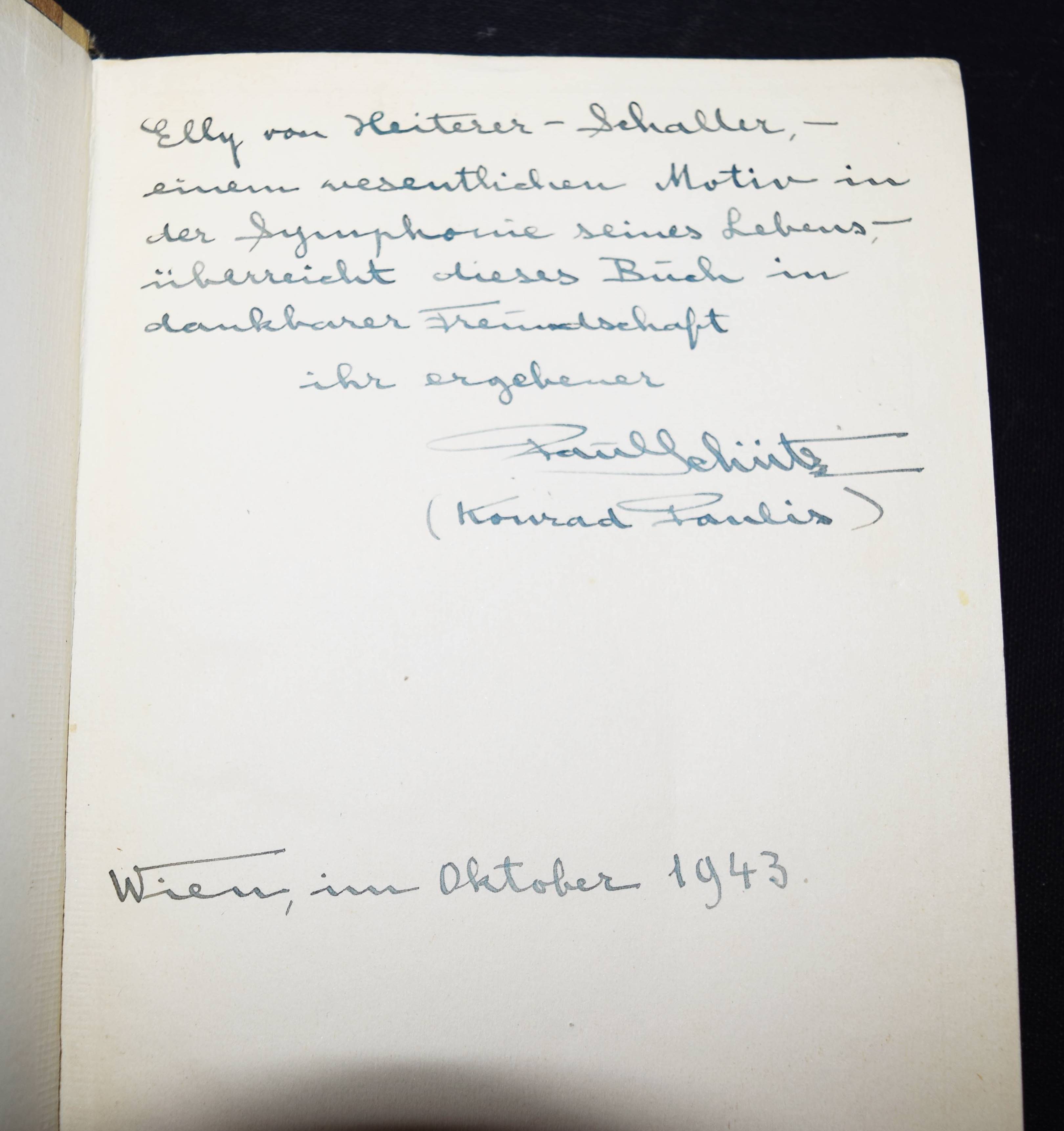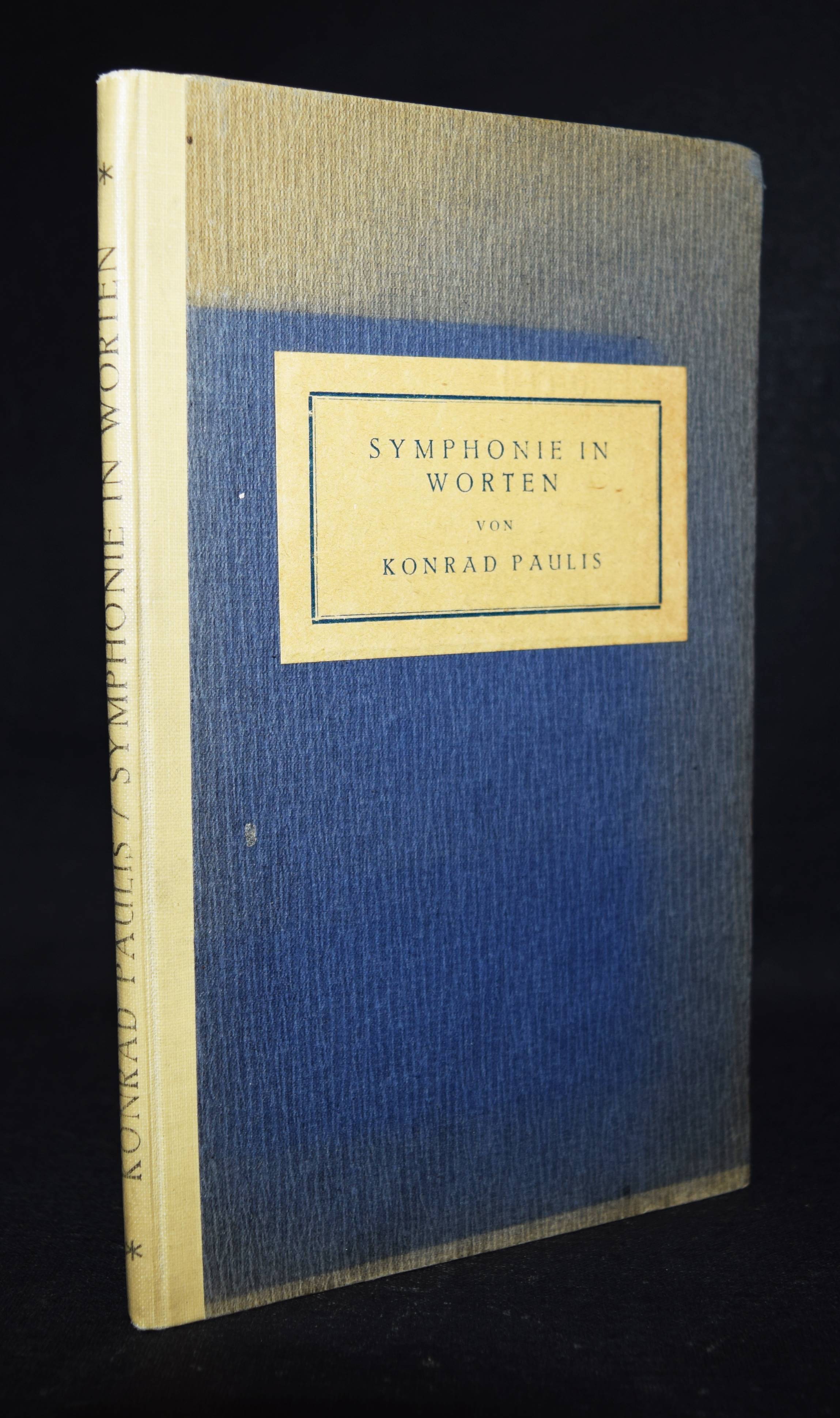 Paulis, Konrad (d. i. Paul J. Schütz). Symphonie in Worten. Wien, Amalthea-Verlag o. J. (1925). 8°. 59 S. OHln. mit Deckelschild. Erste Ausgabe. – Mit eigenh. Widmung von P. Schütz, „Elly von Heiterer-Schaller – einem wesentlichen Motiv in der Symphonie seines Lebens – überreicht dieses Buch in dankbarer Freundschaft … Wien, im Oktober 1943“. – „Eine Symphonie – in Worten! Die Übertragung der Musik, ihres Wesens und ihrer Formen, in unsere Sprache. Eine eigenwillige, durchaus neuartige Dichtung im Sinne der Lebensbejahung, im Dienste der Menschheit, im Namen des Friedens“ (beil. Orig.-Bauchbinde, linke Schlaufe abgerissen). – P. J. Schütz (1891-1955) war Direktor der „Ersten österreichischen Spar-Casse“. Sein Engagement als Kunstförderer trug ihm die Ernennung zum Ehrenmitglied der Akademie der bildenden Künste ein. Er war der ältere Bruder des Wiener Komponisten und Pianisten Otto Heinrich Schütz (1901-1981). – Deckel etwas lichtrandig, sonst gut erhalten.
