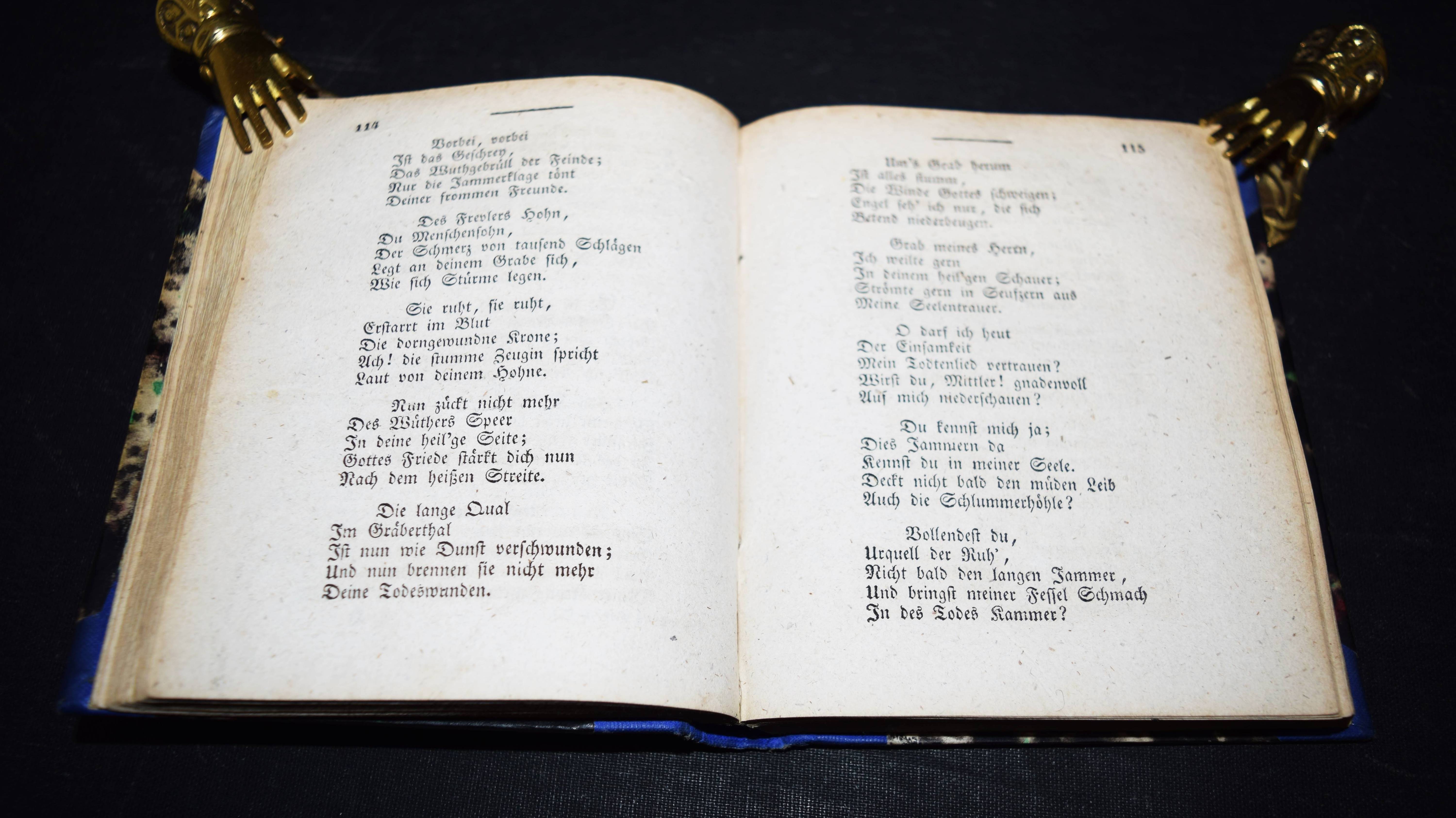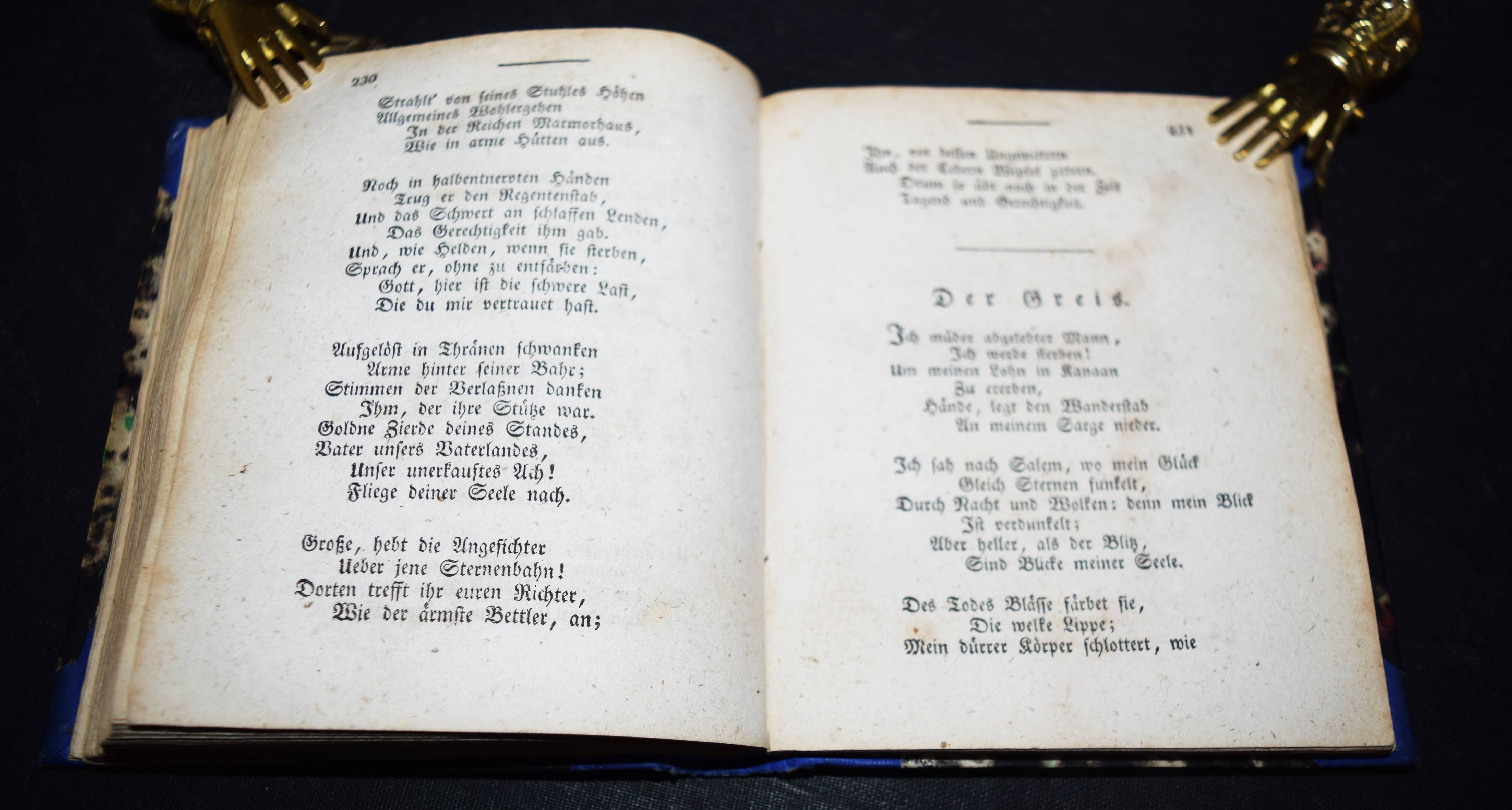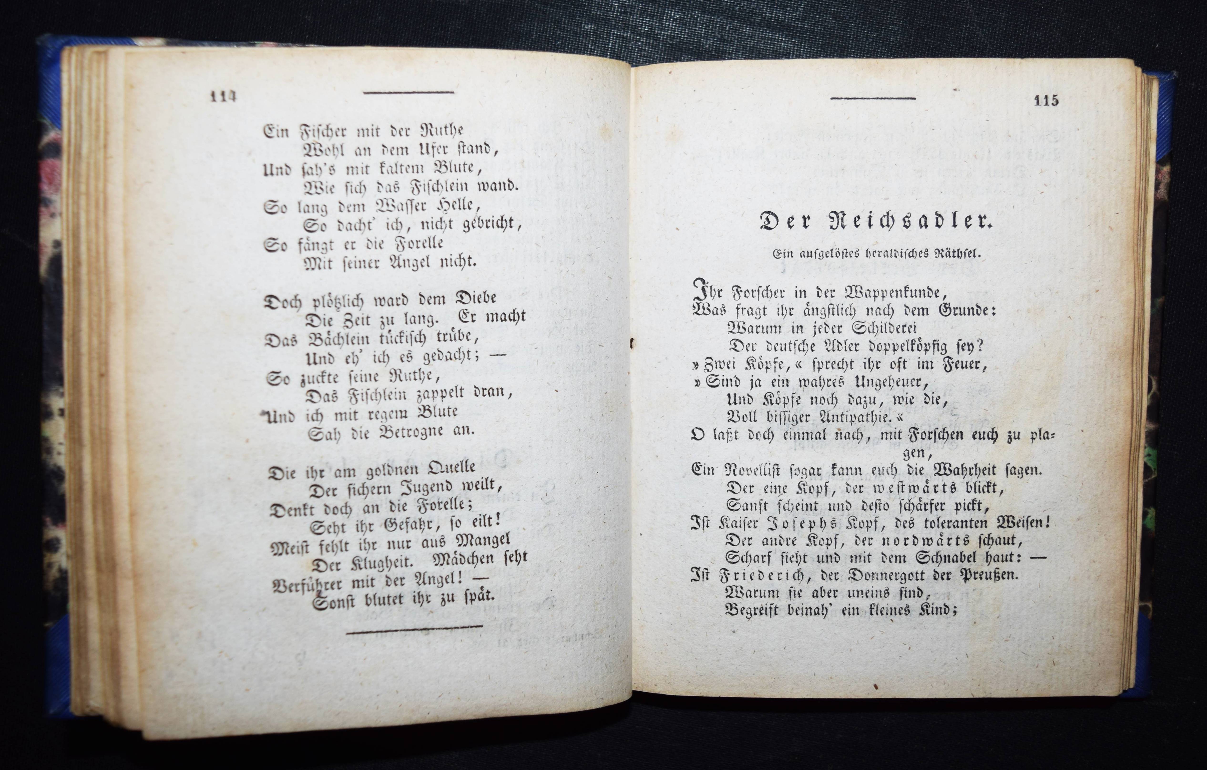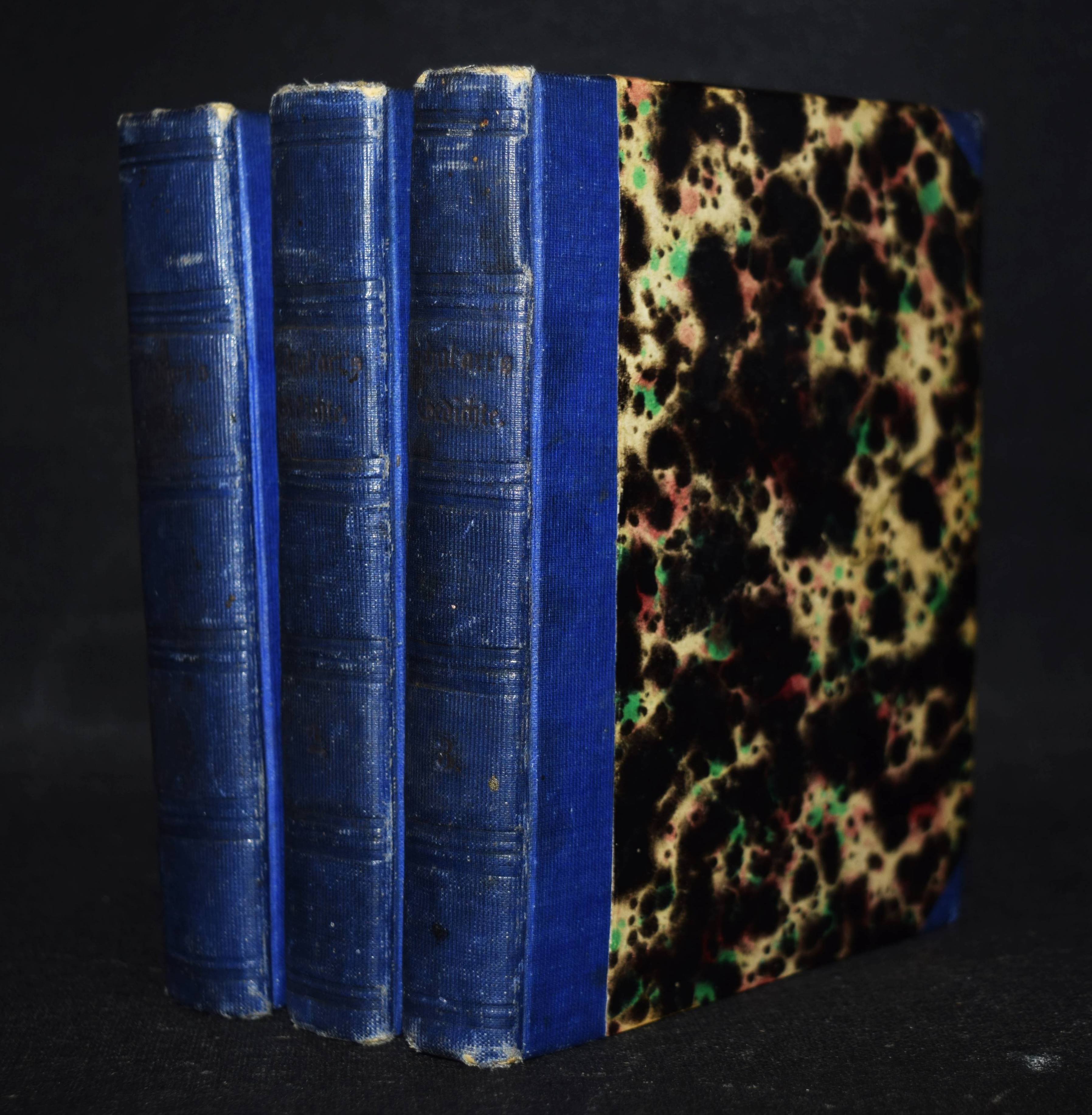 Schubart, Christian Friedrich Daniel. Sämmtliche Gedichte. 3 Bände. Frankfurt a. M., Hermann 1825. Kl.-8°. XVI, 336 S.; XVI, 336 S.; XII, 308 S. Etwas spätere Hln. Slg. Borst 512. Goed. IV, 877, 494 a. W.-G.² 85. – Erste vollst. Gesamtausgabe der Gedichte. – Erweiterte Ausgabe der 1802 von Schubarts Sohn besorgten Auswahl. – Rückenverg. oxidiert oder abgesplittert, stellenweise leicht braunfleckig, der dritte Band durchgehend etwas wasserrandig, gutes Exemplar.