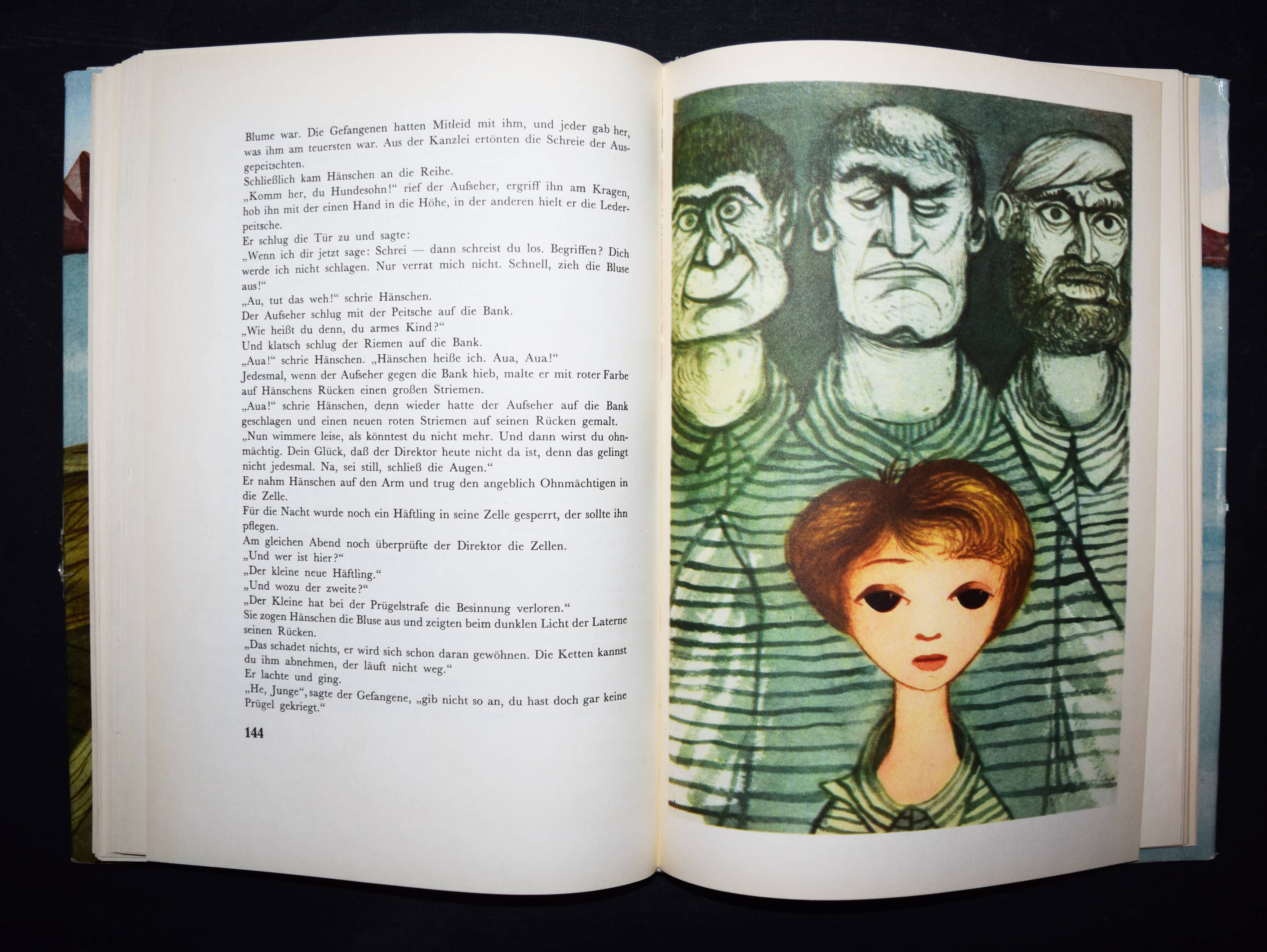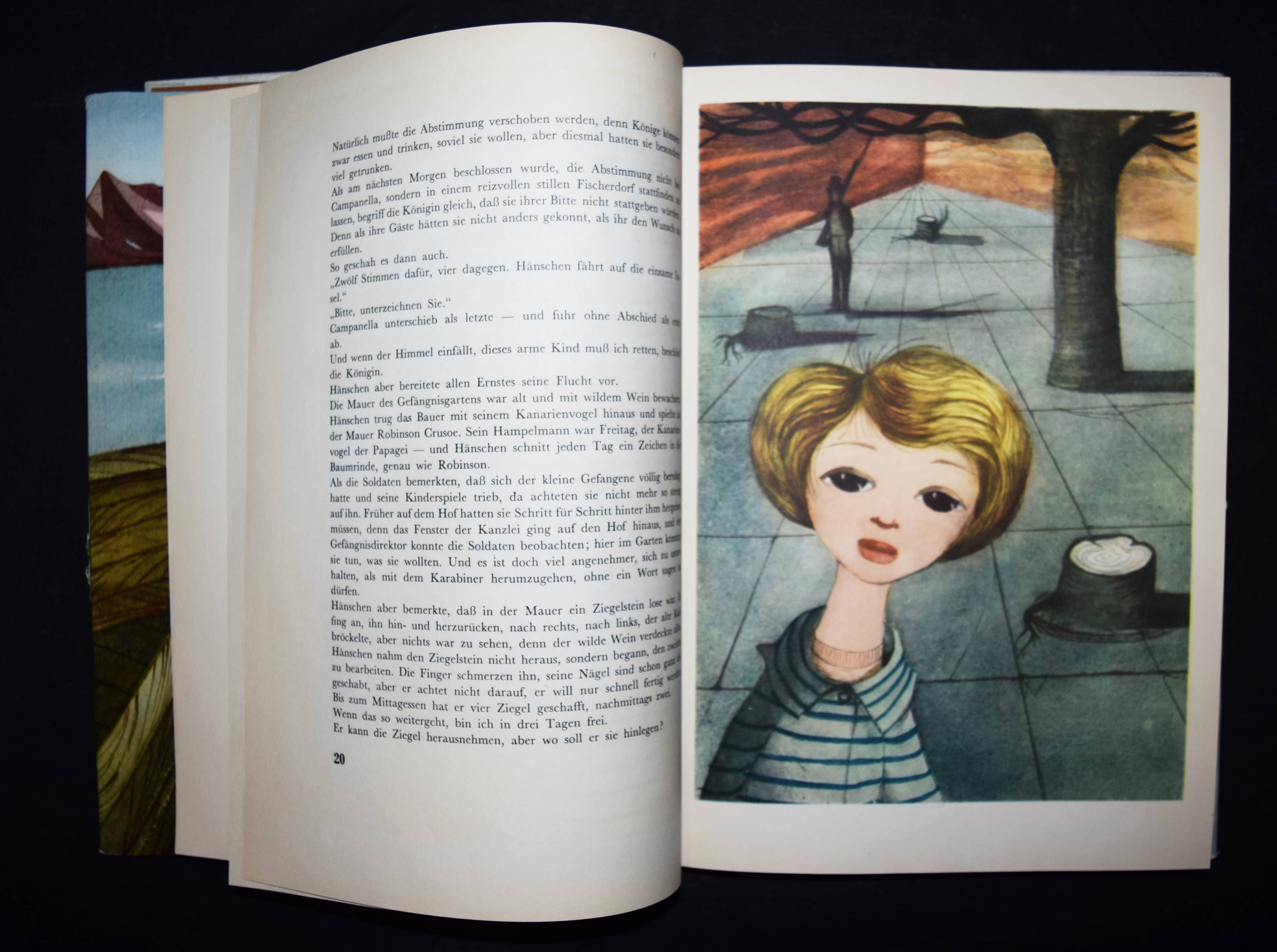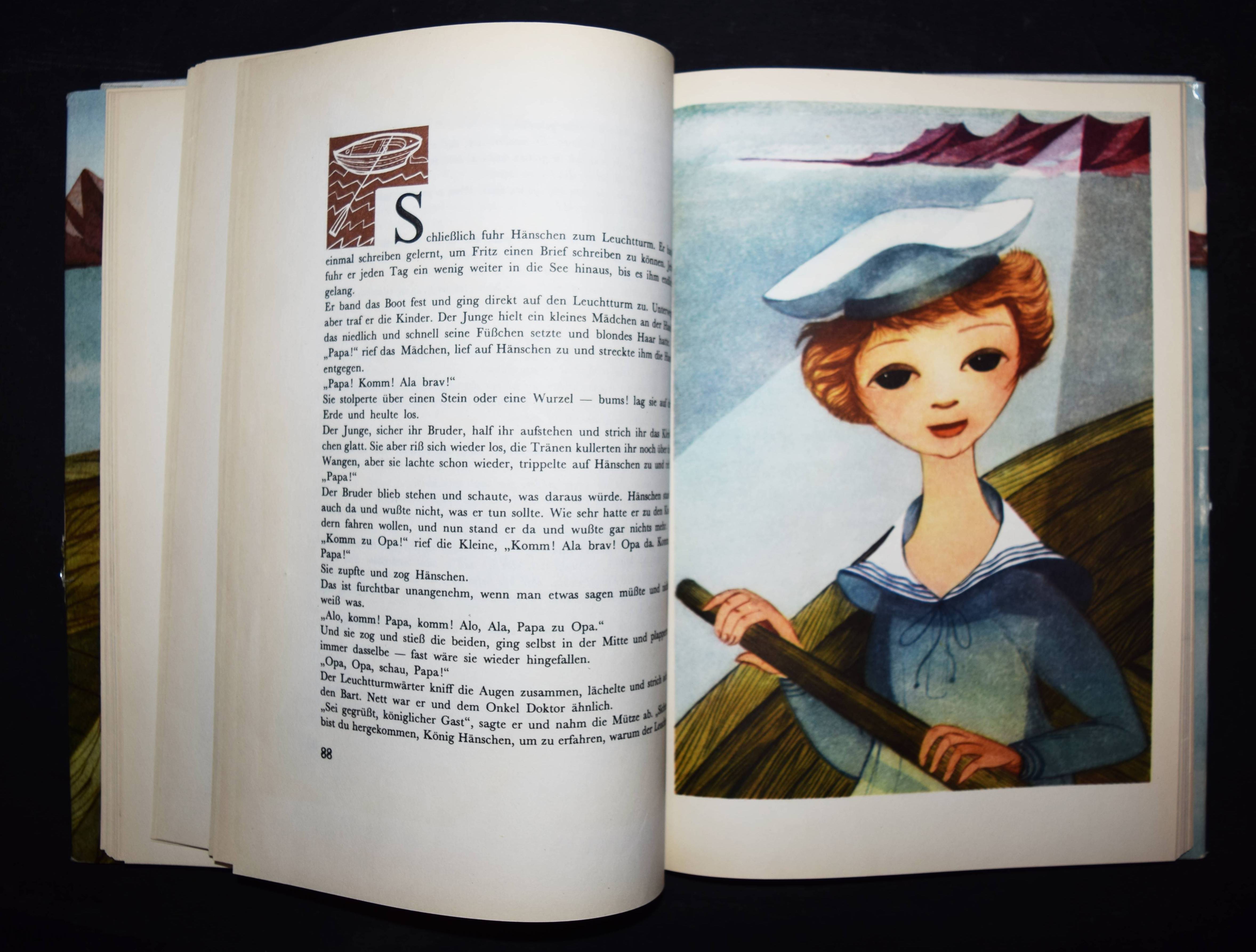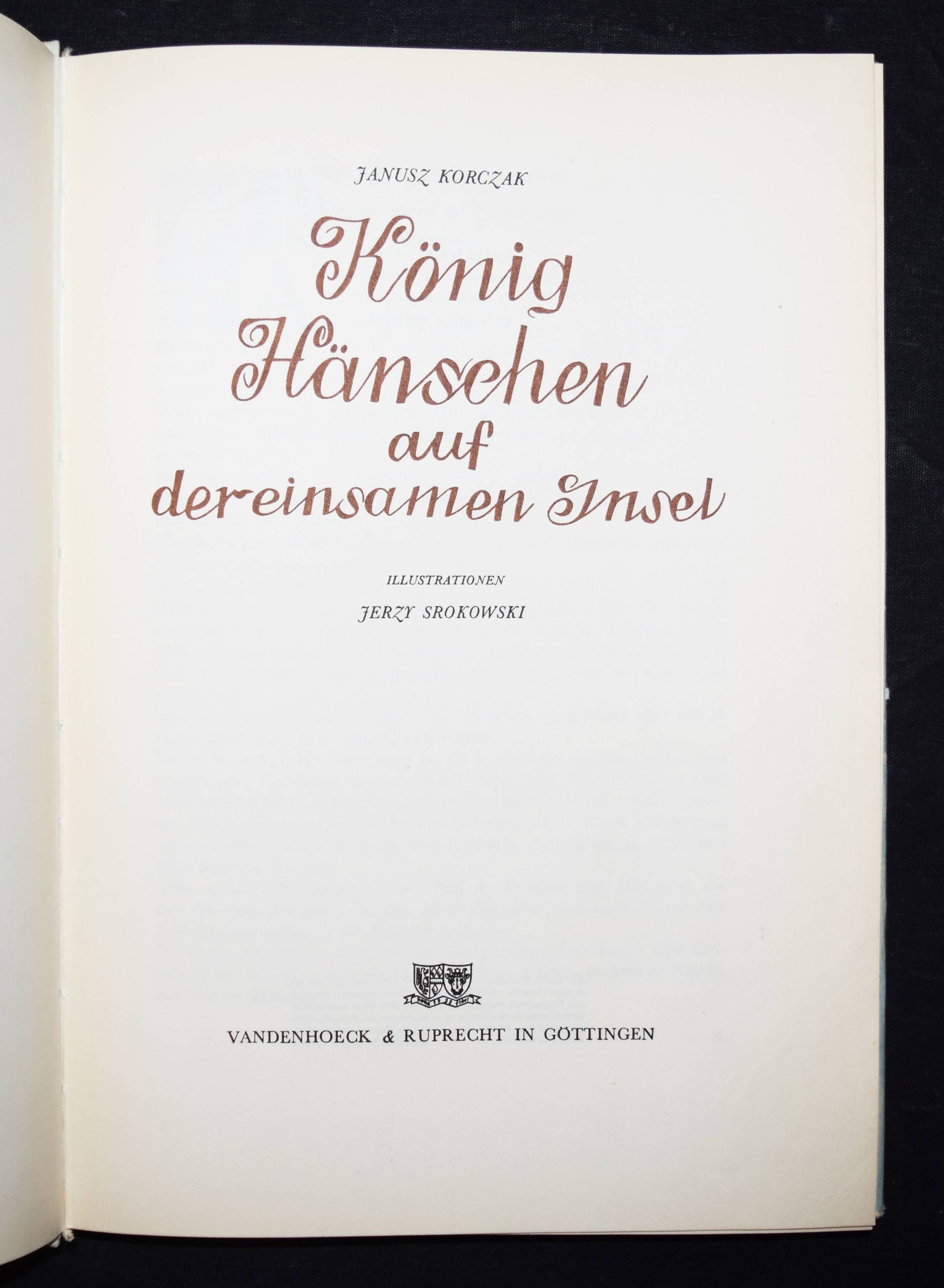 Korczak, Janusz (d.i. Henryk Goldszmit). König Hänschen auf der einsamen Insel. (Deutsch von Katja Weintraub überarbeitet von Klaus Staemmler. Mit einem Nachwort von Elisabeth Heimpel). Göttingen, Vandenhoeck & Ruprecht (1971). 4°. 185, (3) S. mit 7 Farbtafeln von Jerzy Srokowski. OLn. mit goldgepr. Deckelvignette u. farbig illustr. OU. LKJ II, 245 u. III, 70. Klotz 3630/4. – Erste deutsche Ausgabe. – Die polnische Originalausgabe erschien 1928. – Schutzumschlag mit wenigen kleinen Einrissen im oberen Rand, gutes Exemplar.