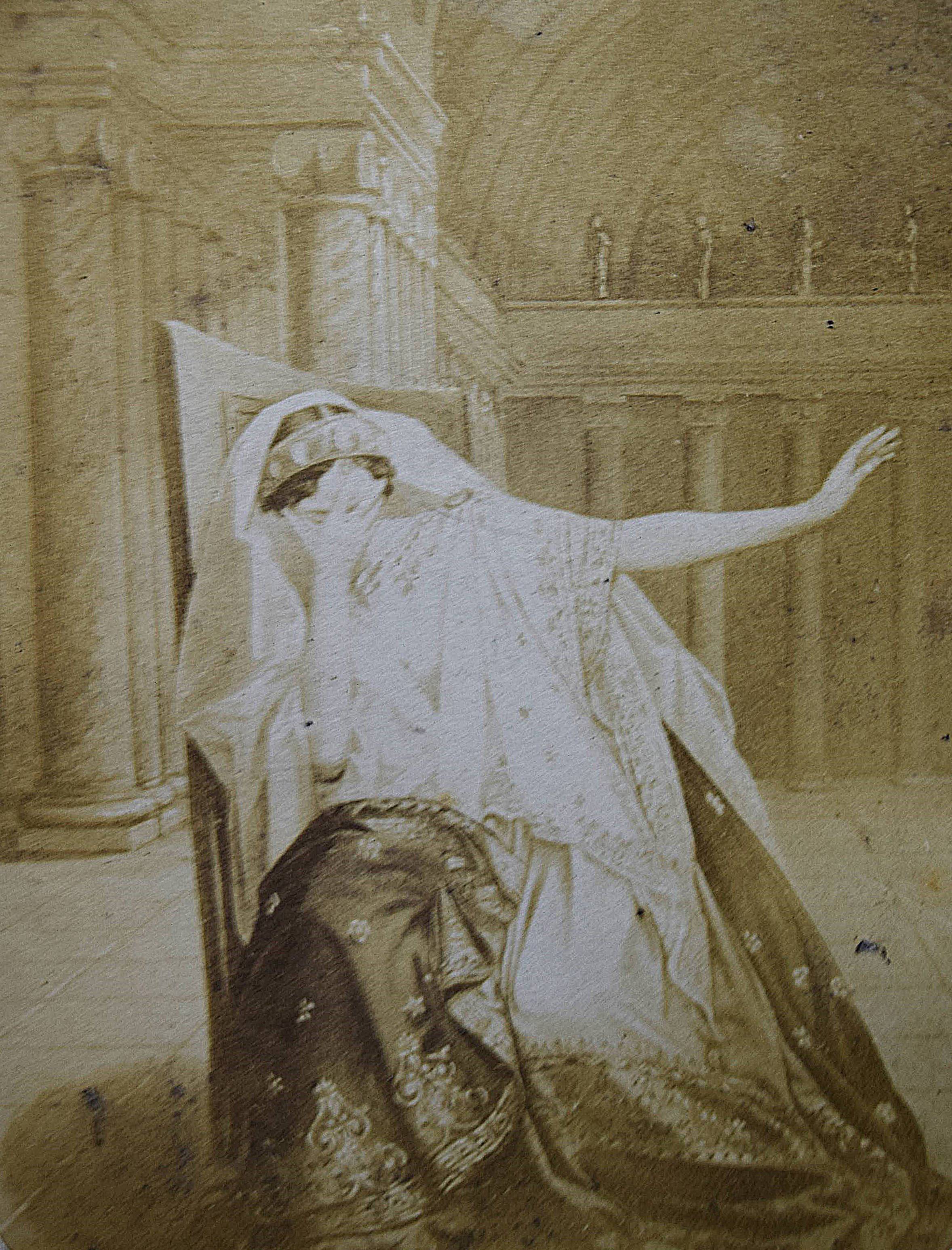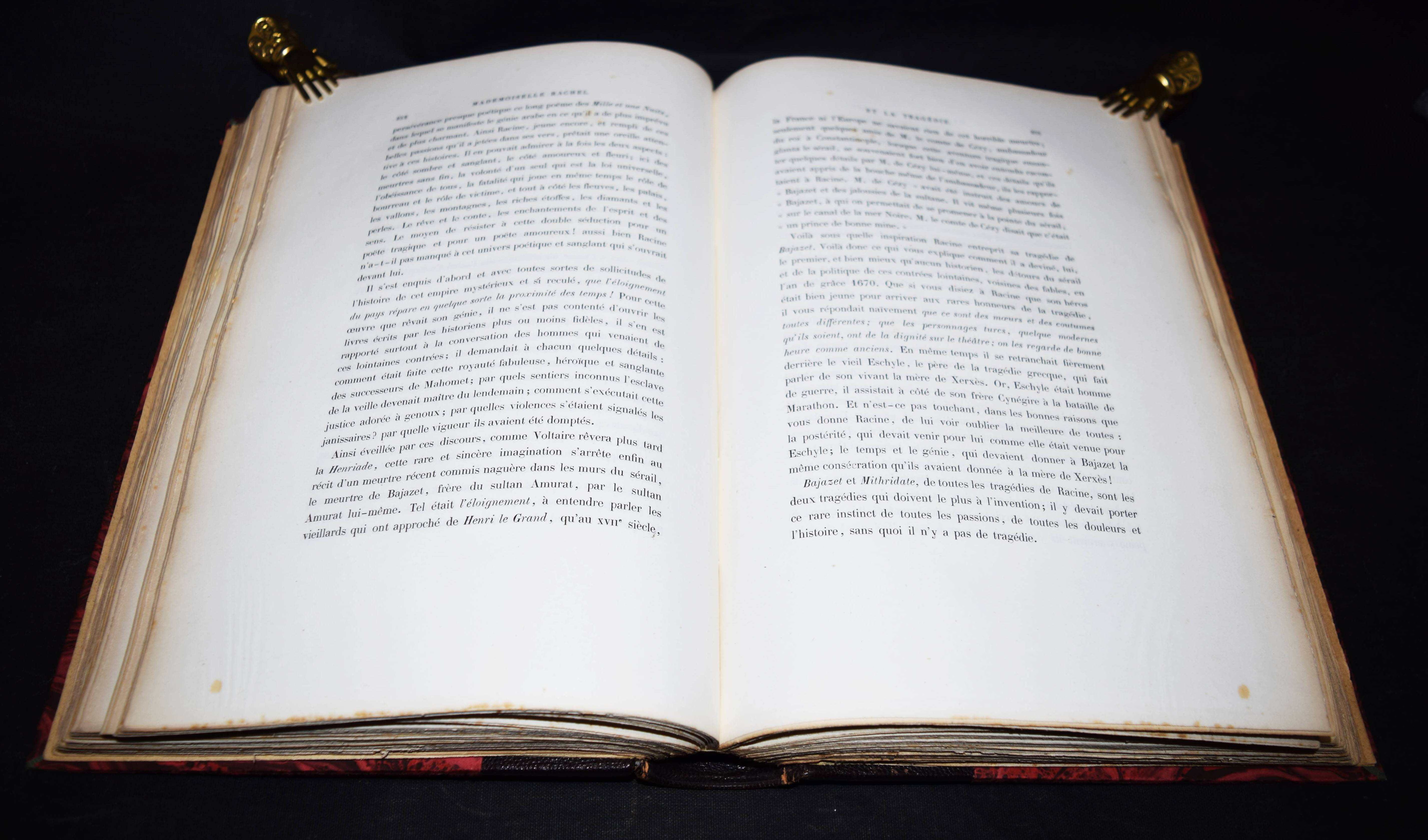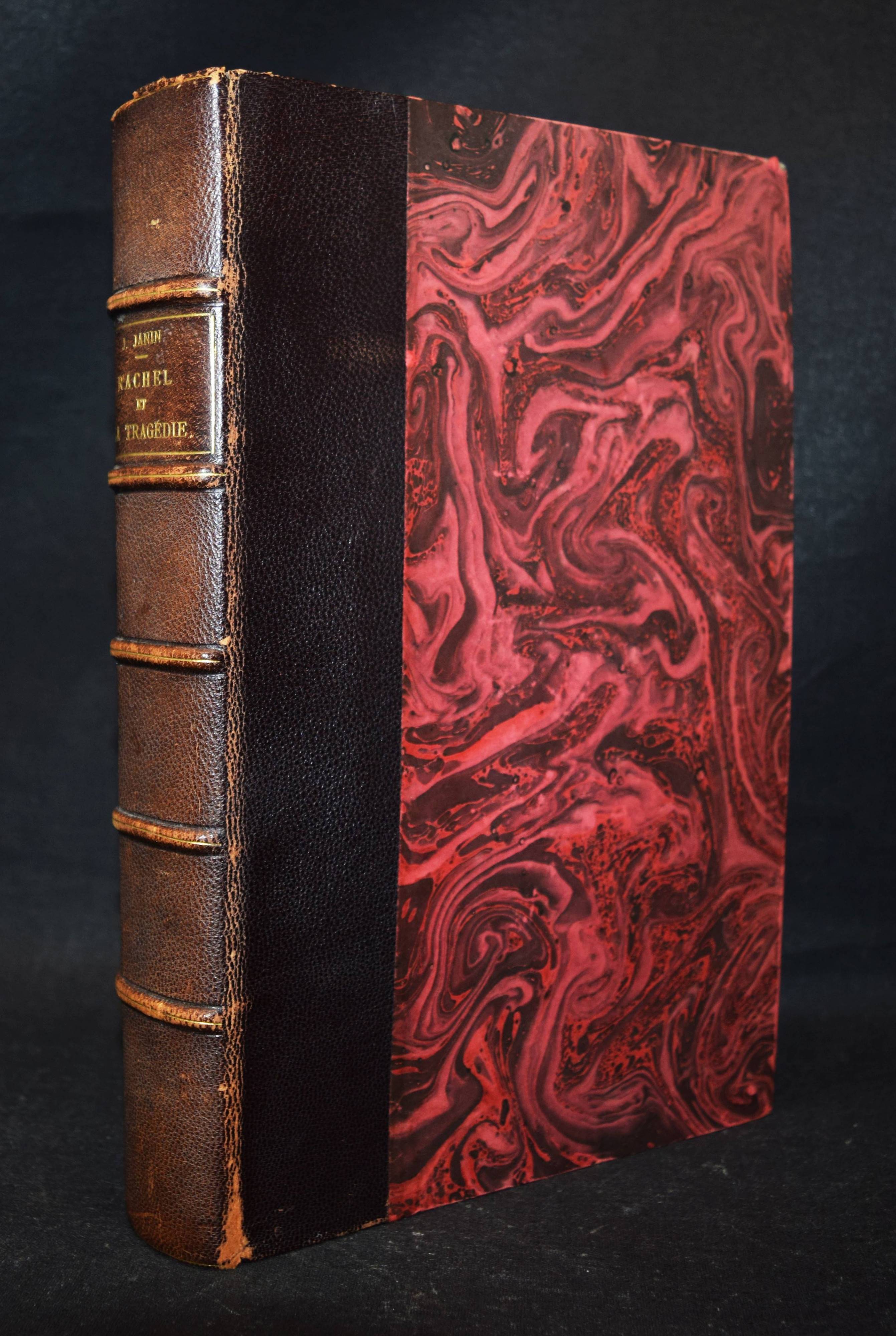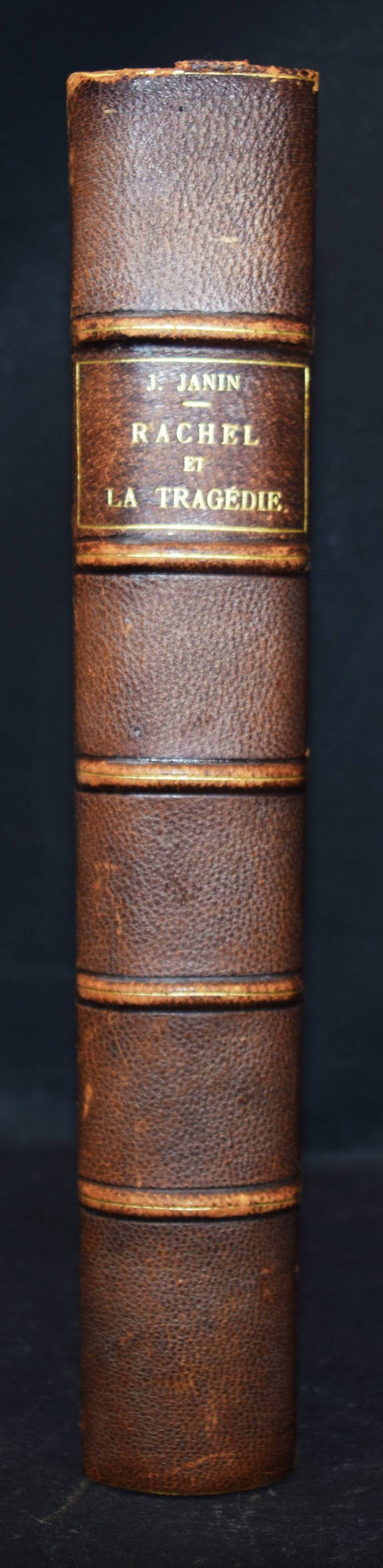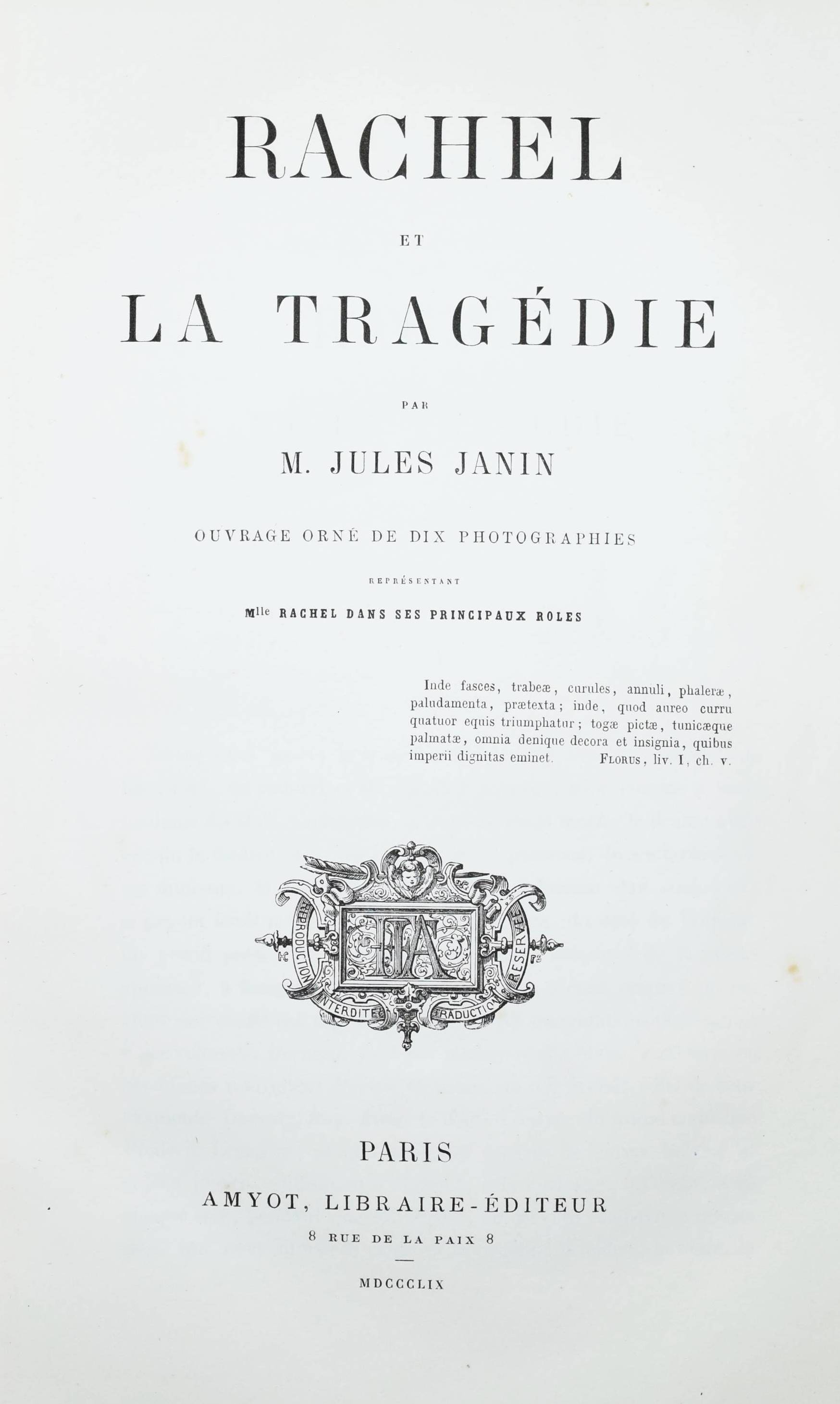 Janin, Jules. Rachel et la tragédie. Ouvrage orné de dix photographies représentant Mlle Rachel dans ses principaux roles. Paris, Amyot 1859. 4°. [2] Bl., 528 S. mit illustr. Vortitel u. 10 mont. Orig.-Photographien von Henri de la Blanchère (Albuminabzüge). Etwas späterer Hldr. mit goldgepr. Rückentitel, 5 Zierbünden u. Linienverg. Vicaire IV, 551. – Erste Ausgabe. – Die Fotografien von Henri de la Blanchère (eig. Pierre Moulin du Coudray de La Blanchère, 1821-1880) zeigen die gefeierte Schauspielerin Élisa Rachel Félix (1821-1858) in verschiedenen Rollen. – Der Naturforscher und Ichtyologe P. M. du Coudray de la Blanchère war einer der ersten französischen Wissenschaftler, der die Fotografie in seinen Forschungen einsetzte. Er lernte 1855 in Paris den Foto-Pionier Gustave le Gray (1820-1884) kennen und began selbst zu fotografieren. Blanchère war auch für seine Porträts wichtiger franz. Persönlichkeiten bekannt und hat Fachbücher zur Fotografie herausgegeben. – Rücken etwas aufgehellt, Gelenke etwas berieben, Blattränder teils etwas braunfleckig u. gebräunt, die erste Hälfte im äußeren seitlichen Rand mit kleinem Wasserfleck. Fotografien leicht bis stärker verblasst, gutes breitrandiges Exemplar.