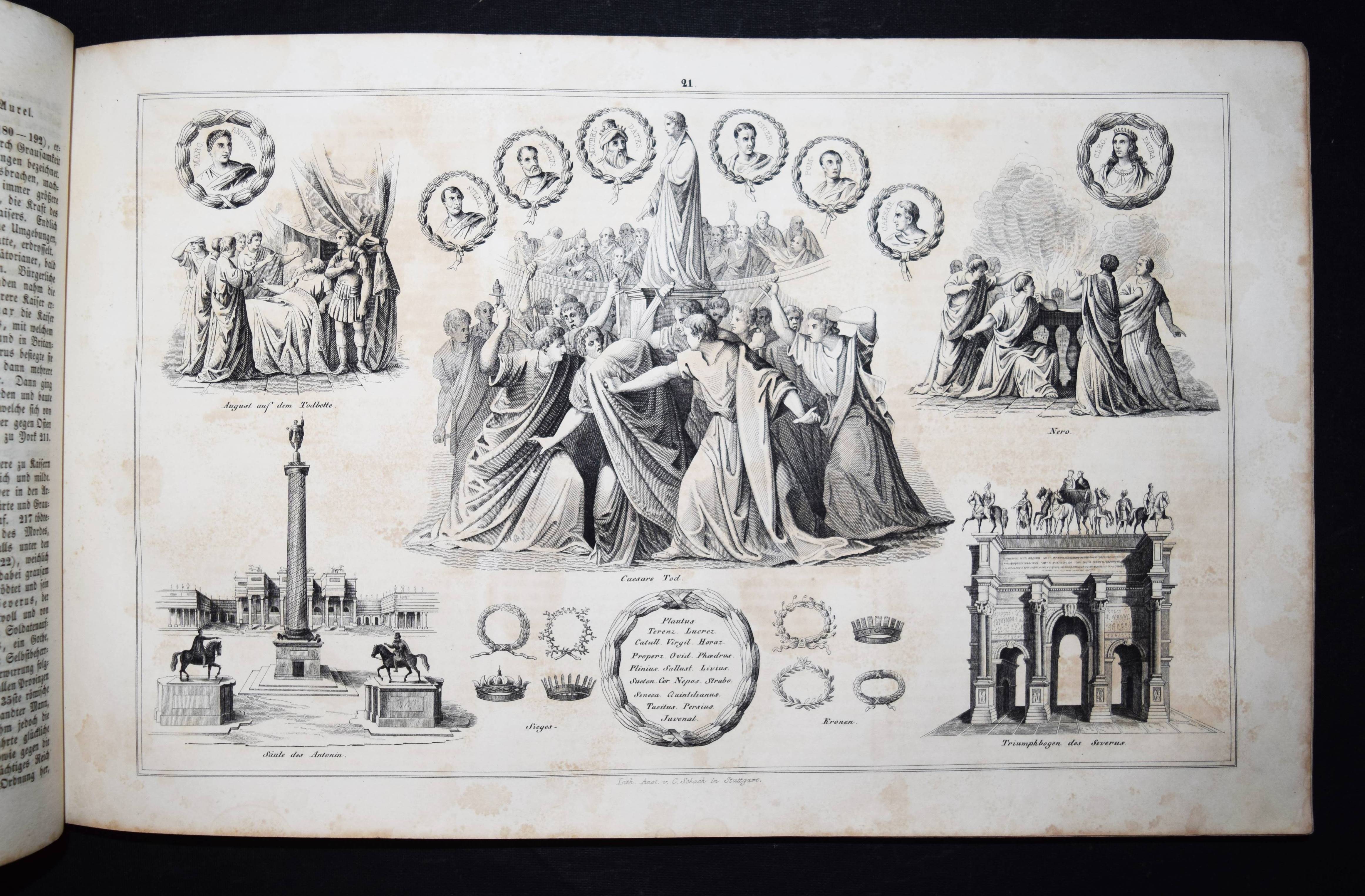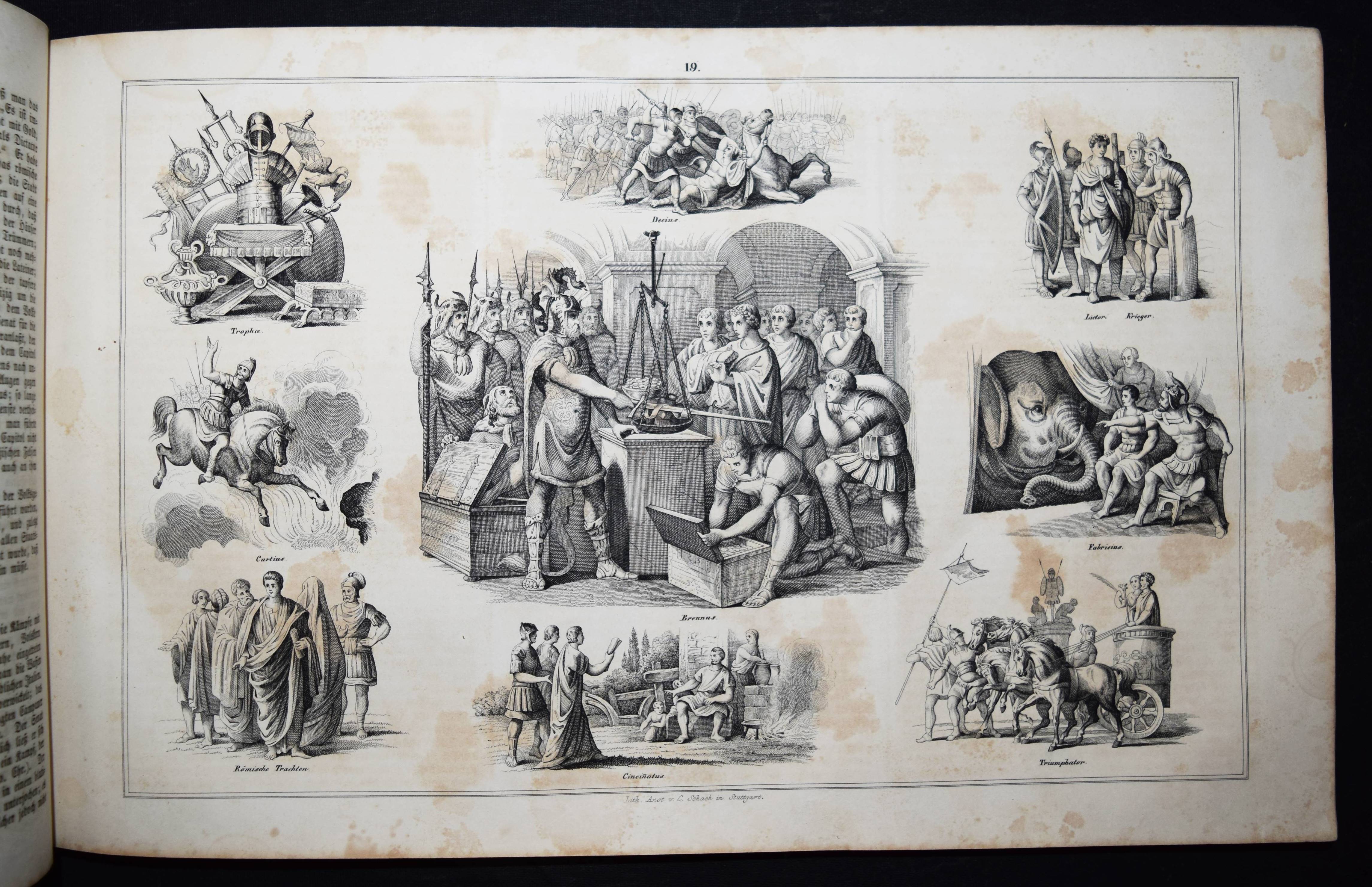 Hoffmann, Friedrich. Der Weltspiegel. Das Wissenswürdigste vom Weltgebäude, von der Erde, von den Völkern der Erde. Für die reifere Jugend bearbeitet. Stuttgart, Schmidt & Spring 1844. Quer-4°. [2] Bl., 180 S. mit illustr. lithogr. Titel, 1 Weltkarte u. zahlr. Abb. auf 49 lithogr. Tafeln. Typogr. OPbd. Slg. Brüggemann II, 402. Klotz 2775/34 (dat. 1850). Seebaß I, 928 (″Sehr interessant illustriertes Anschauungsunterrichtswerk“). Wegehaupt IV, 971. – Einzige Ausgabe, selten. – Die Tafeln mit einer Hemisphärenkarte, biblischen und historischen Szenen, kleinen Ansichten (Amsterdam, Berlin, Bern, Frankfurt, Köln, Stuttgart, Wien, Zürich etc.), Karten, ferner Eisenbahn, Marine, Stierkampf etc. – Das Erscheinungsjahr ist nur auf dem Deckeltitel angegeben. – Einband etwas berieben und teils stärker fleckig, Vorsätze erneuert, stellenweise stockfleckig, gutes Exemplar.
