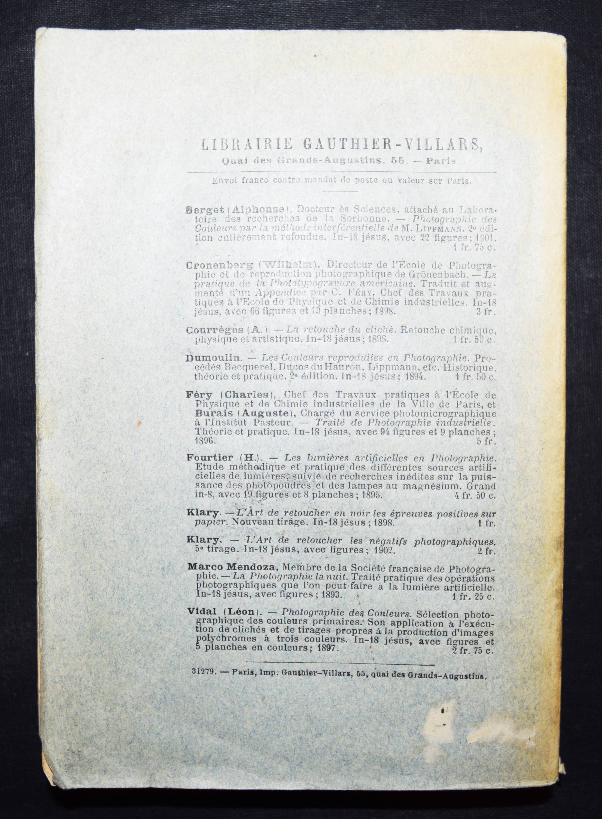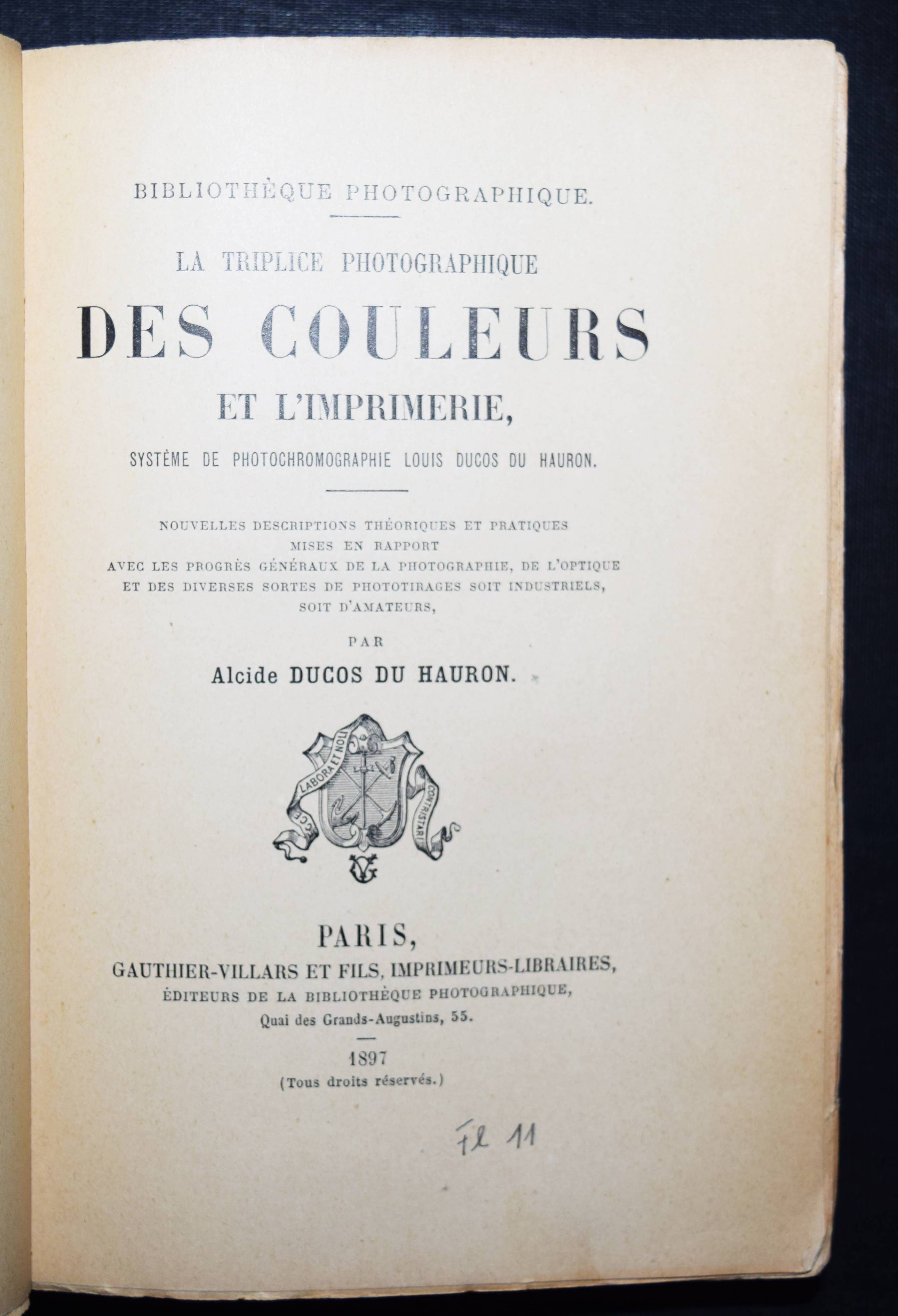 Ducos du Hauron, Alcide. La triplice photographique des couleurs et l’imprimerie. Paris, Gauthier-Villars 1897. 8°. VI, 488 S. Typogr. Orig.-Broschur. (Bibliothèque photographique). Roosens/Salu 3358. – Erste Ausgabe. – „Nouvelles descriptions théoriques et pratiques mises en raport avec les progrès généraux de la photographie, de l’optique et diverses sortes de phototirages soit industriels, soit d’amateurs“ (Untertitel). – Wichtige Arbeit zur Geschichte der Farbphotographie. – Der franz. Schriftsteller, Künstler und Fotograf A. Ducos du Hauron (1830-1909) veröffentlichte bereits 1878 zusammen mit seinem Bruder dem Foto-Pionier Louis Ducos du Hauron (1837-1920) den „Traité pratique de photographie des couleurs“. L. Ducos du Hauron gilt zusammen mit Charles Gros als Erfinder der Farbfotografie. – „Er erfand bereits 1862 mehrere Methoden, um Farbfotografien sowohl mit additiver (rot-grün-blau) als auch subtraktiver (cyan-magenta-yellow) Farbmischung aufzunehmen. 1868 ließ er mehrere Methoden patentieren. … Seine Farbaufnahme der Stadt Agen ist eine der ersten Farbaufnahmen im subtraktiven Verfahren. Er präsentierte die ersten farbigen Pigmentdrucke nach dem Prinzip der subtraktiven Farbmischung: Wenn man drei Negative durch Rot-, Blau- und Grünfilter aufgenommen hat, zeigen davon hergestellte Transparentbilder die Originalfarben, wenn man diese mit den jeweiligen Komplementärfarben Blaugrün, Gelb und Purpur tönt und übereinanderlegt“ (Wikipedia). – Umschlag etwas berieben und mit leichten Knickspuren, papierbedingt etwas gebräunt, sehr gutes Exemplar.