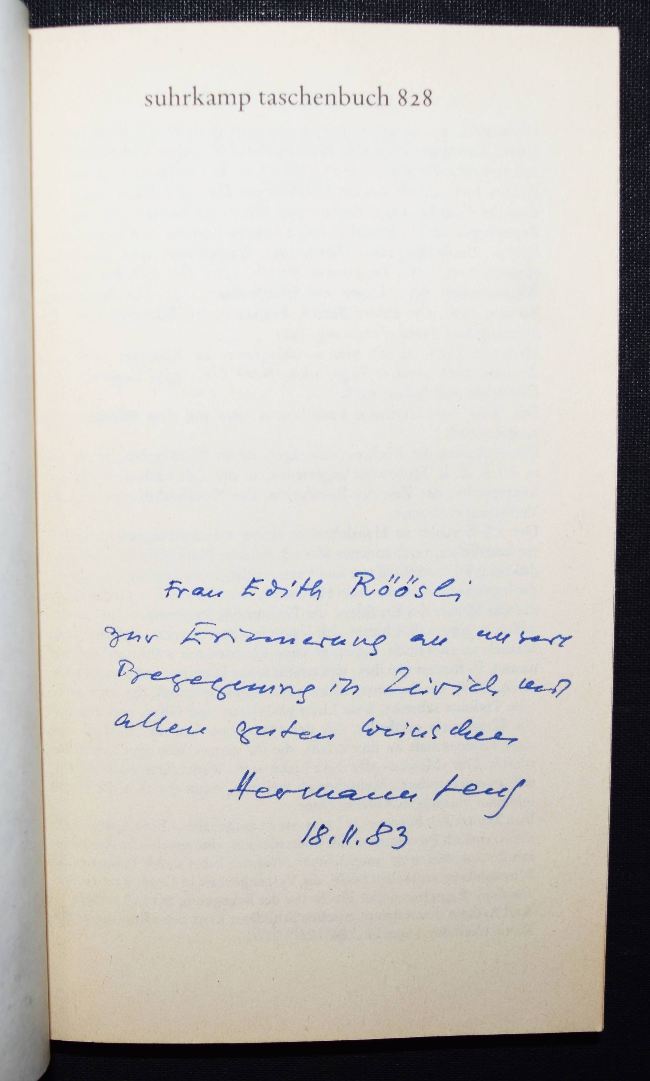 Lenz, Hermann. Die Begegnung. Roman. 1. Aufl. Frankfurt (Main), Suhrkamp 1982. 8°. 203 S. Illustr. OKart. (Suhrkamp-Taschenbuch, Band 828). Erste Ausgabe. – Mit eigenhändiger Widmung von H. Lenz. – Rücken leicht fleckig, sehr gutes sauberes Exemplar.