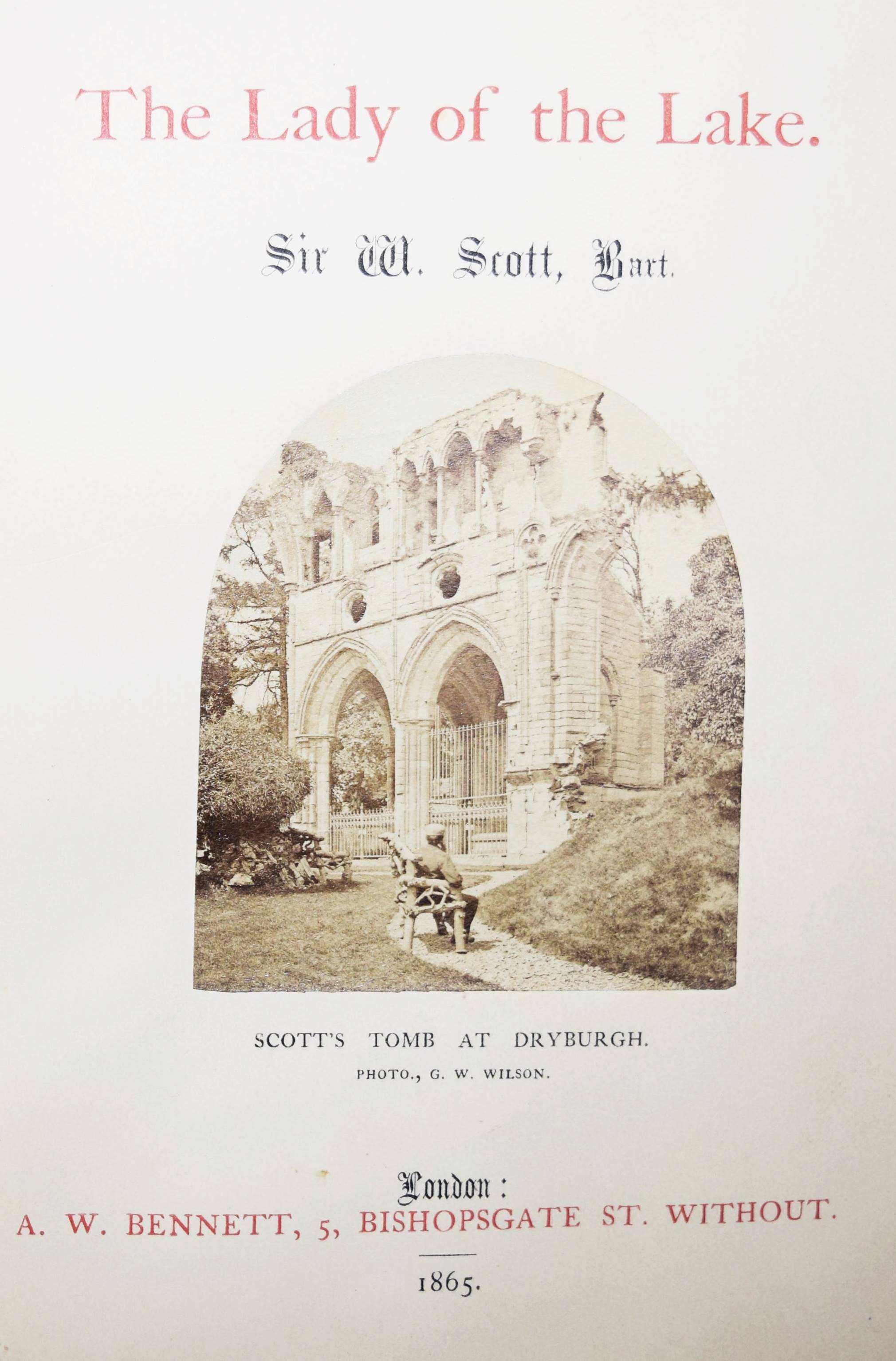 Scott, W(alther). The lady of the lake. London, A. W. Bennett 1863. 8°. [3] Bl., 215 S. mit 1 mont. Orig.-Photographie von G(eorge) W(ashington) Wilson auf dem Titel u. 13 mont. Orig.-Photographien (Albuminabzüge) von (Thomas Ogle). OLn. mit goldgepr. Rücken- u. Deckeltitel, reicher Rücken- u. Deckelverg. u. Goldschnitt. Gernsheim, Incunabula 196 (mit Abb.). Vgl. Truthful Lens 191 (Wordsworth, Our English lakes, London, Bennett 1864 with 13 photographs by T. Ogle). – Erste Ausgabe in dieser Ausstattung. – Mit bemerkenswerten Landschafts-Fotografien des englischen Fotografen T. Ogle (1813-ca. 1882). – Die meisten Aufnahmen zeigen Flüsse und Seen in Schottland. – Einband etwas aufgehellt, Gelenke restauriert, zeitgenöss. Besitzvermerk a. V., gutes sauberes Exemplar.